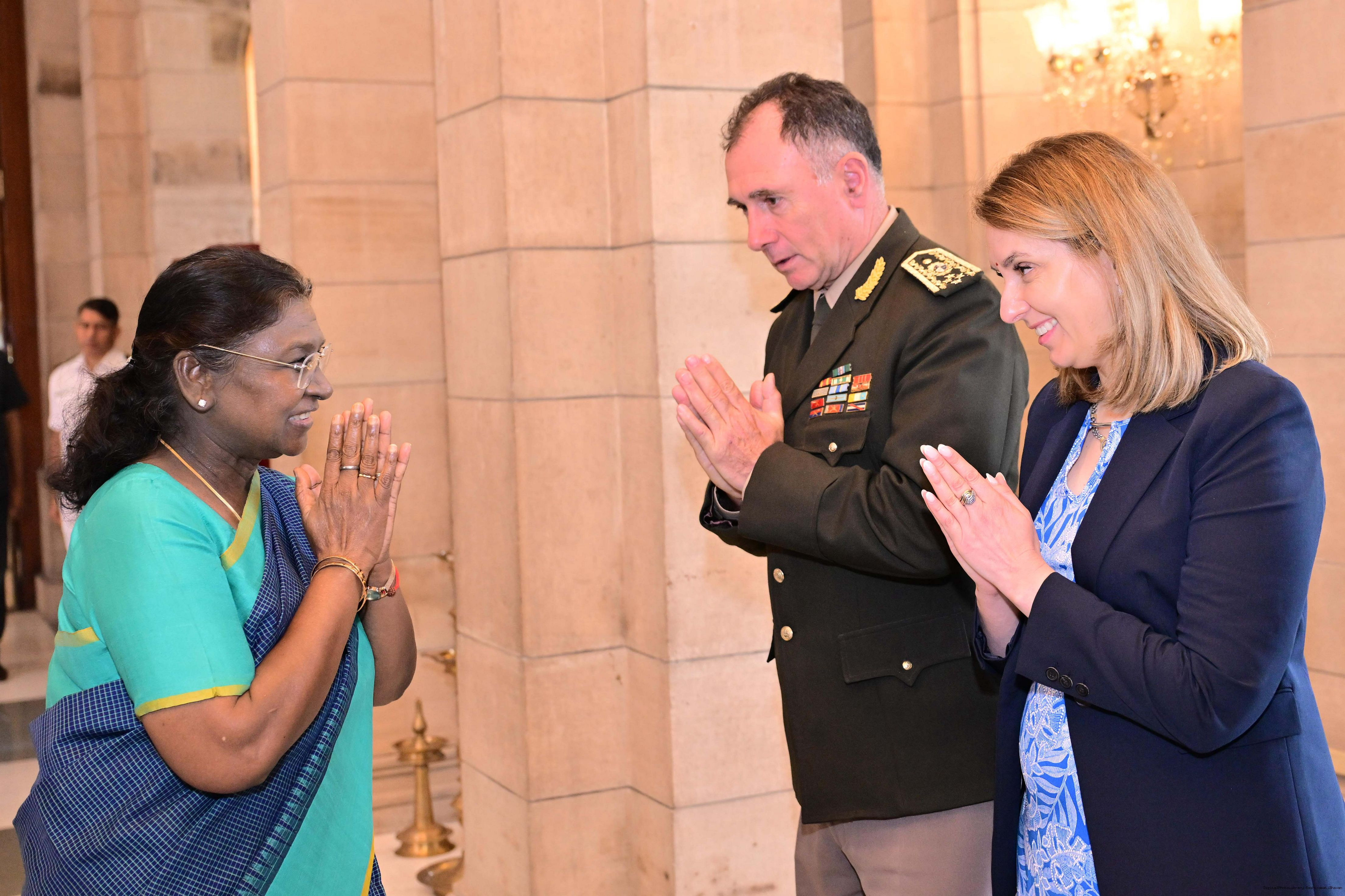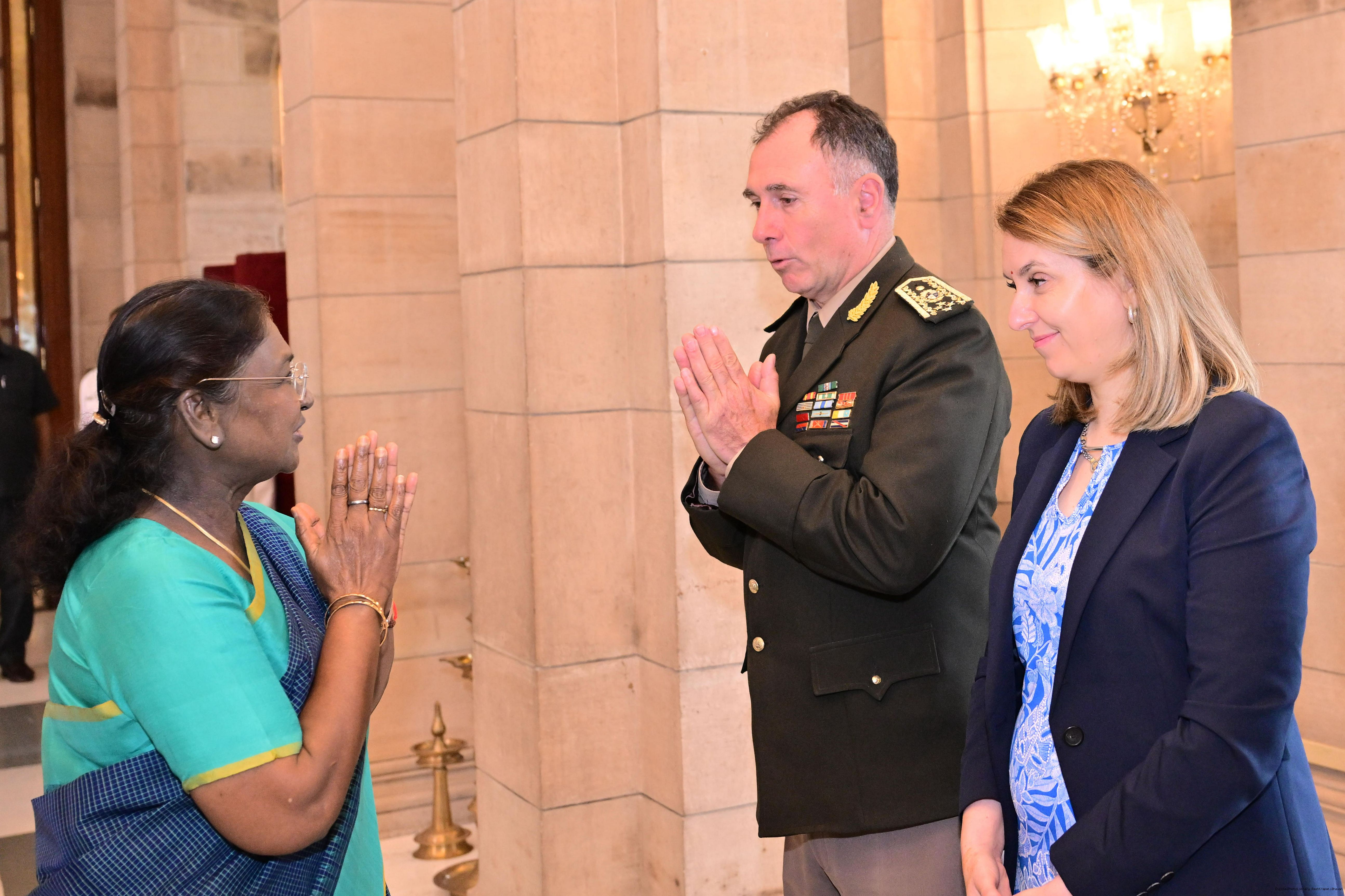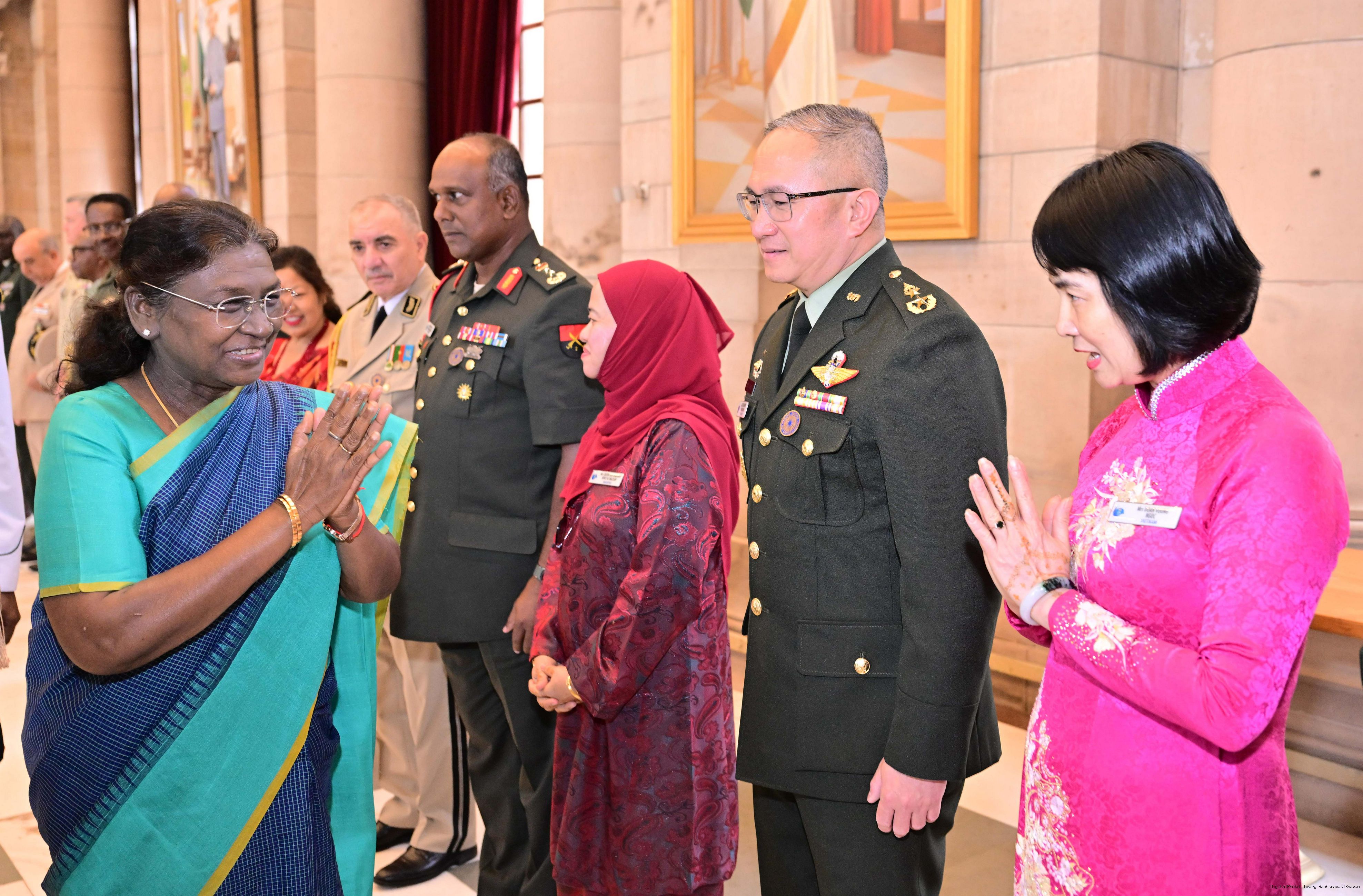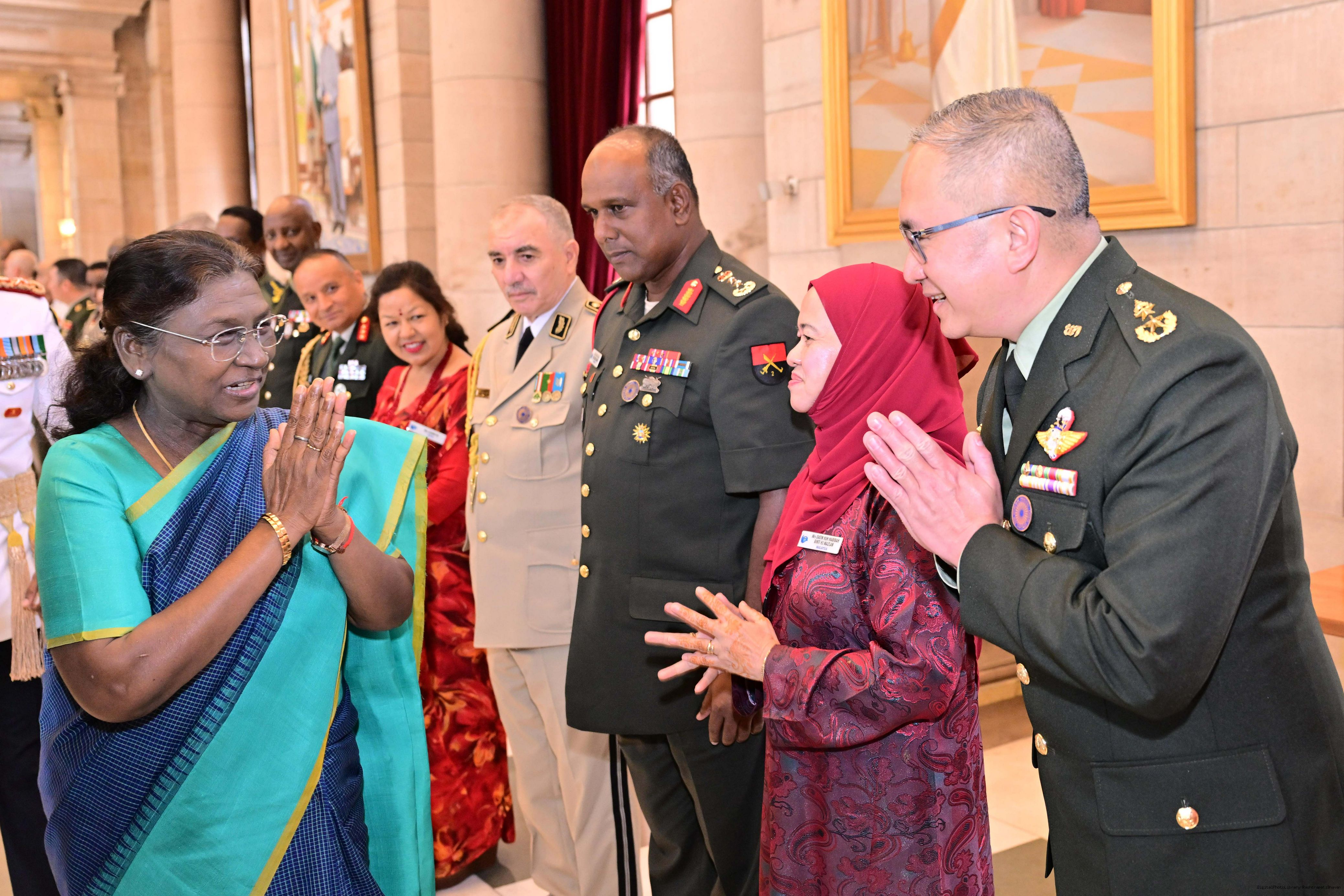 | Caption: | The Chiefs/Vice-Chiefs of Army, participating in the Army Chiefs’ Conclave for United Nations Troop Contributing Countries, along with spouses, called on the President of India, Smt. Droupadi Murmu at Rashtrapati Bhavan on October 16, 2025. |