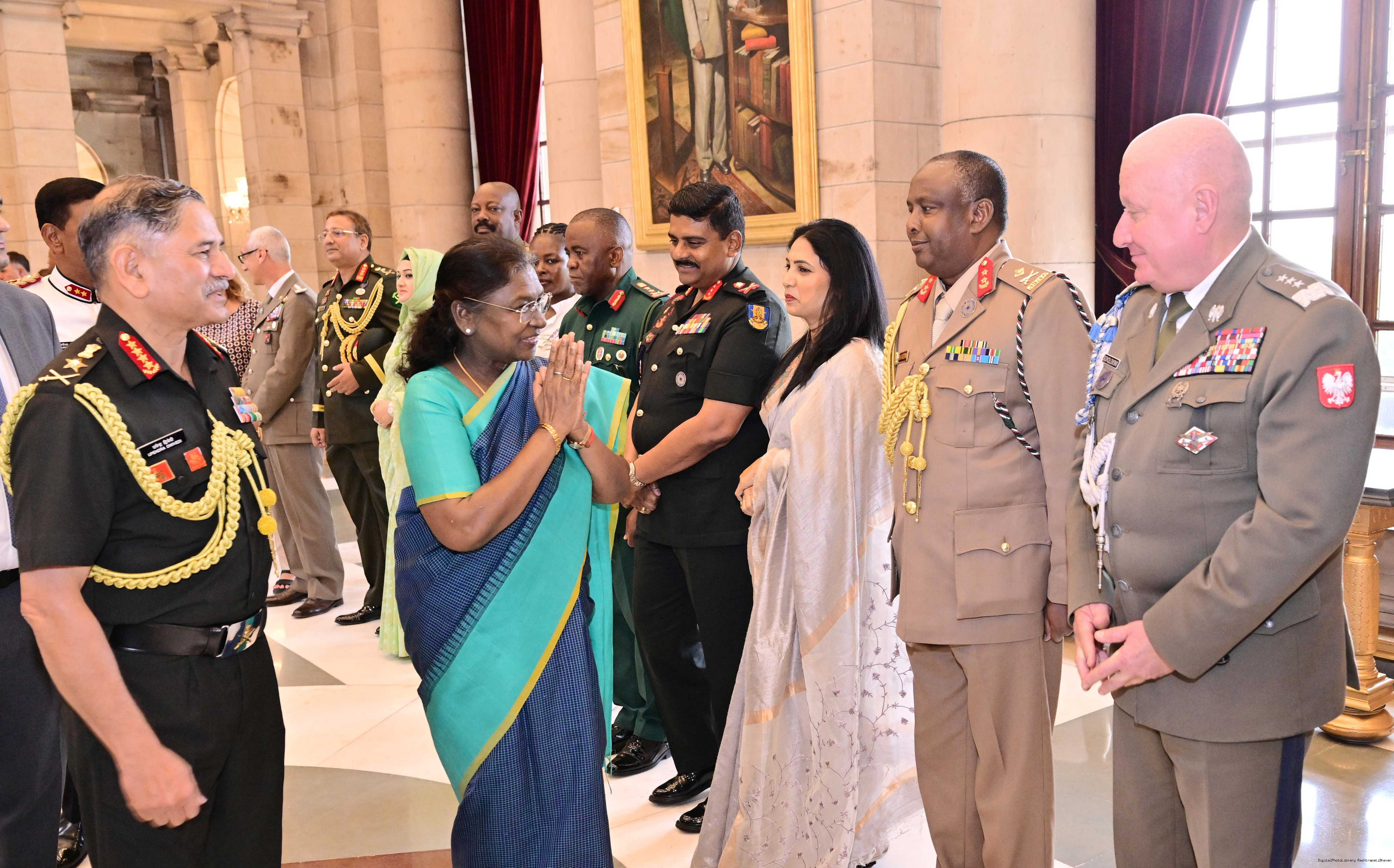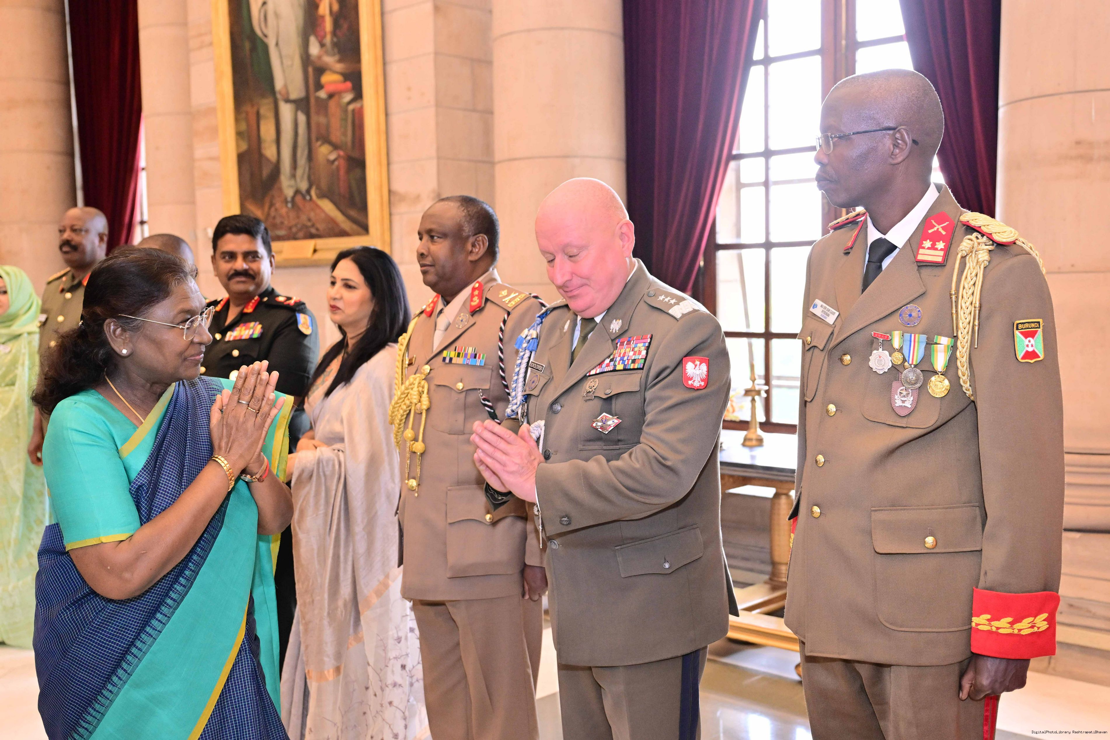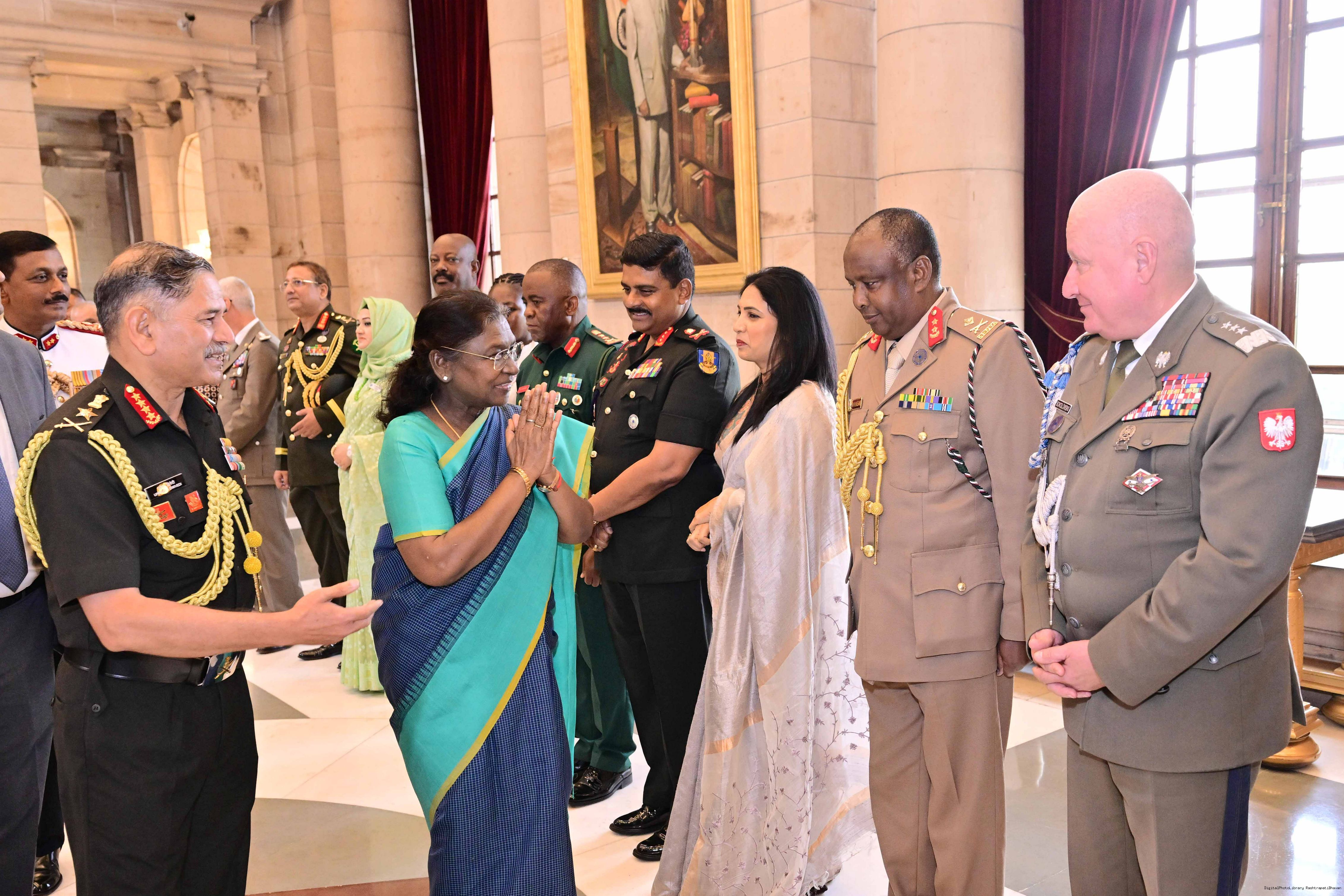 | Caption: | The Chiefs/Vice-Chiefs of Army, participating in the Army Chiefs’ Conclave for United Nations Troop Contributing Countries, along with spouses, called on the President of India, Smt. Droupadi Murmu at Rashtrapati Bhavan on October 16, 2025. |