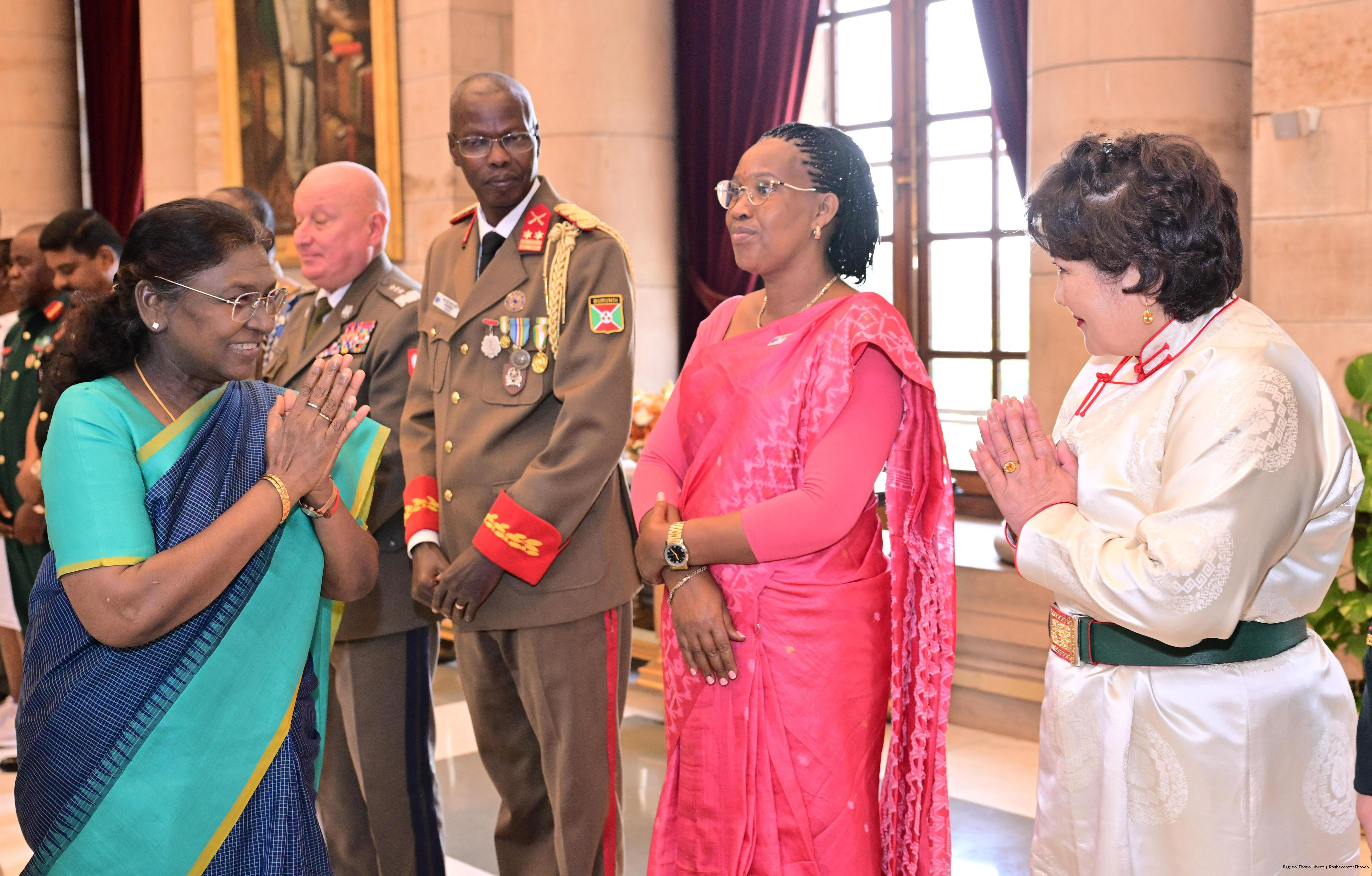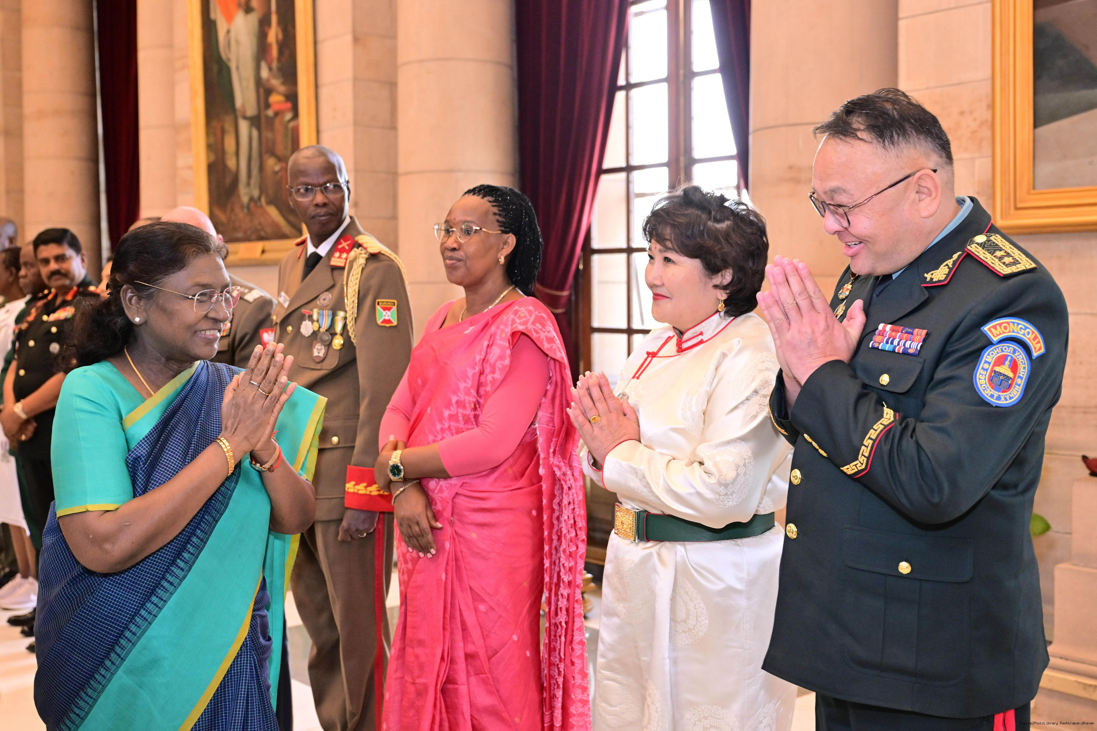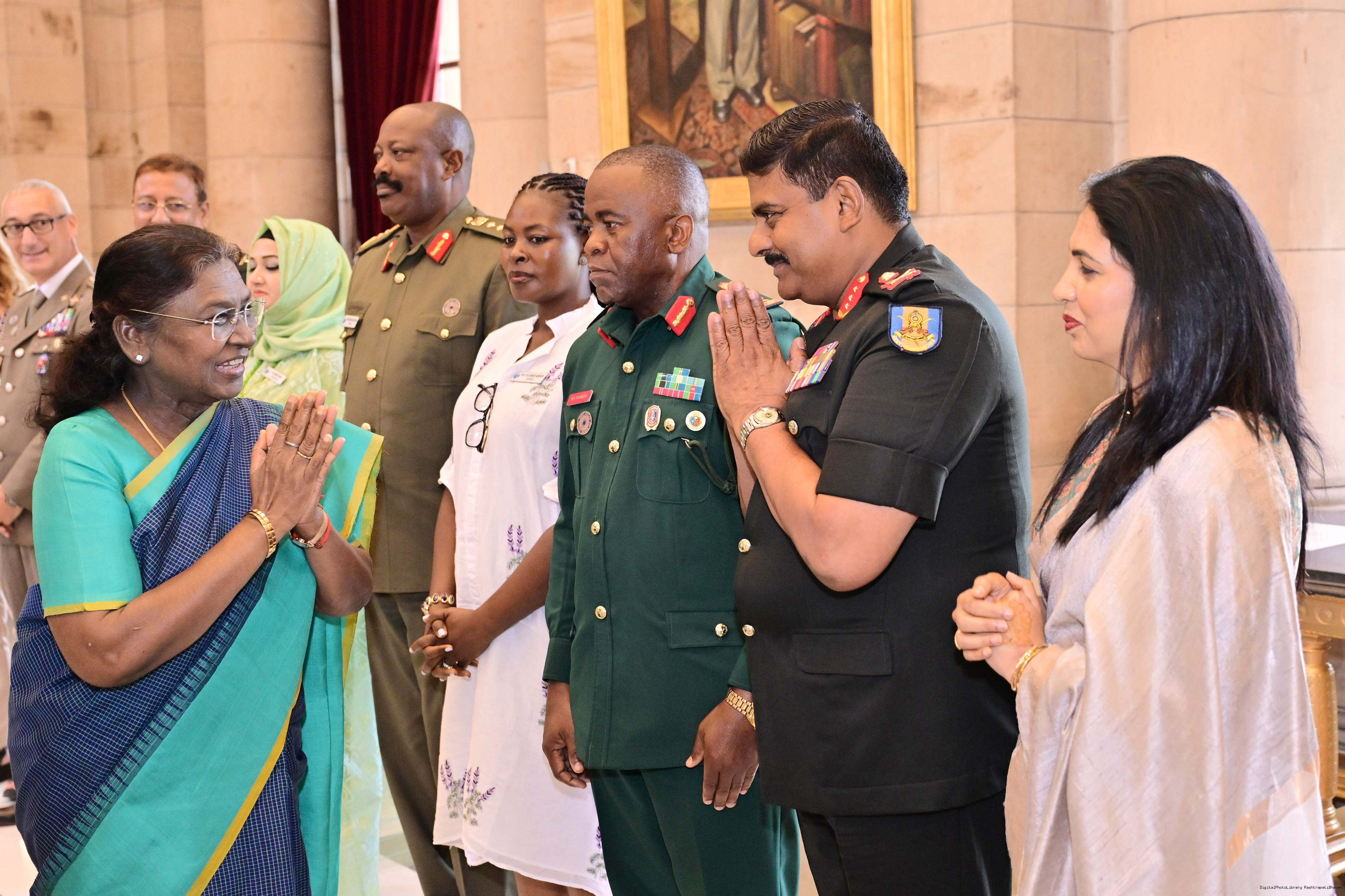 | Caption: | The Chiefs/Vice-Chiefs of Army, participating in the Army Chiefs’ Conclave for United Nations Troop Contributing Countries, along with spouses, called on the President of India, Smt. Droupadi Murmu at Rashtrapati Bhavan on October 16, 2025. |