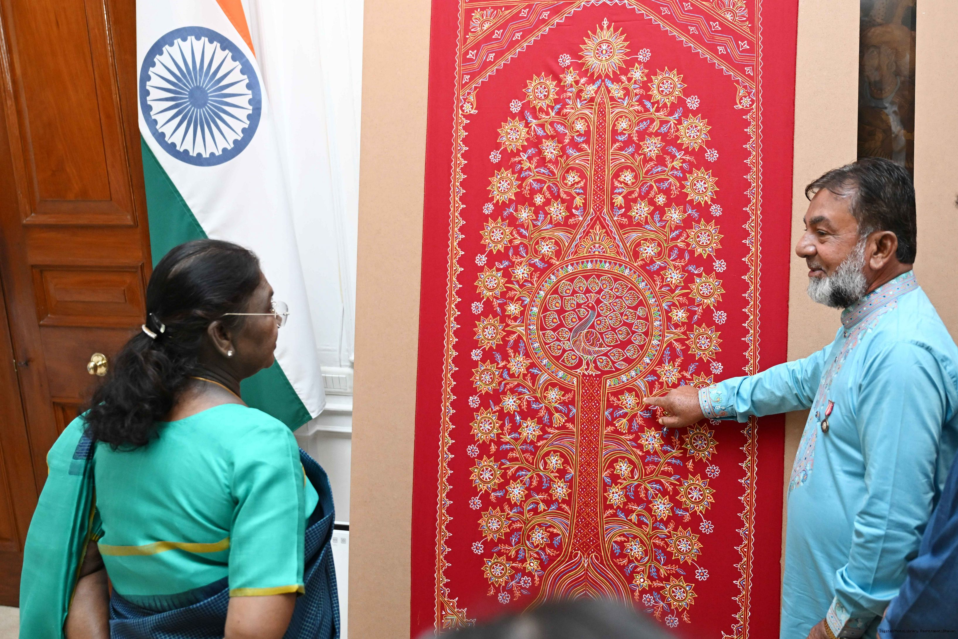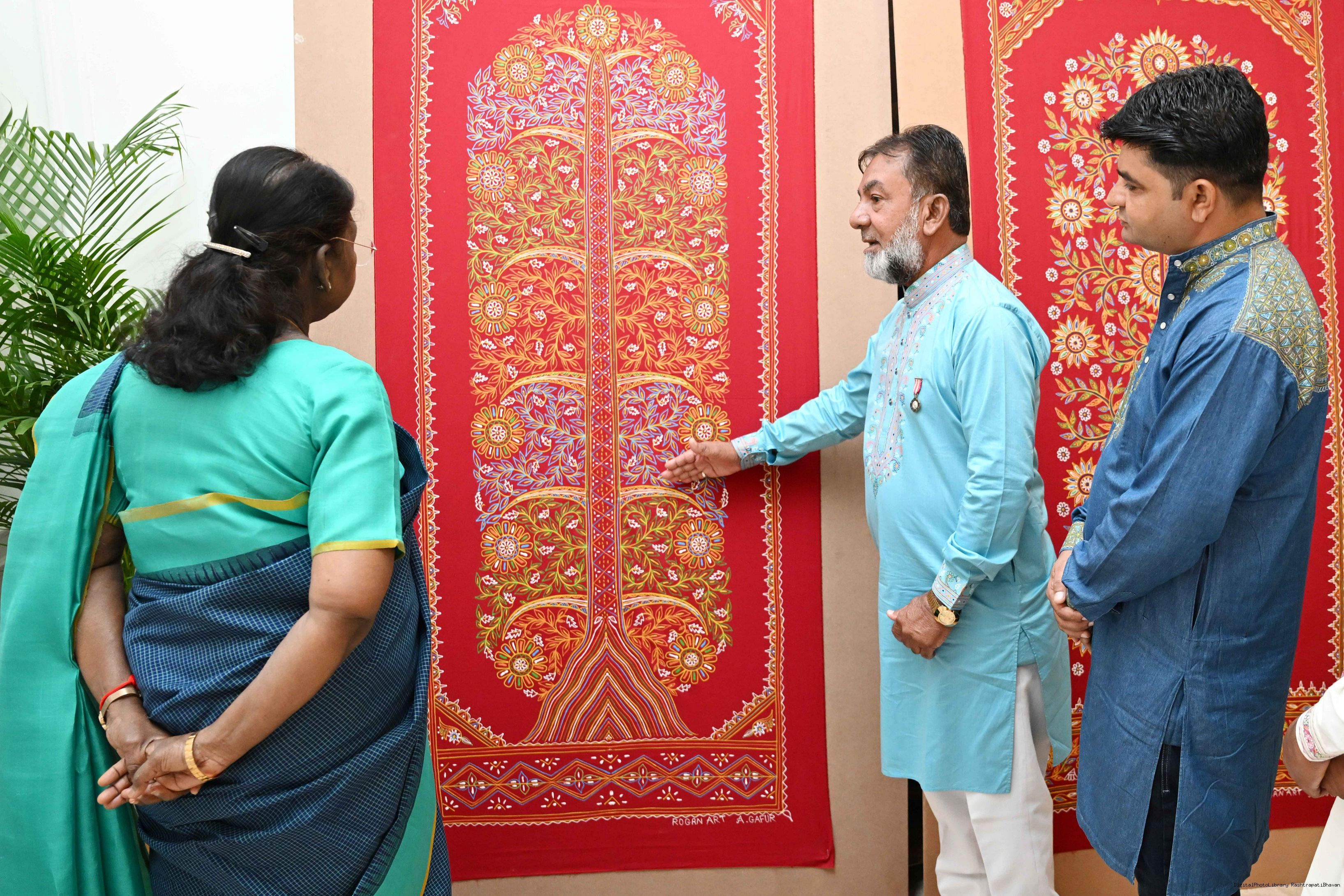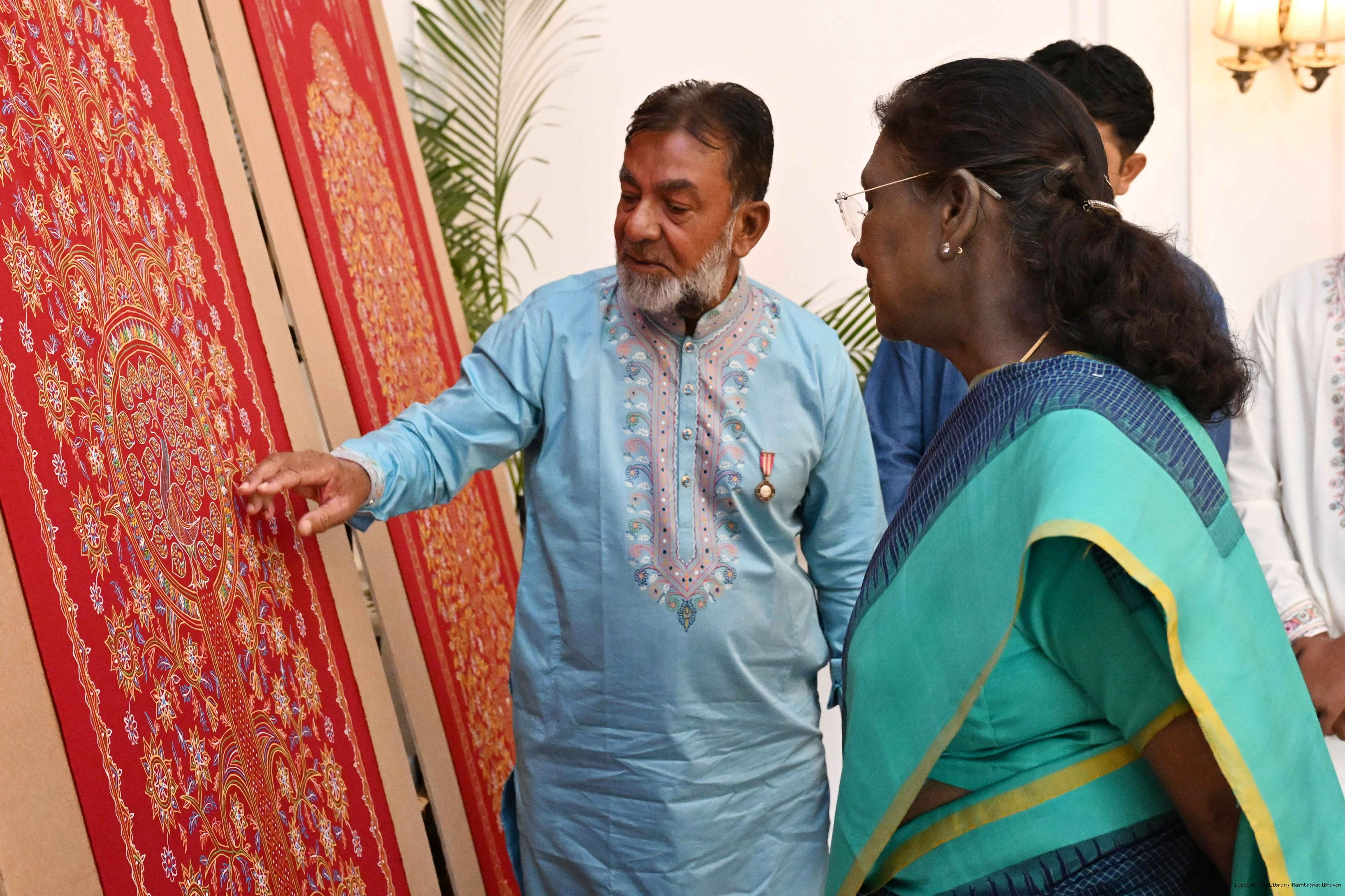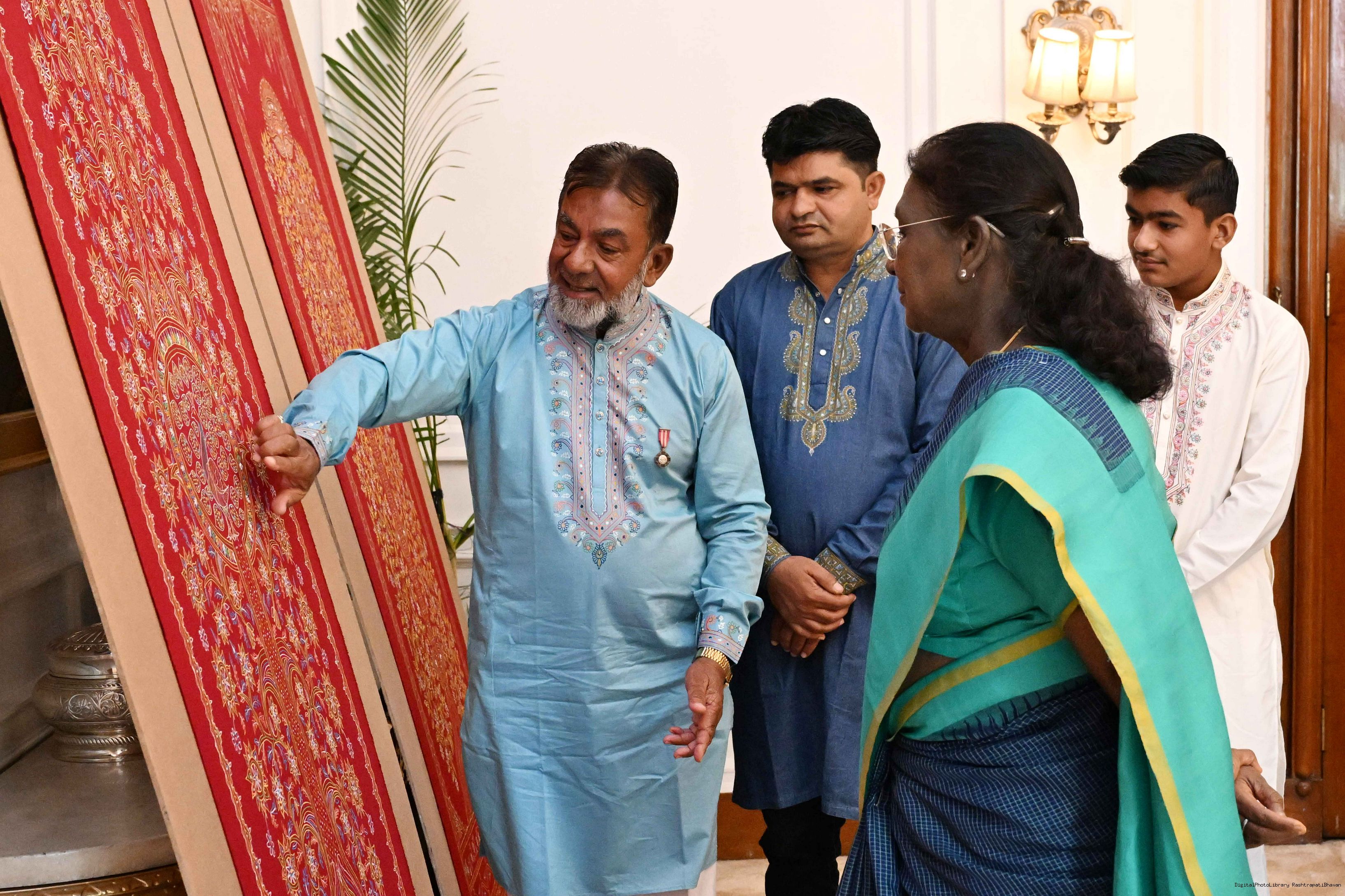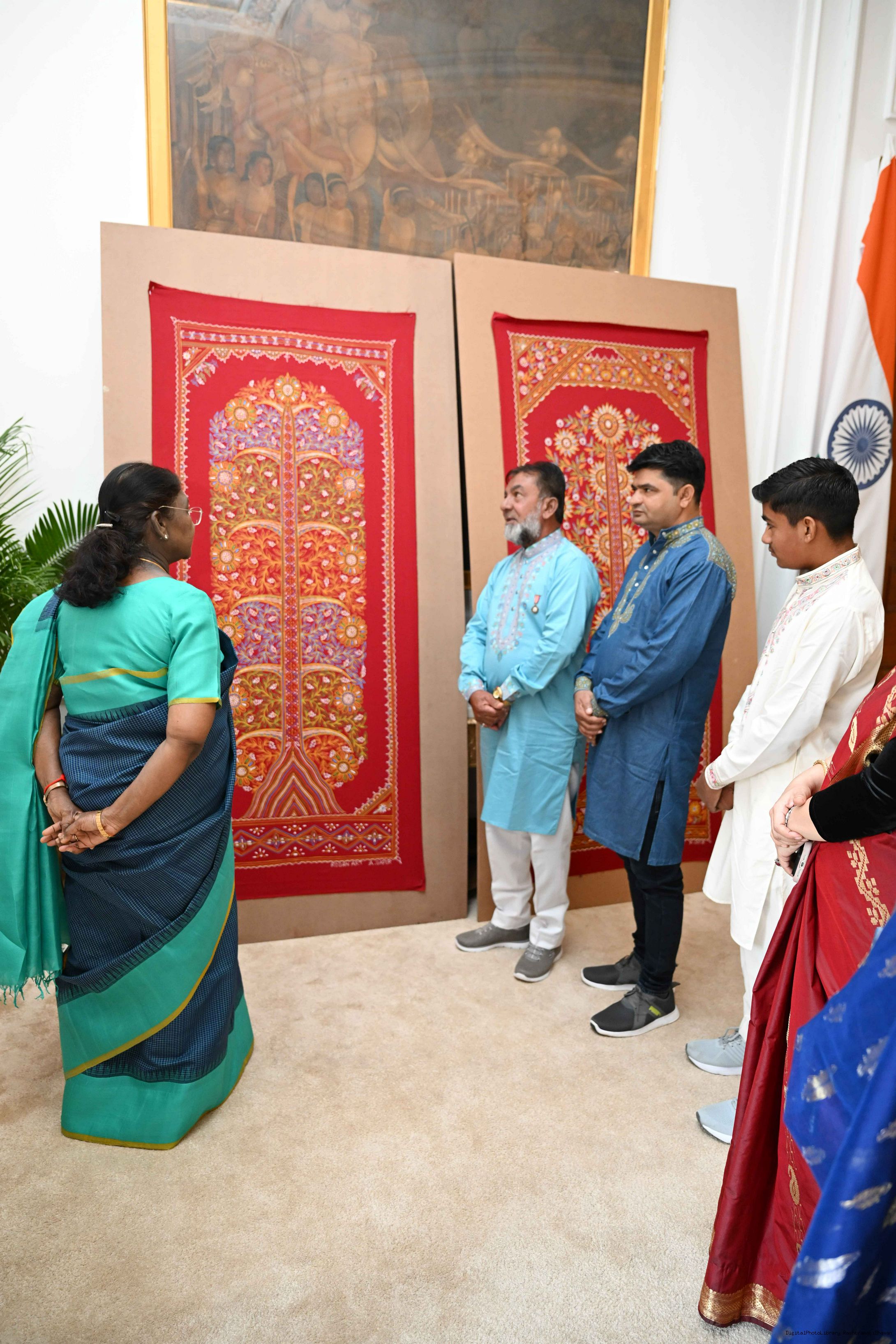 | Caption: | The President of India, Smt Droupadi Murmu interacted and posing a group photograph with participants of the Artists in Residence programme for Rogan Art at Rashtrapati Bhavan on October 16, 2025. |