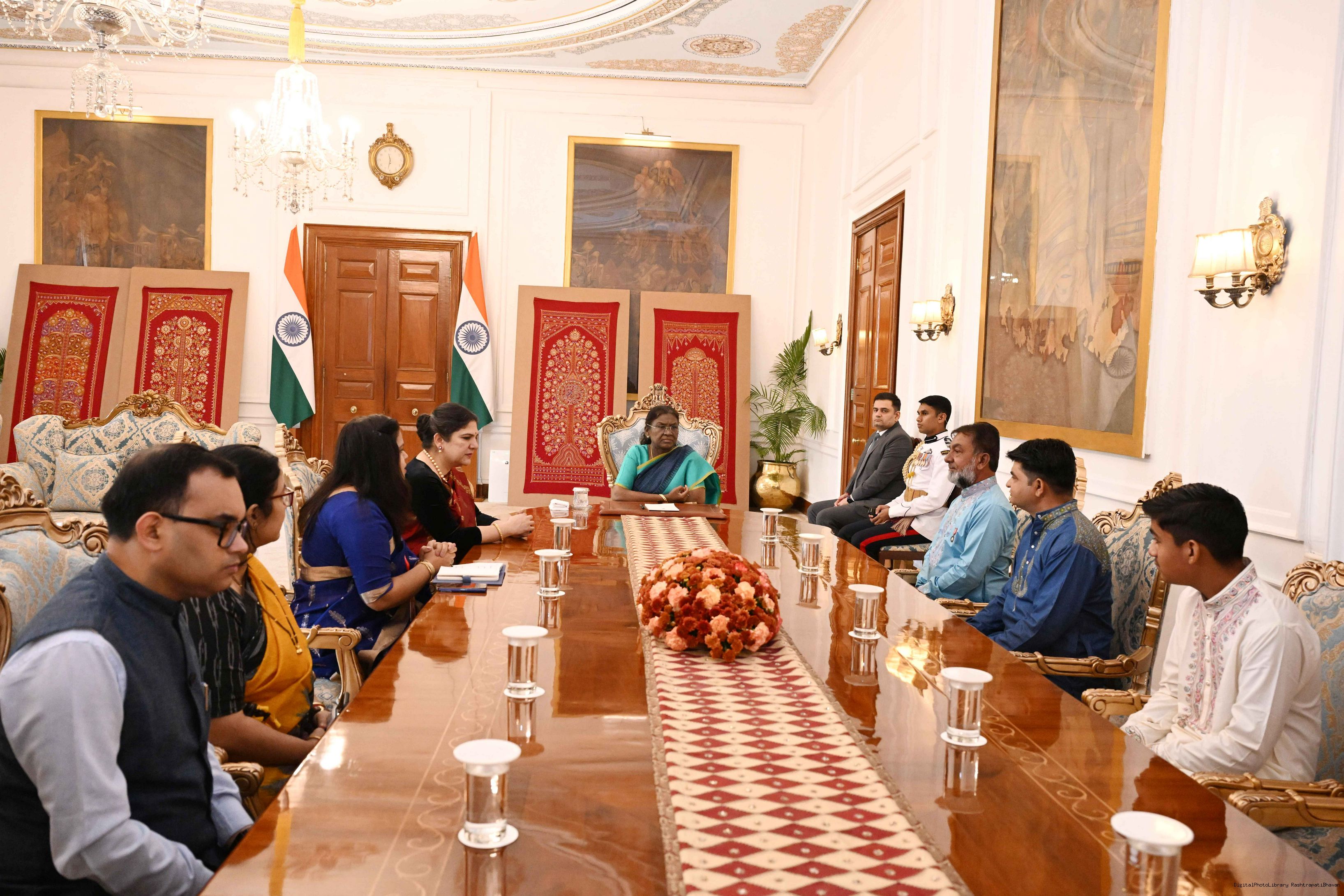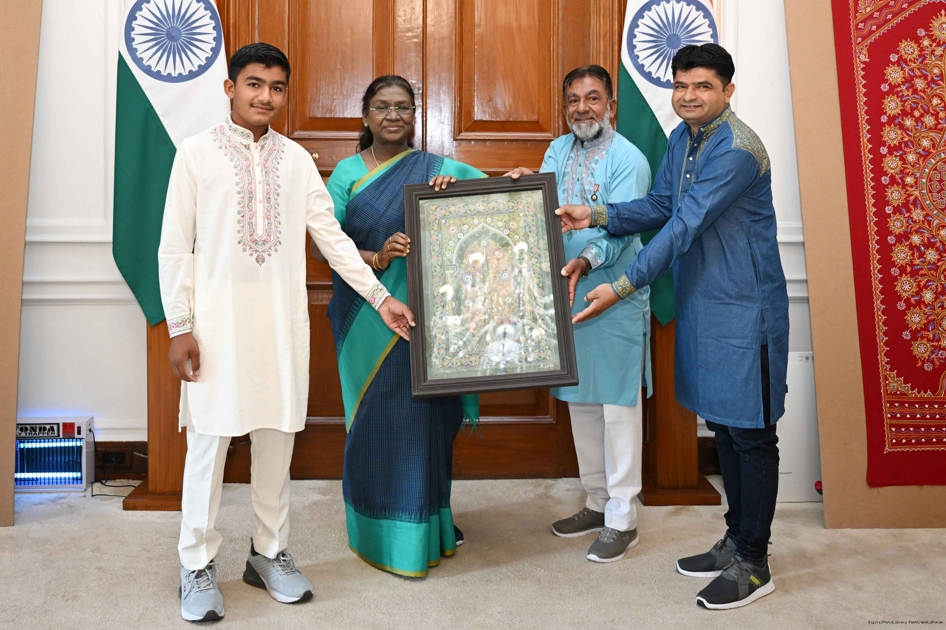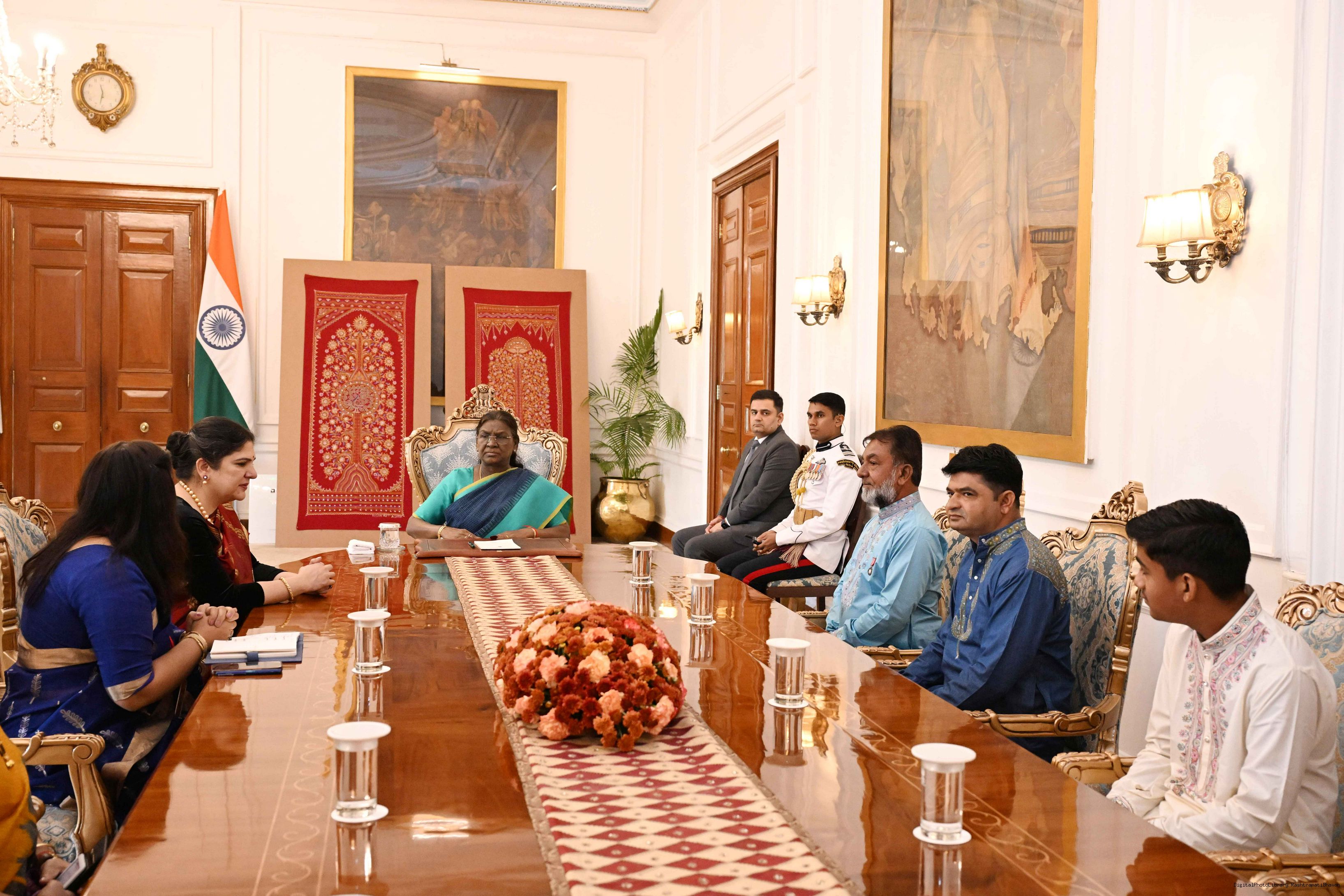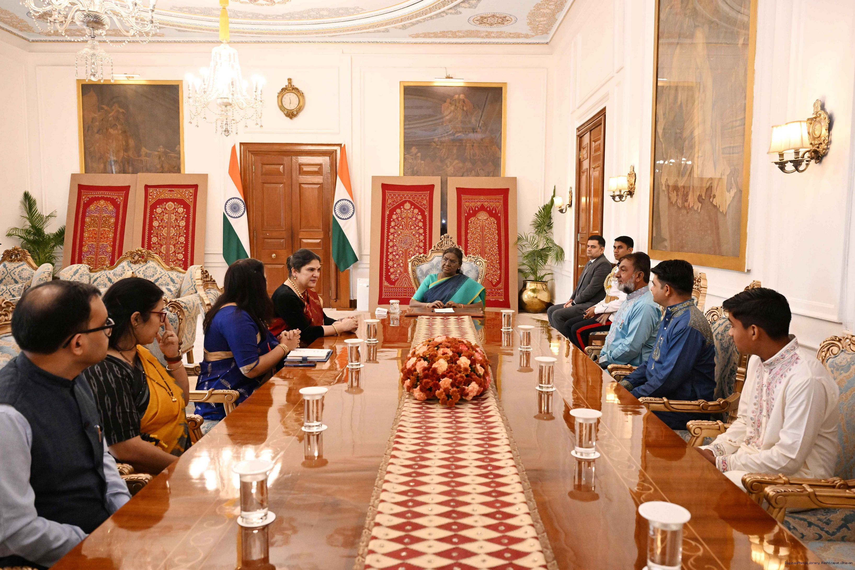 | Caption: | The President of India, Smt Droupadi Murmu interacted and posing a group photograph with participants of the Artists in Residence programme for Rogan Art at Rashtrapati Bhavan on October 16, 2025. |