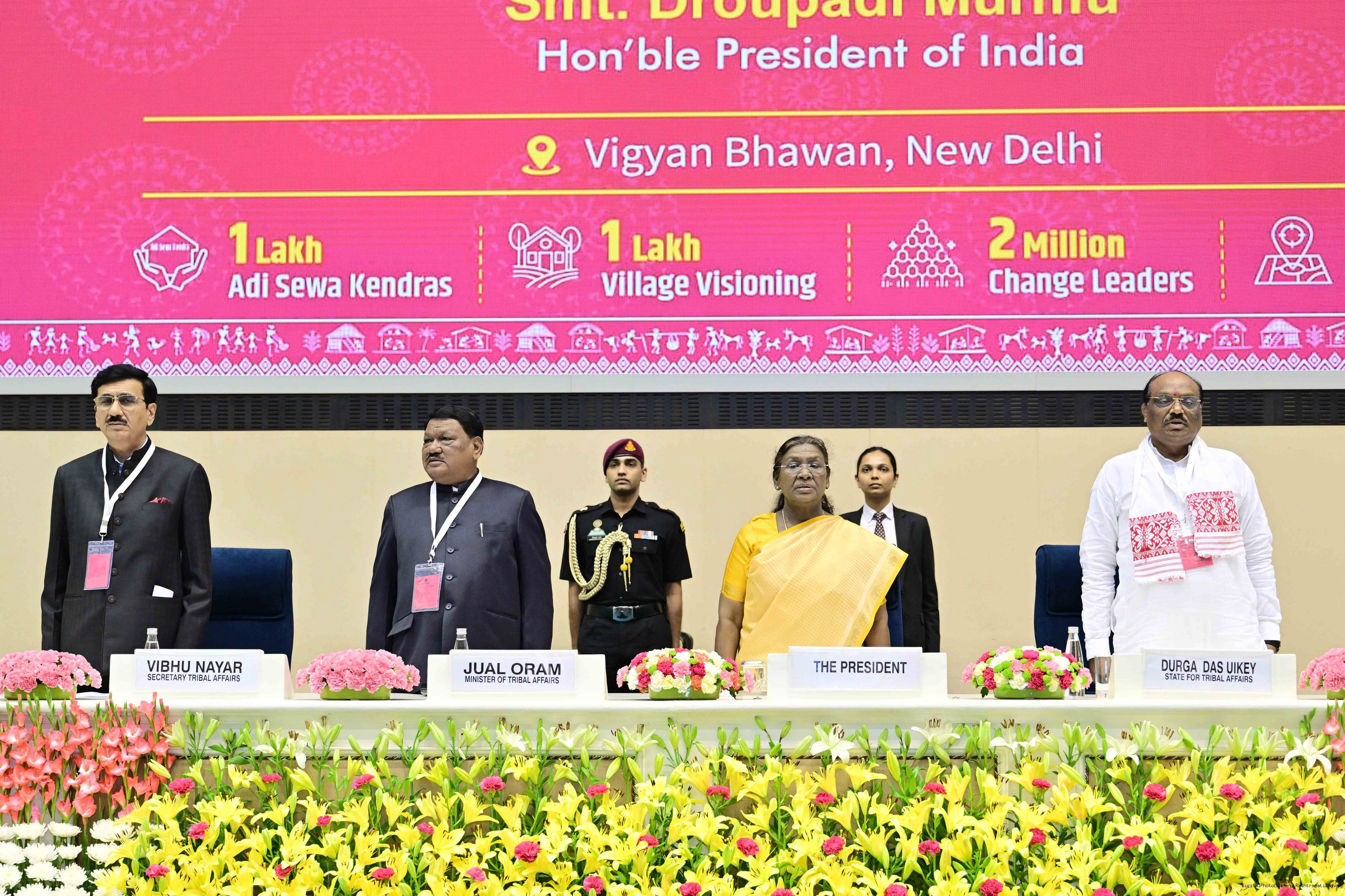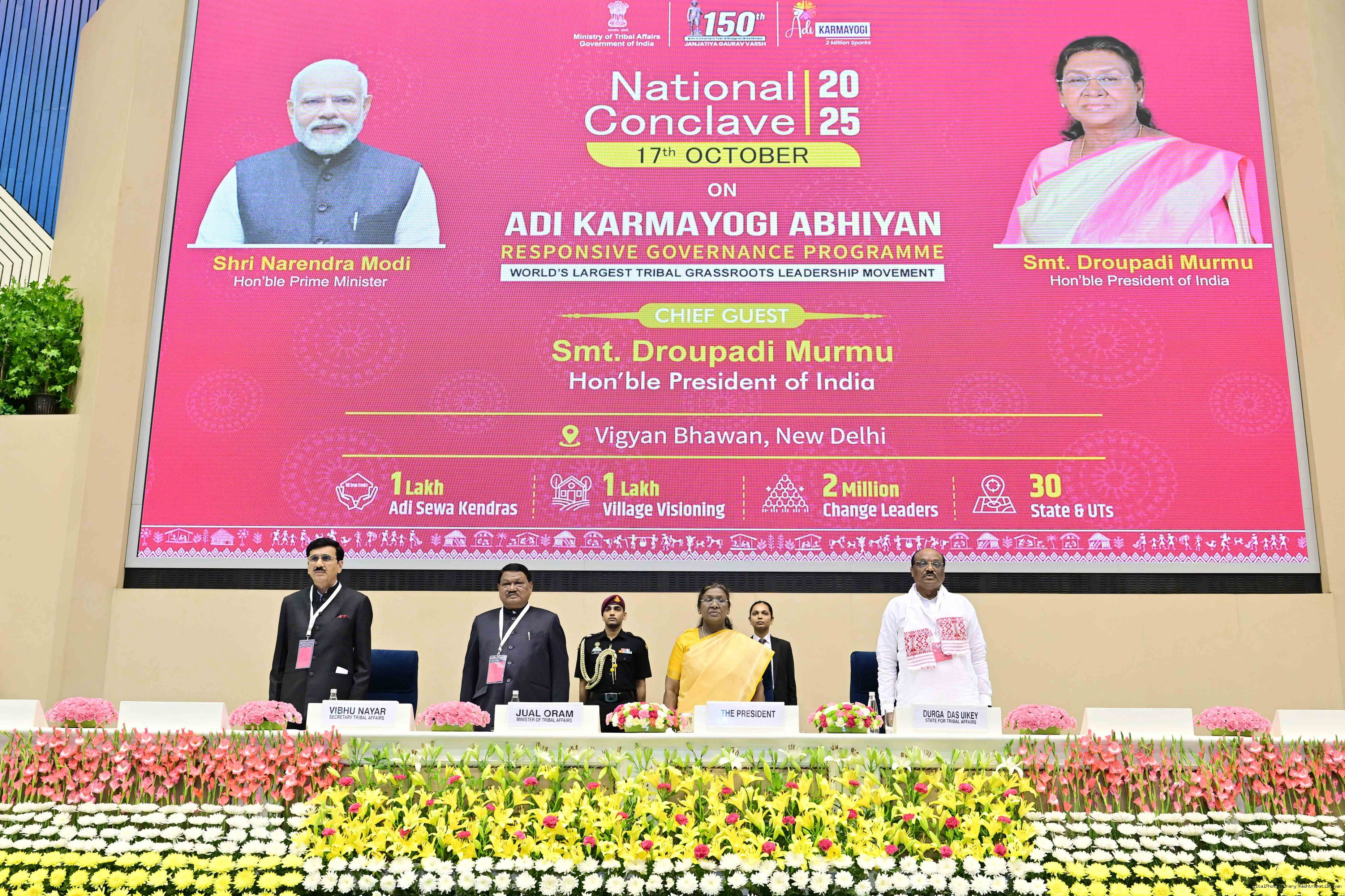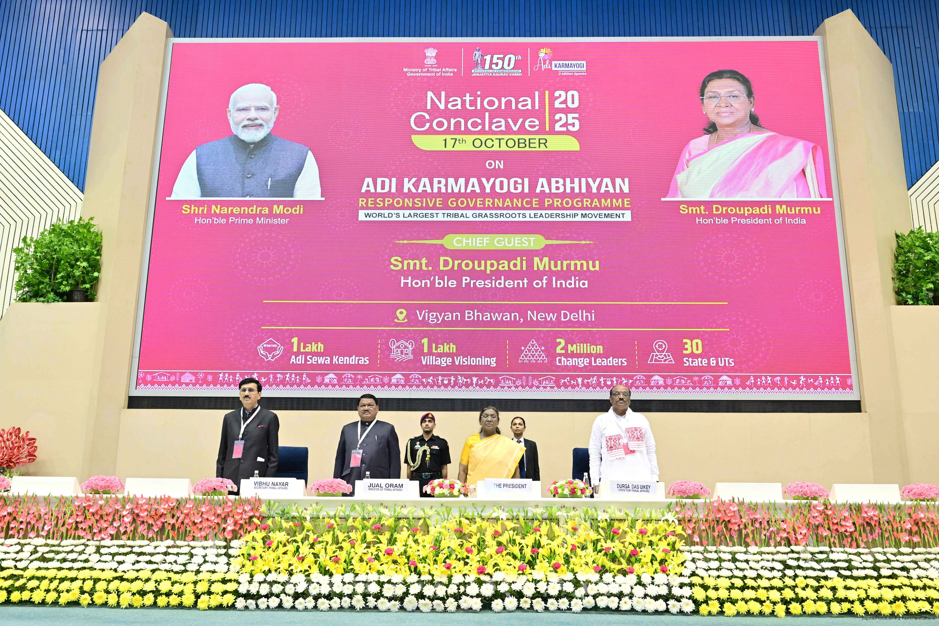 | Caption: | The President of India, Smt. Droupadi Murmu addressed the national conclave on the ‘Adi Karmayogi Abhiyan’ and presented awards to the best-performing states, districts, blocks, and Integrated Tribal Development Agencies at a function held in New Delhi on October 17, 2025. |