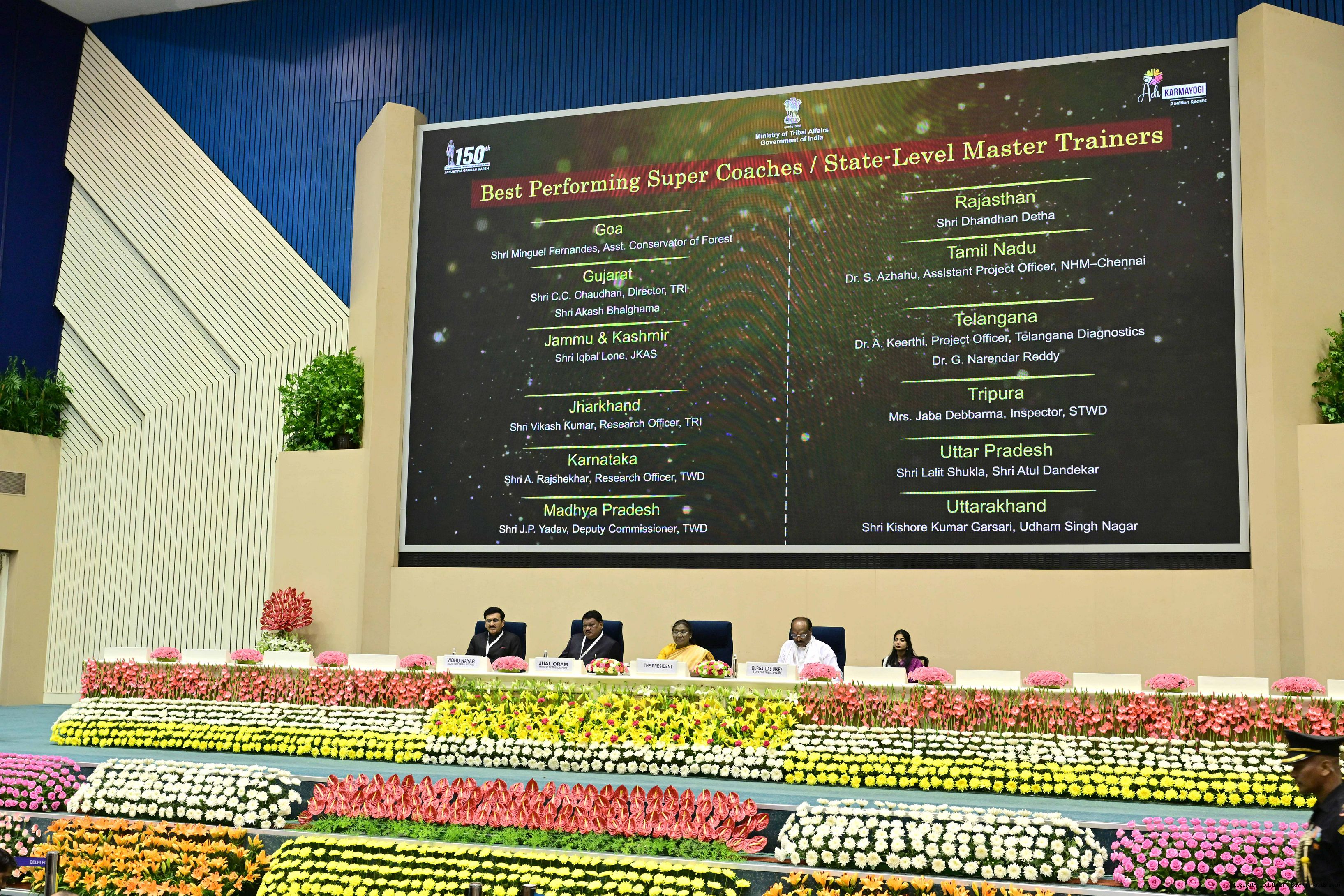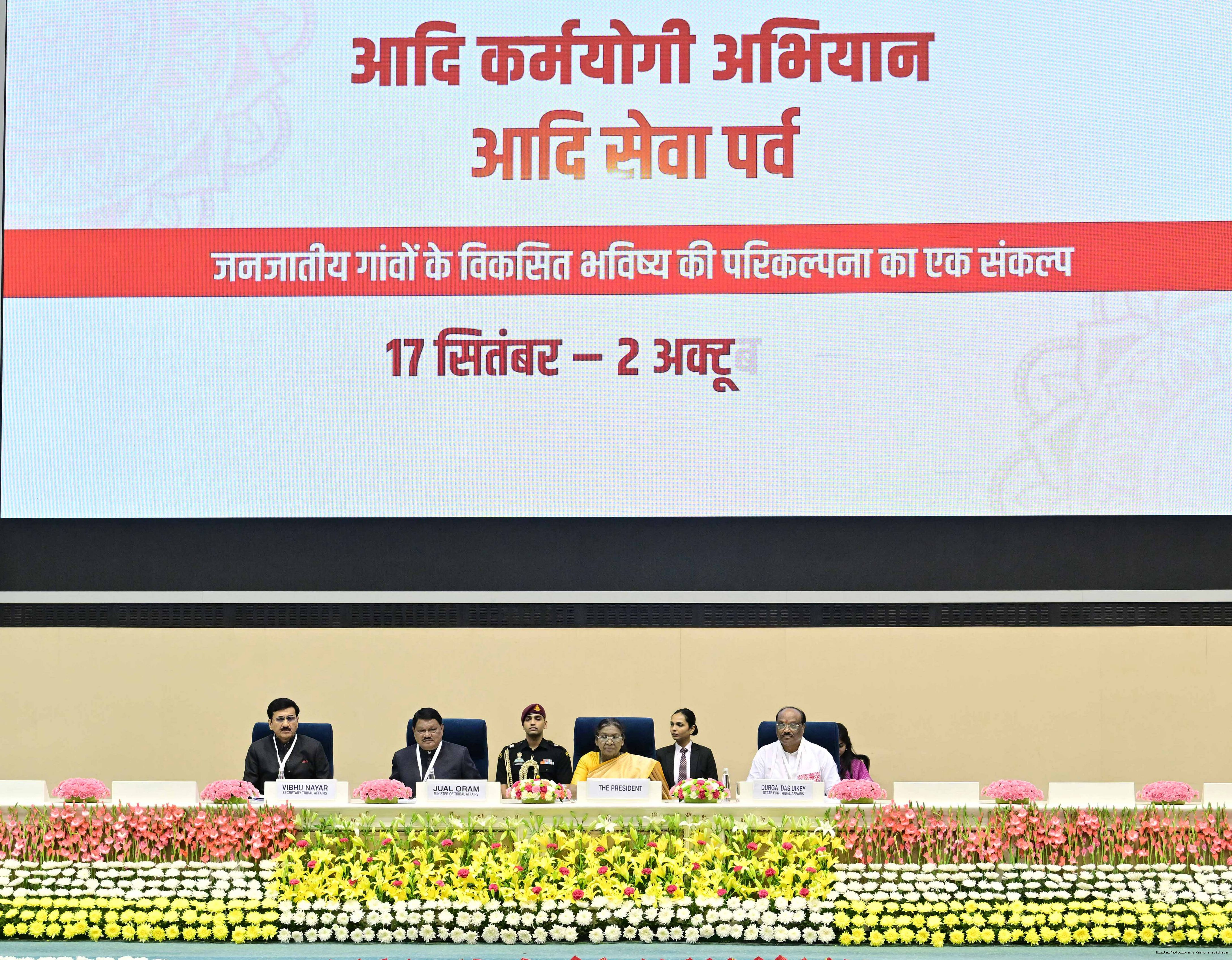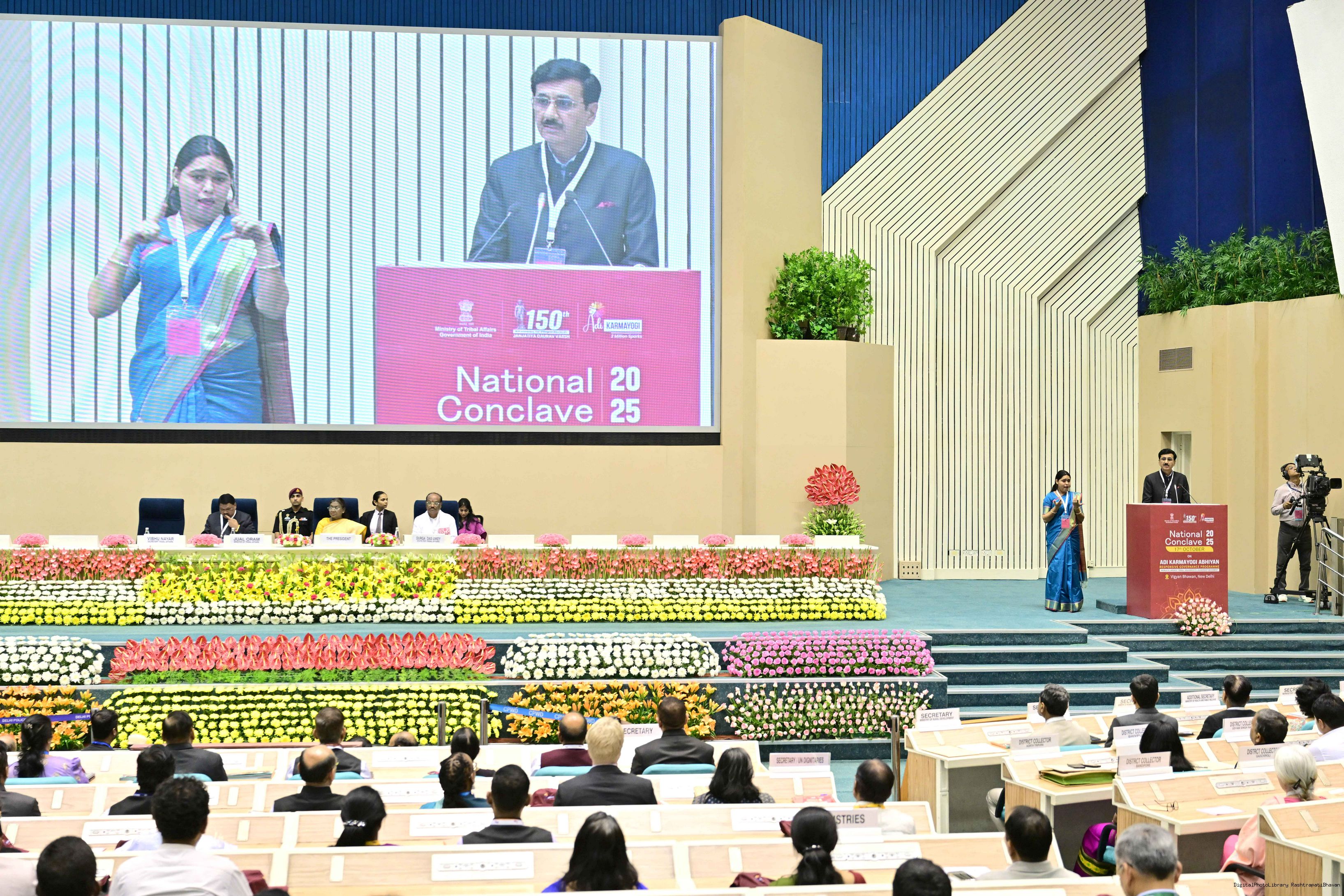 | Caption: | The President of India, Smt. Droupadi Murmu addressed the national conclave on the ‘Adi Karmayogi Abhiyan’ and presented awards to the best-performing states, districts, blocks, and Integrated Tribal Development Agencies at a function held in New Delhi on October 17, 2025. |