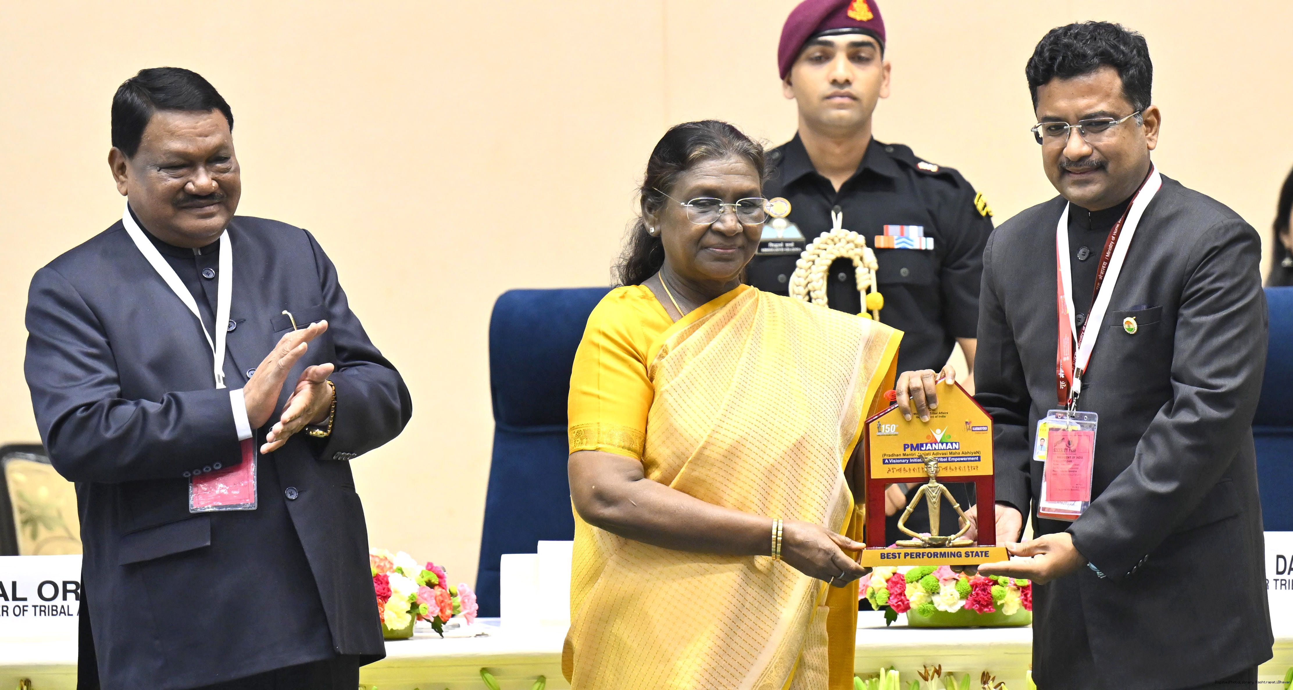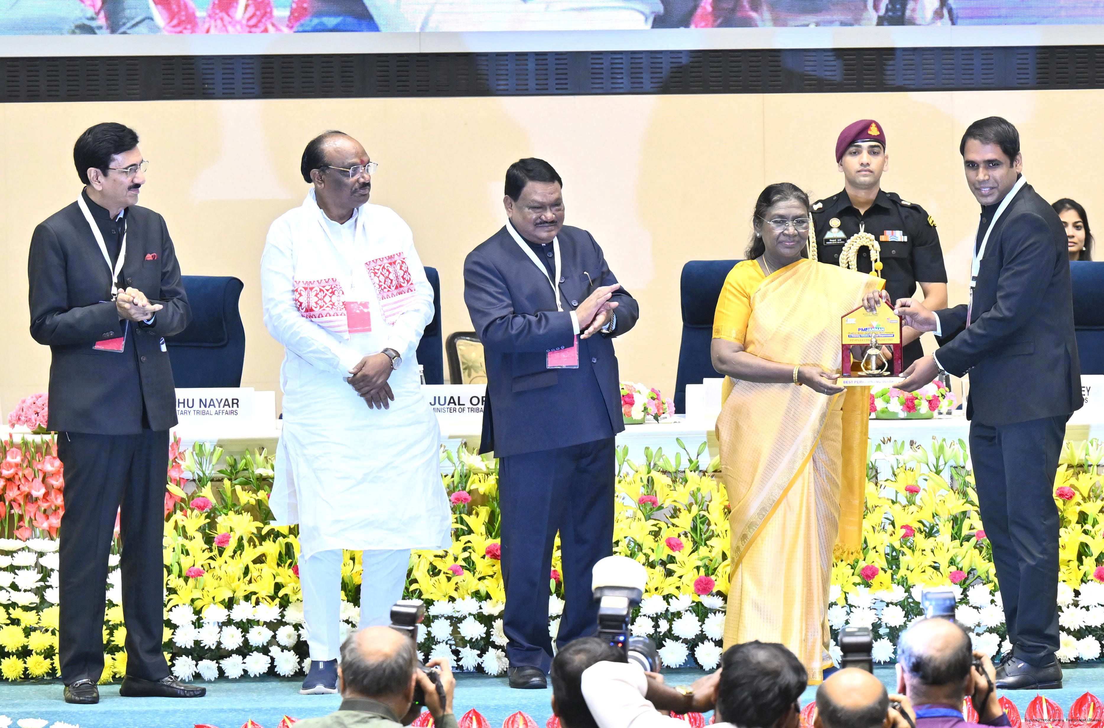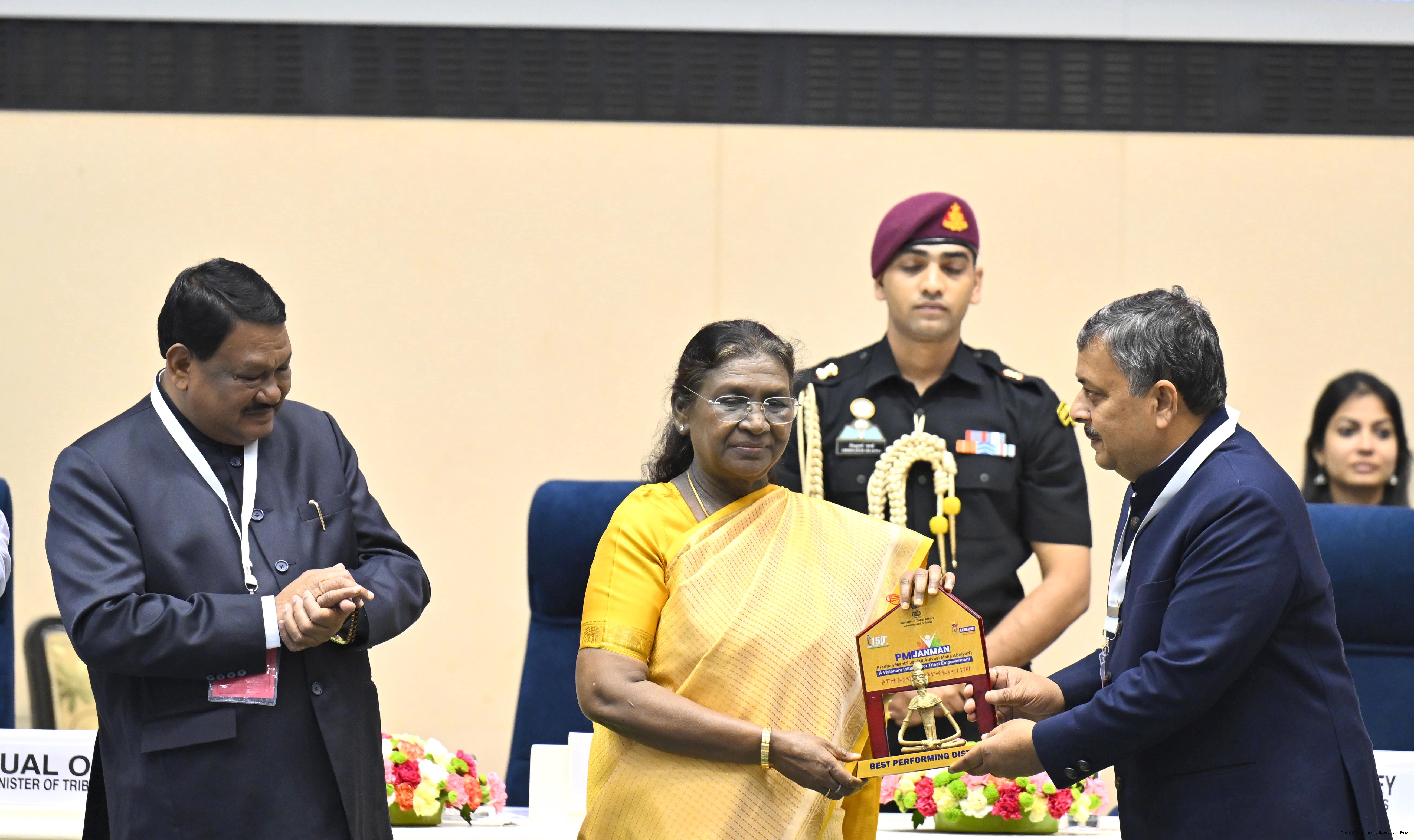 | Caption: | The President of India, Smt. Droupadi Murmu addressed the national conclave on the ‘Adi Karmayogi Abhiyan’ and presented awards to the best-performing states, districts, blocks, and Integrated Tribal Development Agencies at a function held in New Delhi on October 17, 2025. |