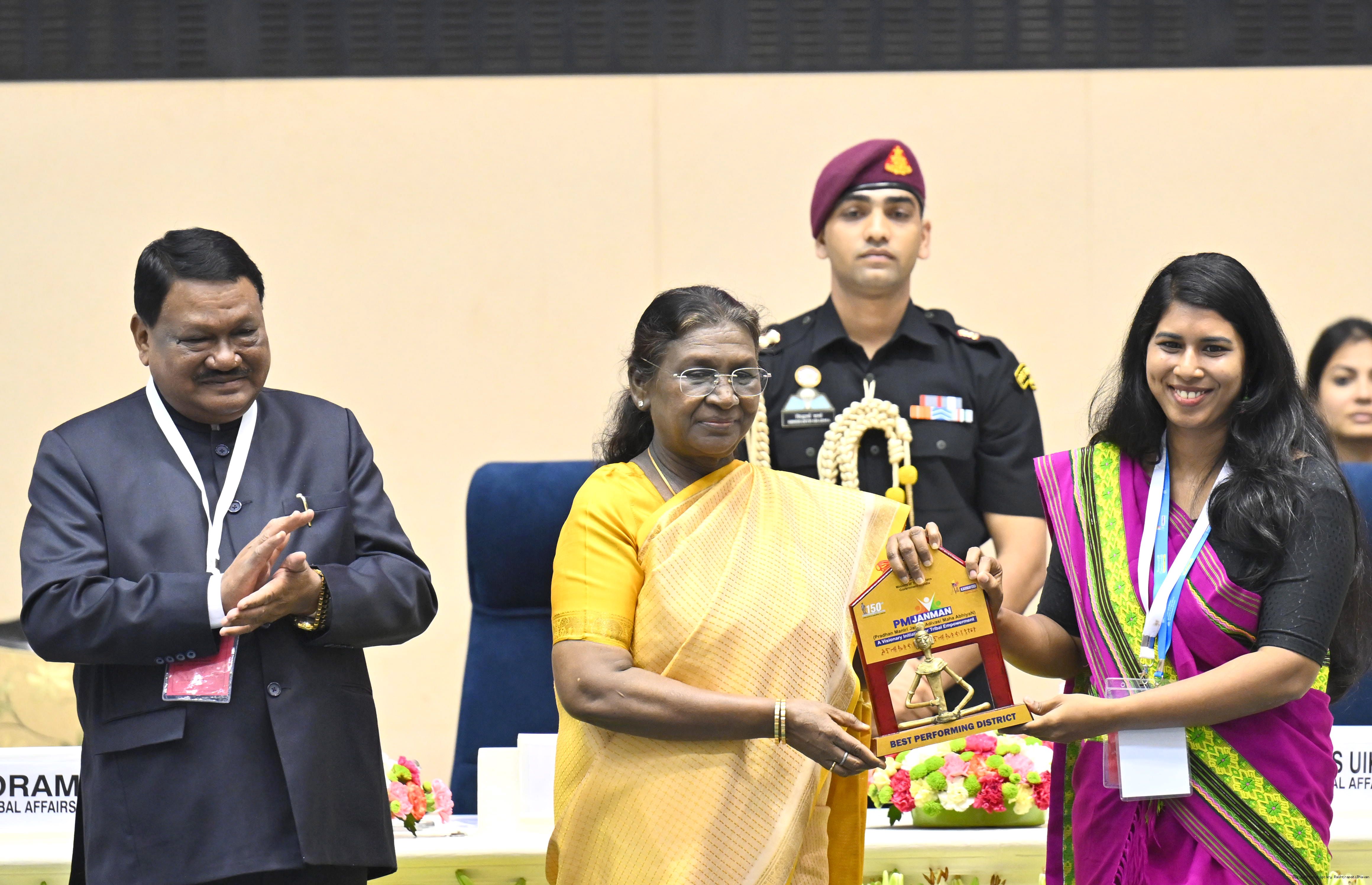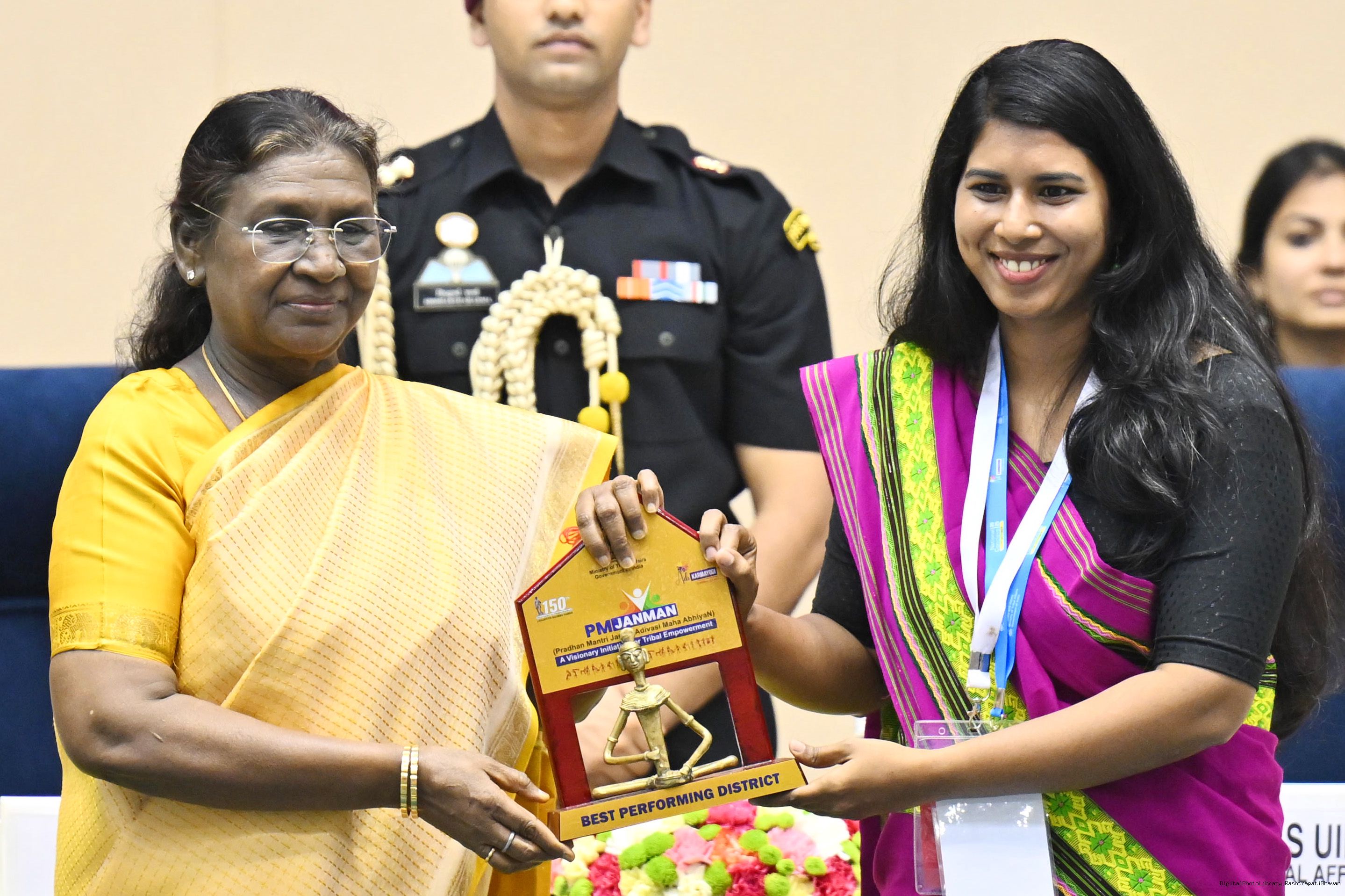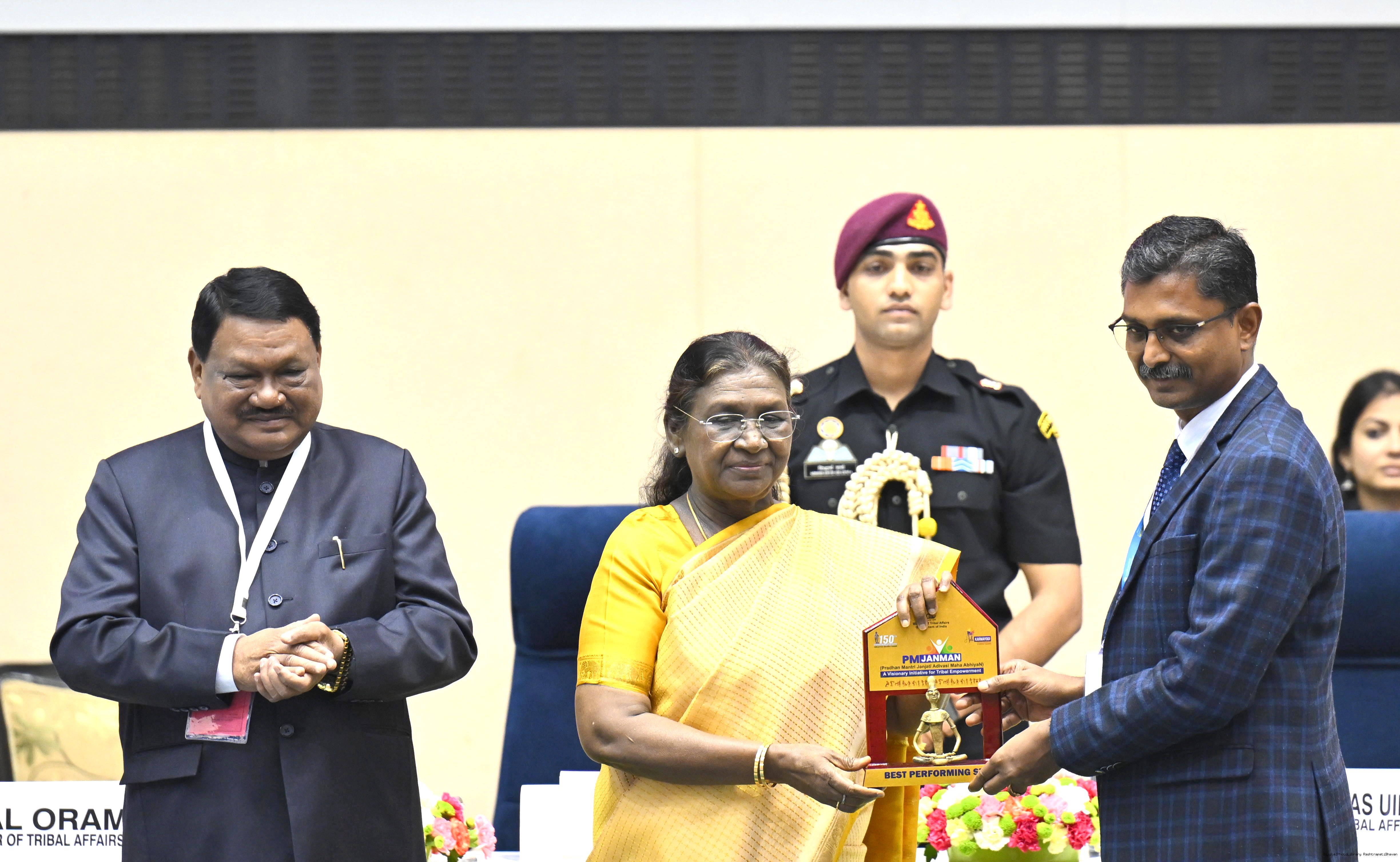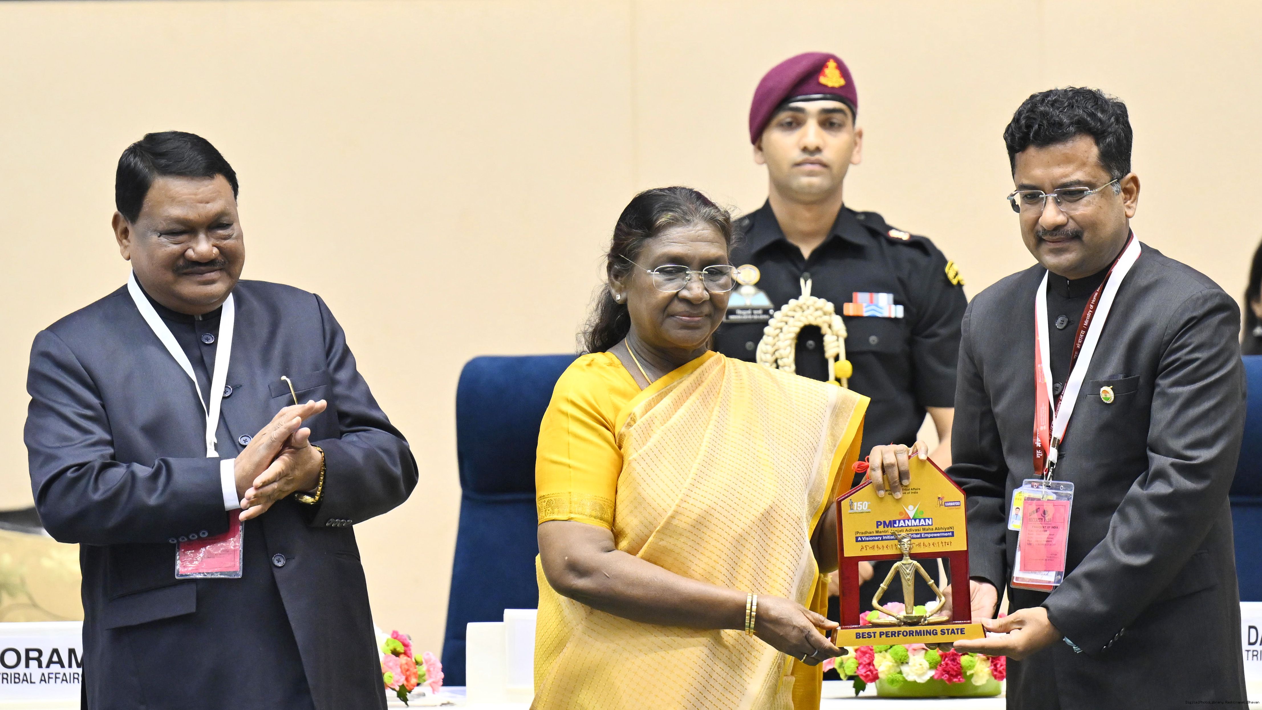| Caption: | The President of India, Smt. Droupadi Murmu addressed the national conclave on the ‘Adi Karmayogi Abhiyan’ and presented awards to the best-performing states, districts, blocks, and Integrated Tribal Development Agencies at a function held in New Delhi on October 17, 2025. |