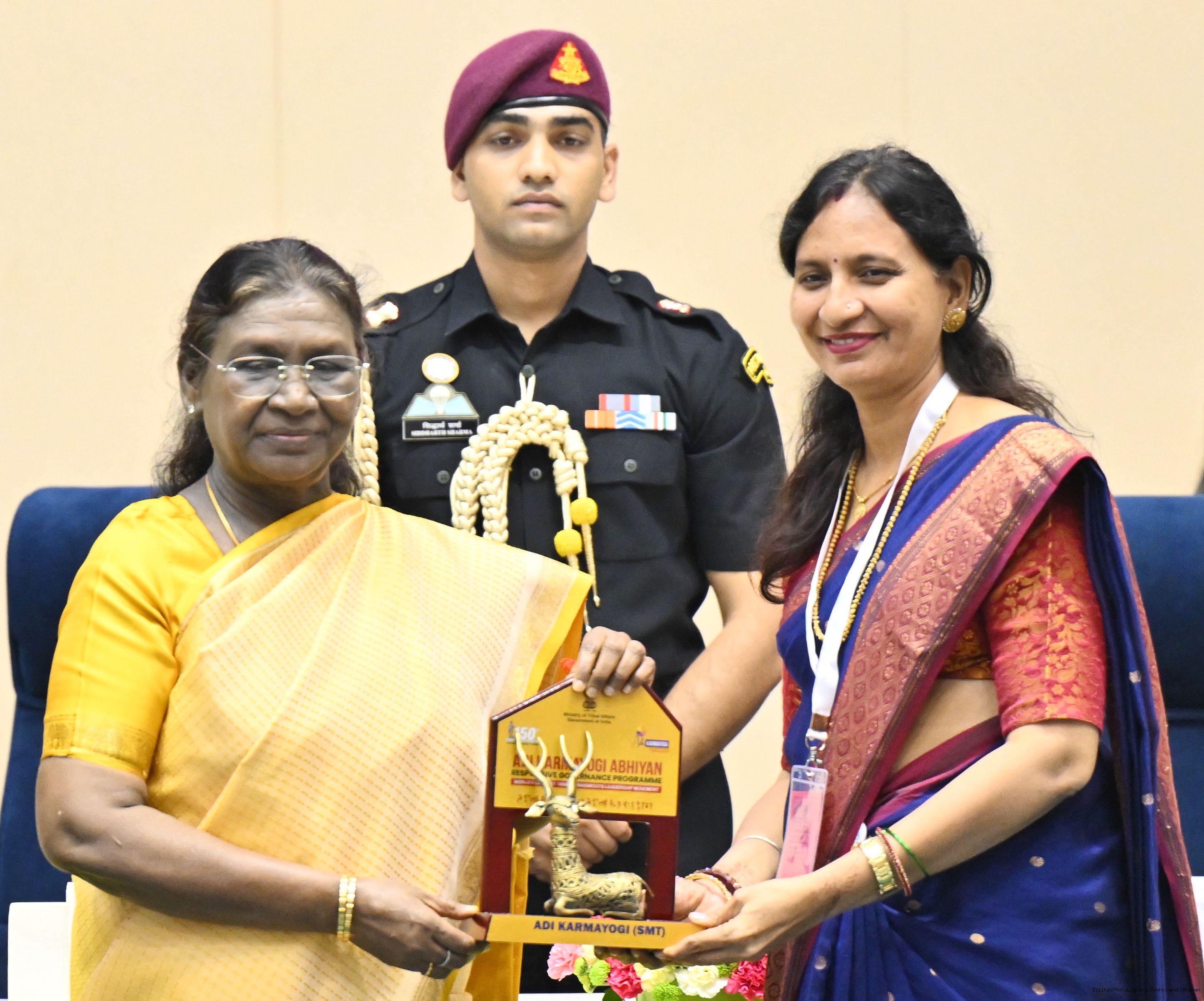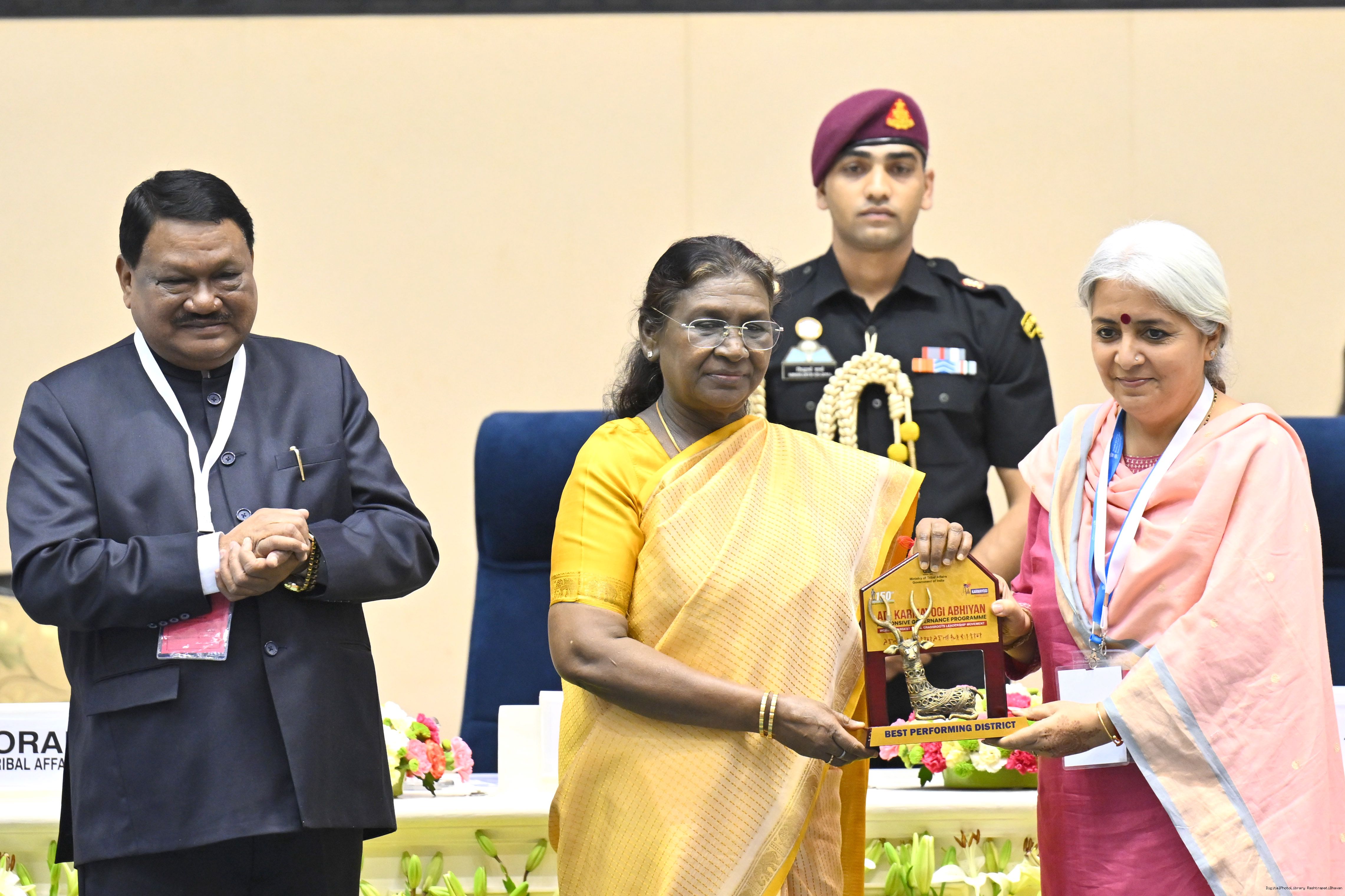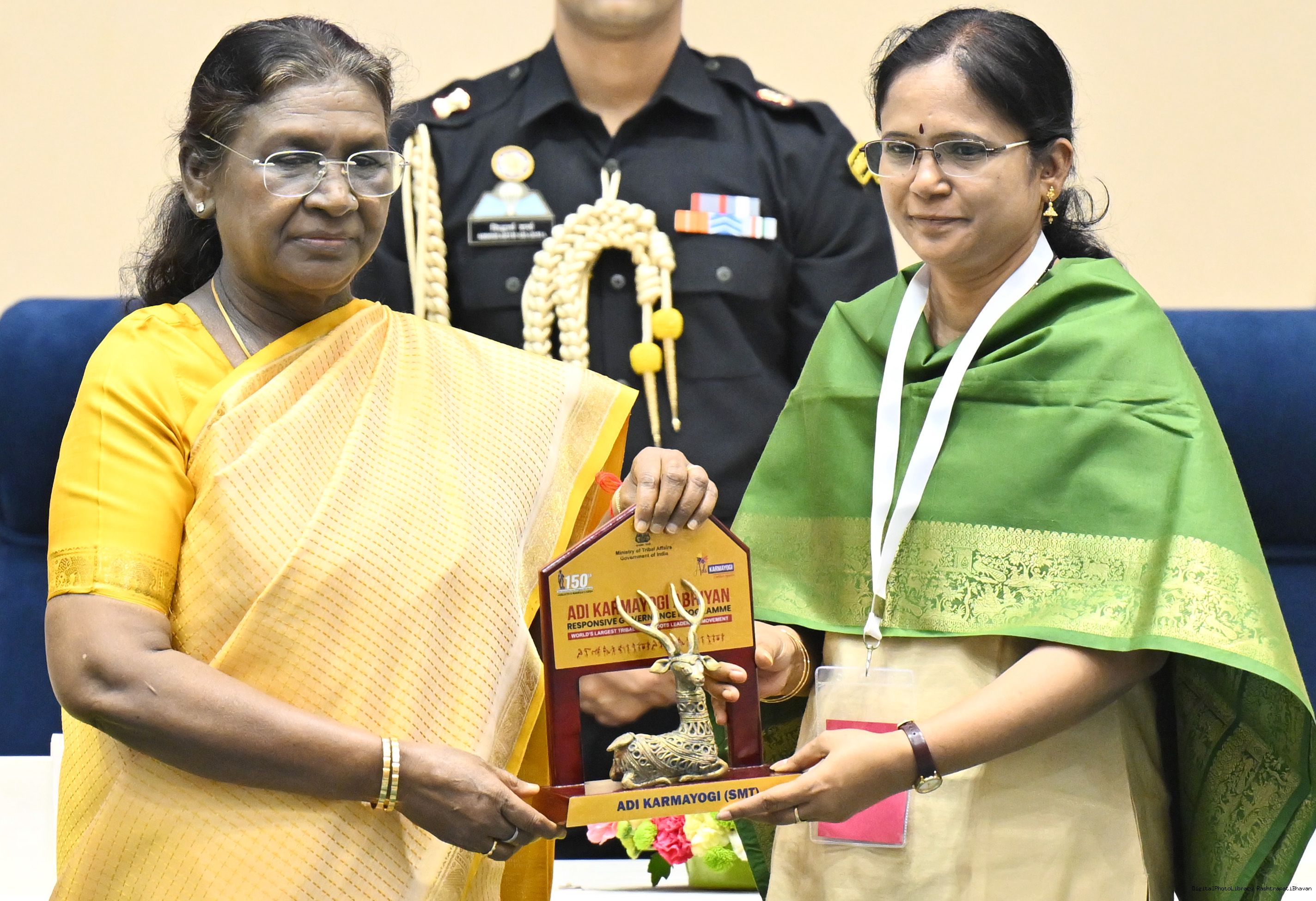 | Caption: | The President of India, Smt. Droupadi Murmu addressed the national conclave on the ‘Adi Karmayogi Abhiyan’ and presented awards to the best-performing states, districts, blocks, and Integrated Tribal Development Agencies at a function held in New Delhi on October 17, 2025. |