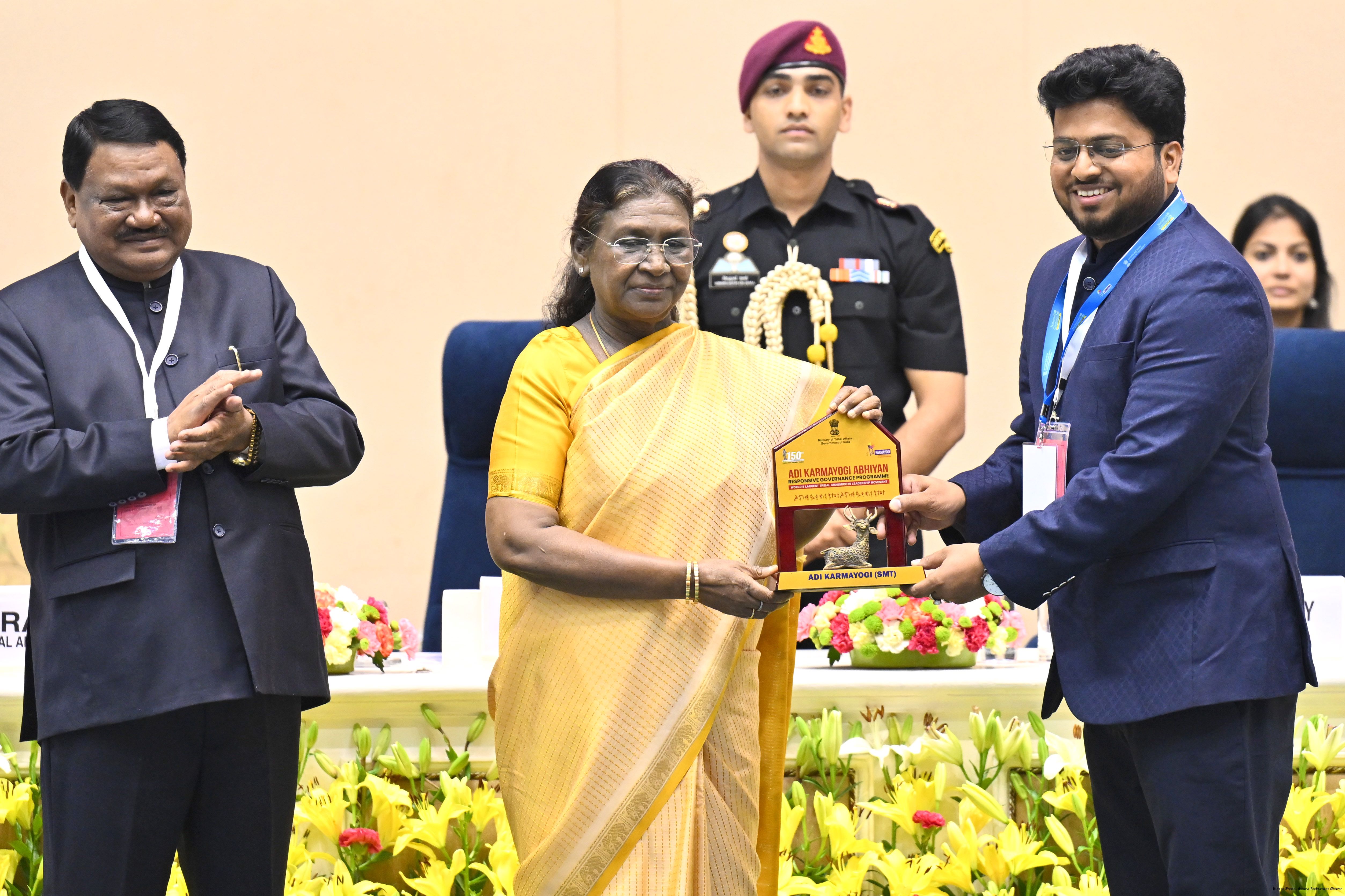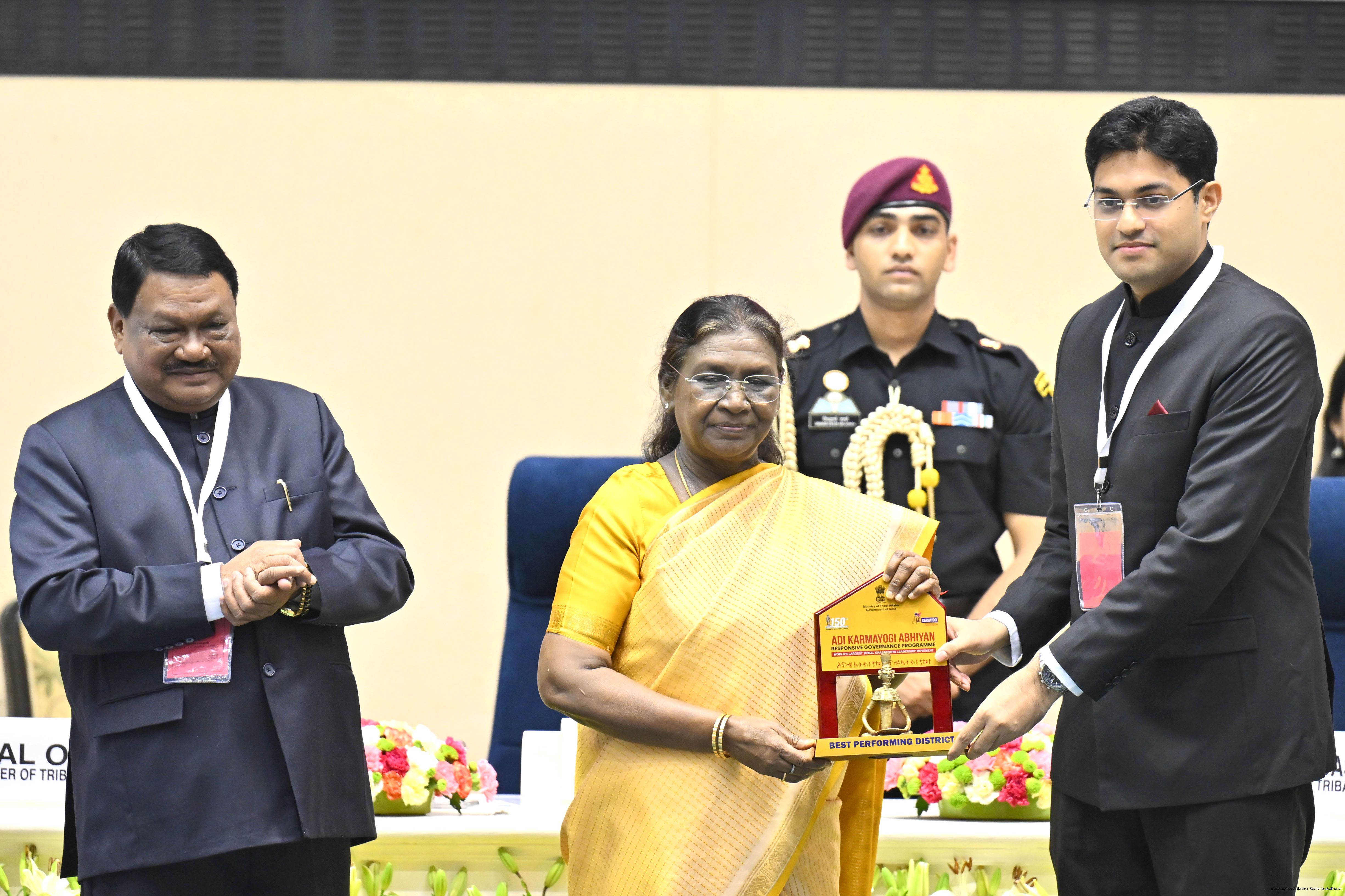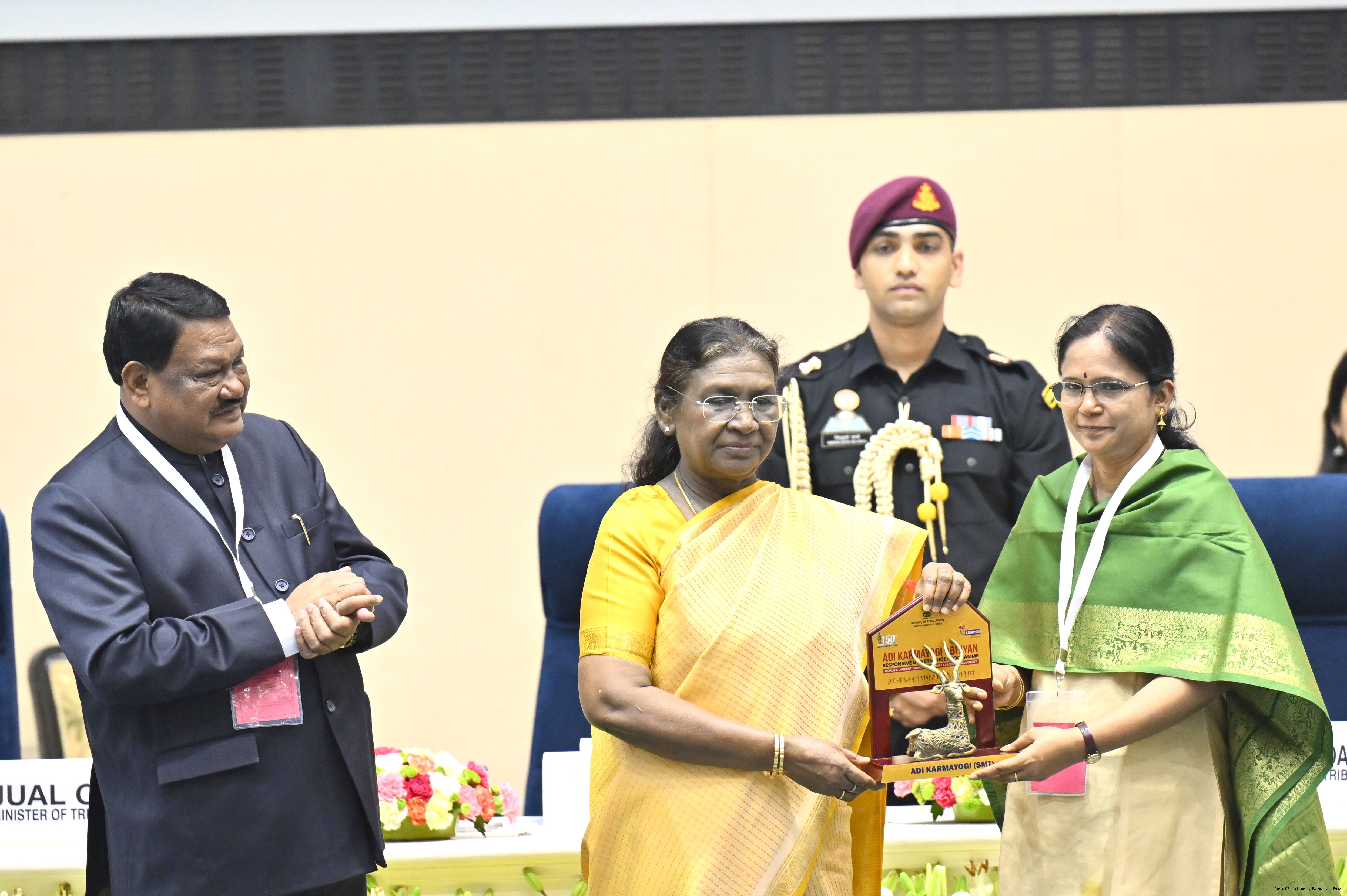 | Caption: | The President of India, Smt. Droupadi Murmu addressed the national conclave on the ‘Adi Karmayogi Abhiyan’ and presented awards to the best-performing states, districts, blocks, and Integrated Tribal Development Agencies at a function held in New Delhi on October 17, 2025. |