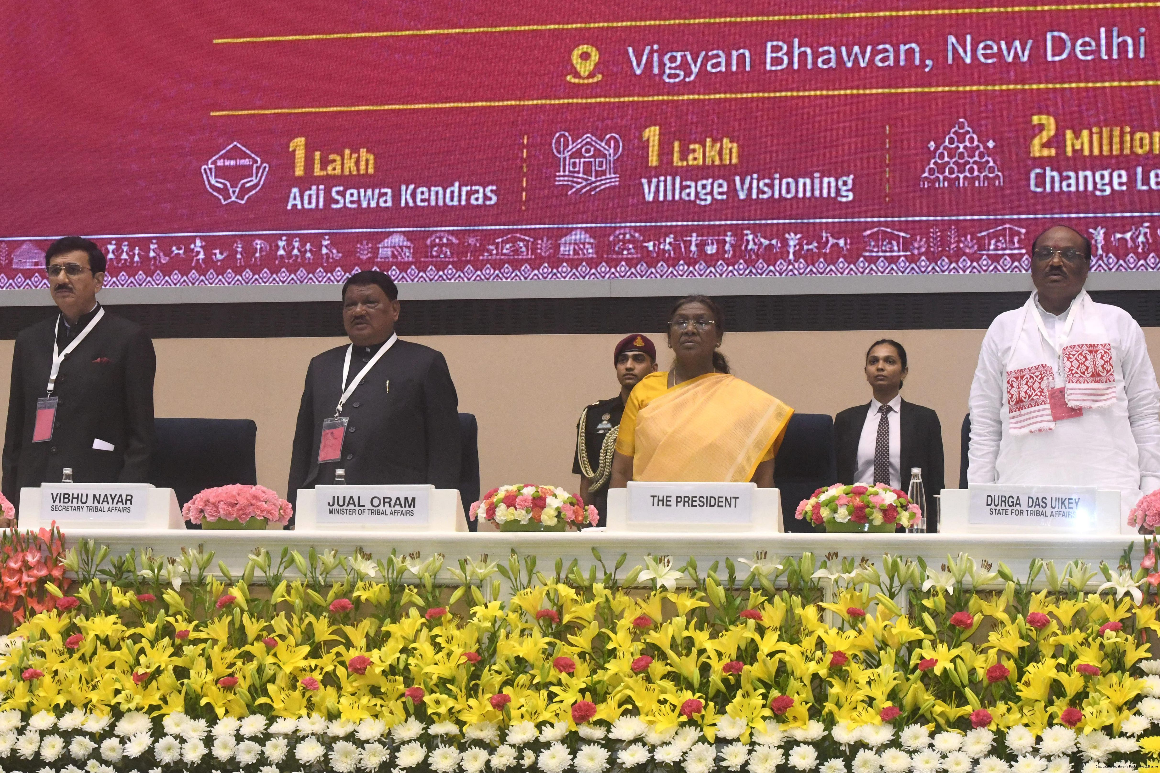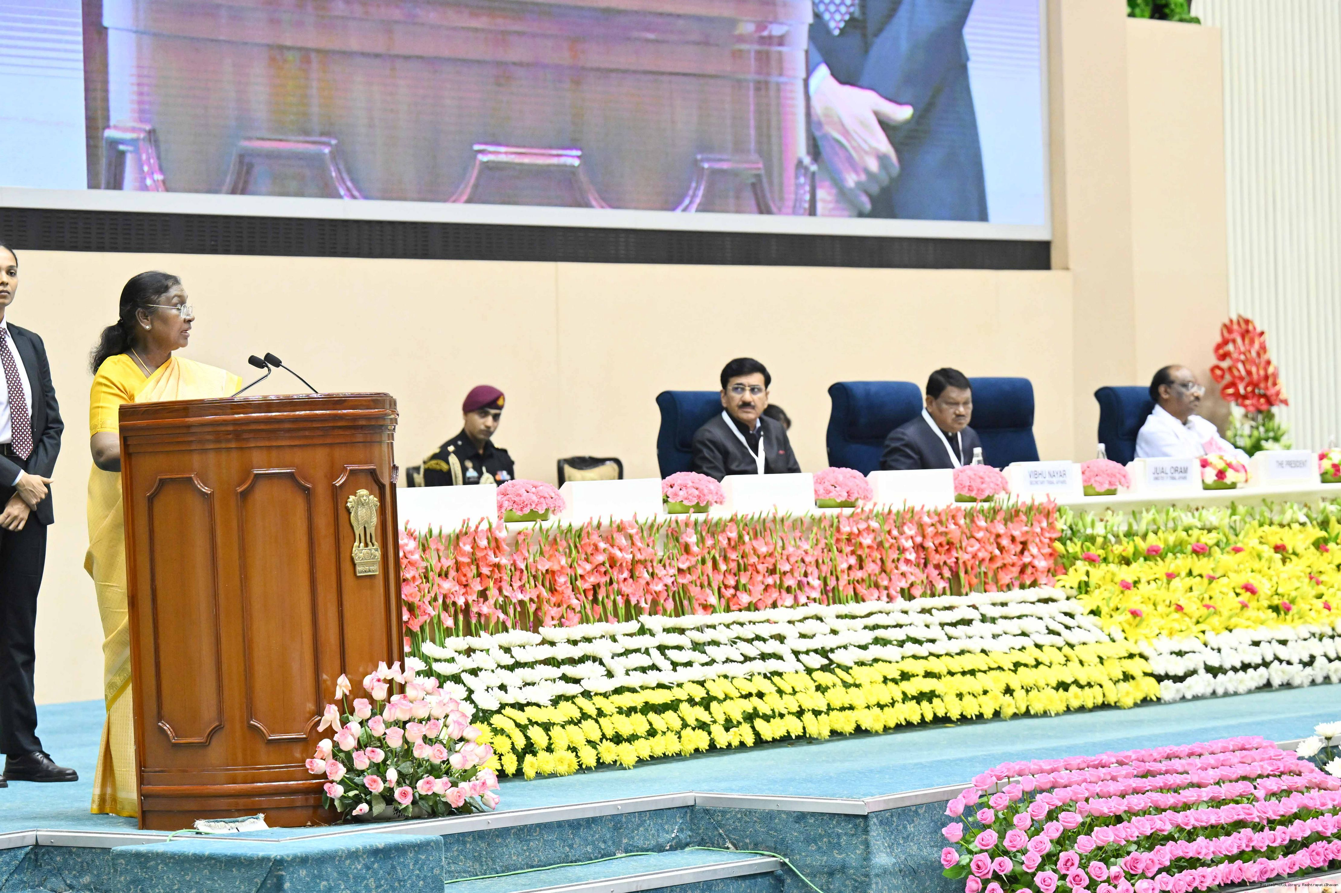 | Caption: | The President of India, Smt. Droupadi Murmu addressed the national conclave on the ‘Adi Karmayogi Abhiyan’ and presented awards to the best-performing states, districts, blocks, and Integrated Tribal Development Agencies at a function held in New Delhi on October 17, 2025. |