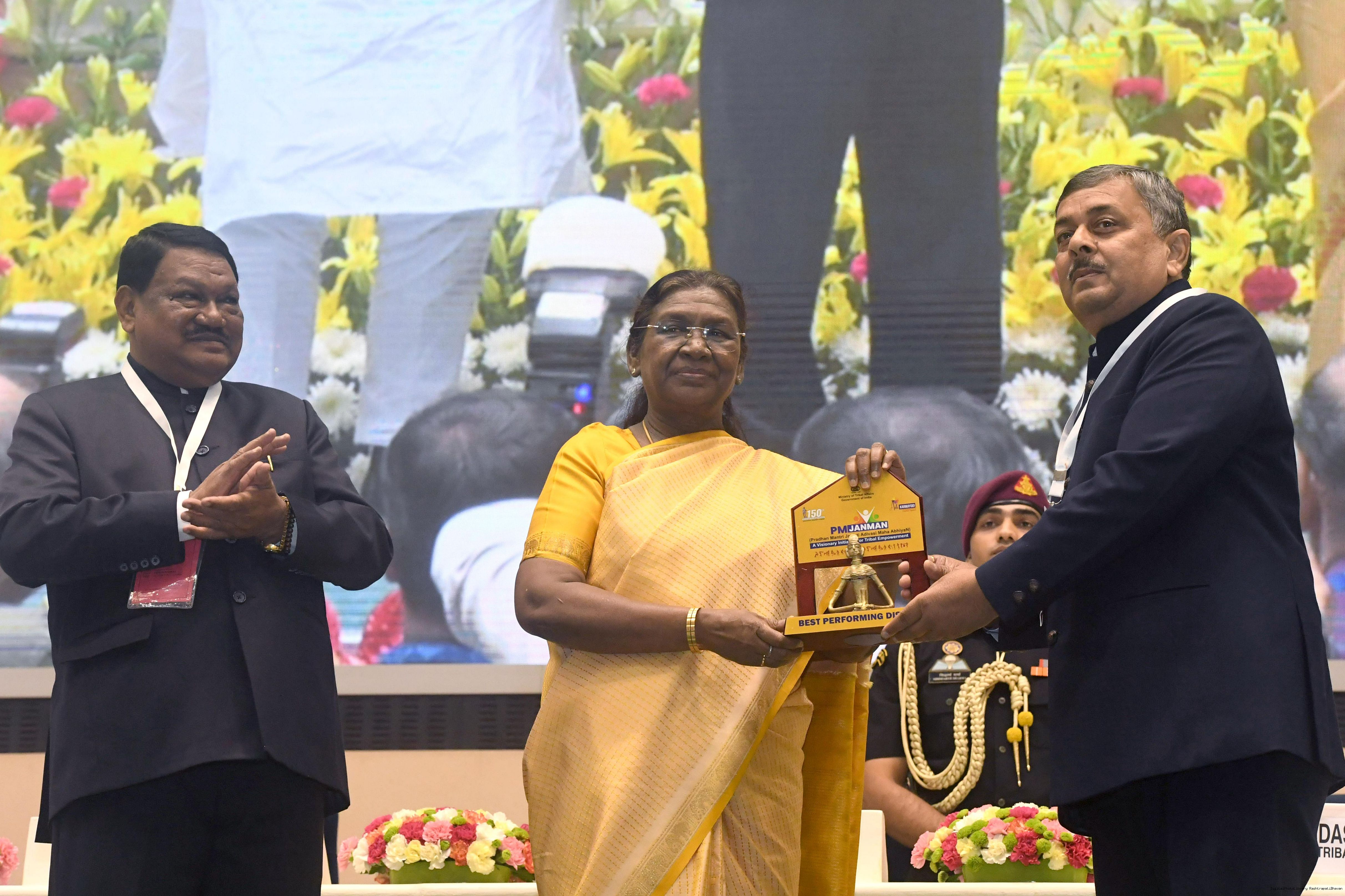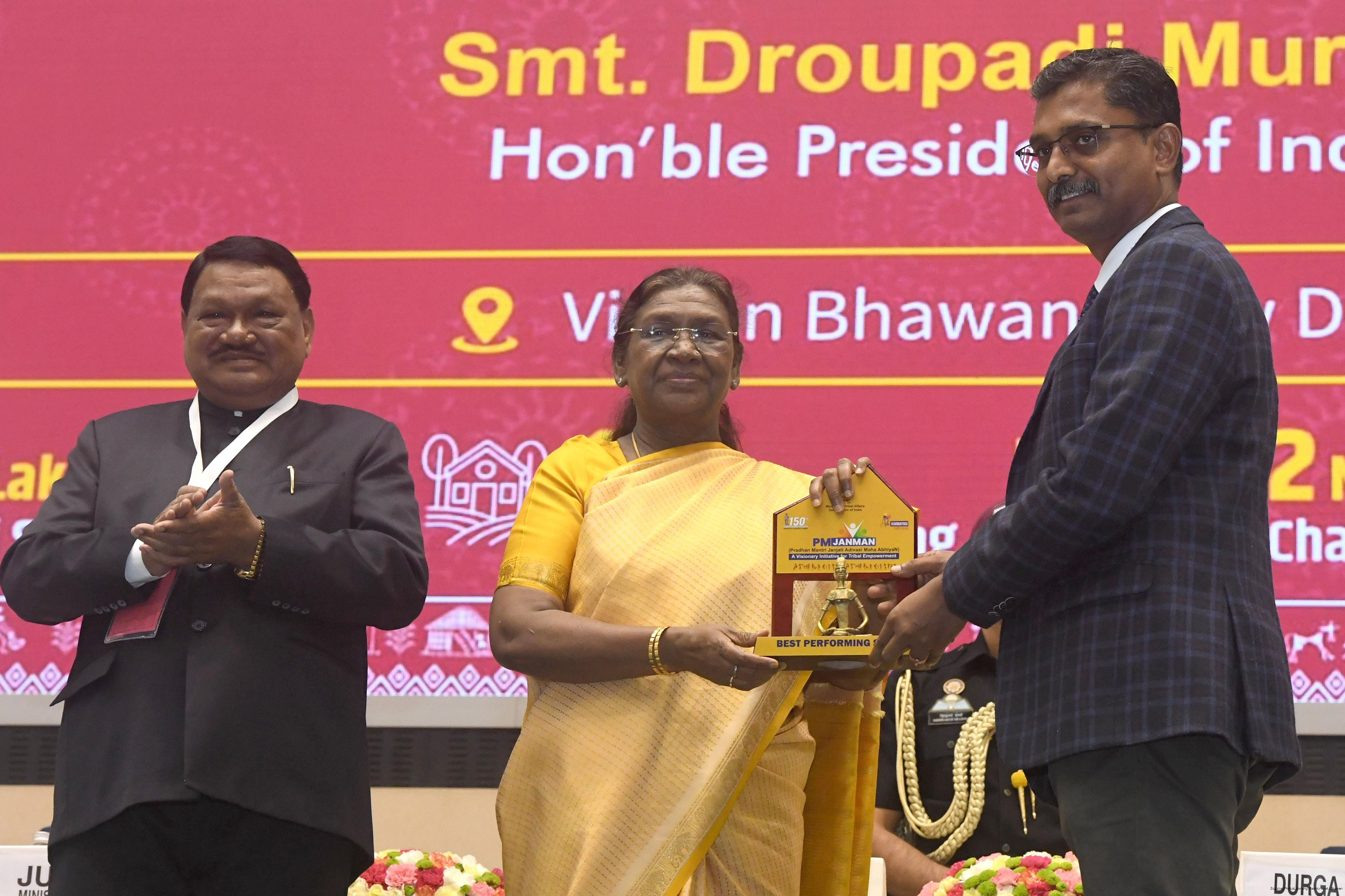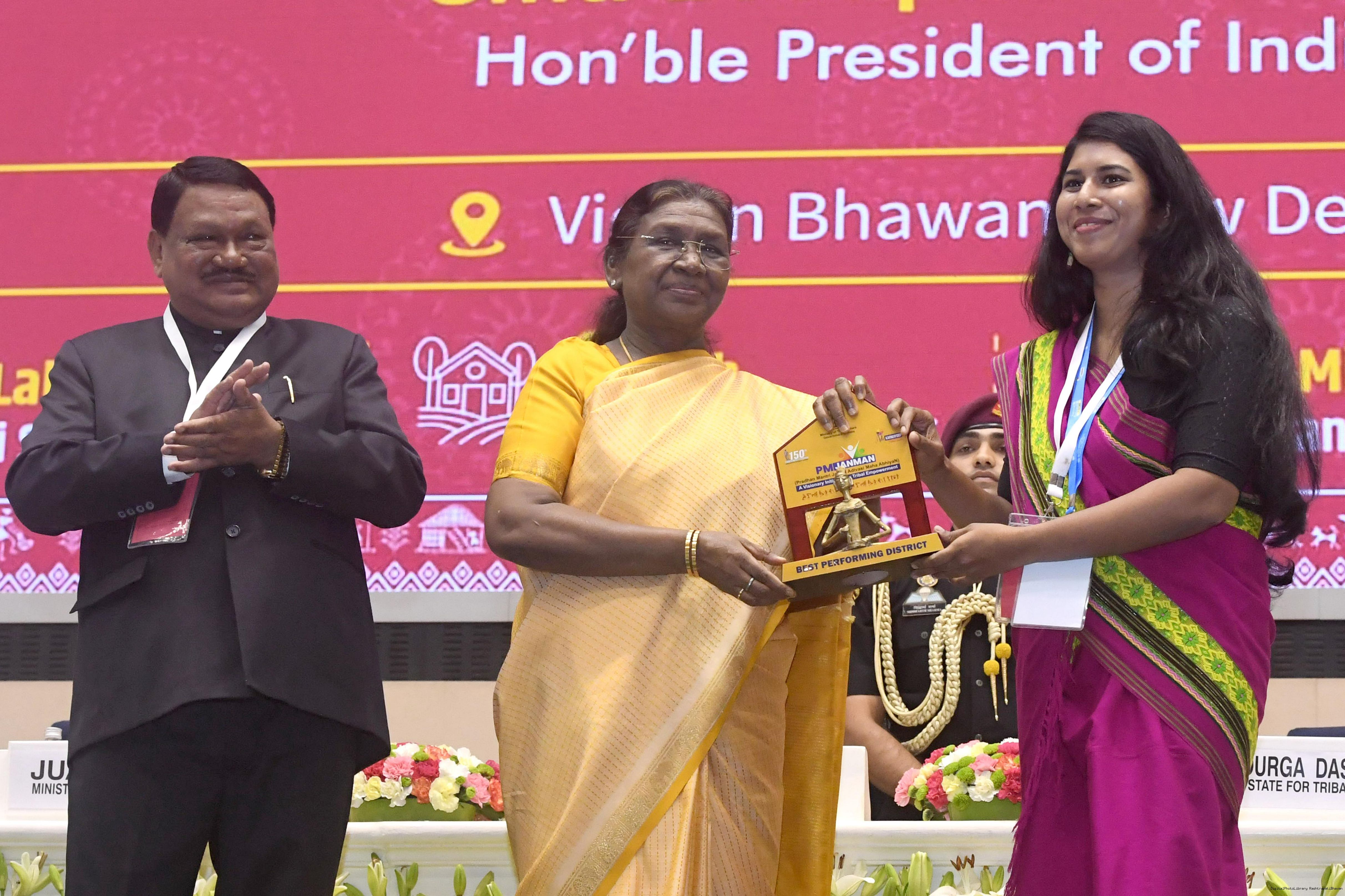 | Caption: | The President of India, Smt. Droupadi Murmu addressed the national conclave on the ‘Adi Karmayogi Abhiyan’ and presented awards to the best-performing states, districts, blocks, and Integrated Tribal Development Agencies at a function held in New Delhi on October 17, 2025. |