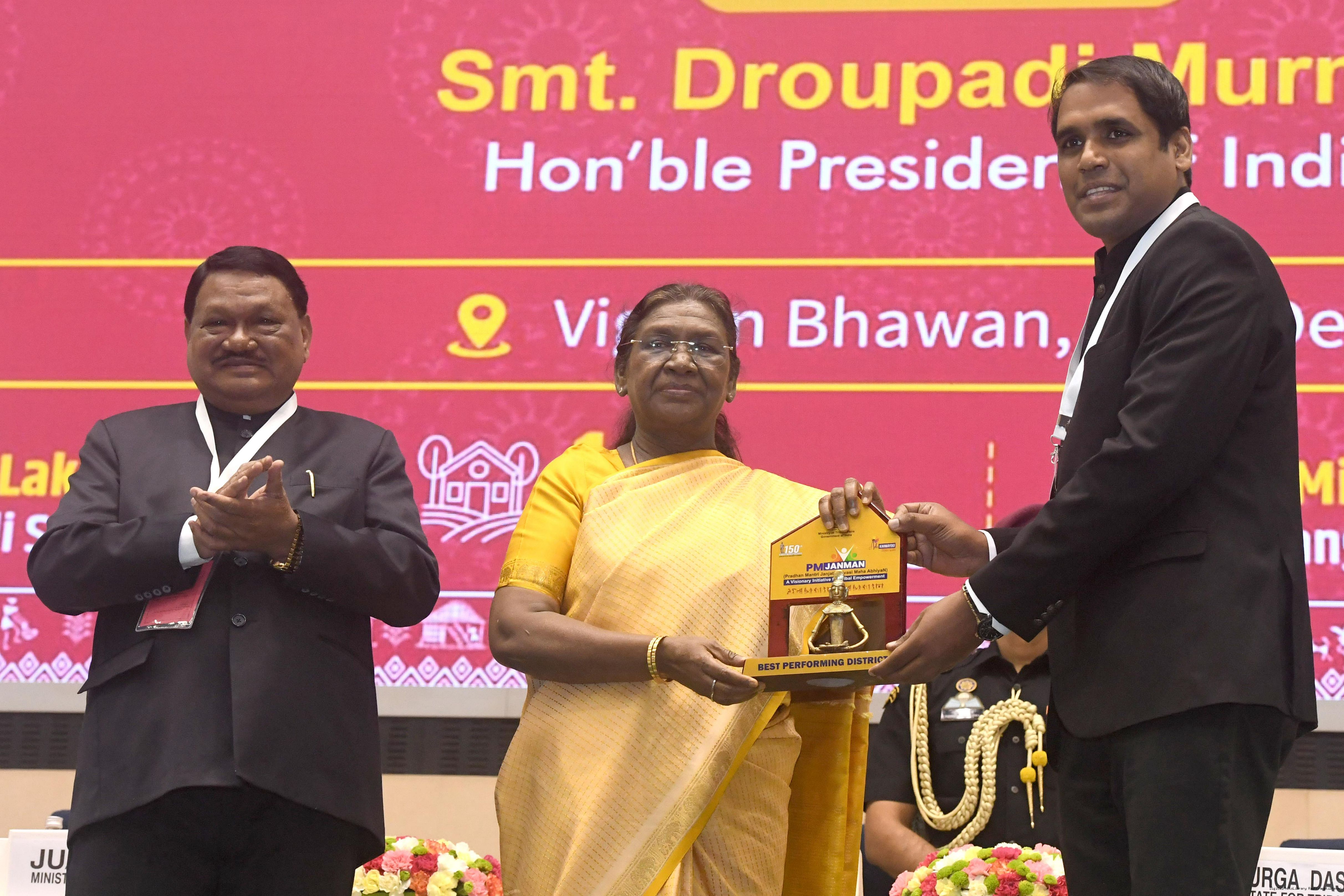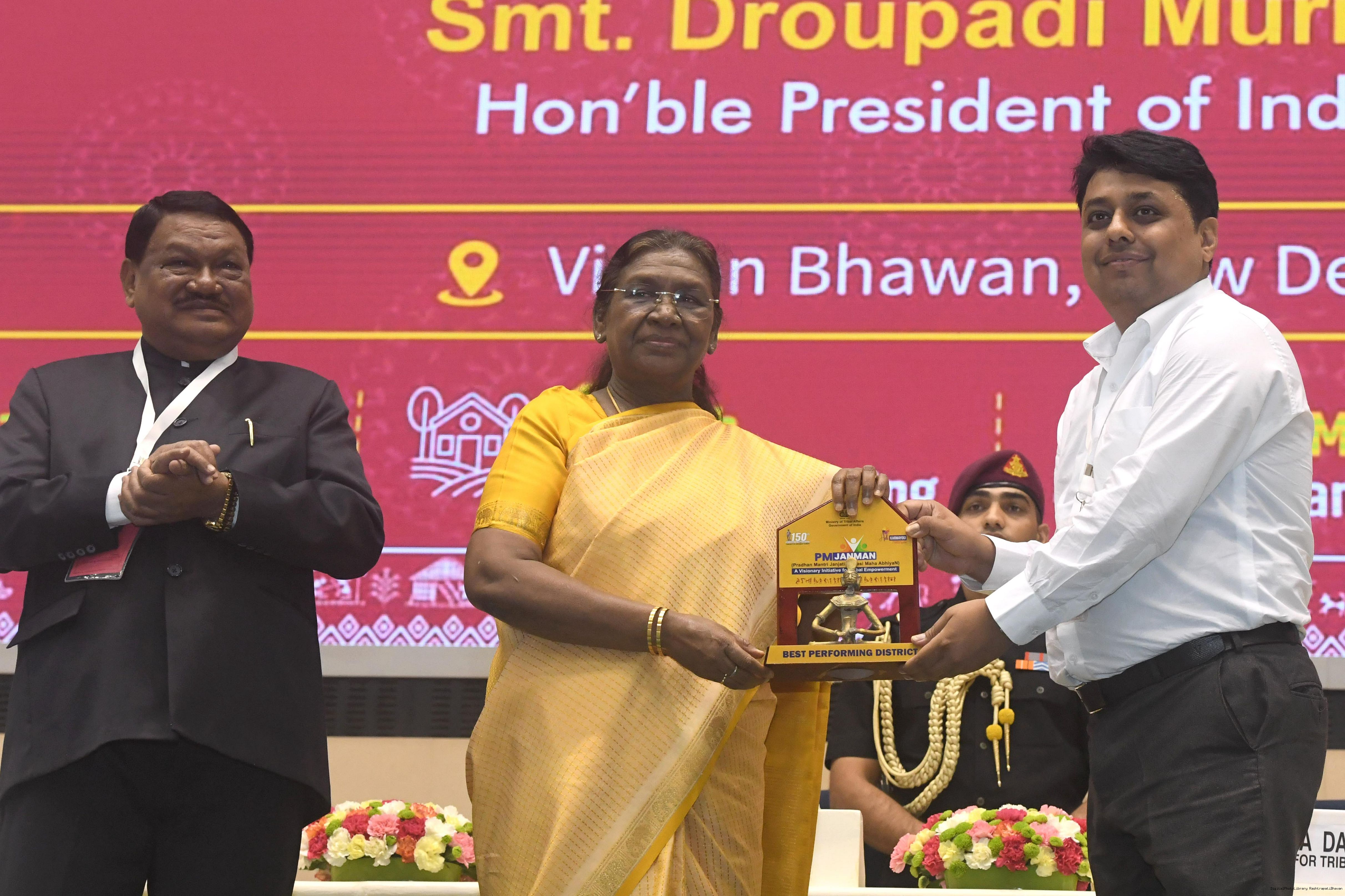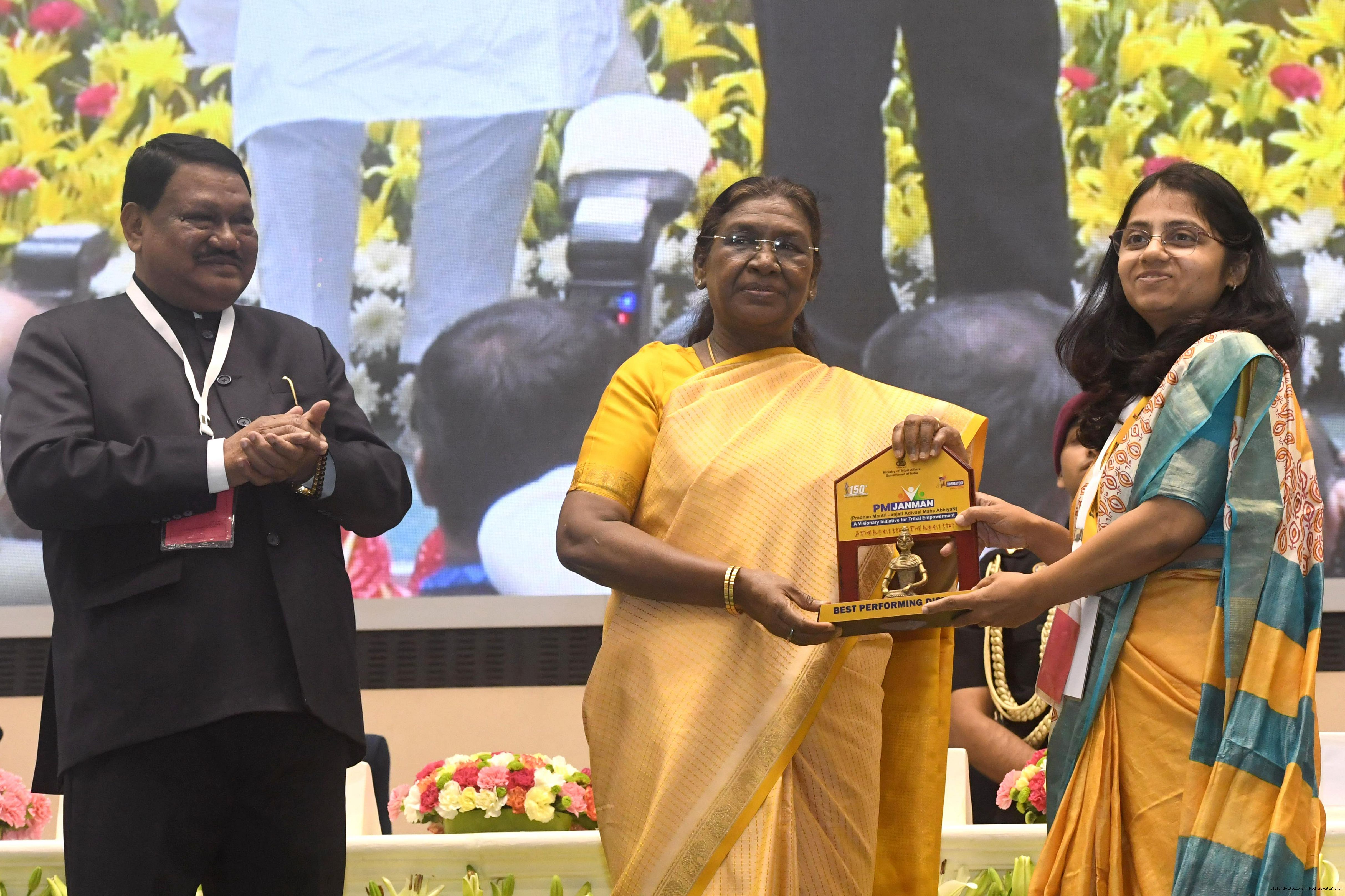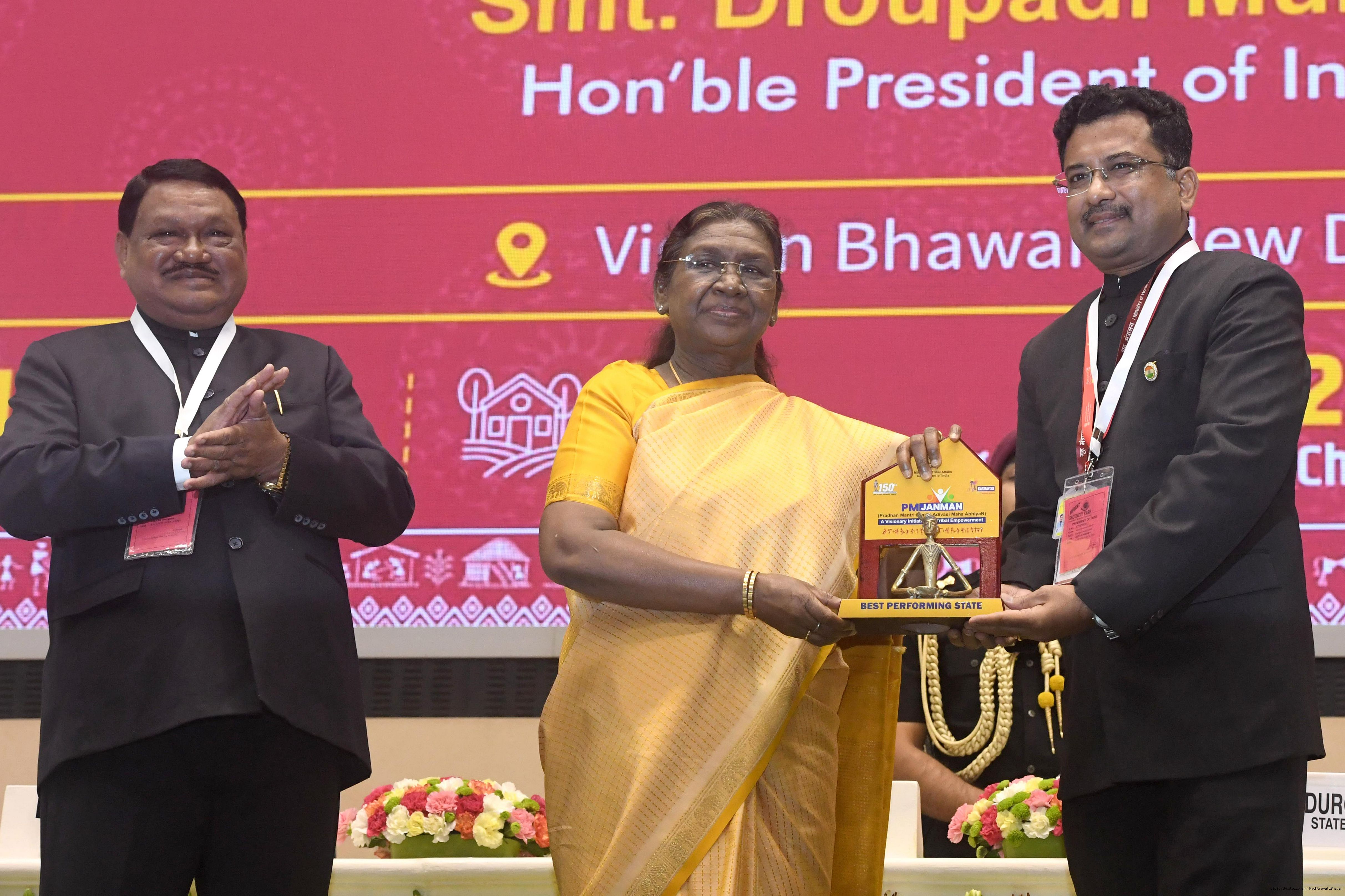 | Caption: | The President of India, Smt. Droupadi Murmu addressed the national conclave on the ‘Adi Karmayogi Abhiyan’ and presented awards to the best-performing states, districts, blocks, and Integrated Tribal Development Agencies at a function held in New Delhi on October 17, 2025. |