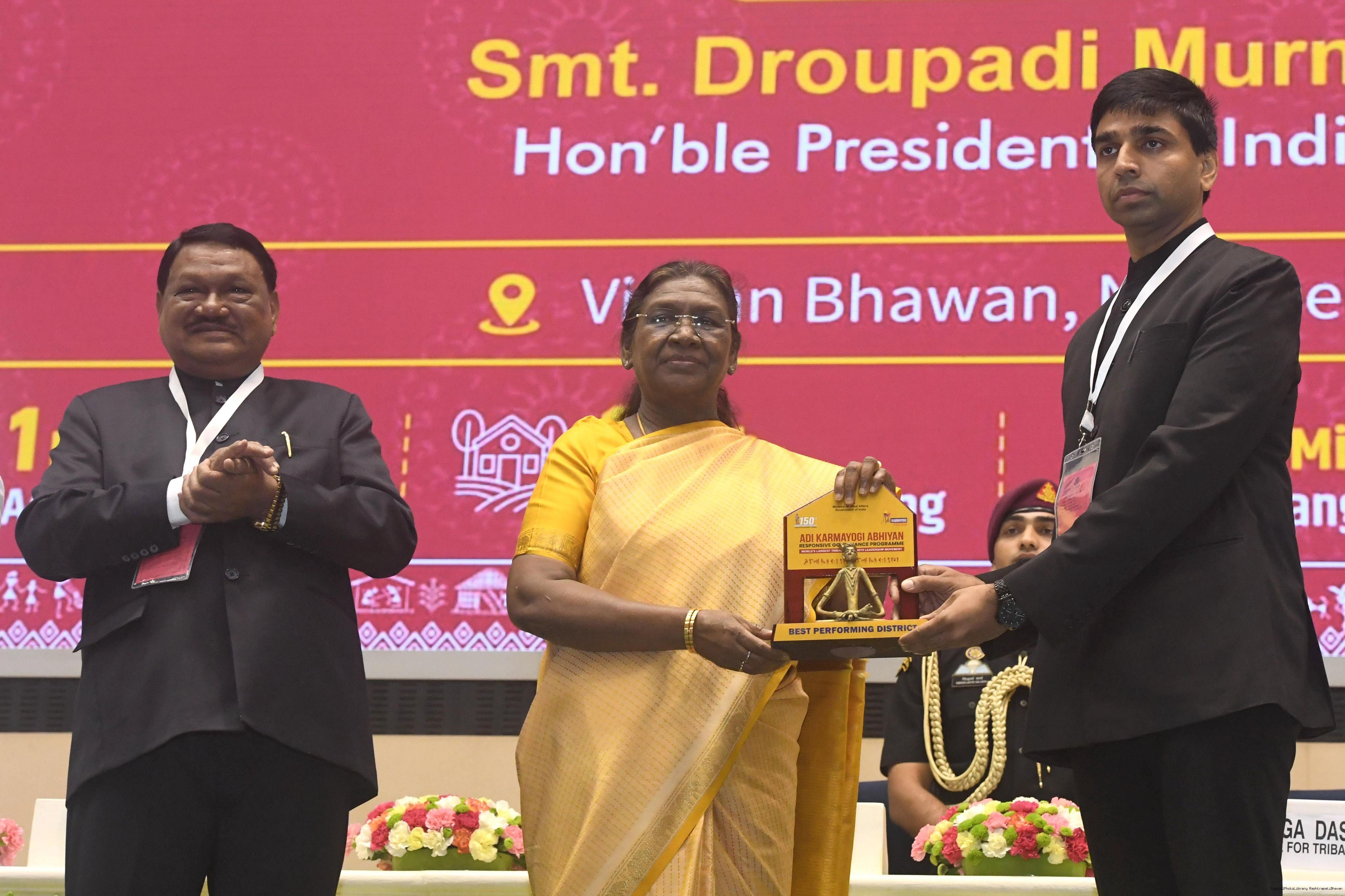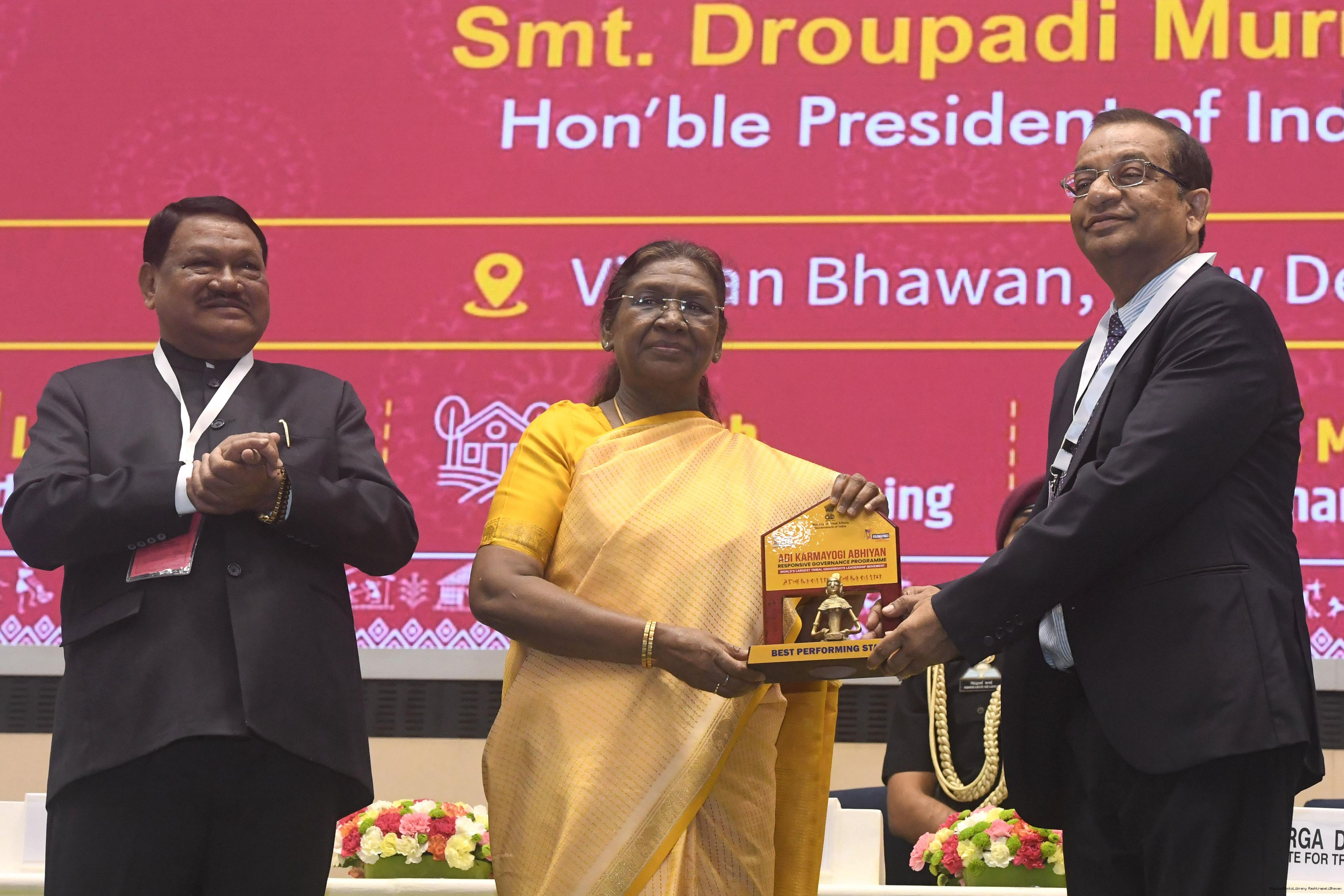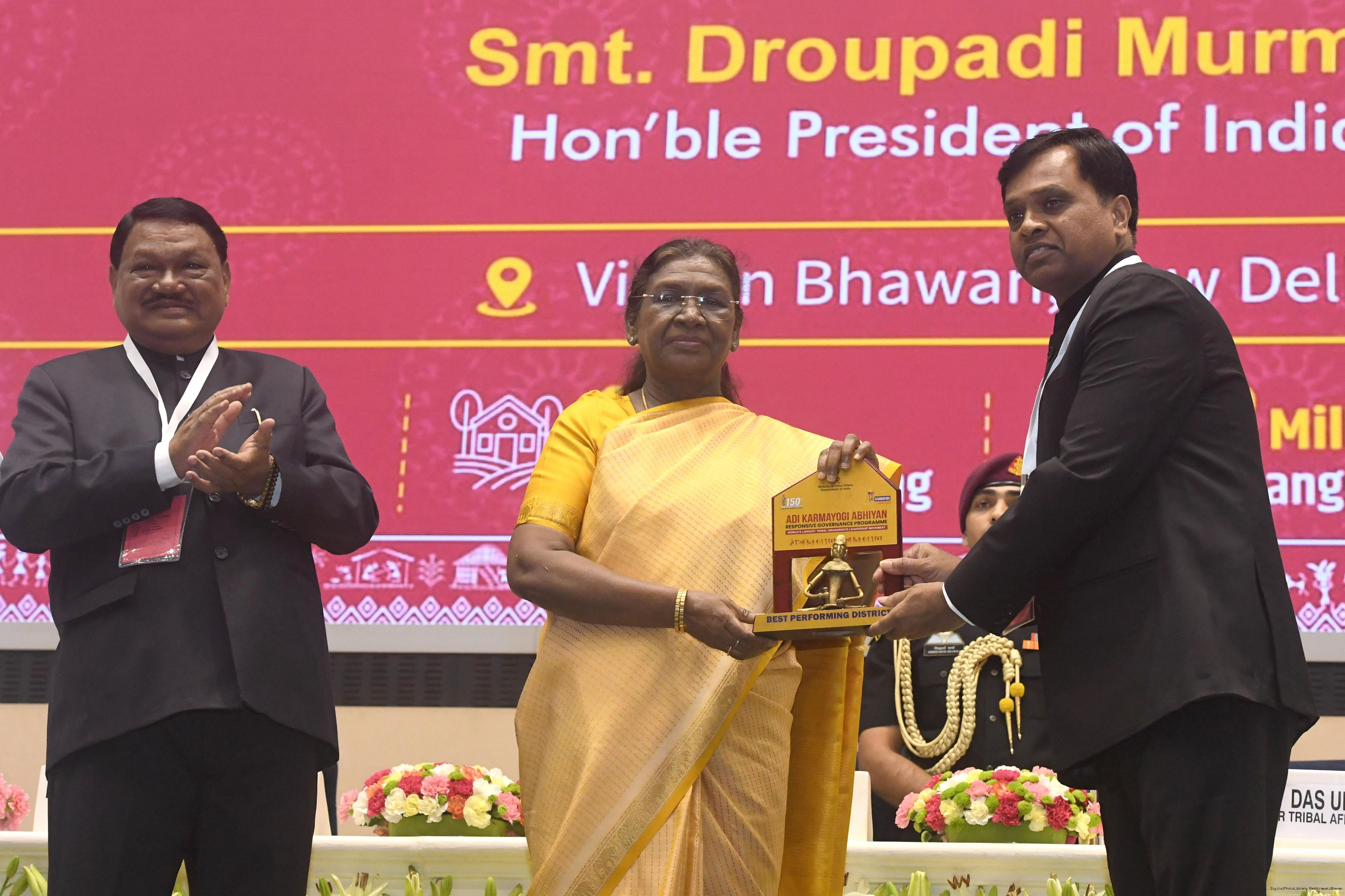 | Caption: | The President of India, Smt. Droupadi Murmu addressed the national conclave on the ‘Adi Karmayogi Abhiyan’ and presented awards to the best-performing states, districts, blocks, and Integrated Tribal Development Agencies at a function held in New Delhi on October 17, 2025. |