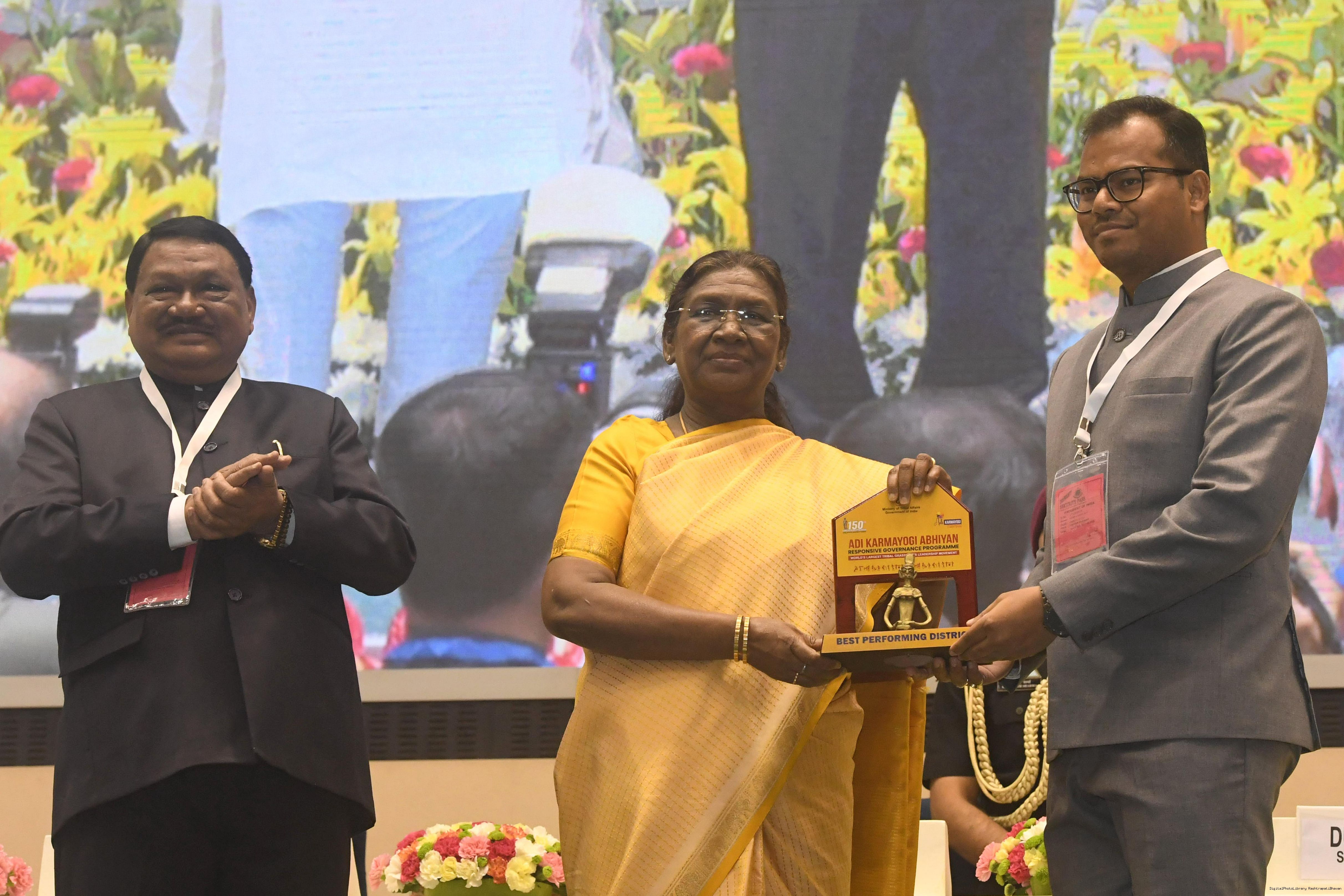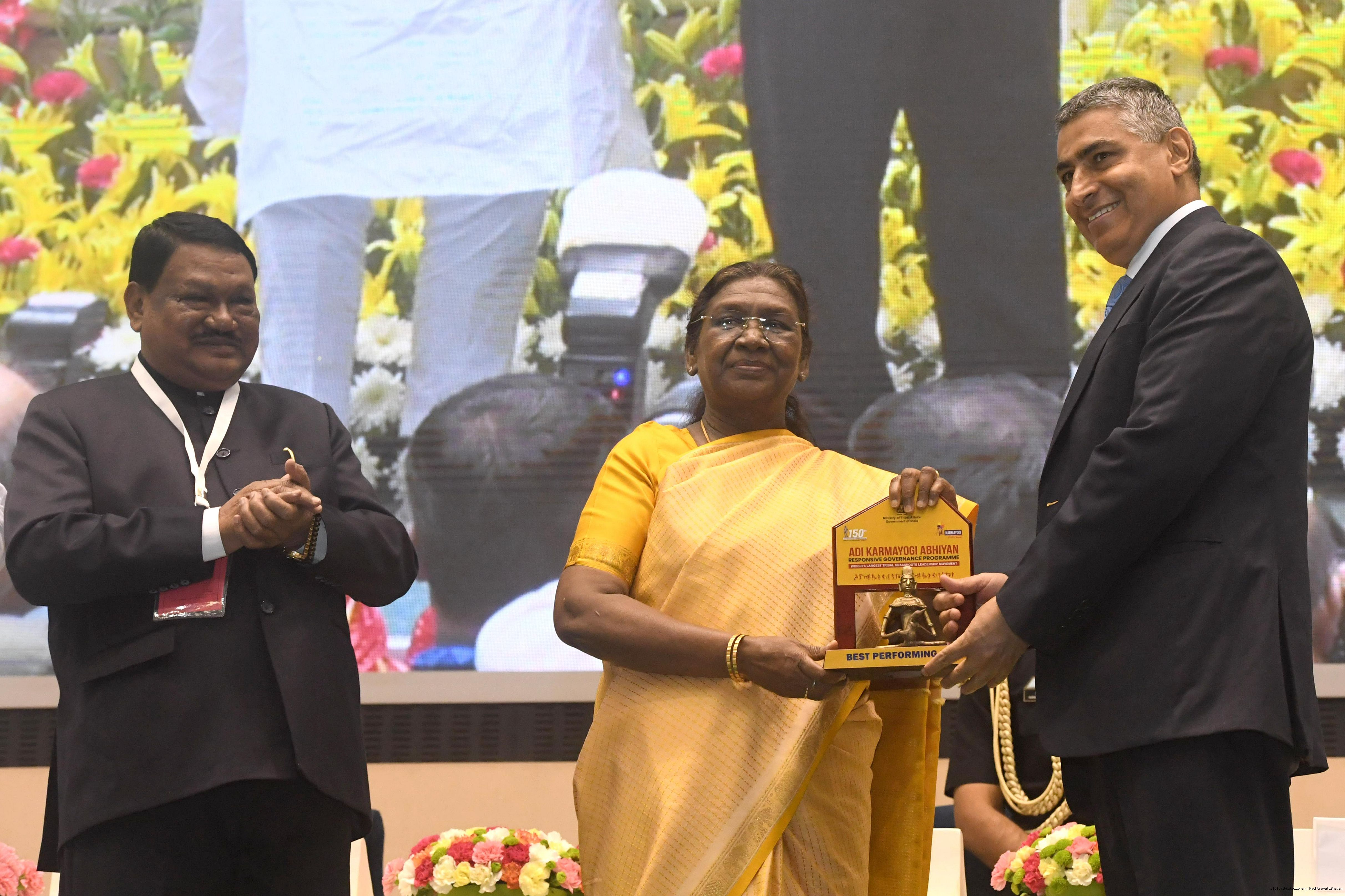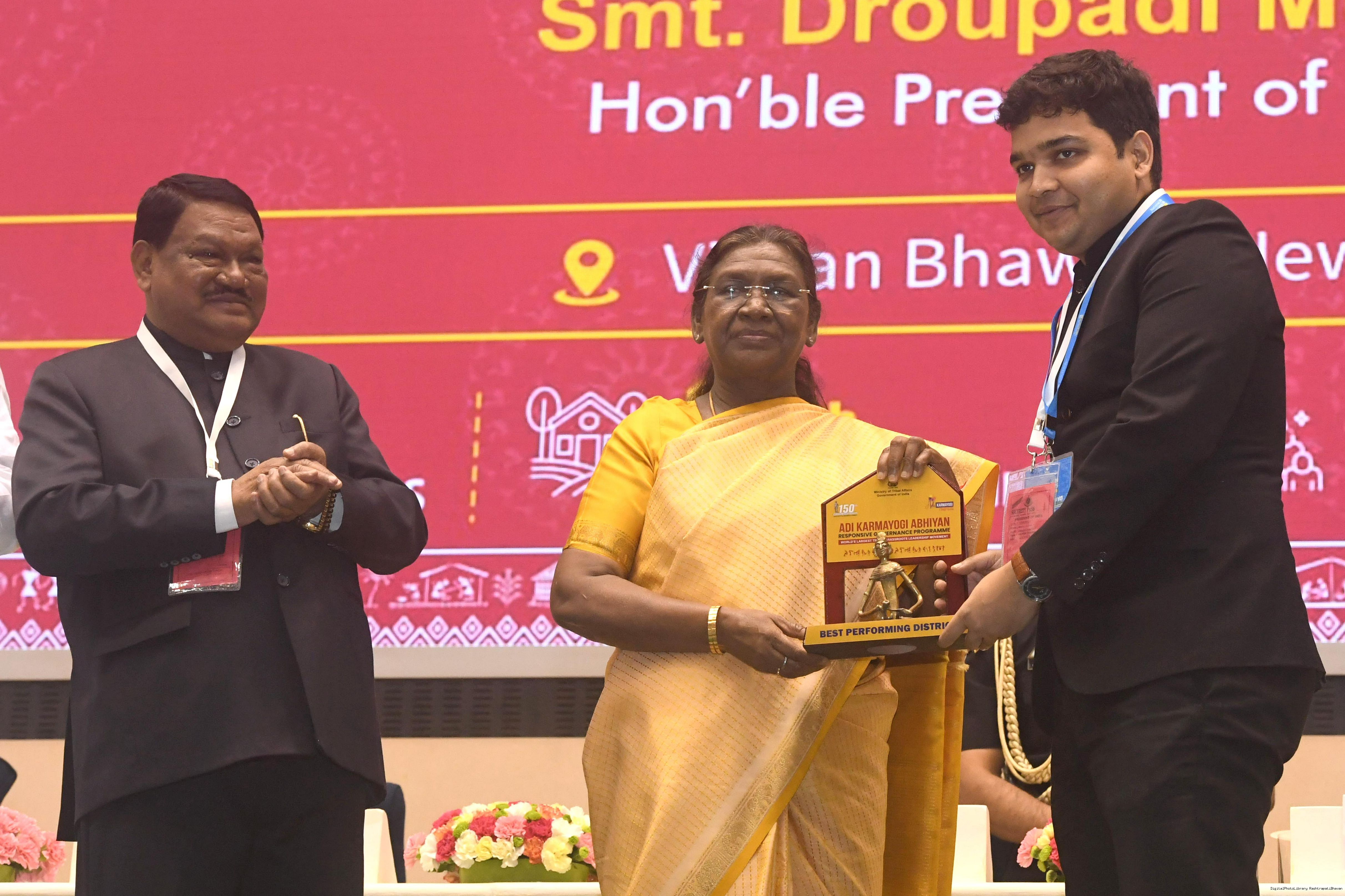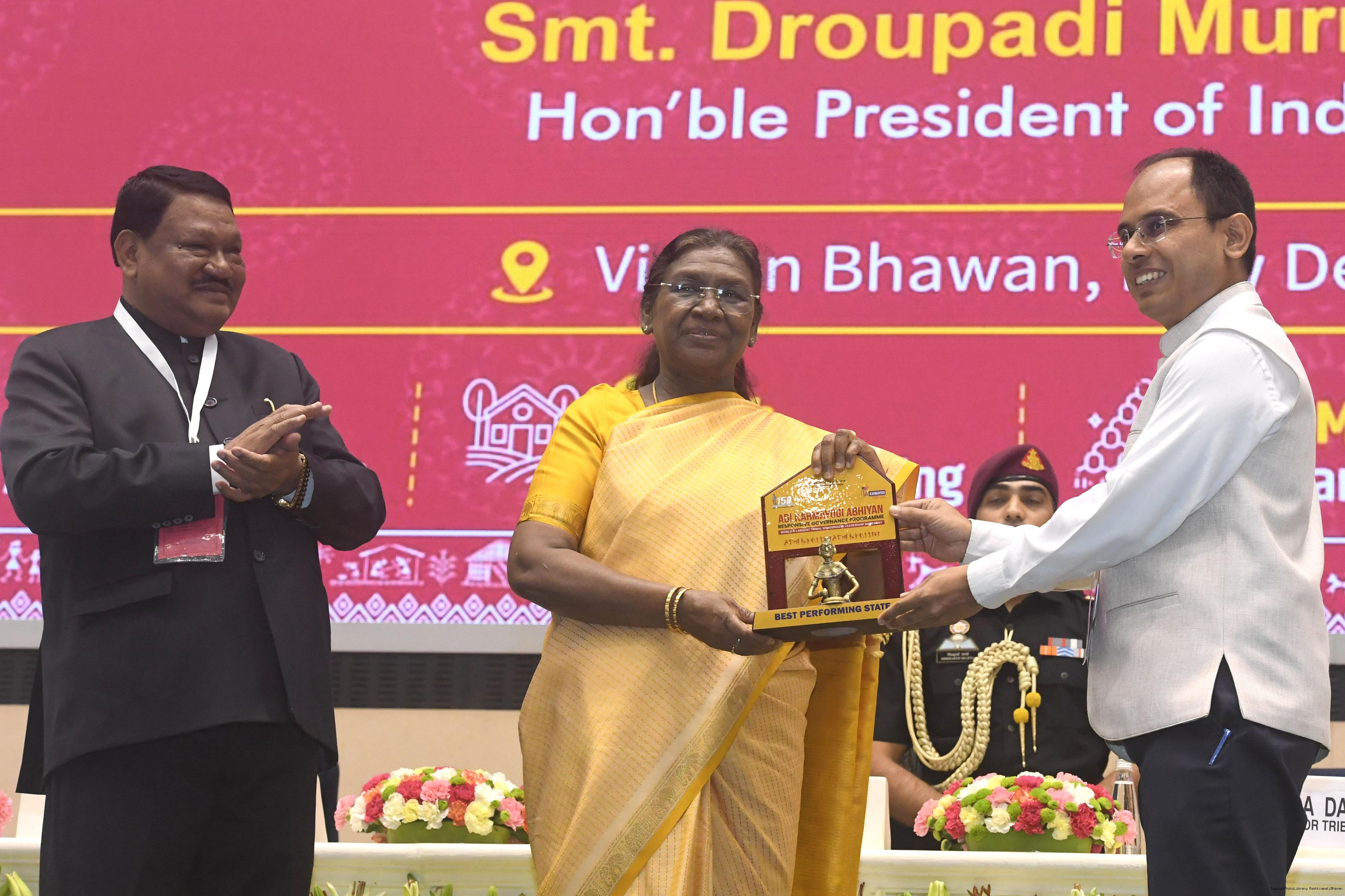 | Caption: | The President of India, Smt. Droupadi Murmu addressed the national conclave on the ‘Adi Karmayogi Abhiyan’ and presented awards to the best-performing states, districts, blocks, and Integrated Tribal Development Agencies at a function held in New Delhi on October 17, 2025. |