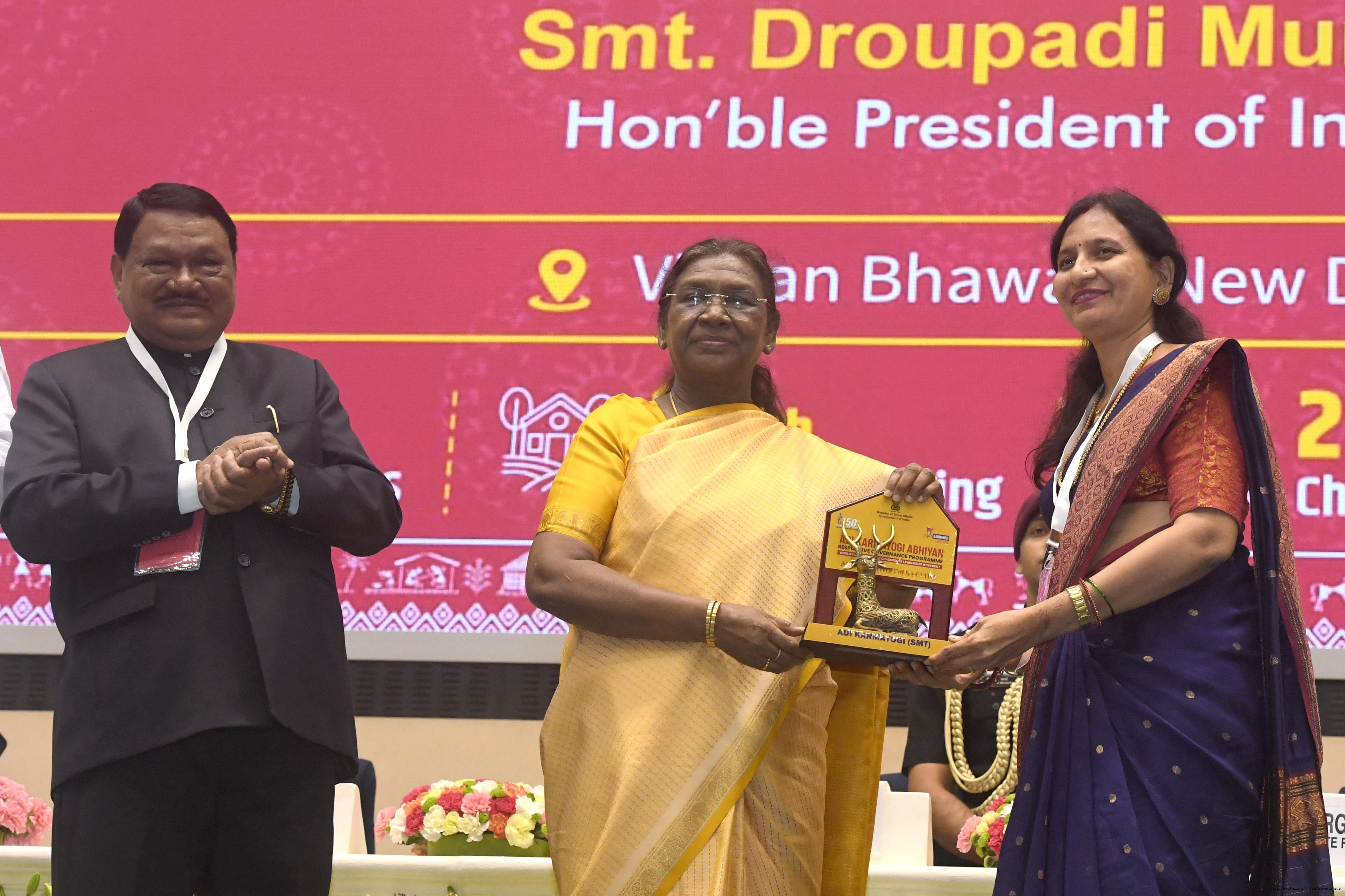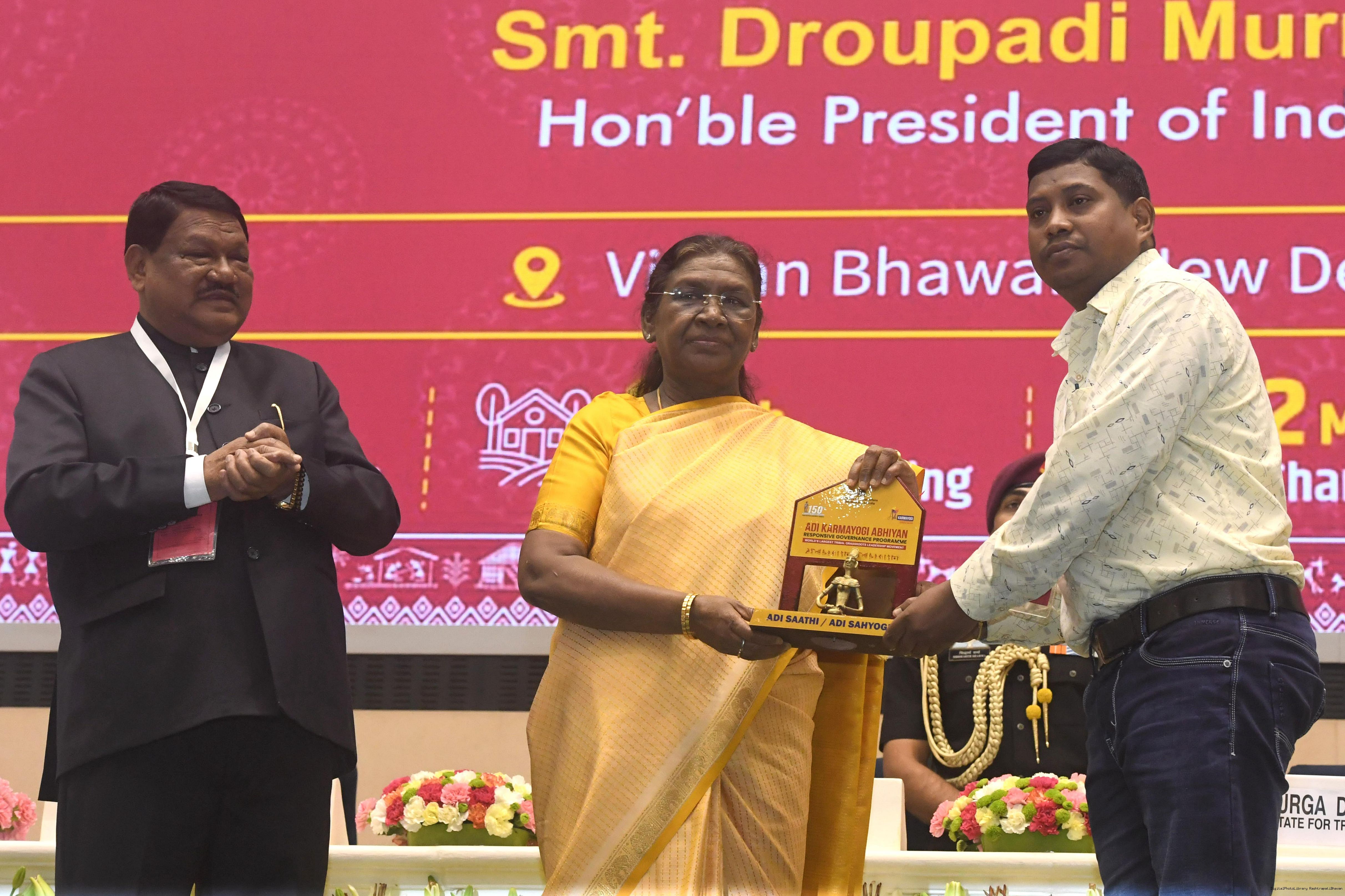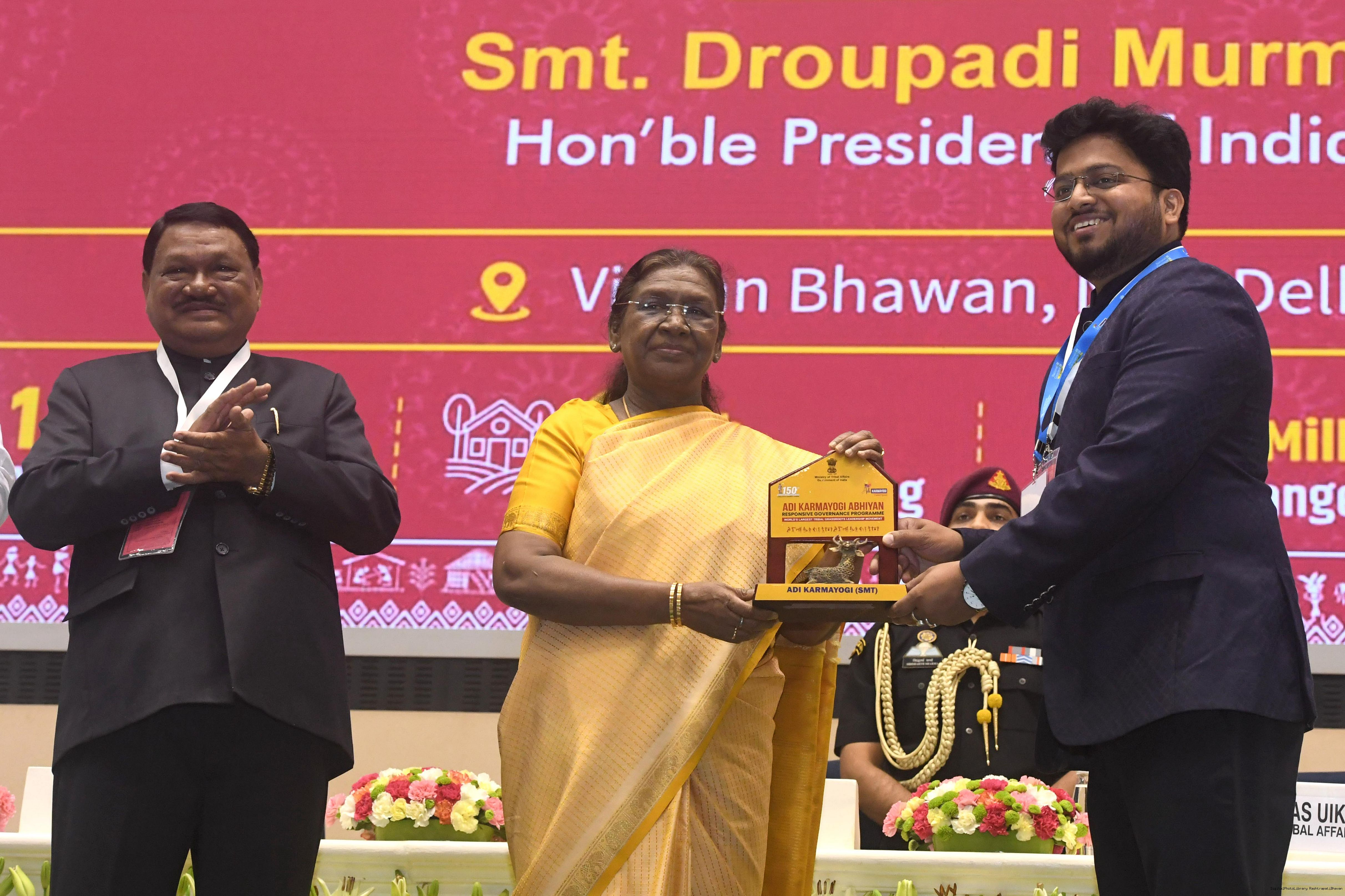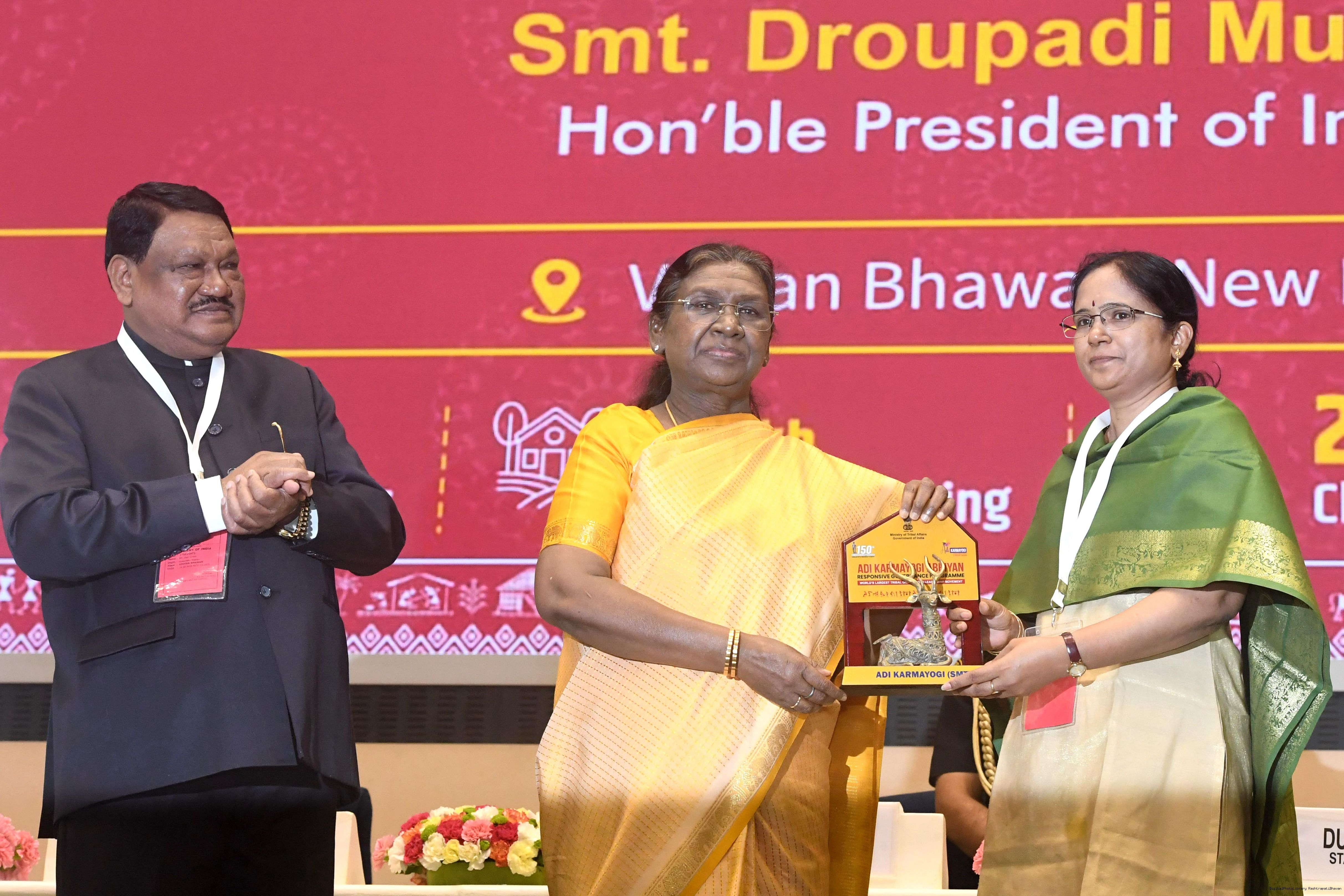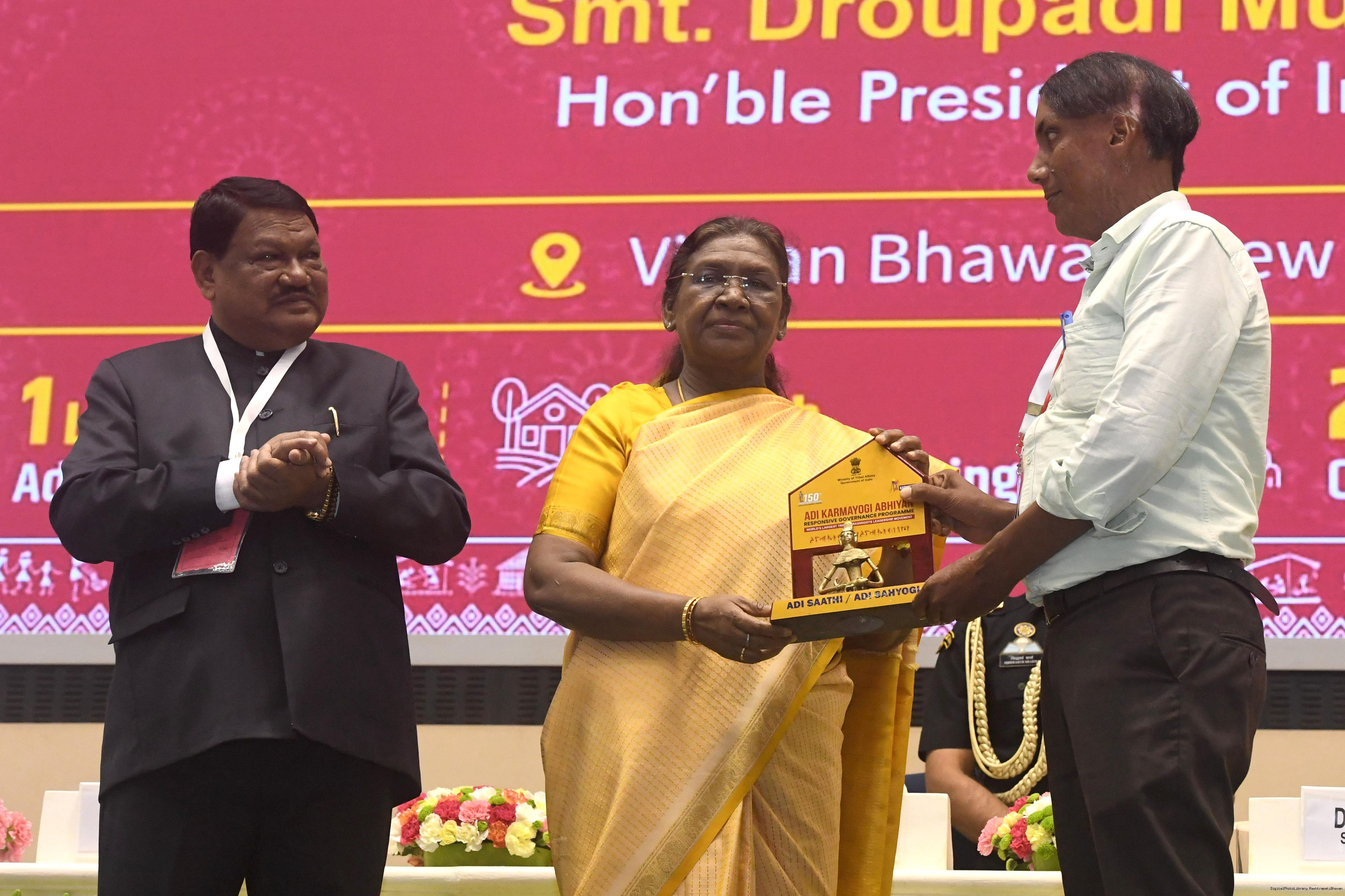 | Caption: | The President of India, Smt. Droupadi Murmu addressed the national conclave on the ‘Adi Karmayogi Abhiyan’ and presented awards to the best-performing states, districts, blocks, and Integrated Tribal Development Agencies at a function held in New Delhi on October 17, 2025. |