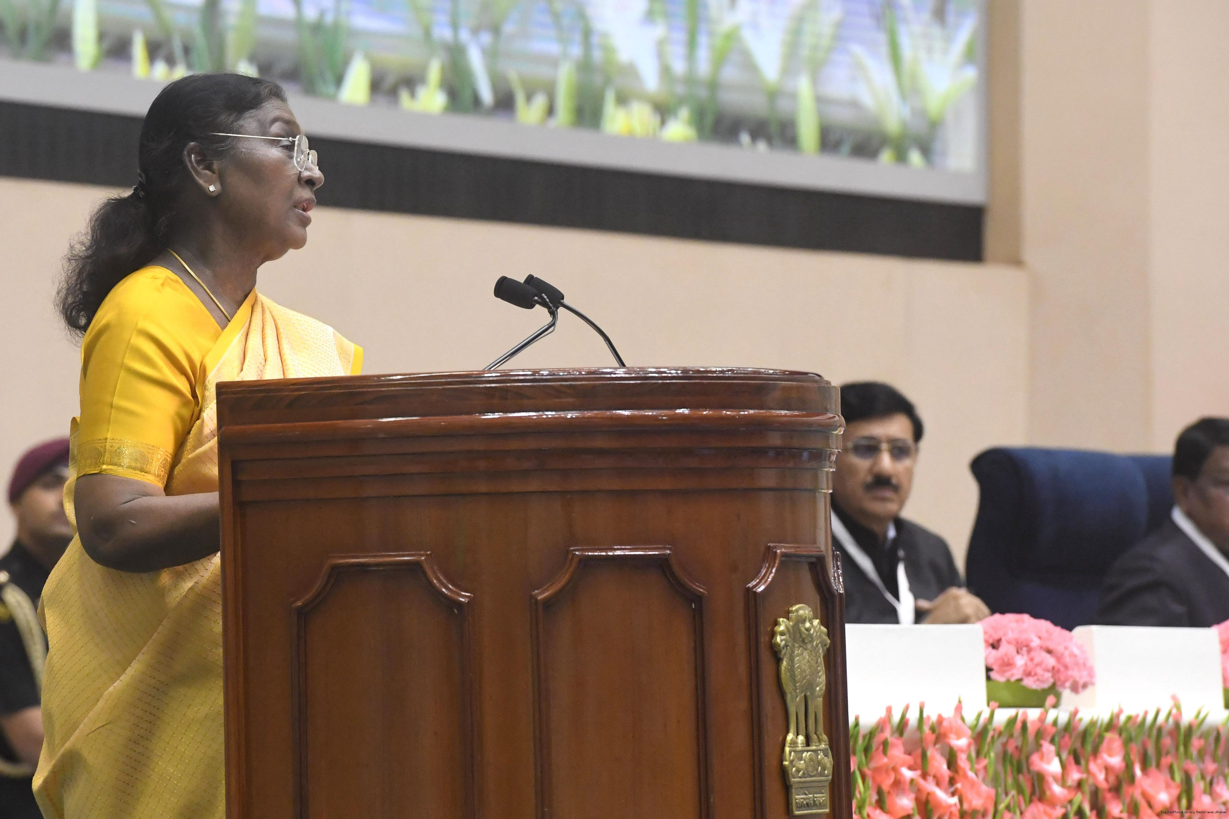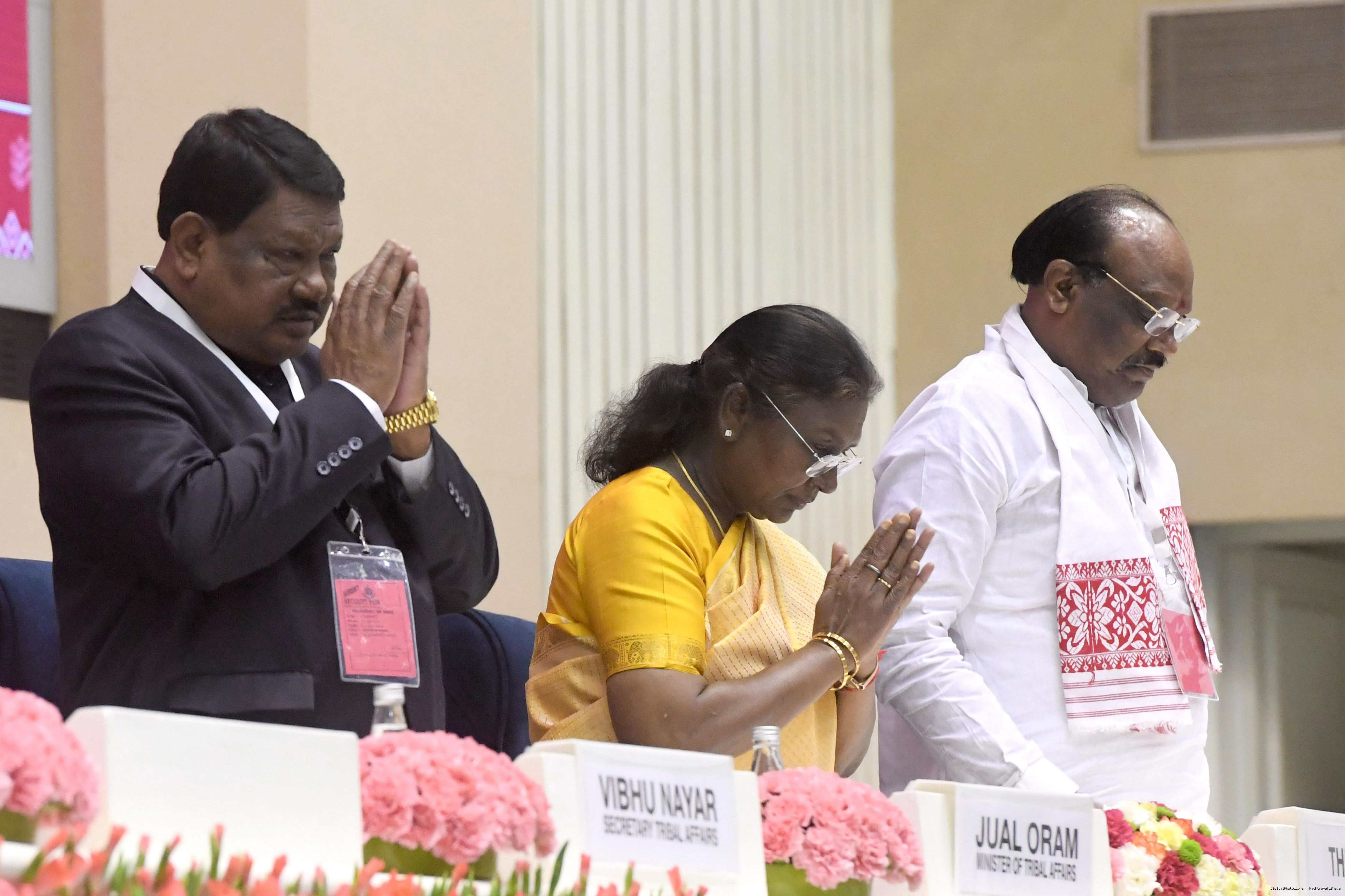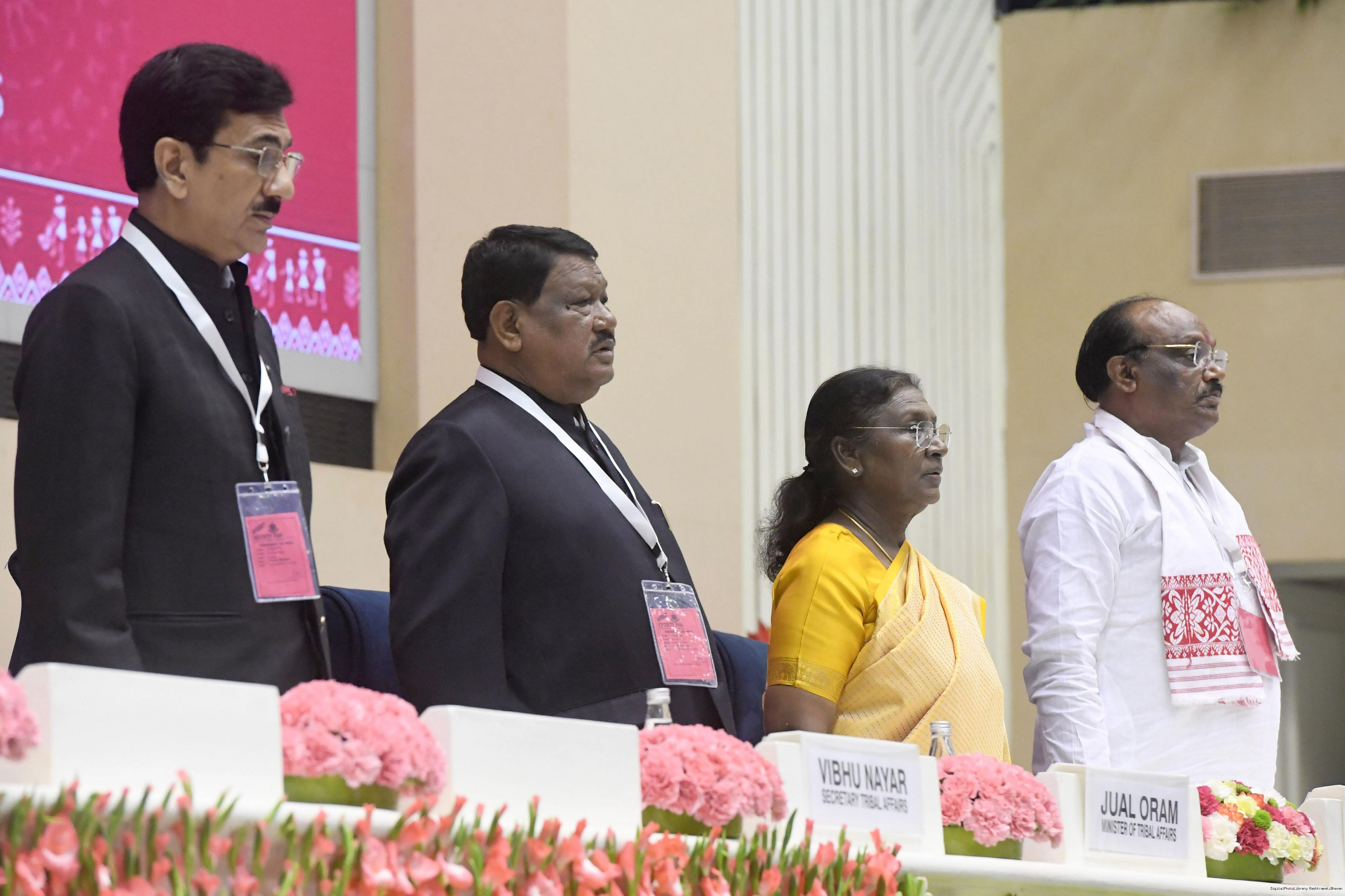 | Caption: | The President of India, Smt. Droupadi Murmu addressed the national conclave on the ‘Adi Karmayogi Abhiyan’ and presented awards to the best-performing states, districts, blocks, and Integrated Tribal Development Agencies at a function held in New Delhi on October 17, 2025. |