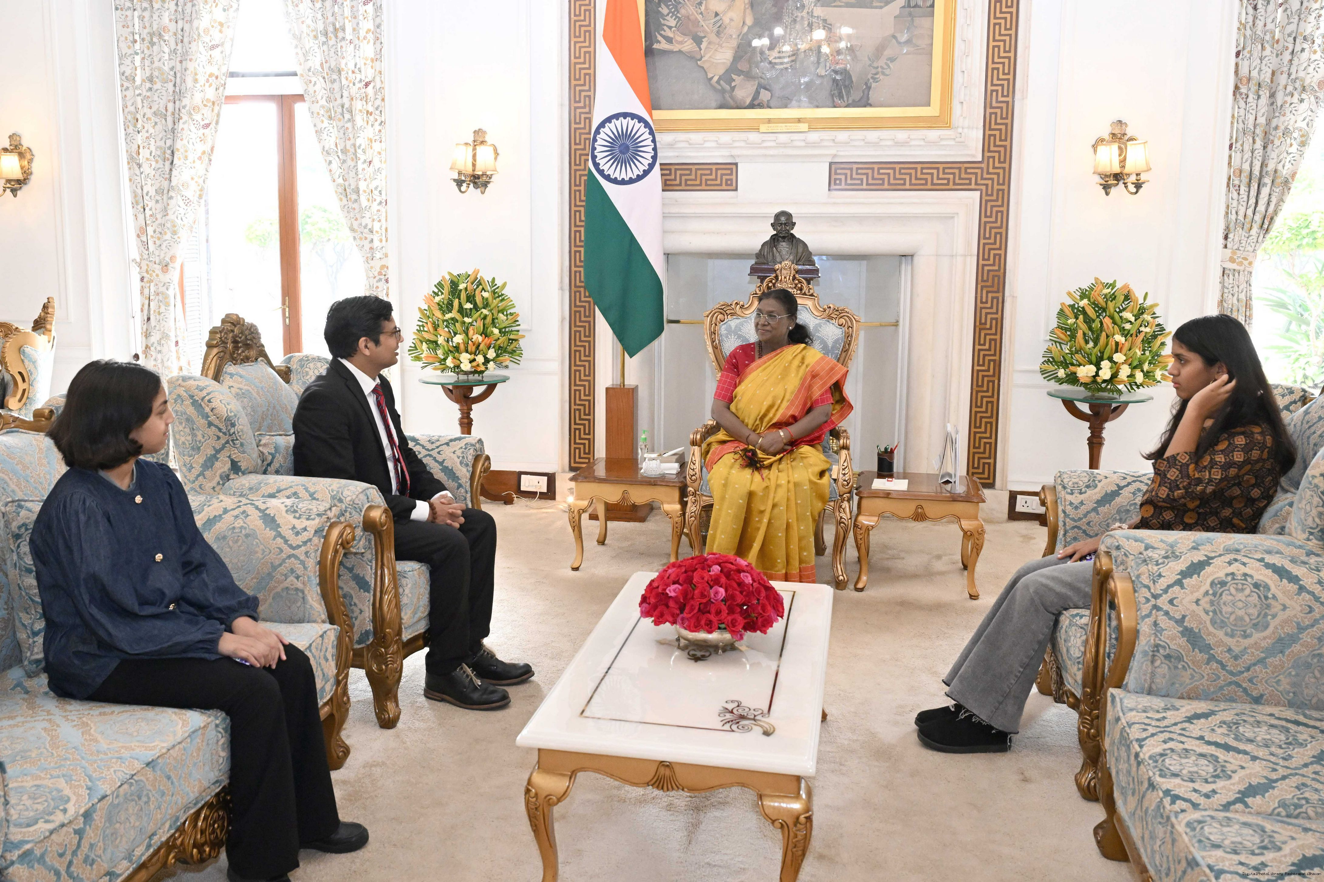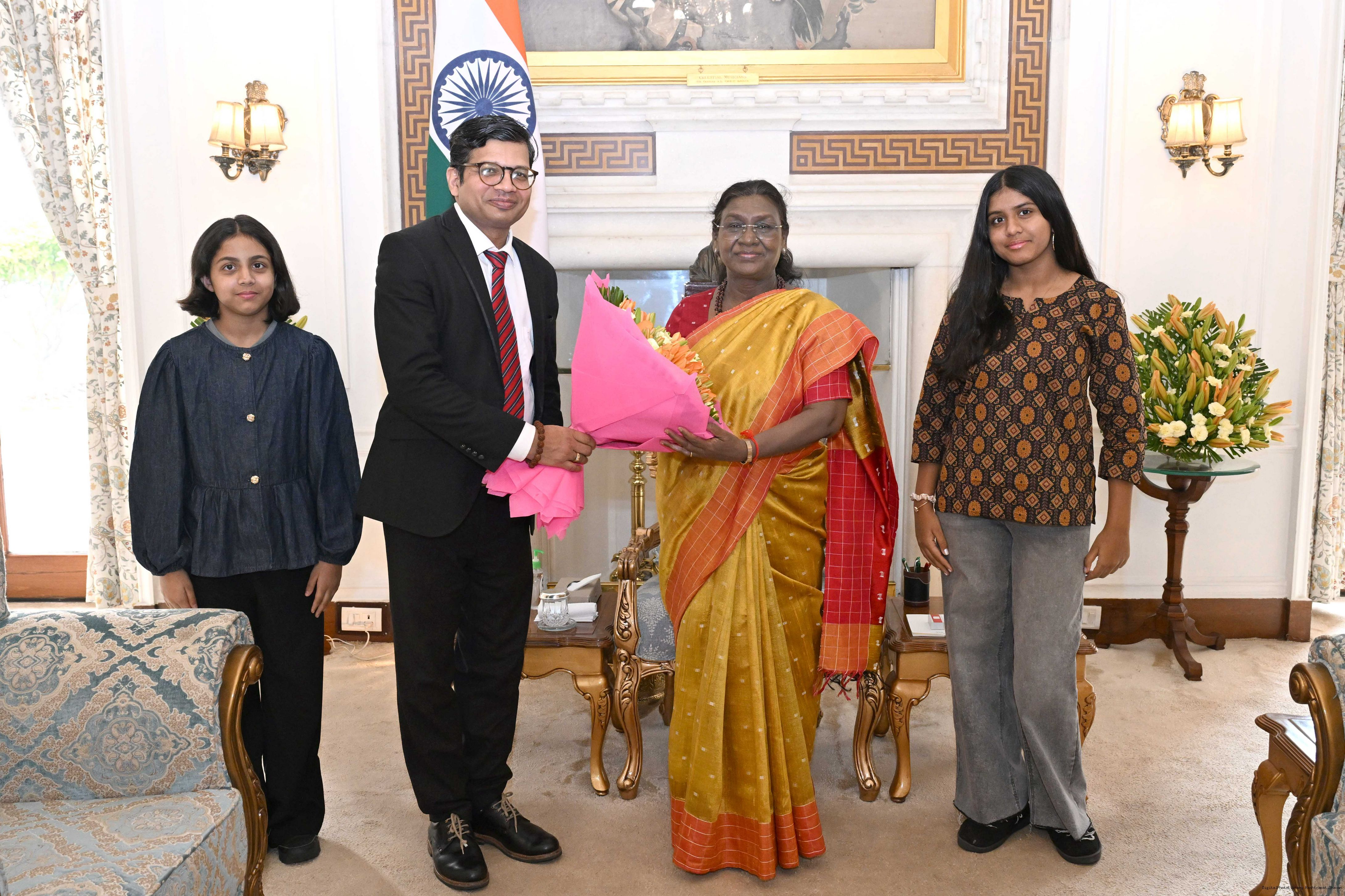 | Caption: | Dr. Shibashish Giri, from Hatbadra, Dist. Mayurbhanj, Odisha along with daughters Ms. Shibangshi Giri Rudrangshi Giri meeting with the President of India, Smt. Droupadi Murmu at Rashtrapati Bhavan on October 21, 2025. |