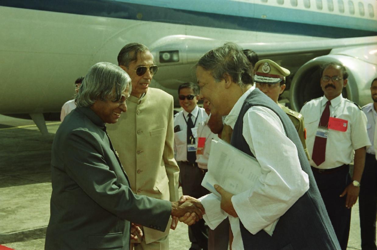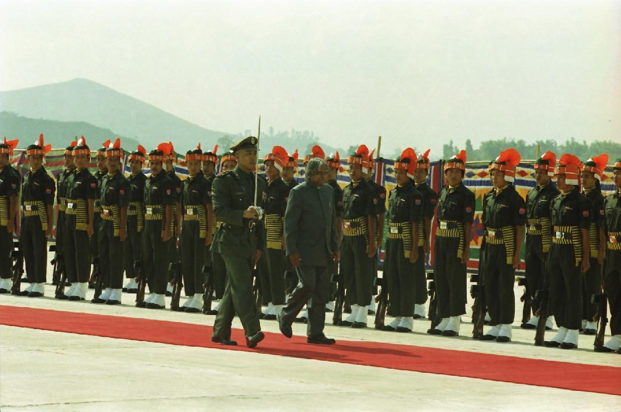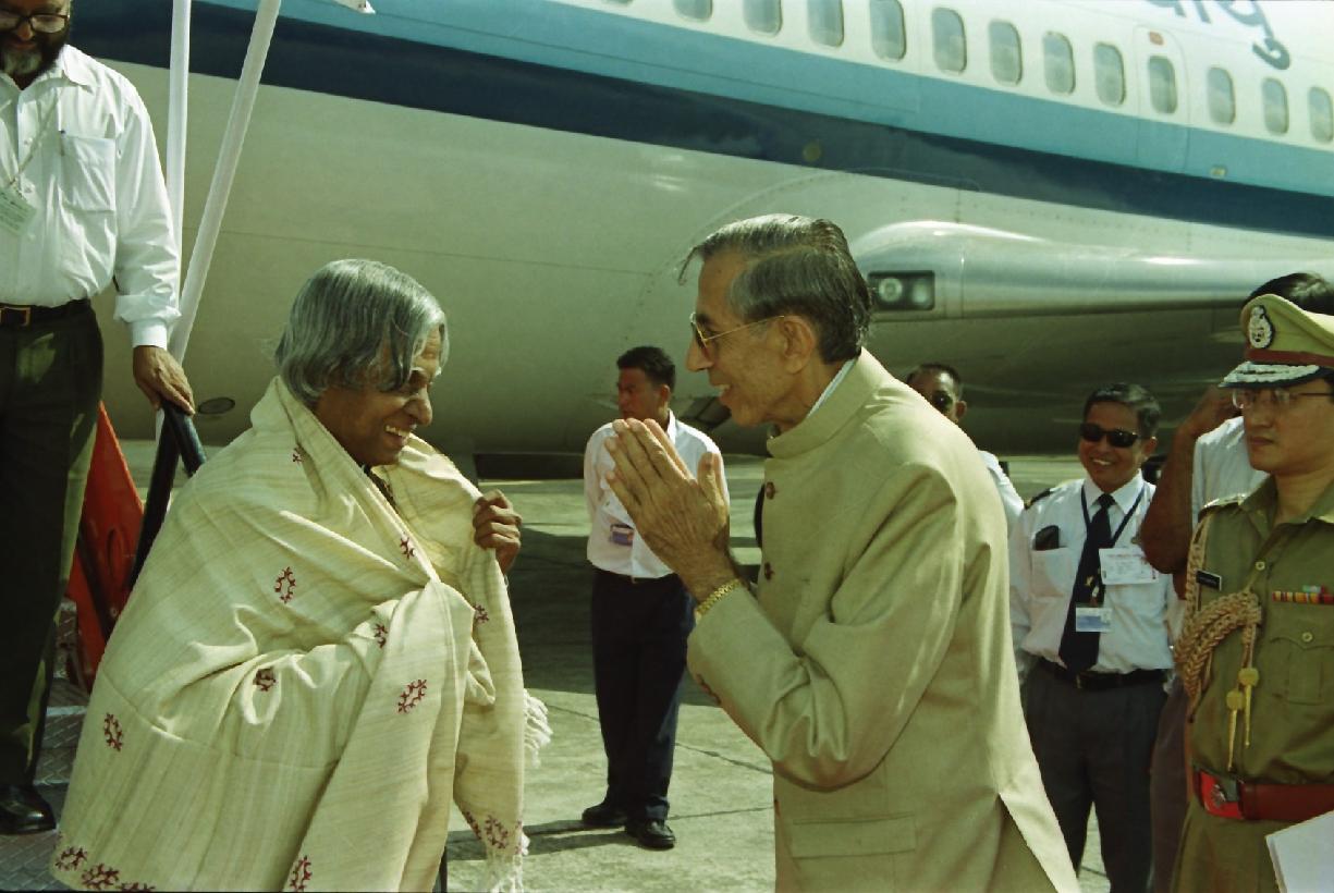 | Caption: | The President of India, Dr A P J Abdul Kalam being welcomed by the Governor of Manipur, Shri Ved Marwah at Tulihal Airport in Manipur on Oct 05, 2002 |