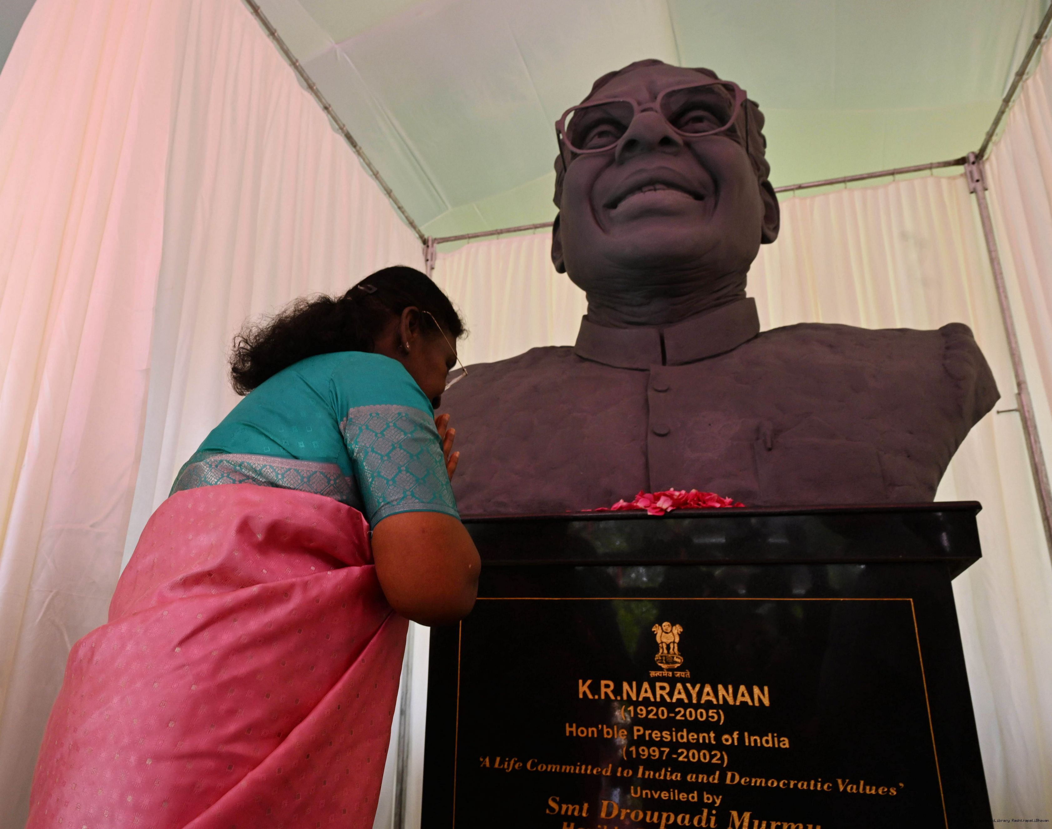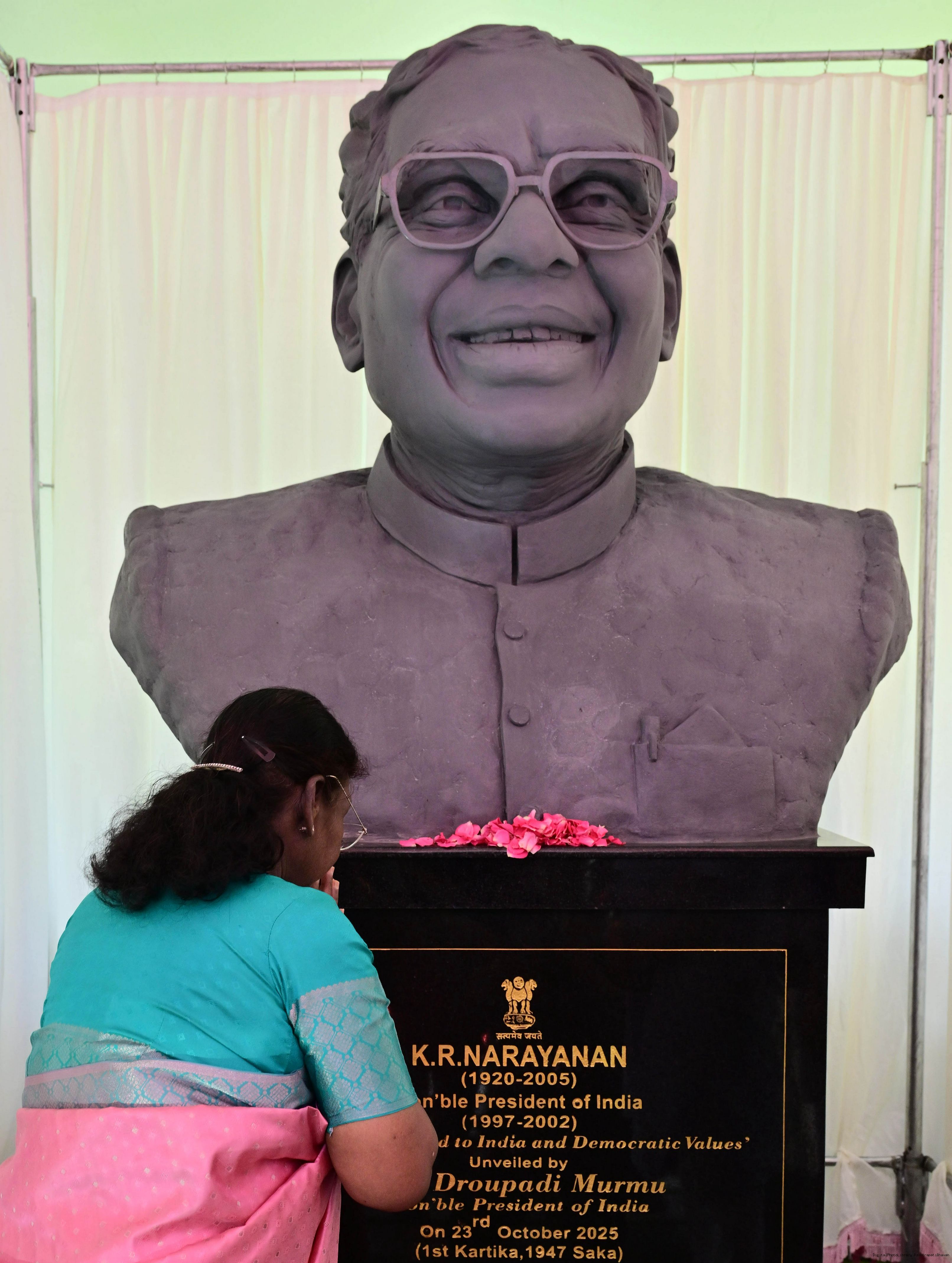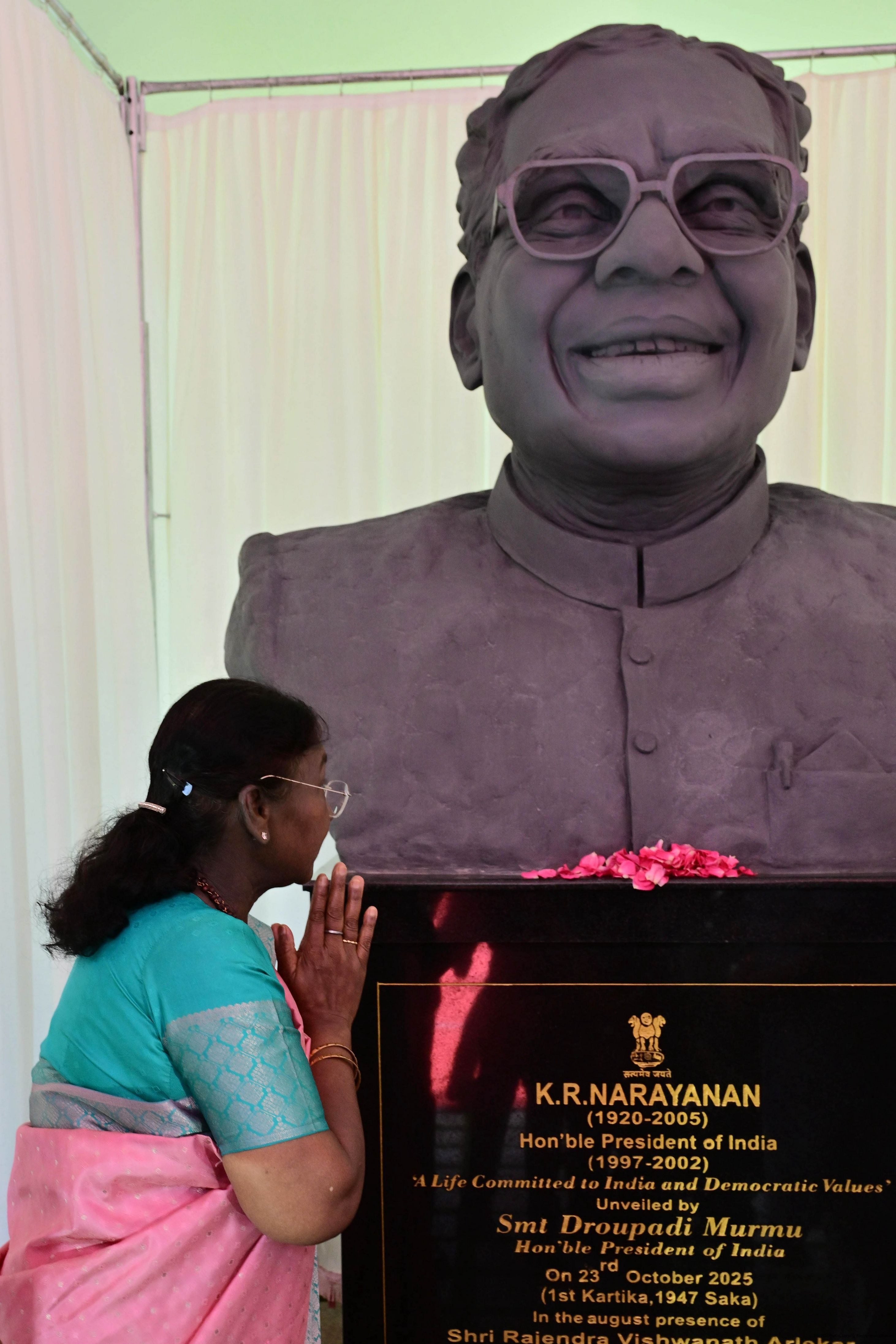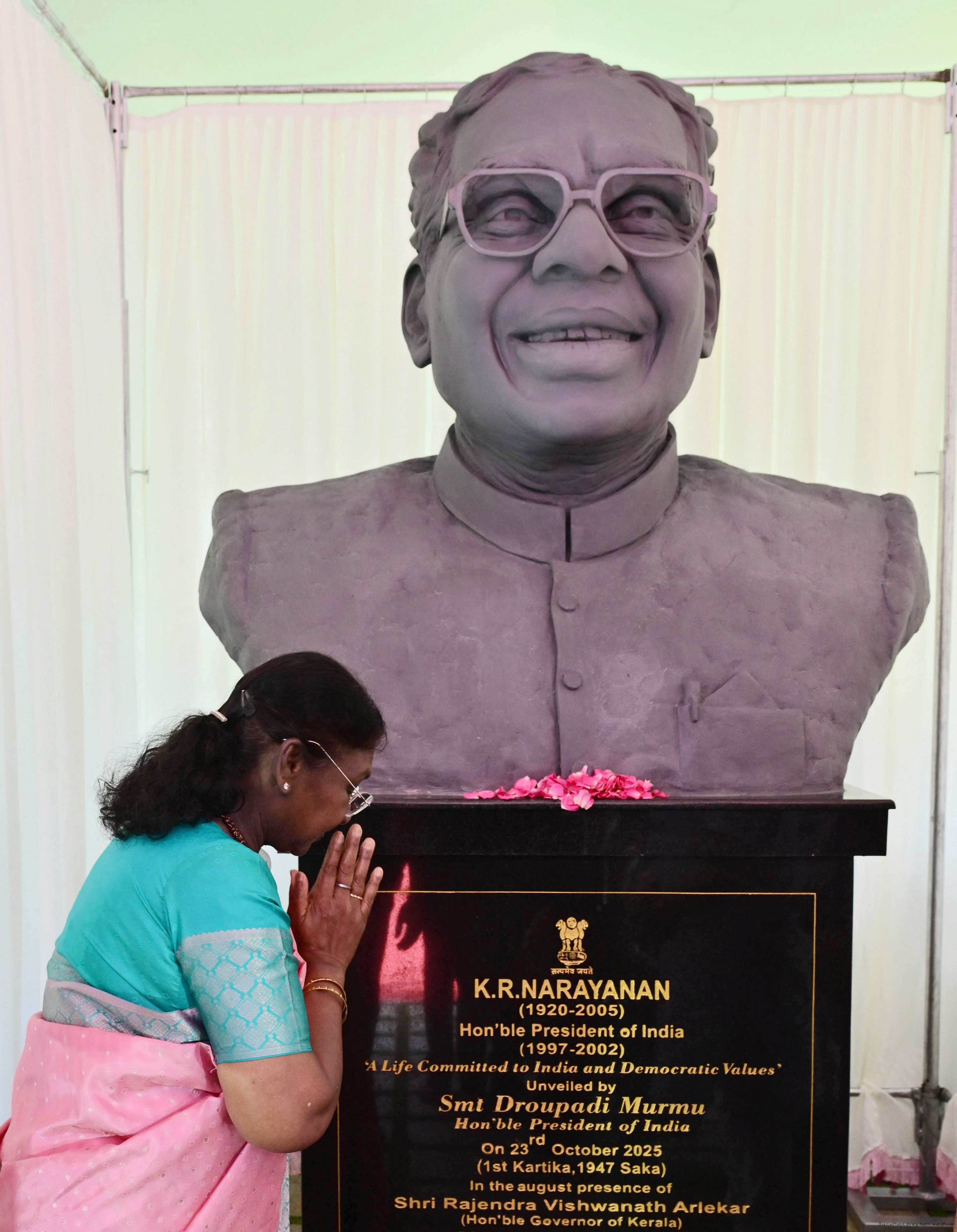 | Caption: | The President of India, Smt Droupadi Murmu unveiled the bust of former President of India, Shri KR Narayanan at Raj Bhavan, Thiruvananthapuram on October 23, 2025. |
