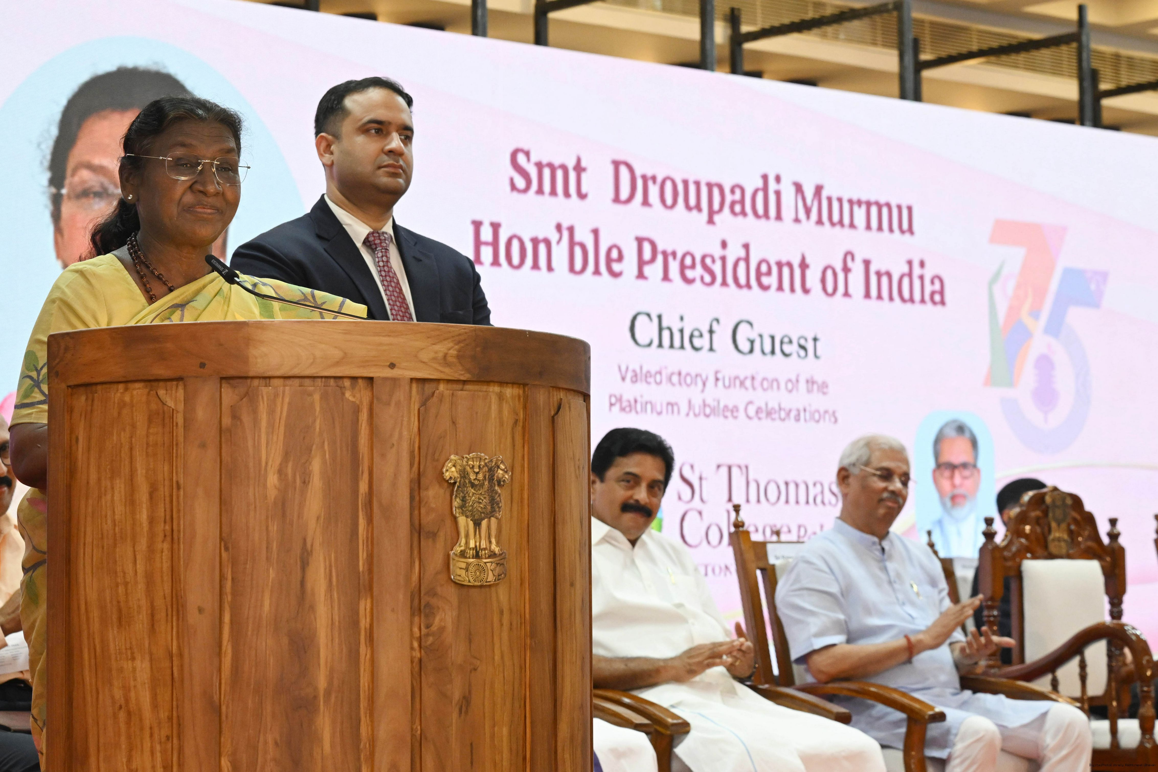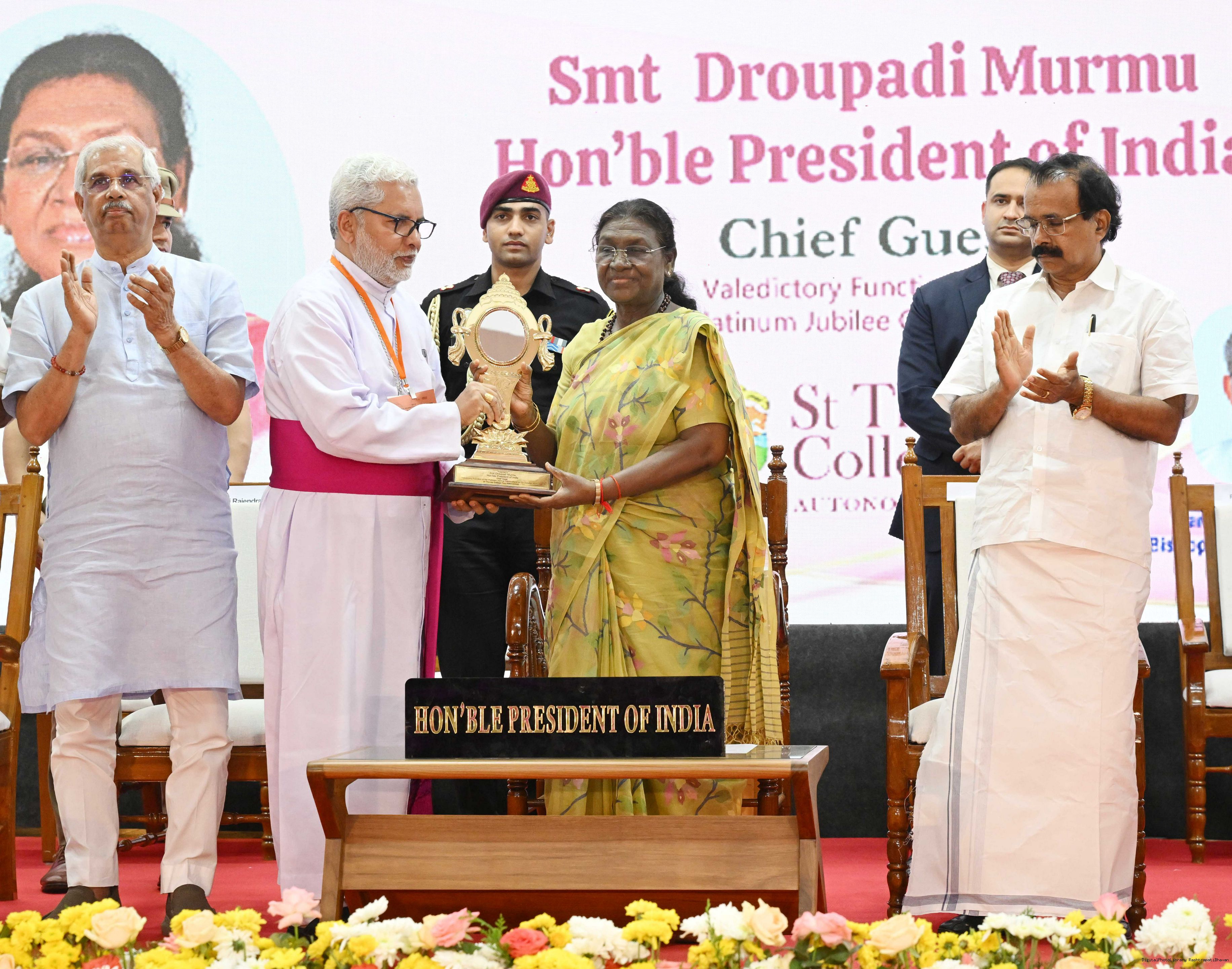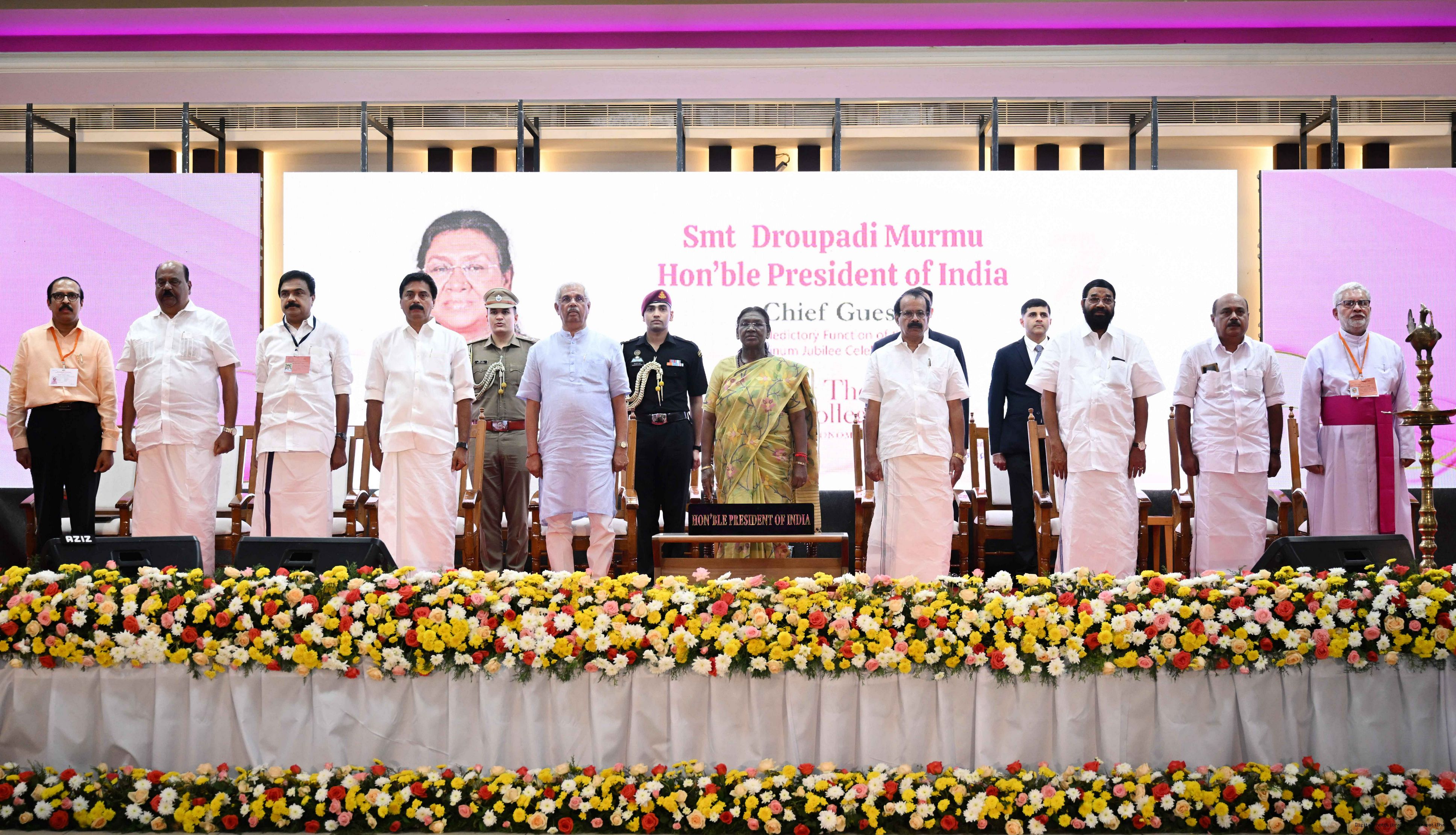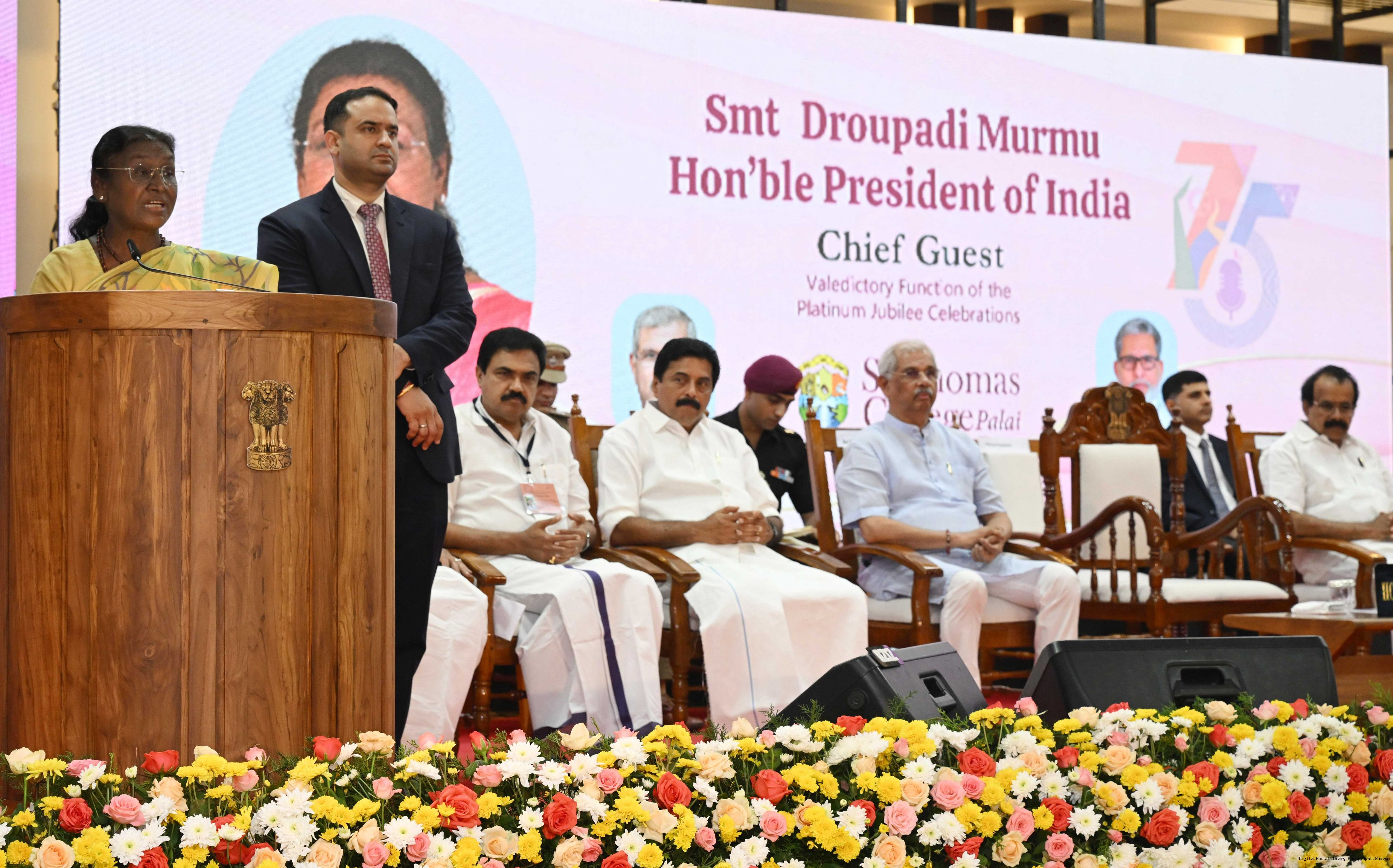 | Caption: | The President of India, Smt Droupadi Murmu graced the valedictory function of the Platinum Jubilee celebrations of St. Thomas College at Palai, Kerala on October 23, 2025. |