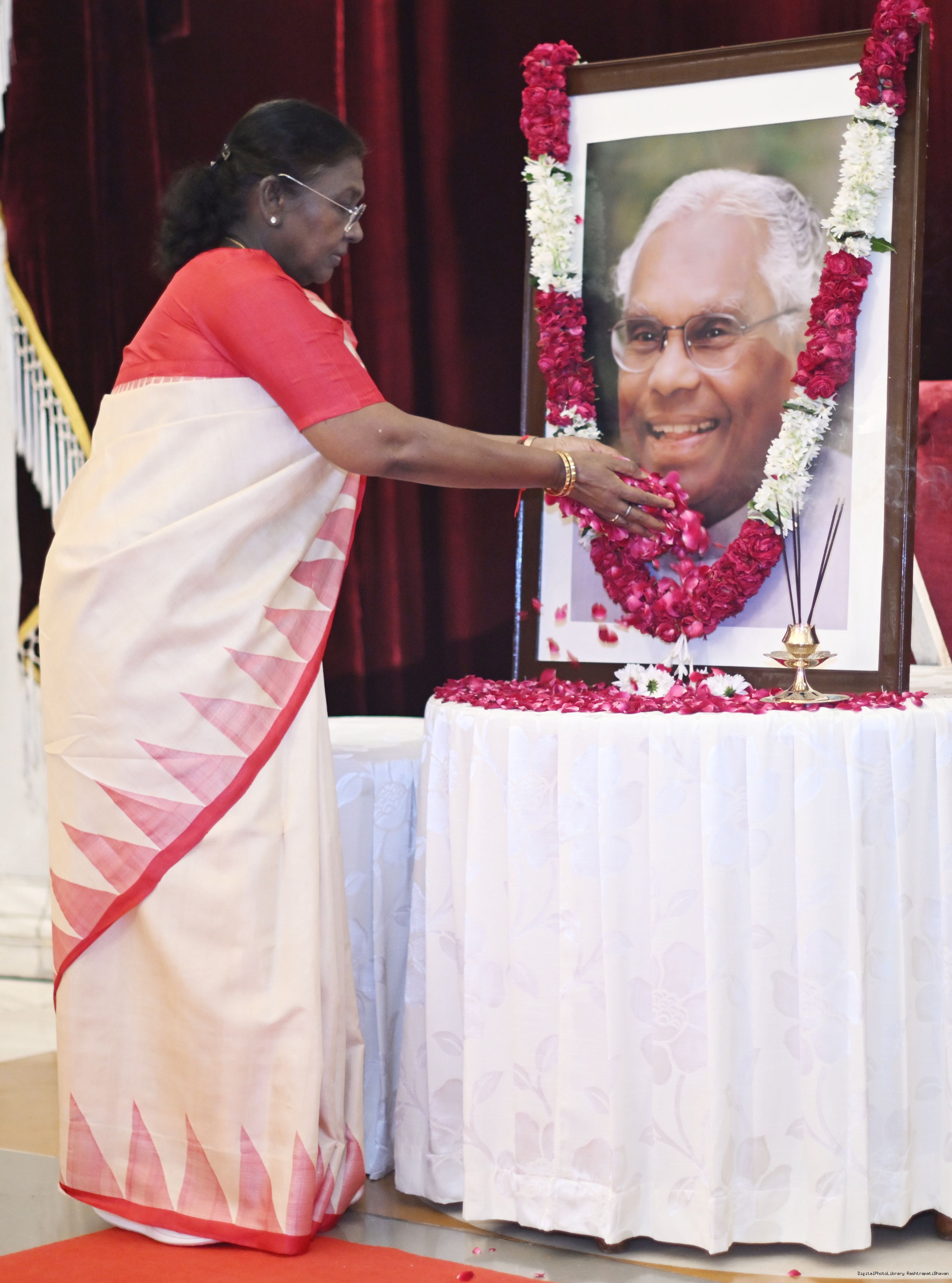 | Caption: | The President of India, Smt Droupadi Murmu paid floral tributes to Shri K.R. Narayanan, former President of India, on his birth anniversary at Rashtrapati Bhavan on October 27, 2025. |