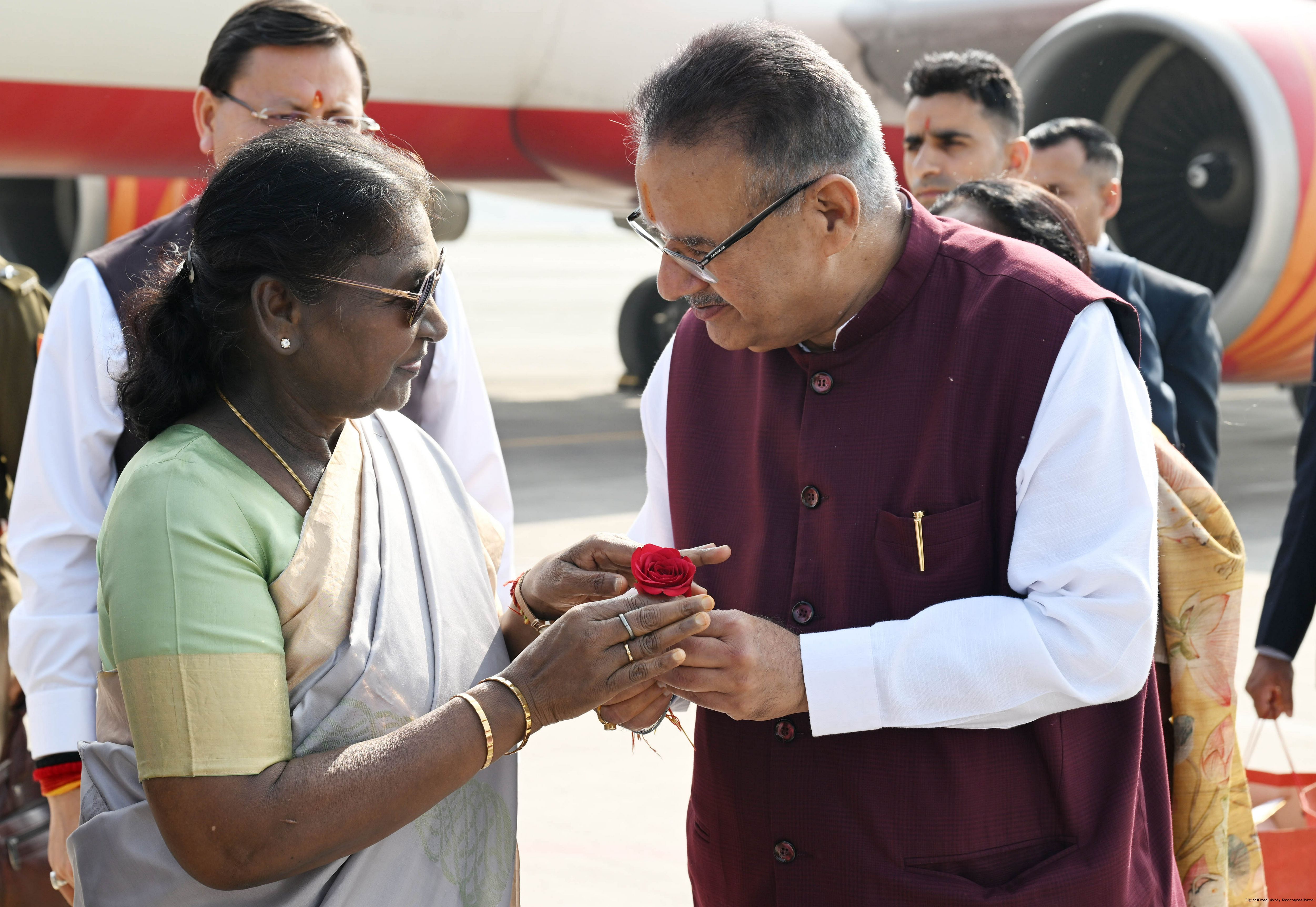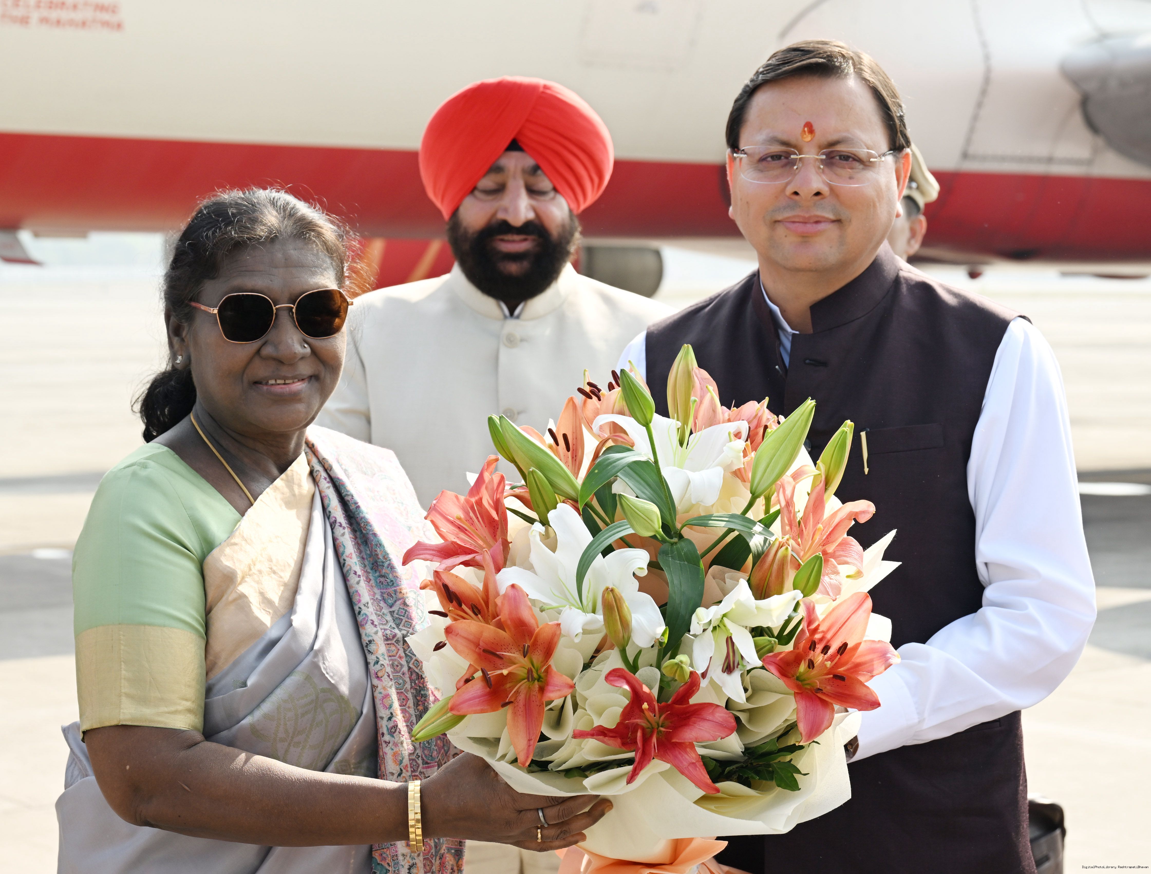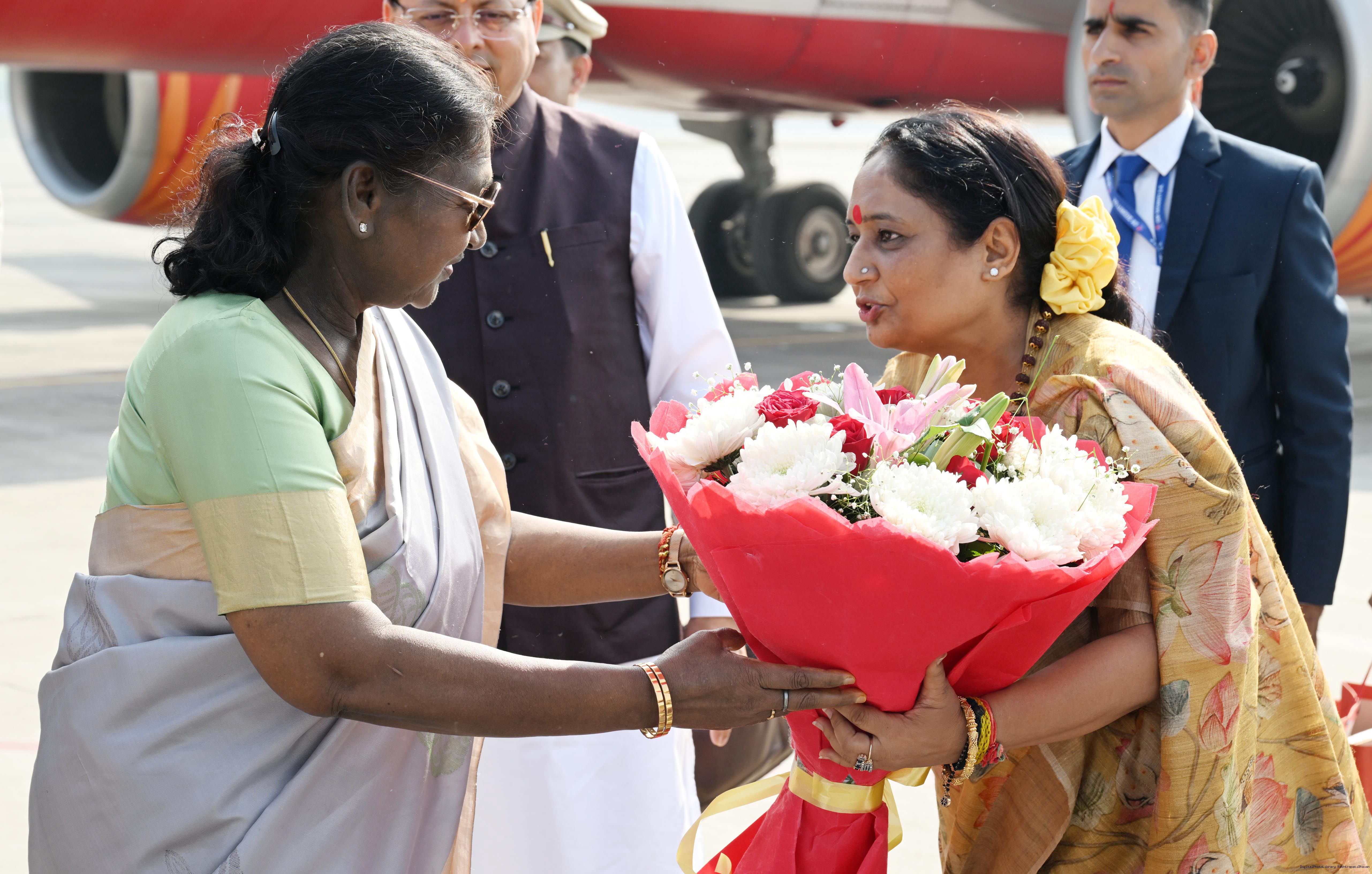 | Caption: | The Governor of Uttarakhand, Lt. Gen. Gurmit Singh (Retd.) and Chief Minister, Shri Pushkar Singh Dhami received the President of India, Smt. Droupadi Murmu on her arrival at Dehradun on November 2, 2025. |