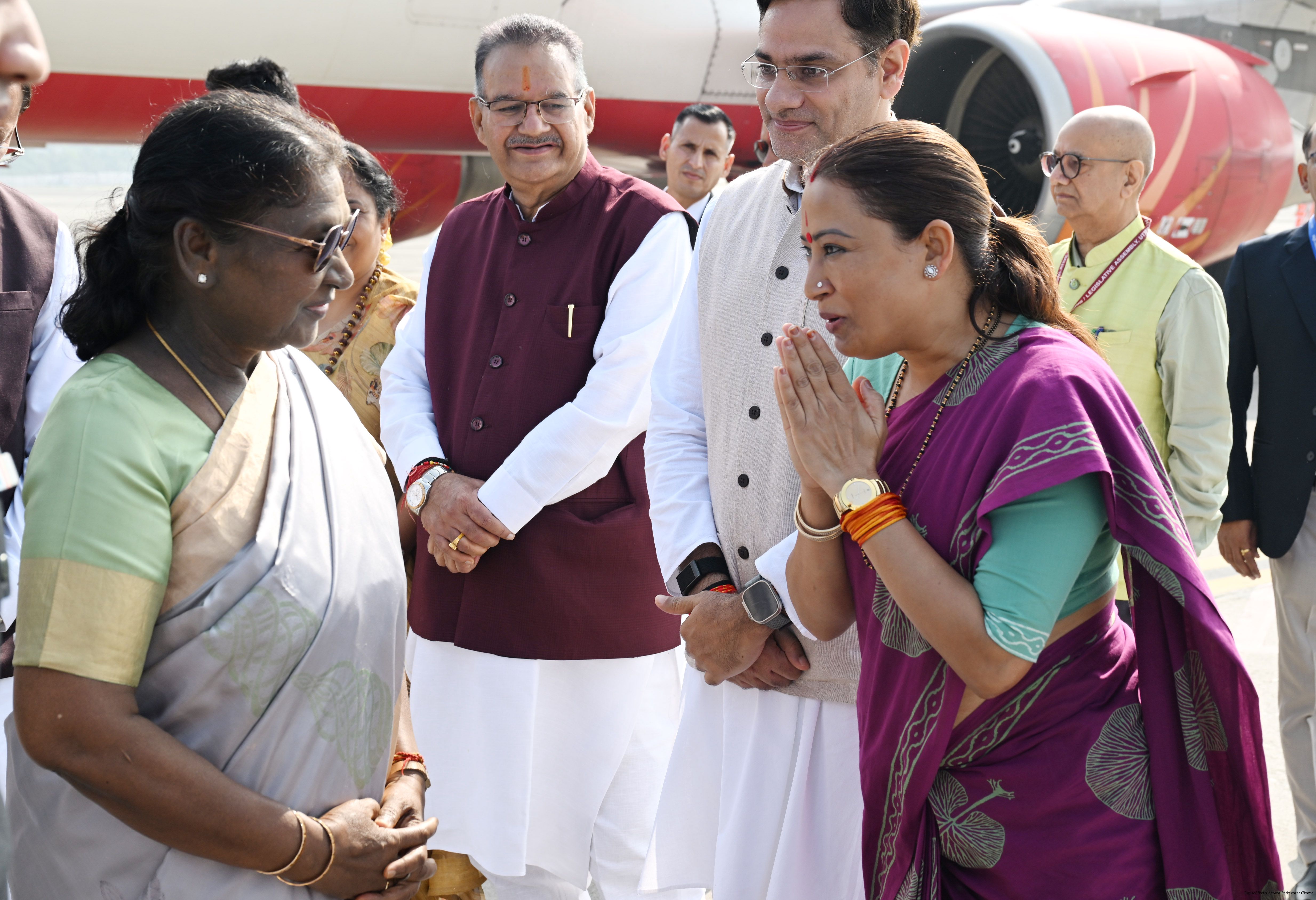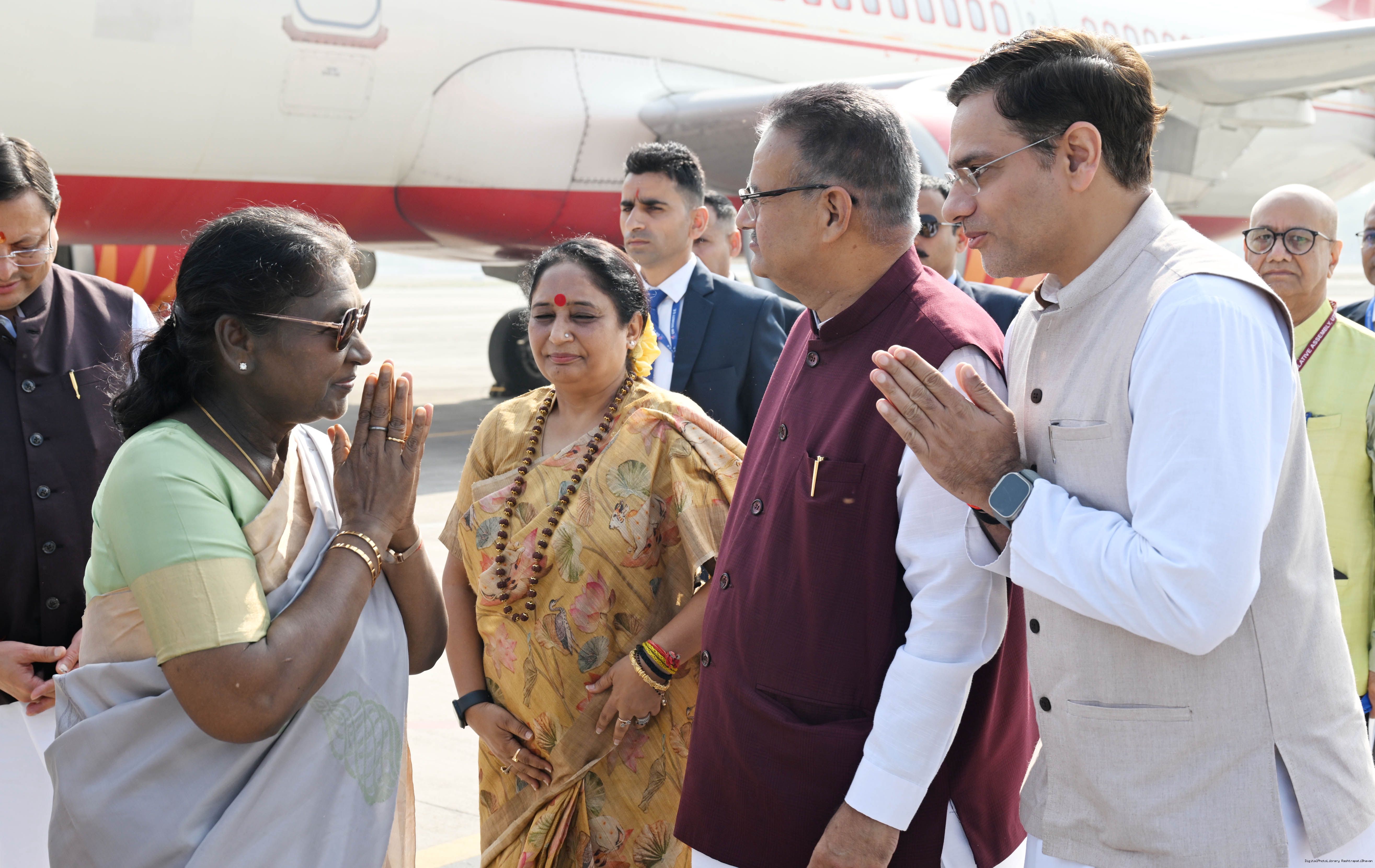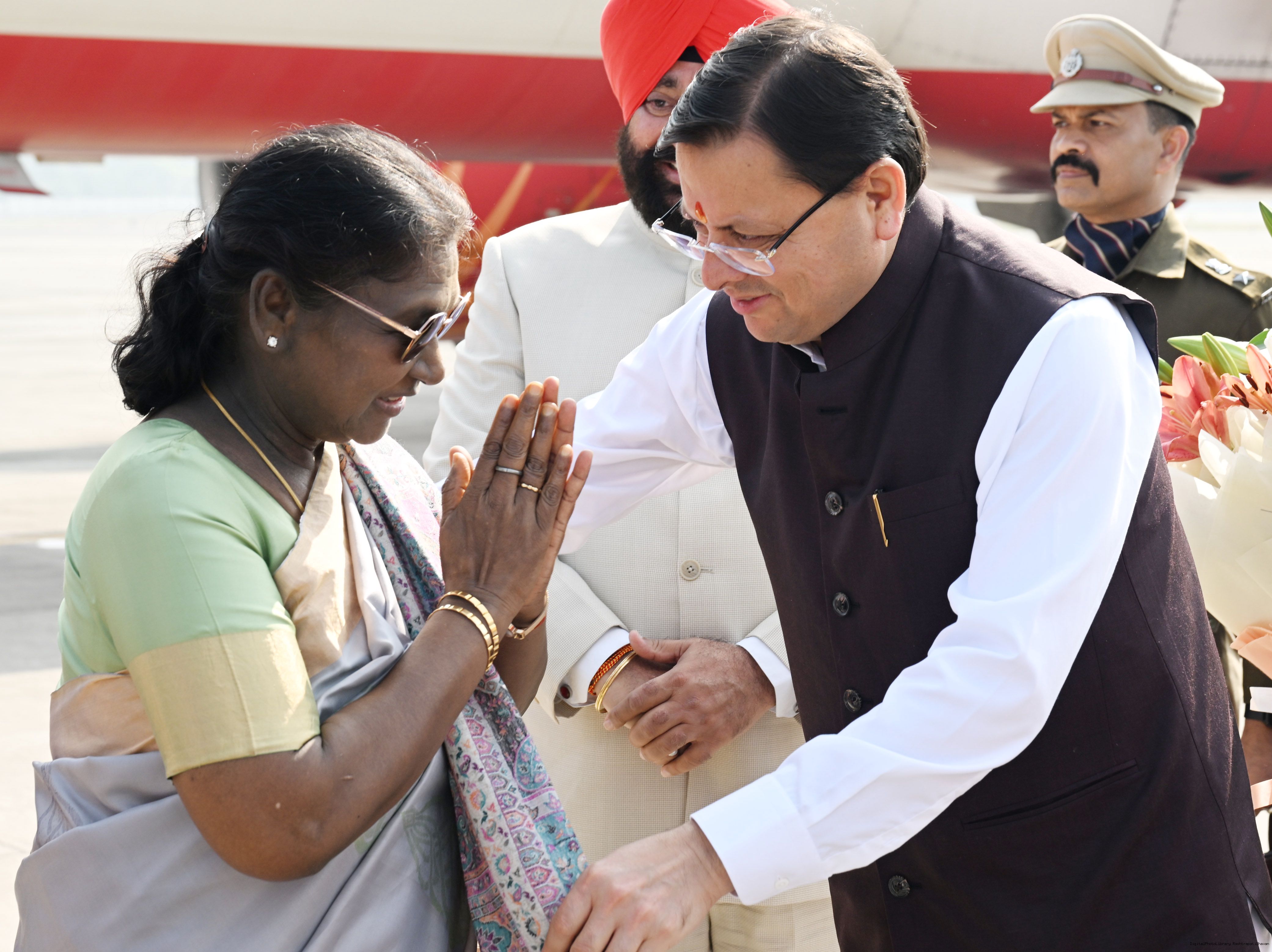 | Caption: | The Governor of Uttarakhand, Lt. Gen. Gurmit Singh (Retd.) and Chief Minister, Shri Pushkar Singh Dhami received the President of India, Smt. Droupadi Murmu on her arrival at Dehradun on November 2, 2025. |