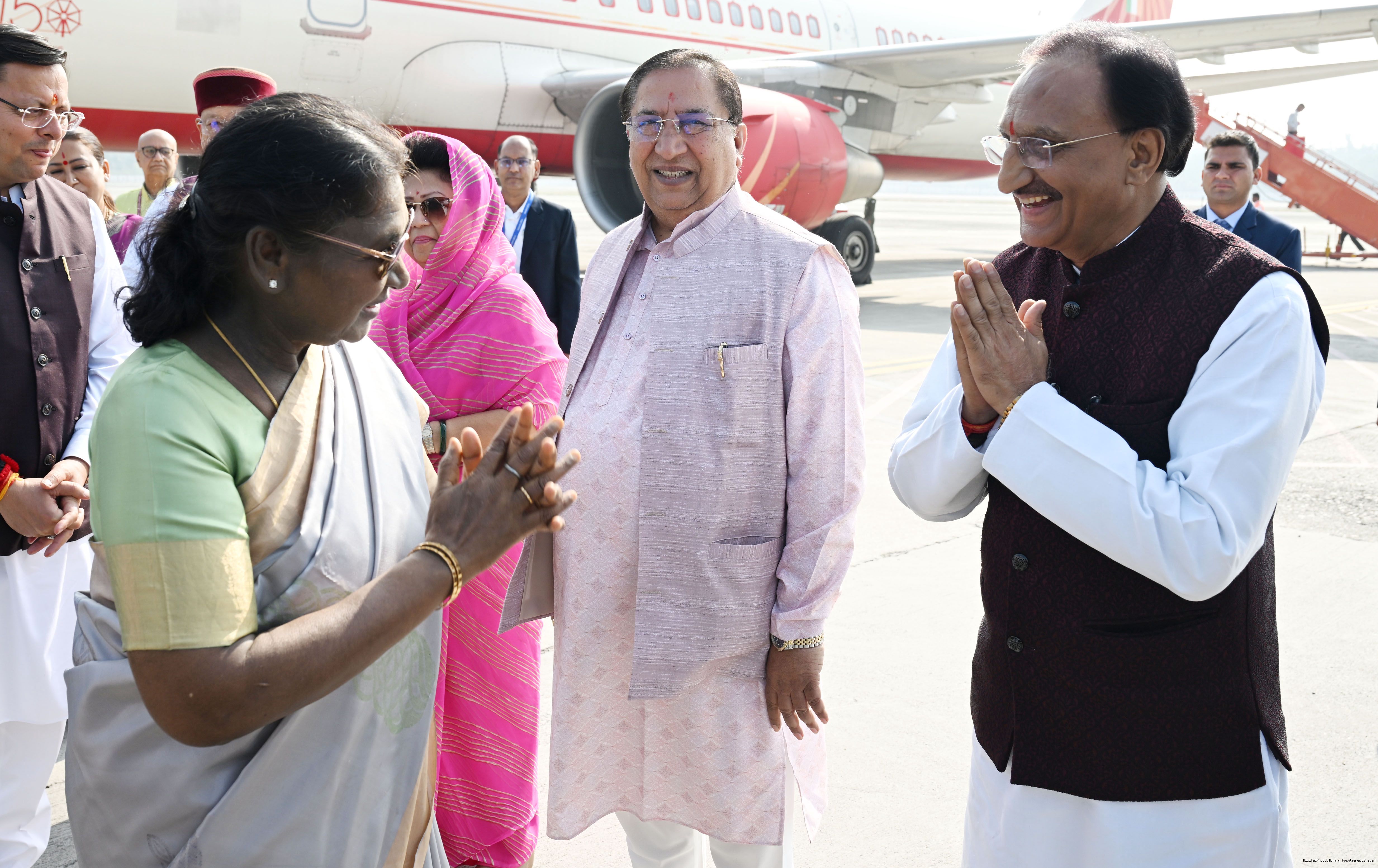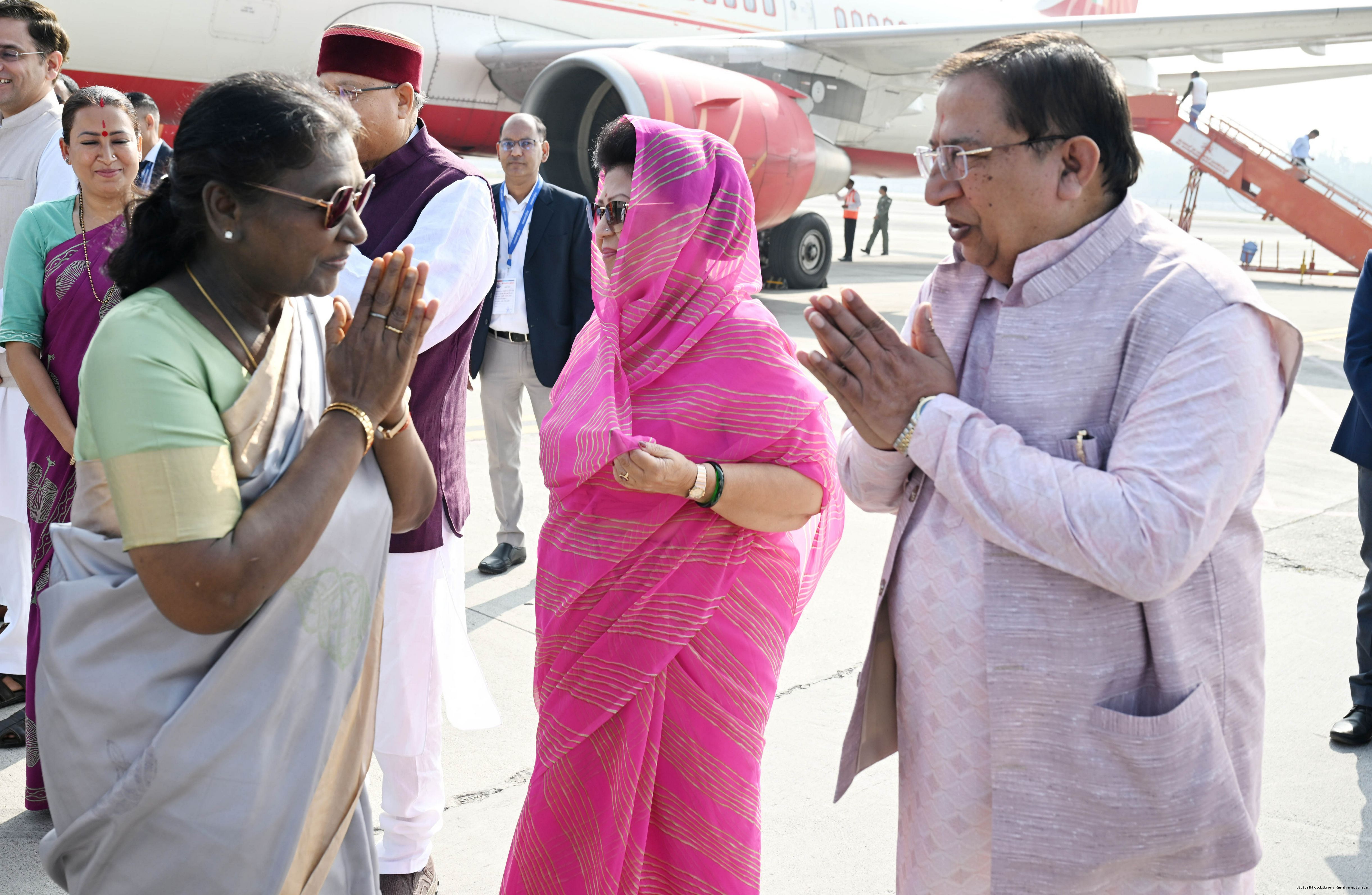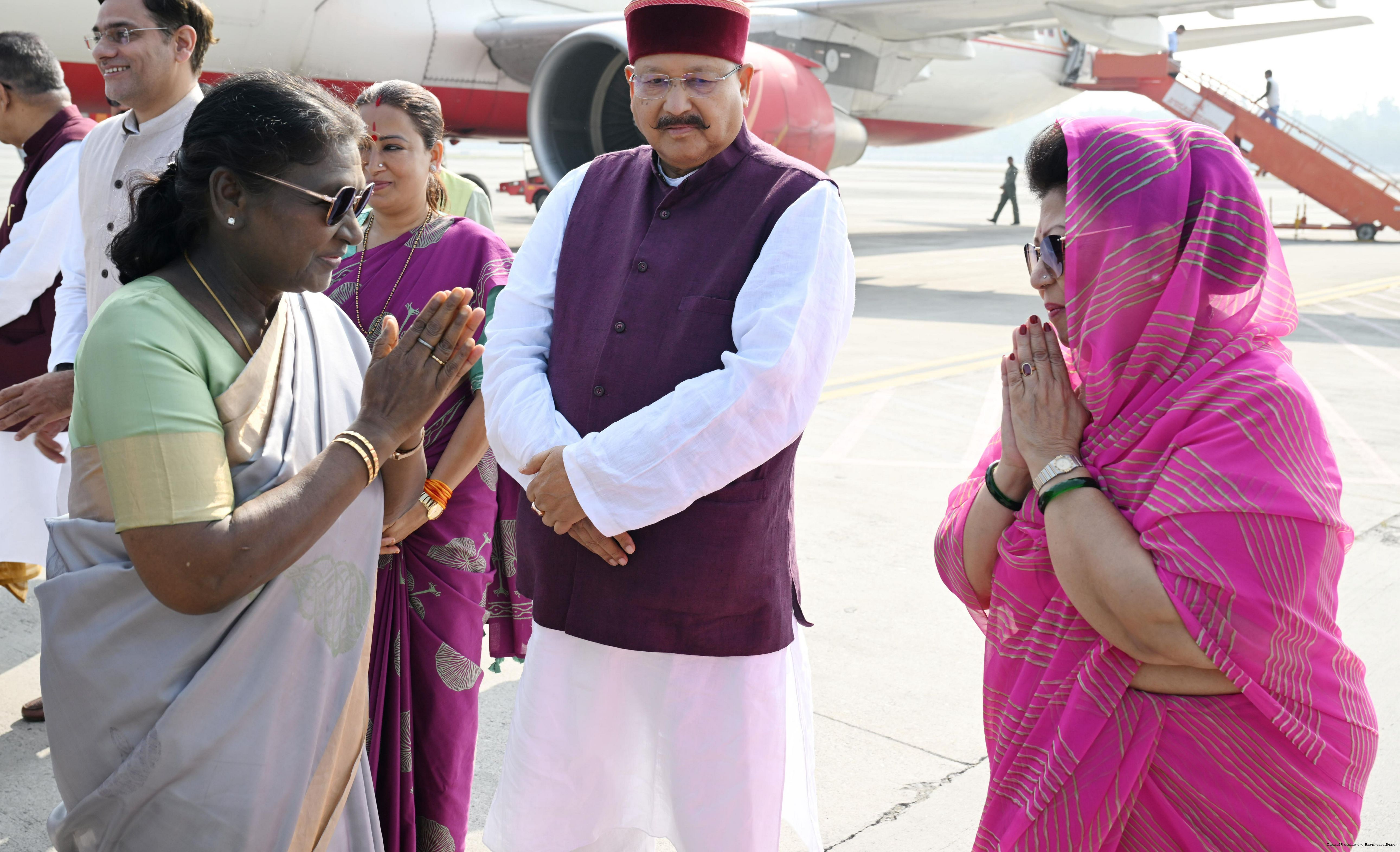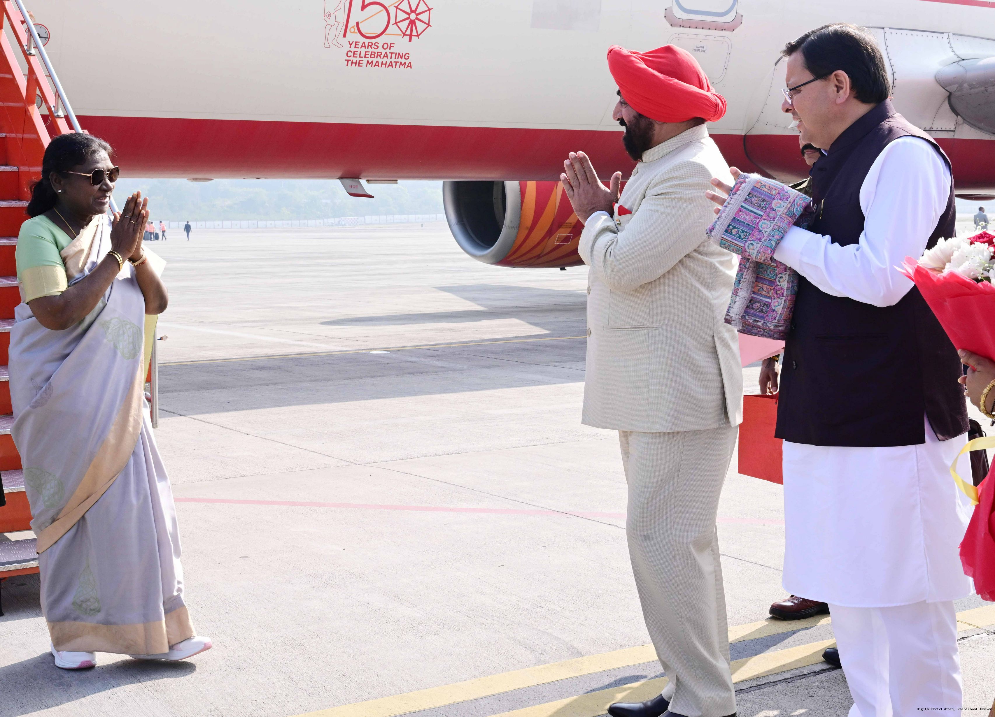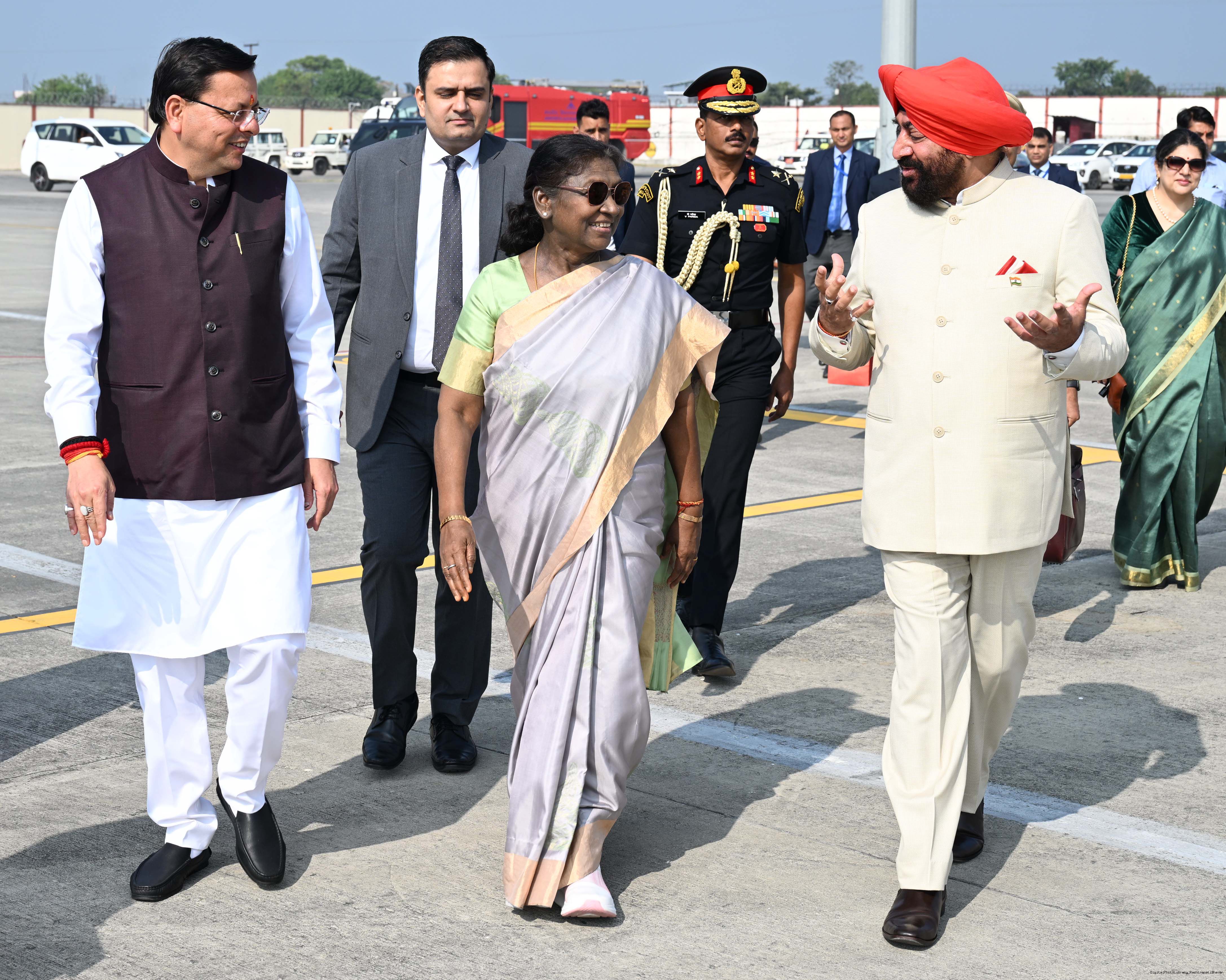 | Caption: | The Governor of Uttarakhand, Lt. Gen. Gurmit Singh (Retd.) and Chief Minister, Shri Pushkar Singh Dhami received the President of India, Smt. Droupadi Murmu on her arrival at Dehradun on November 2, 2025. |