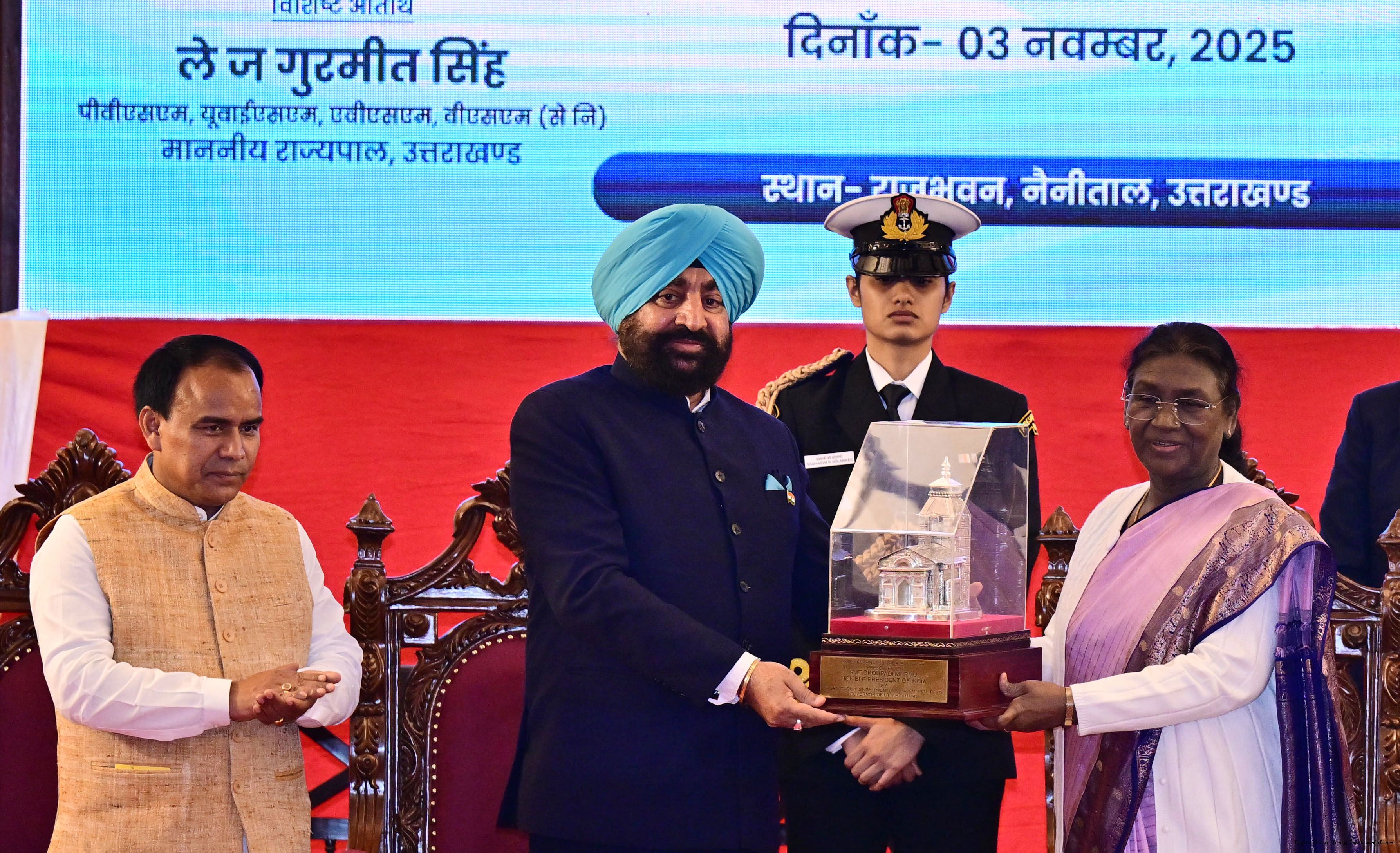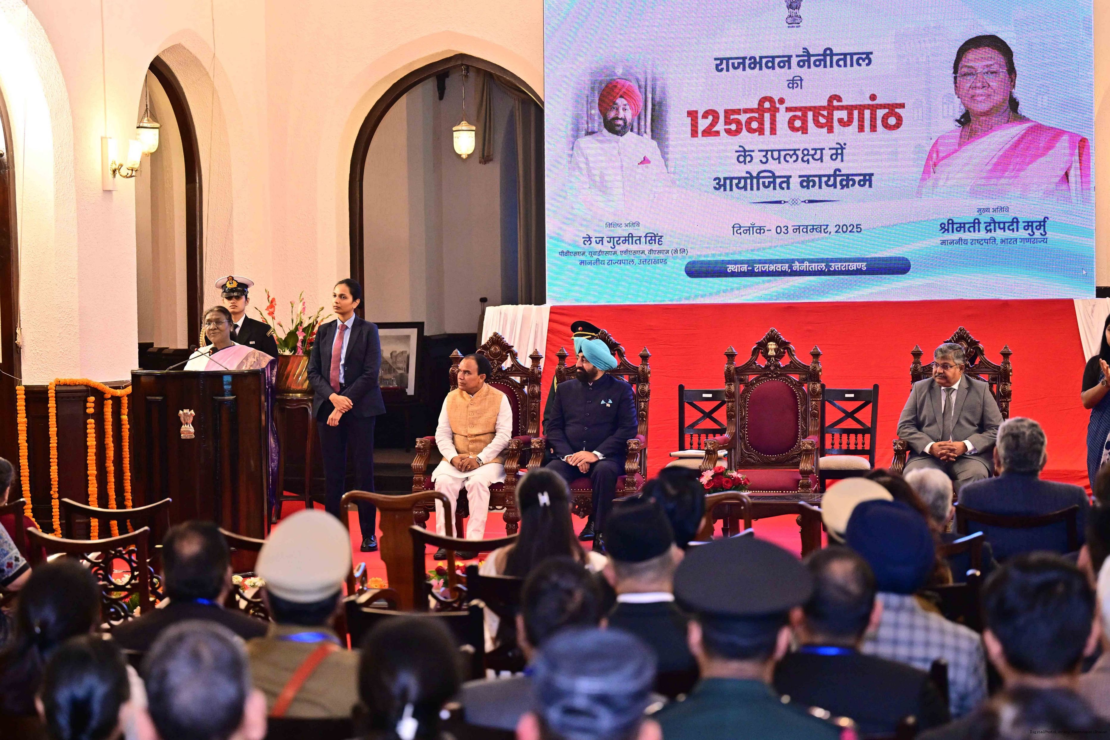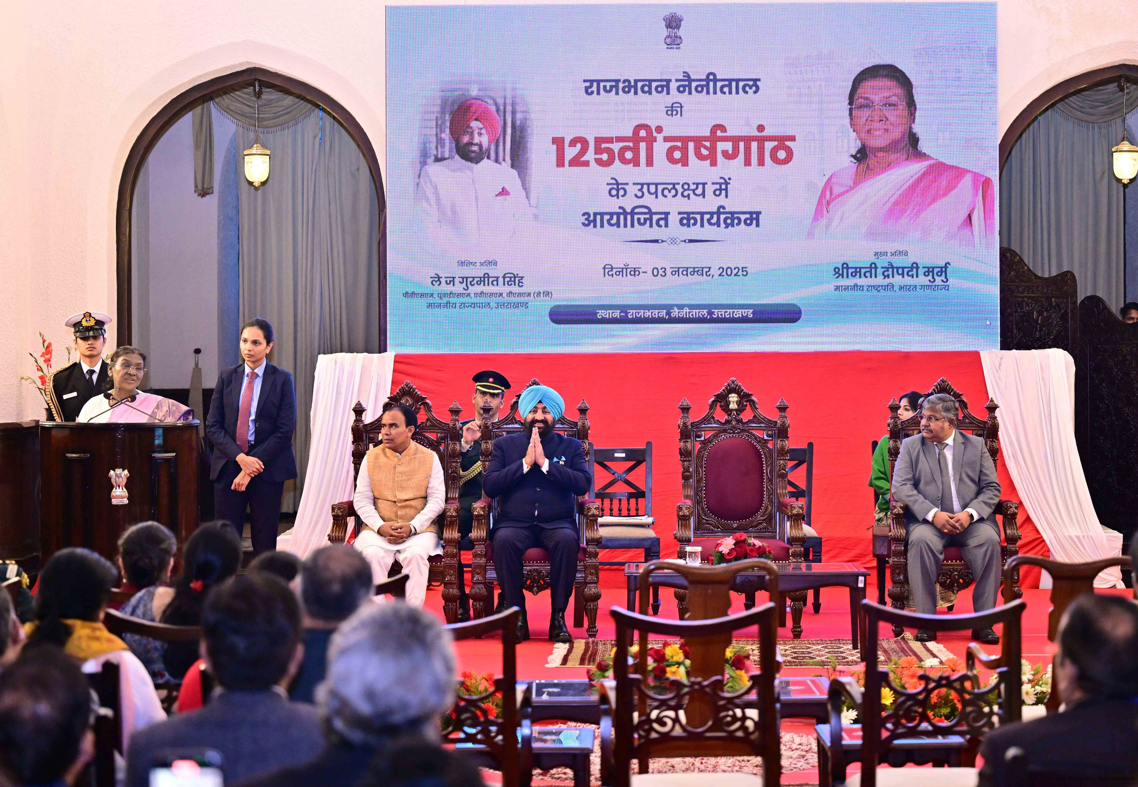 | Caption: | The President of India, Smt. Droupadi Murmu graced a function to commemorate the 125 years of the establishment of the Raj Bhavan, Nainital, Uttarakhand on November 3, 2025. |