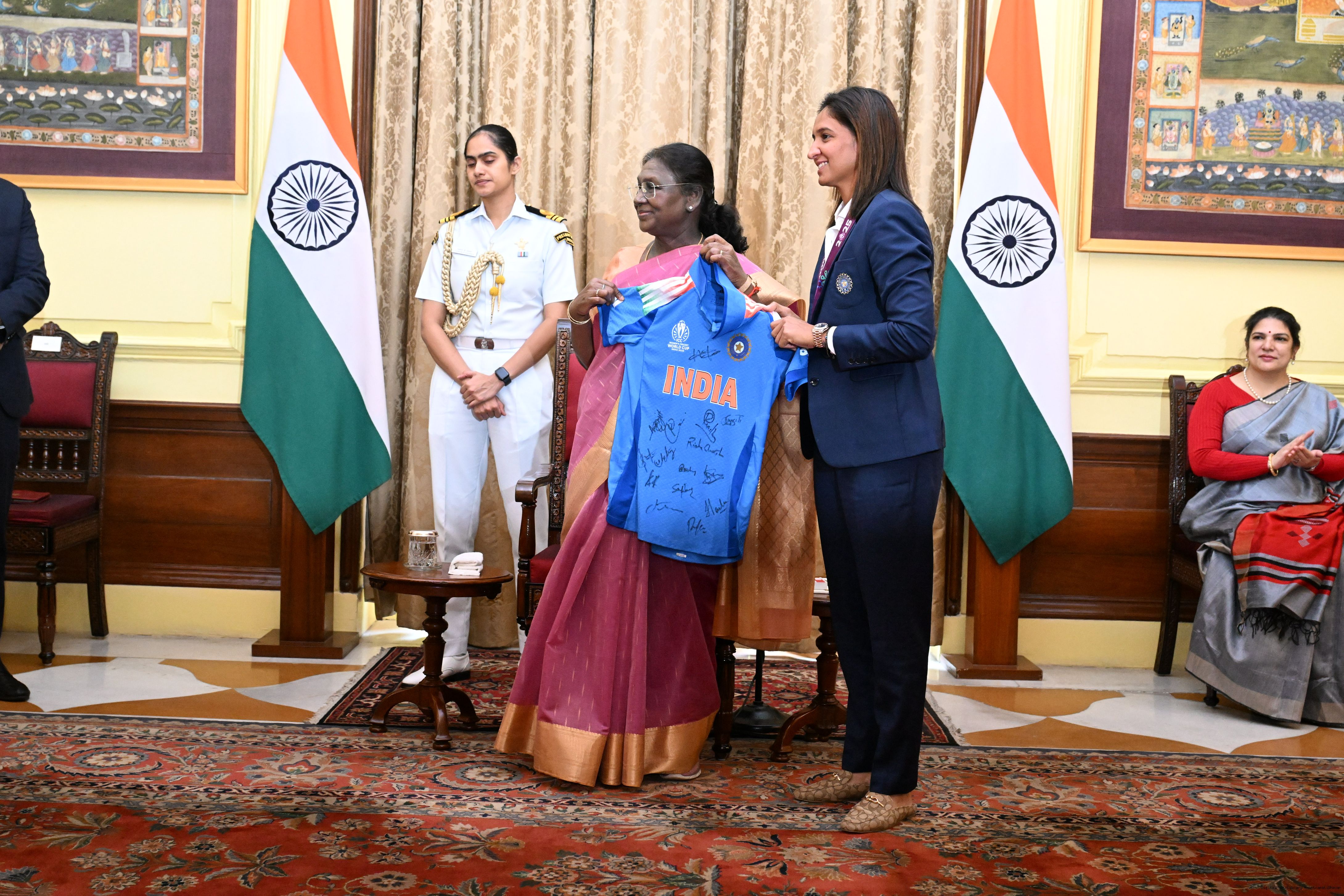 | Caption: | Members of the Indian Women Cricket team, winner of the ICC Women’s Cricket World Cup 2025 called on the President of India, Smt. Droupadi Murmu at Rashtrapati Bhavan on November 6, 2025. |