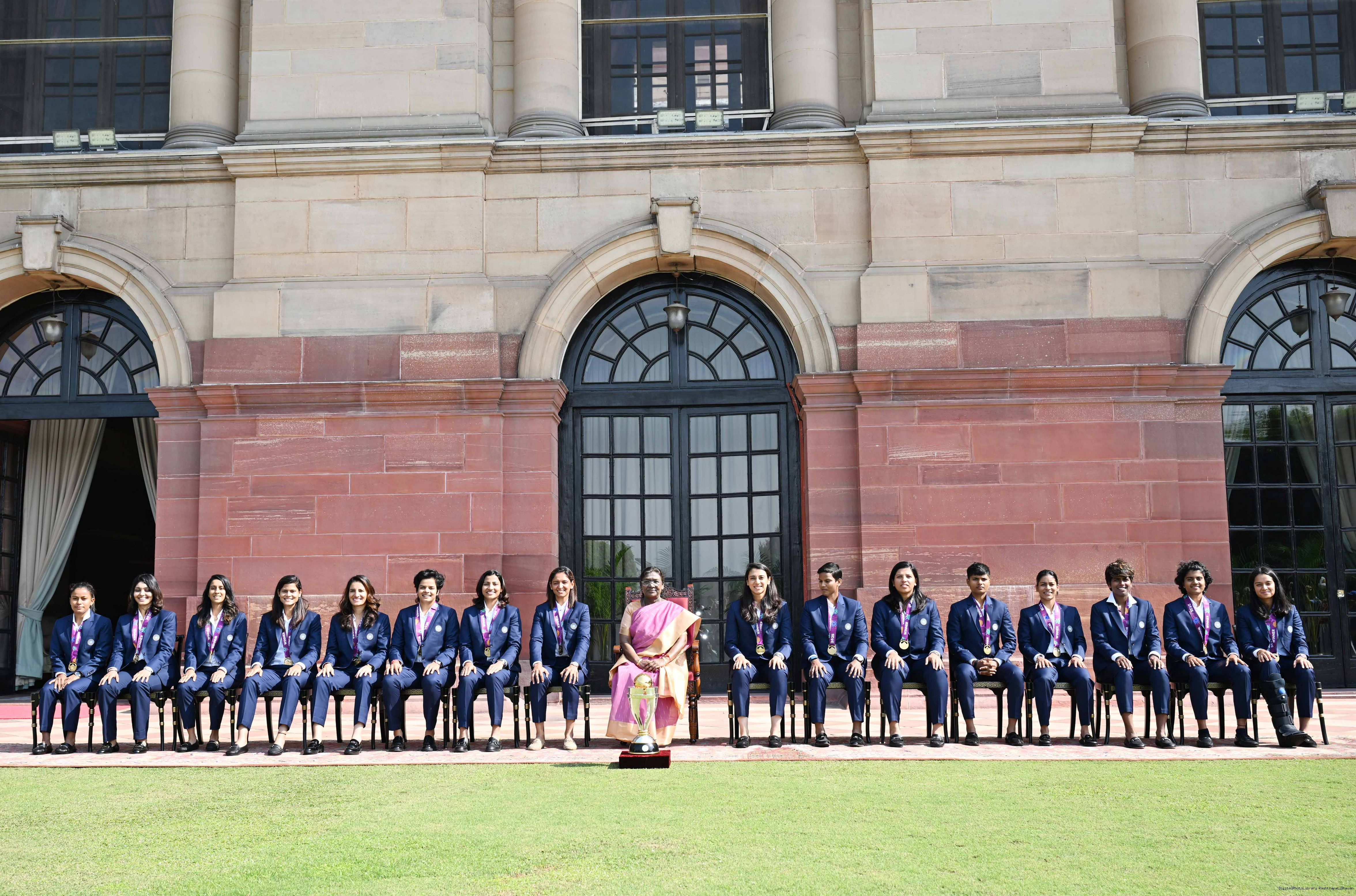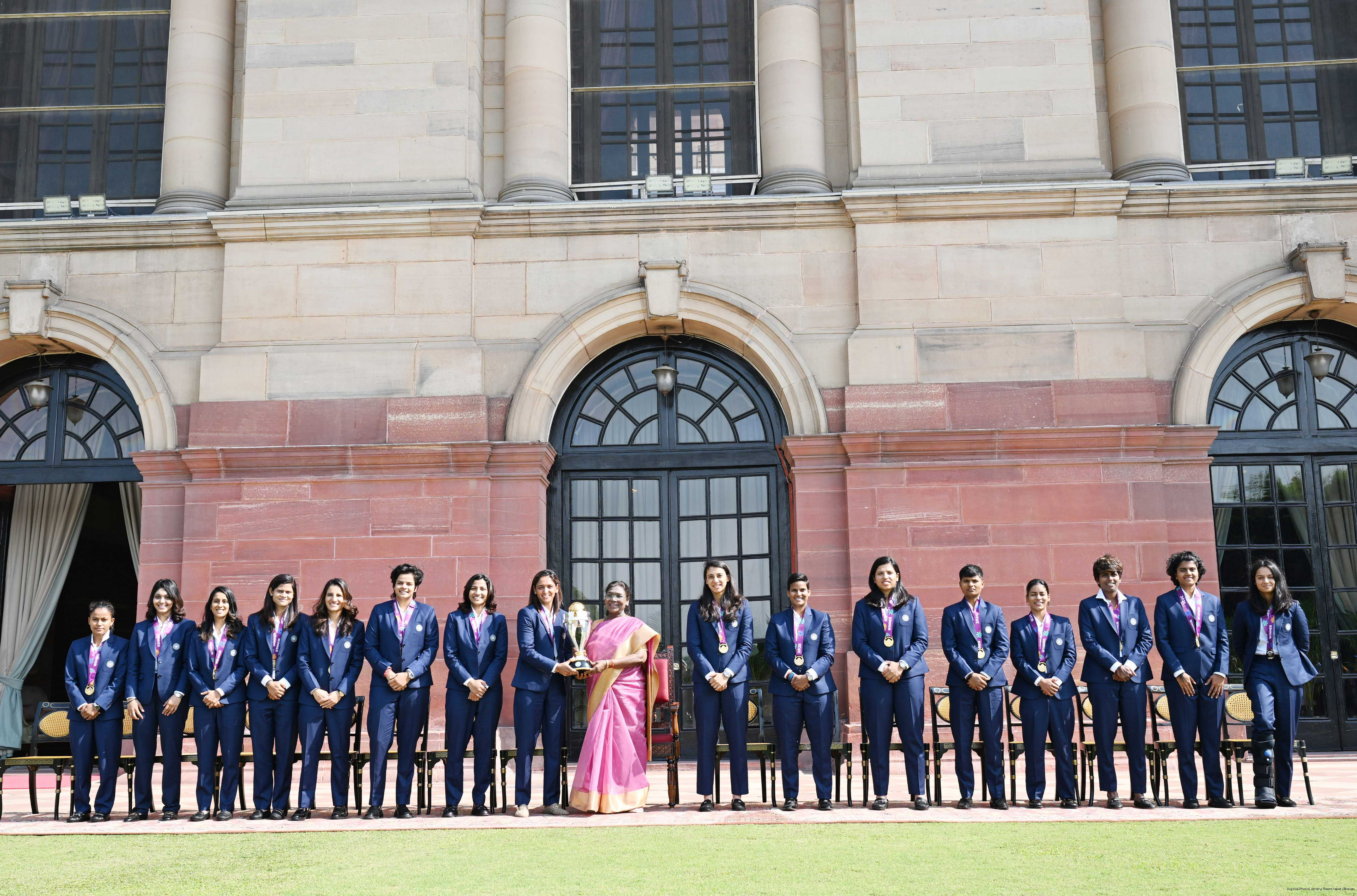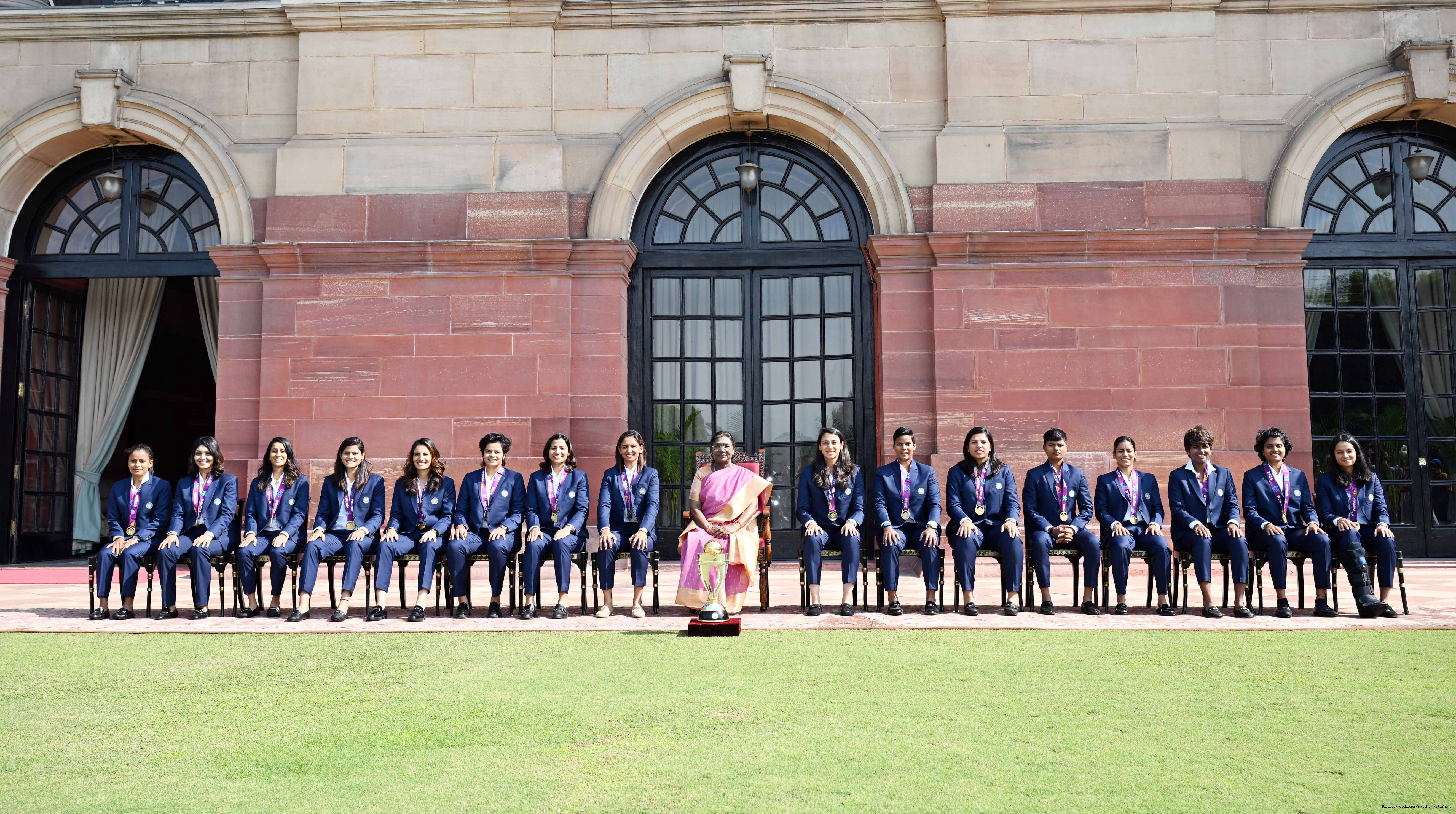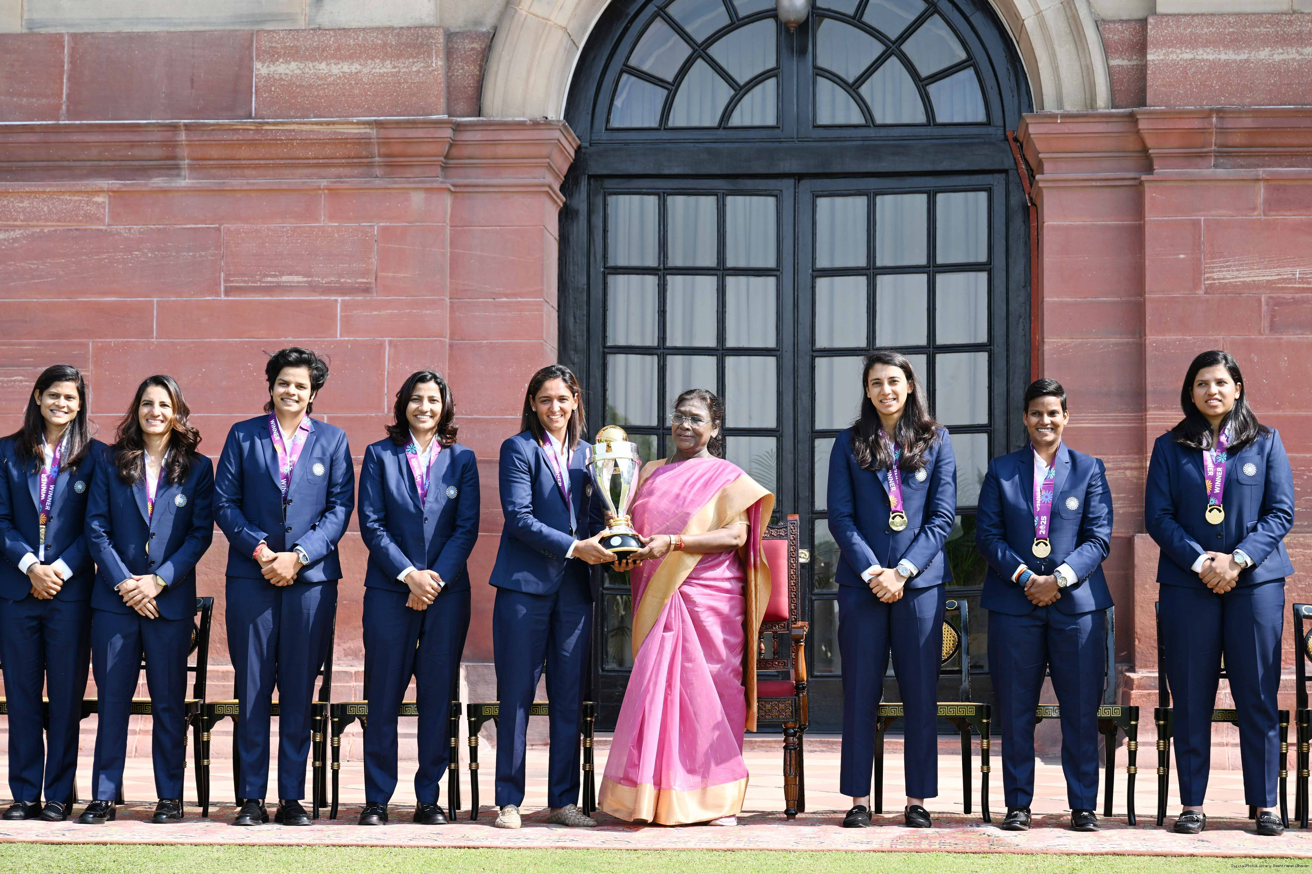 | Caption: | Members of the Indian Women Cricket team, winner of the ICC Women’s Cricket World Cup 2025 called on the President of India, Smt. Droupadi Murmu at Rashtrapati Bhavan on November 6, 2025. |