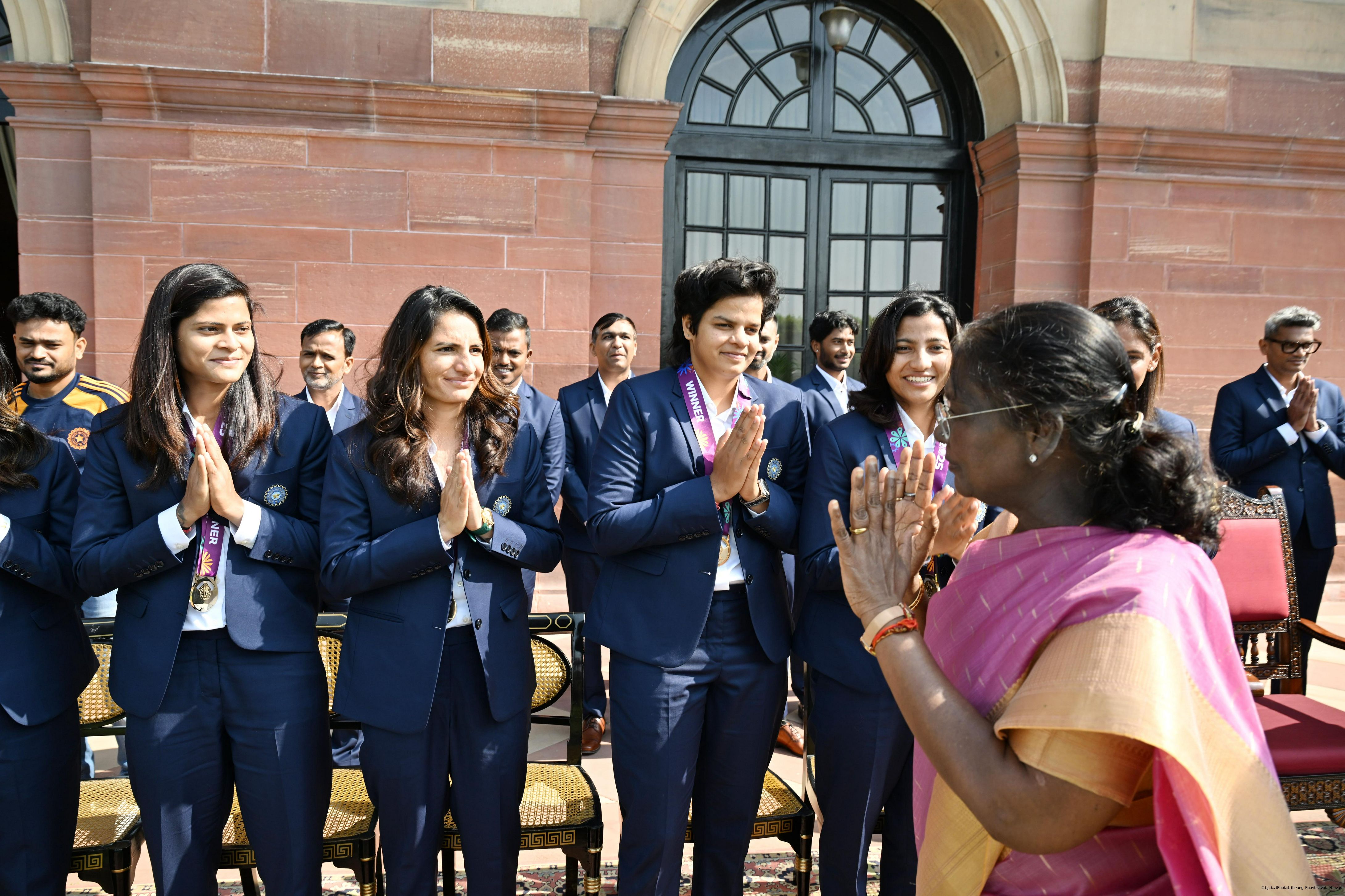 | Caption: | Members of the Indian Women Cricket team, winner of the ICC Women’s Cricket World Cup 2025 called on the President of India, Smt. Droupadi Murmu at Rashtrapati Bhavan on November 6, 2025. |