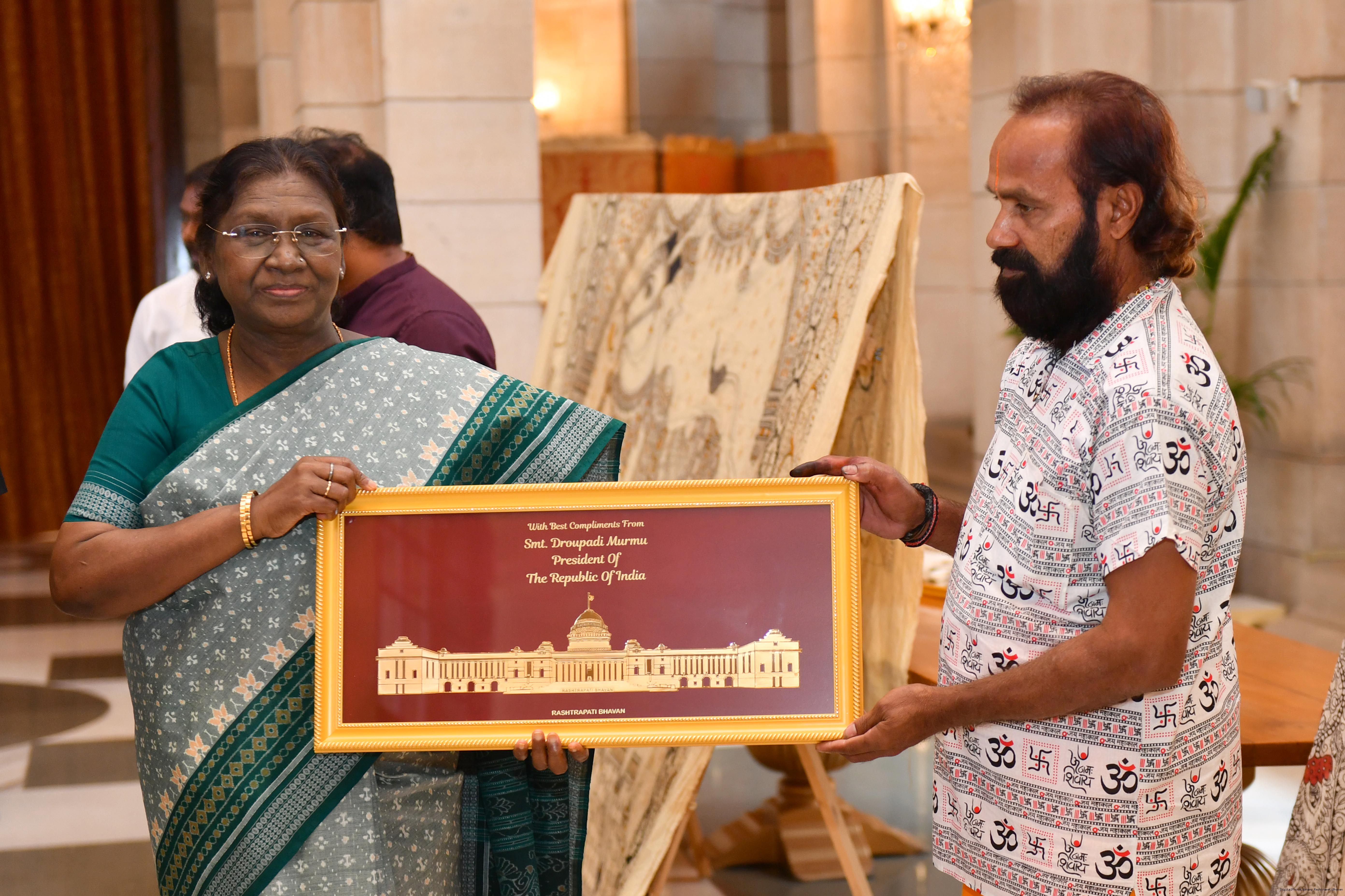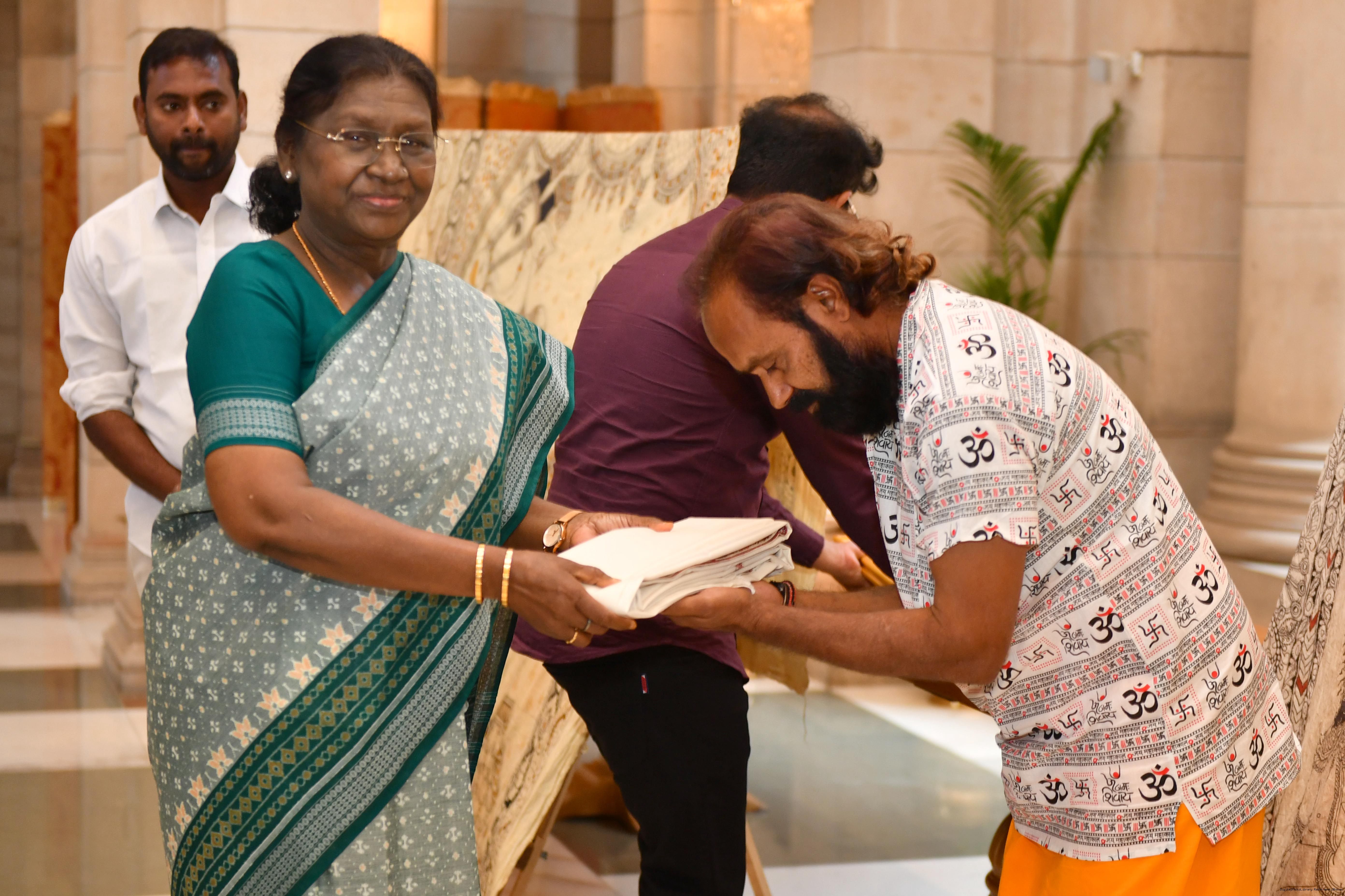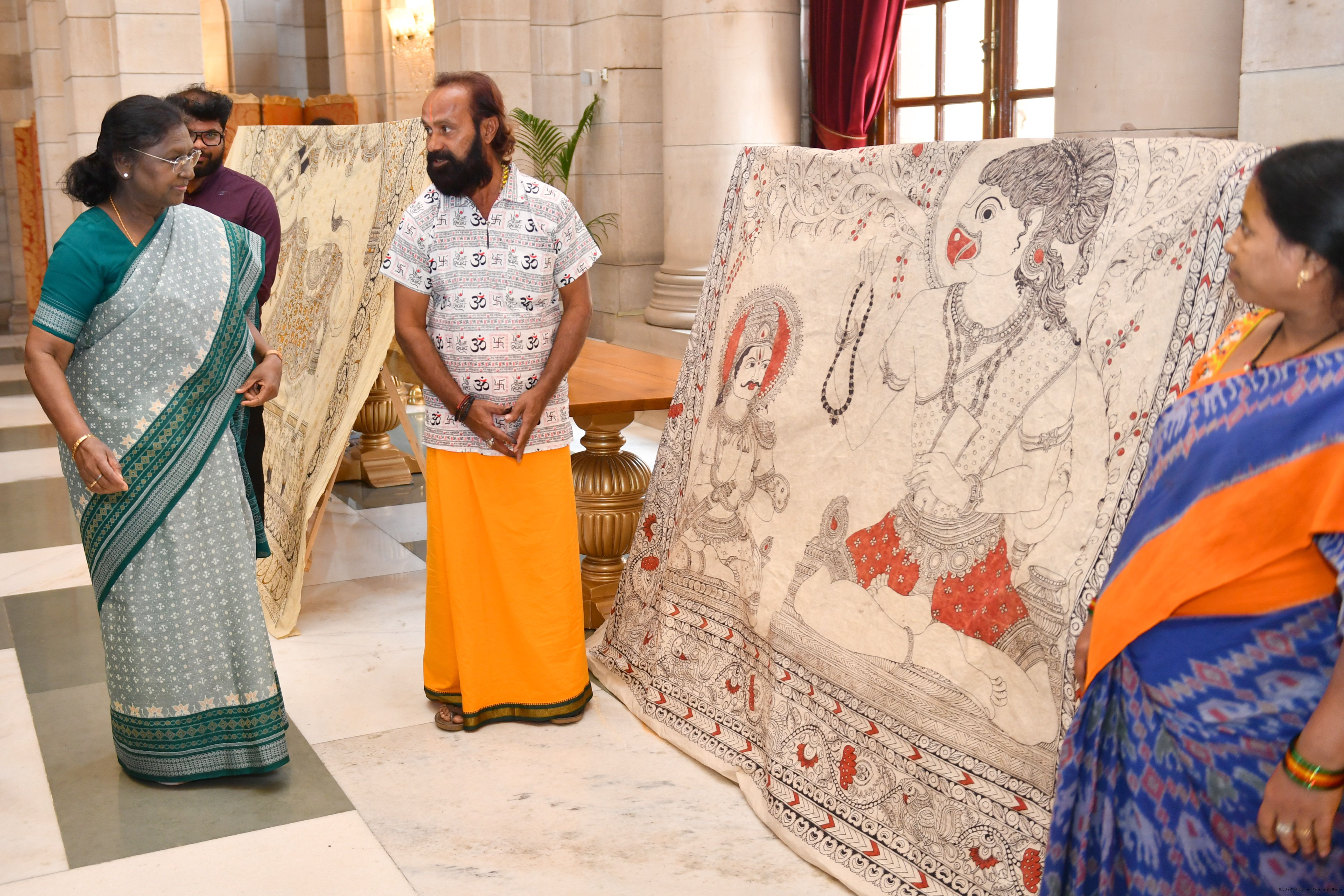 | Caption: | The President of India, Smt Droupadi Murmu met a group of artists of Kalamkari Art and witnessed their work at Rashtrapati Bhavan on February 24, 2026. |