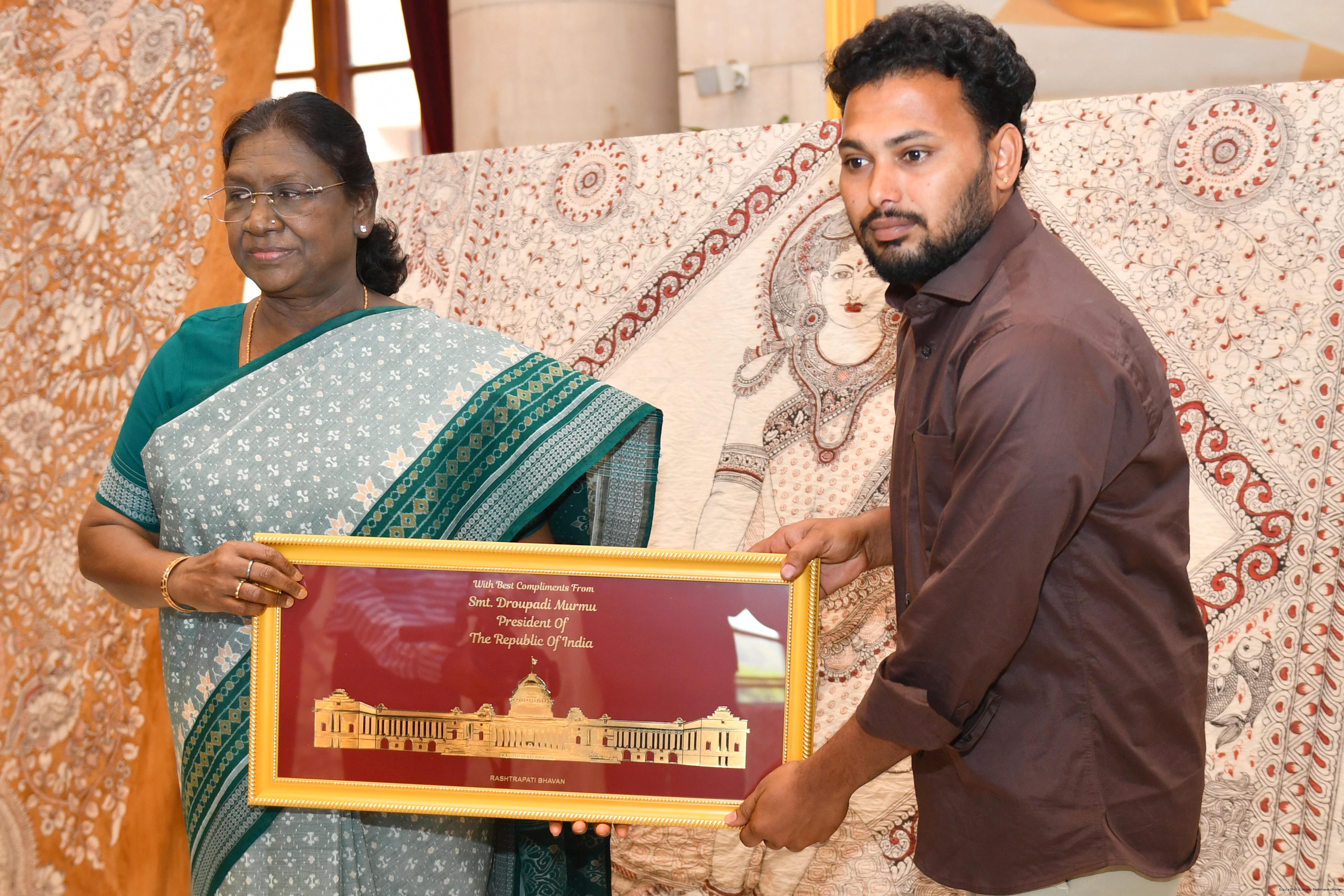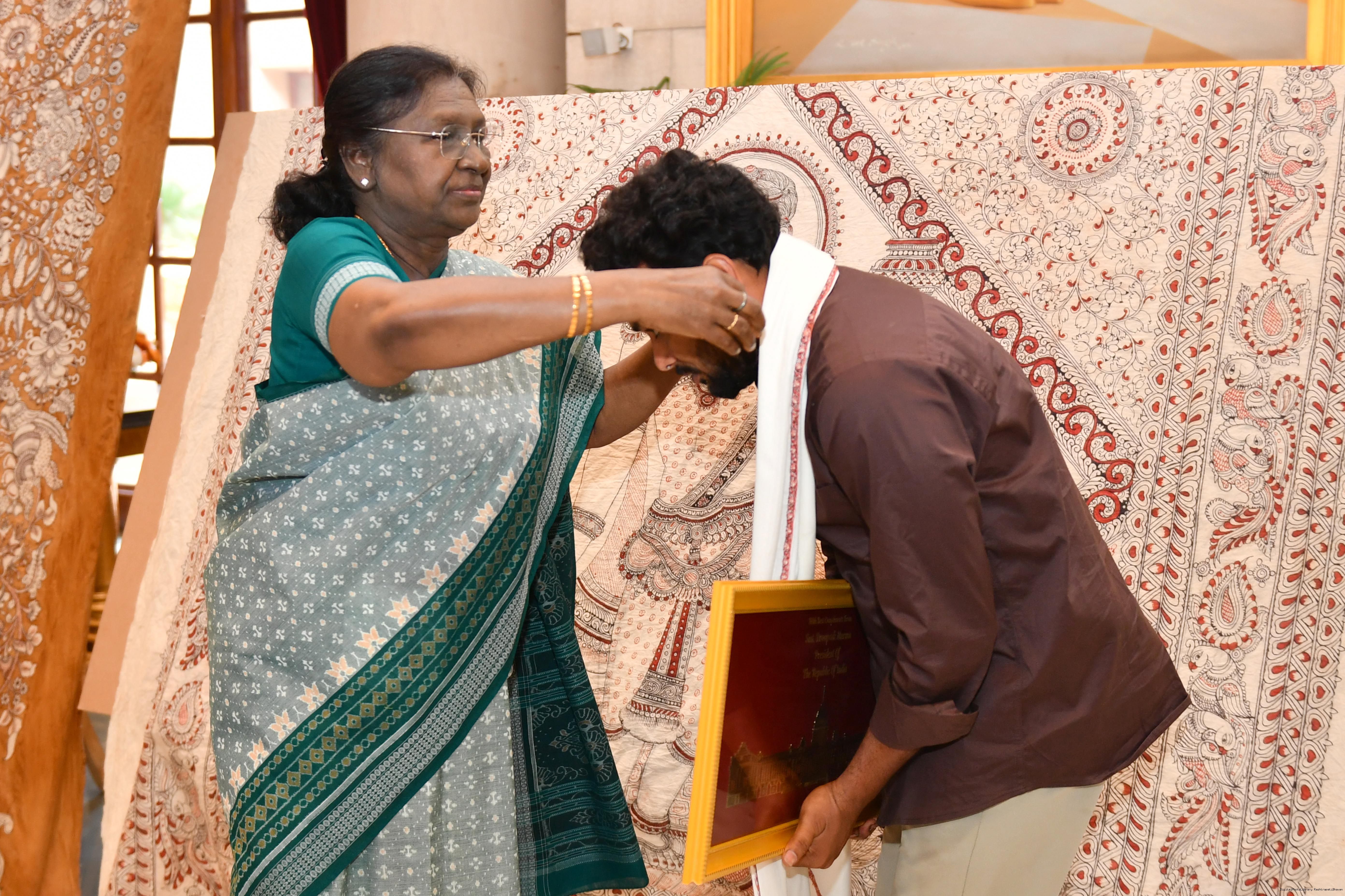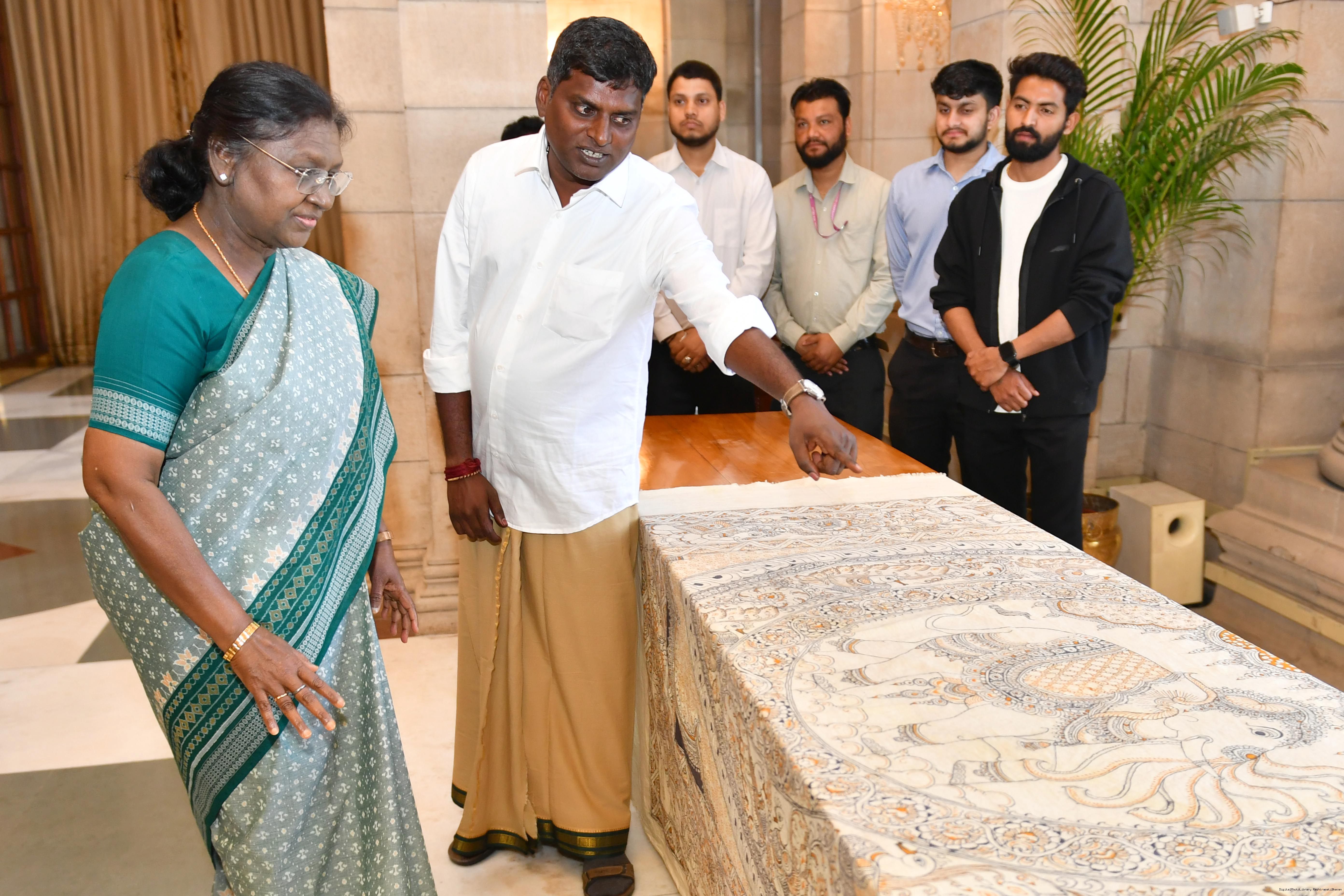 | Caption: | The President of India, Smt Droupadi Murmu met a group of artists of Kalamkari Art and witnessed their work at Rashtrapati Bhavan on February 24, 2026. |