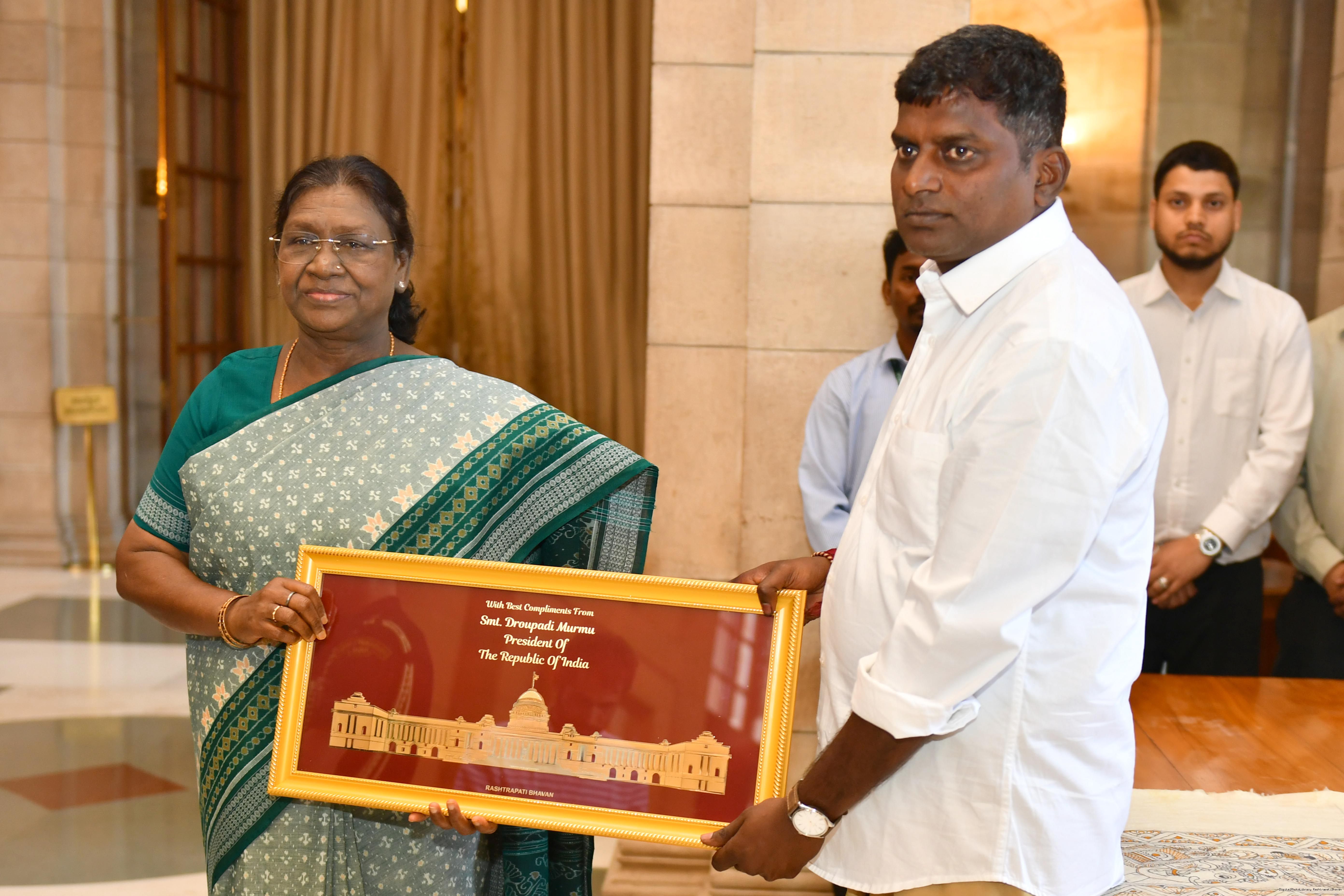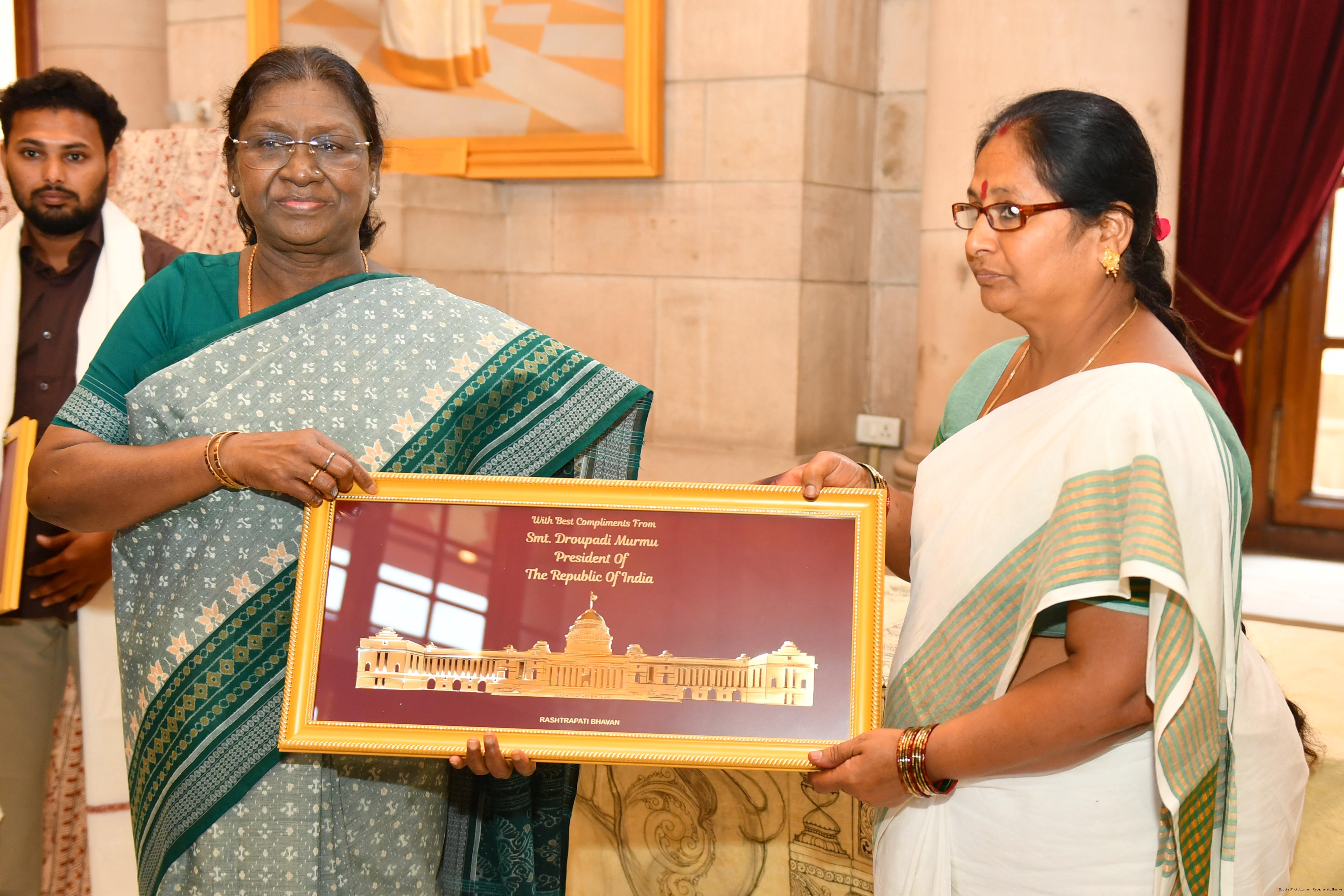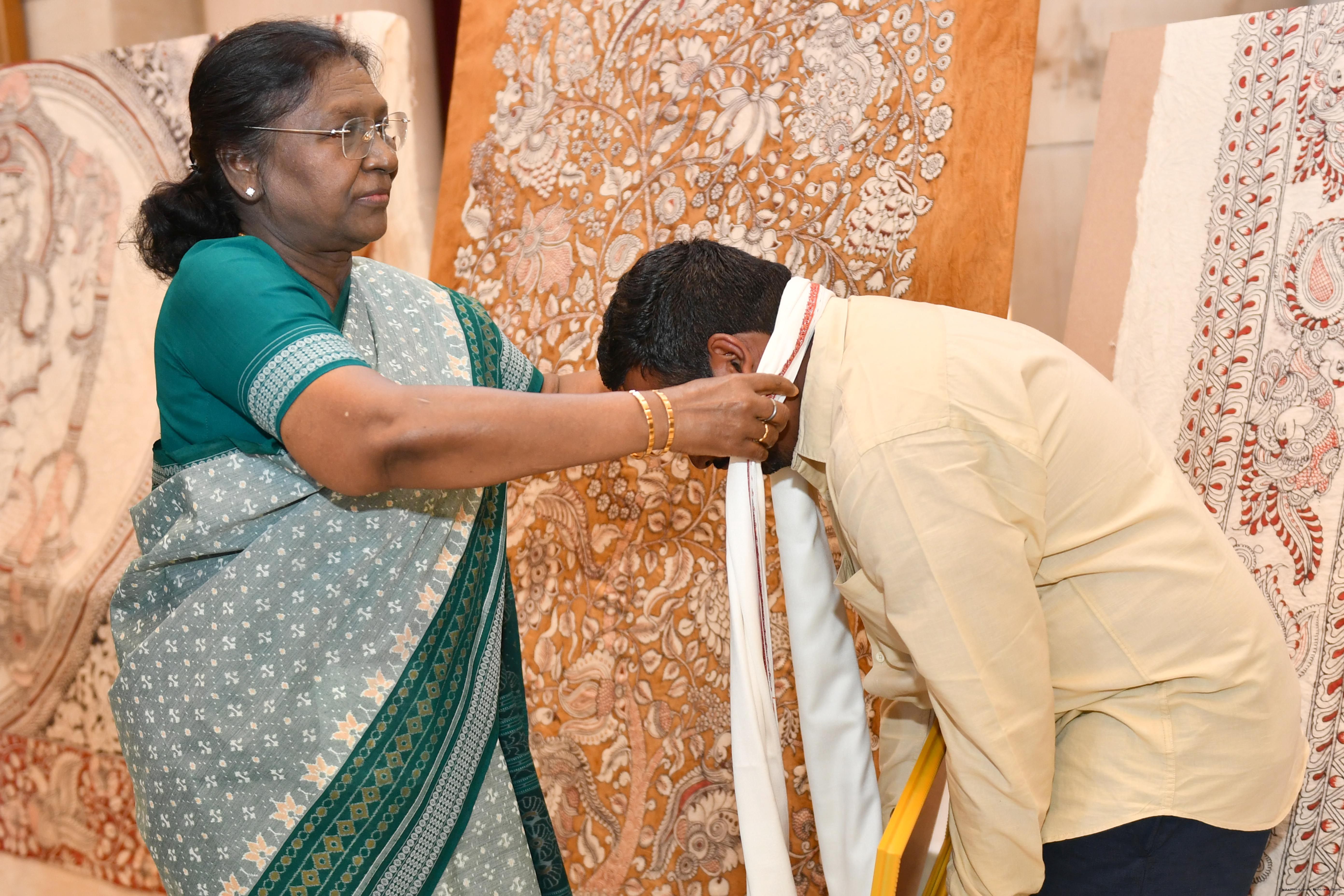 | Caption: | The President of India, Smt Droupadi Murmu met a group of artists of Kalamkari Art and witnessed their work at Rashtrapati Bhavan on February 24, 2026. |