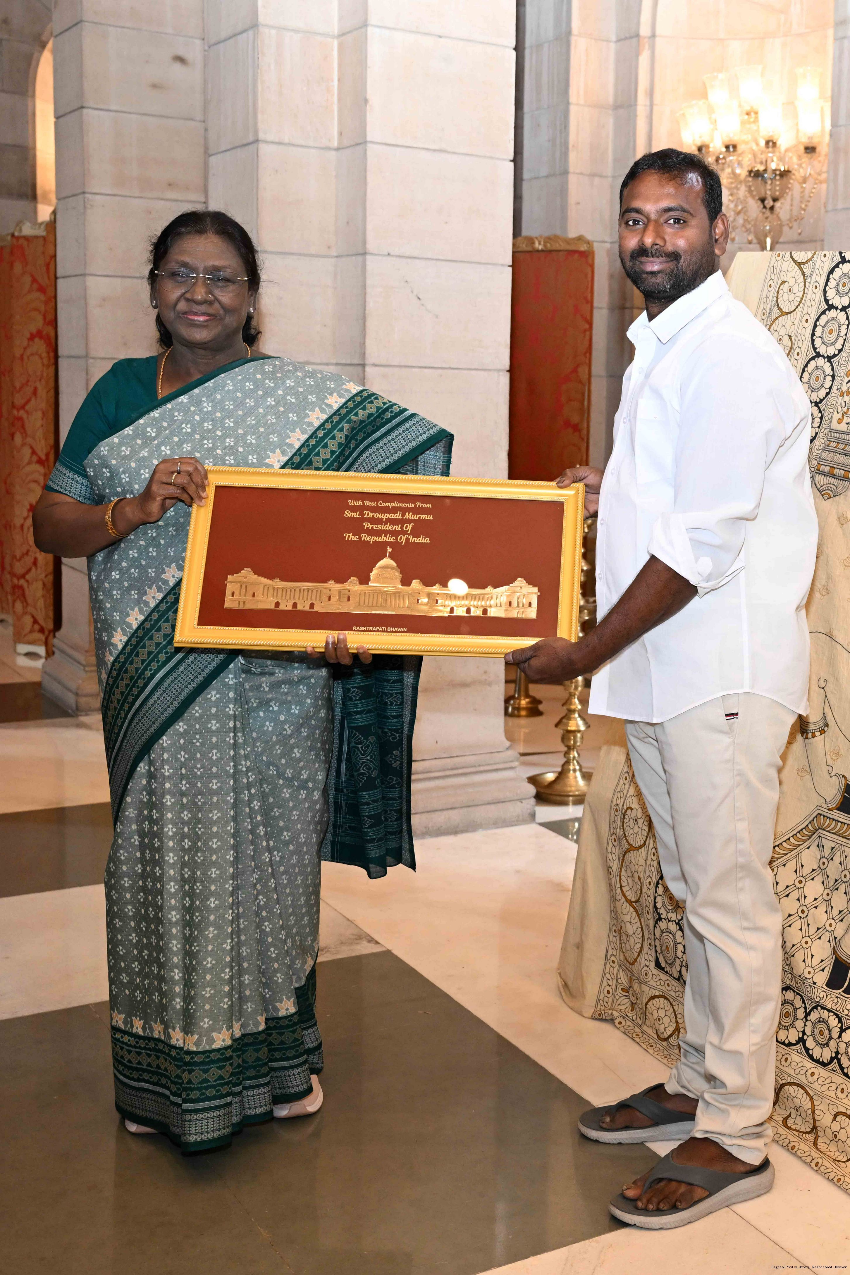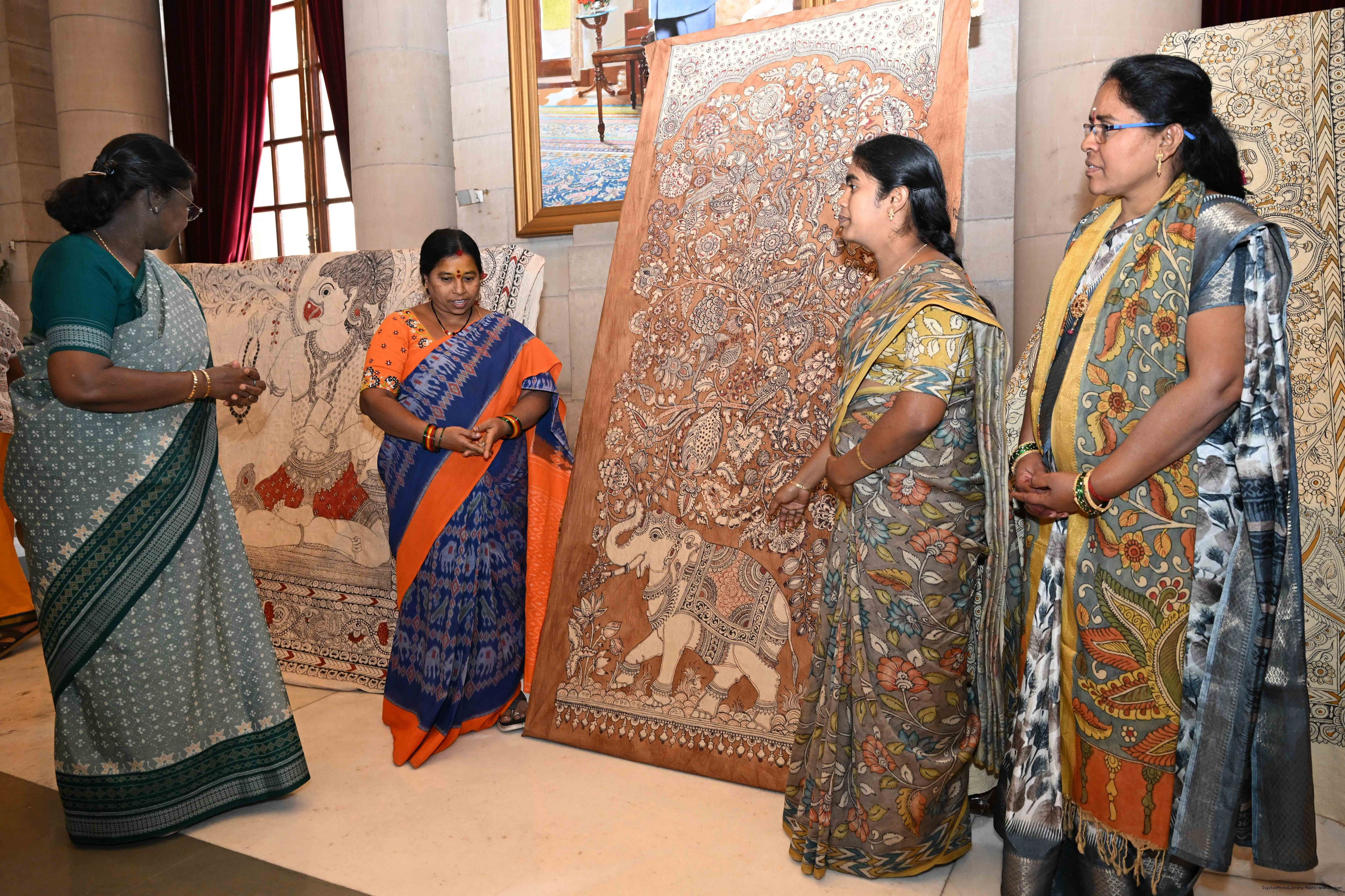 | Caption: | The President of India, Smt Droupadi Murmu met a group of artists of Kalamkari Art and witnessed their work at Rashtrapati Bhavan on February 24, 2026. |