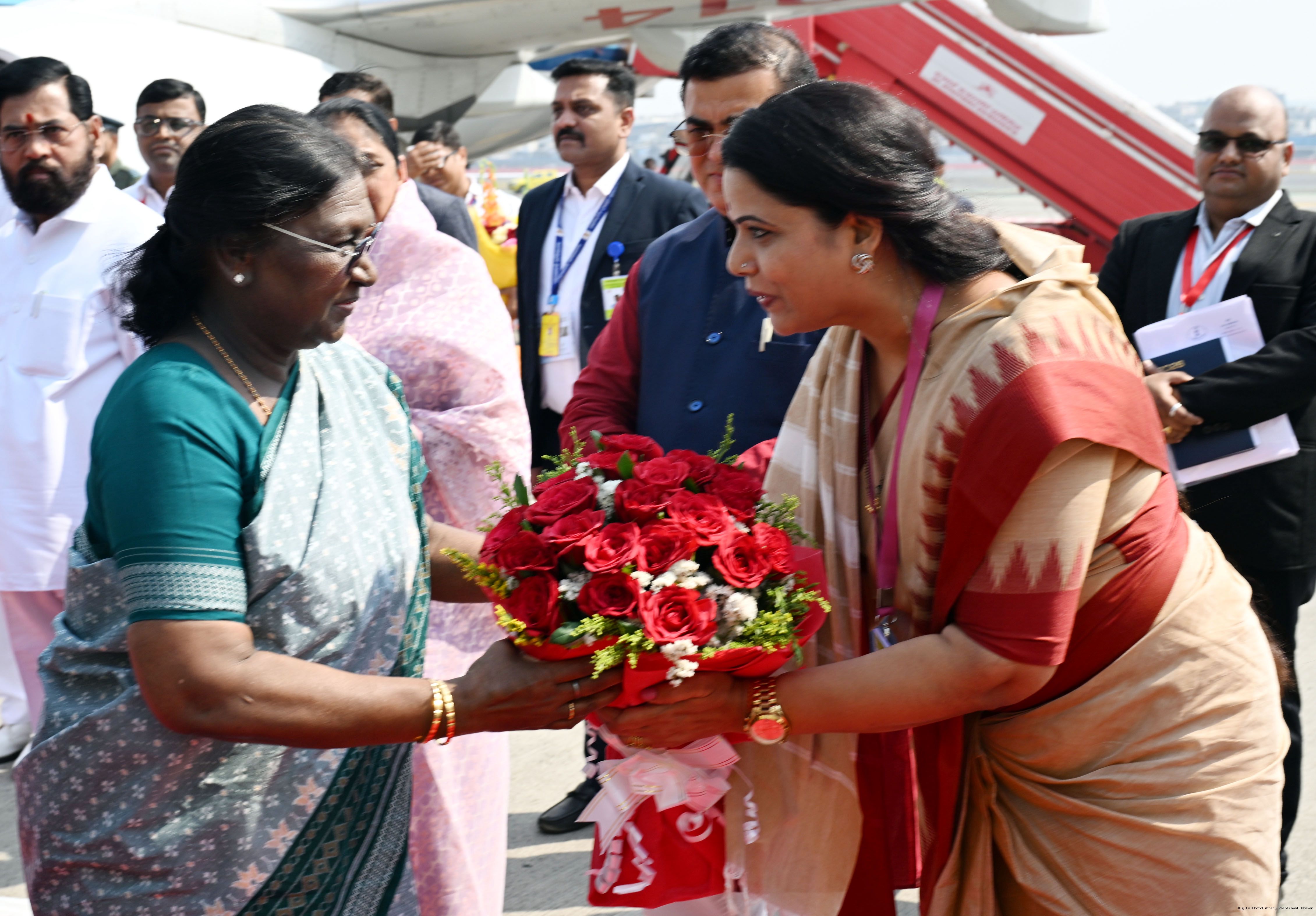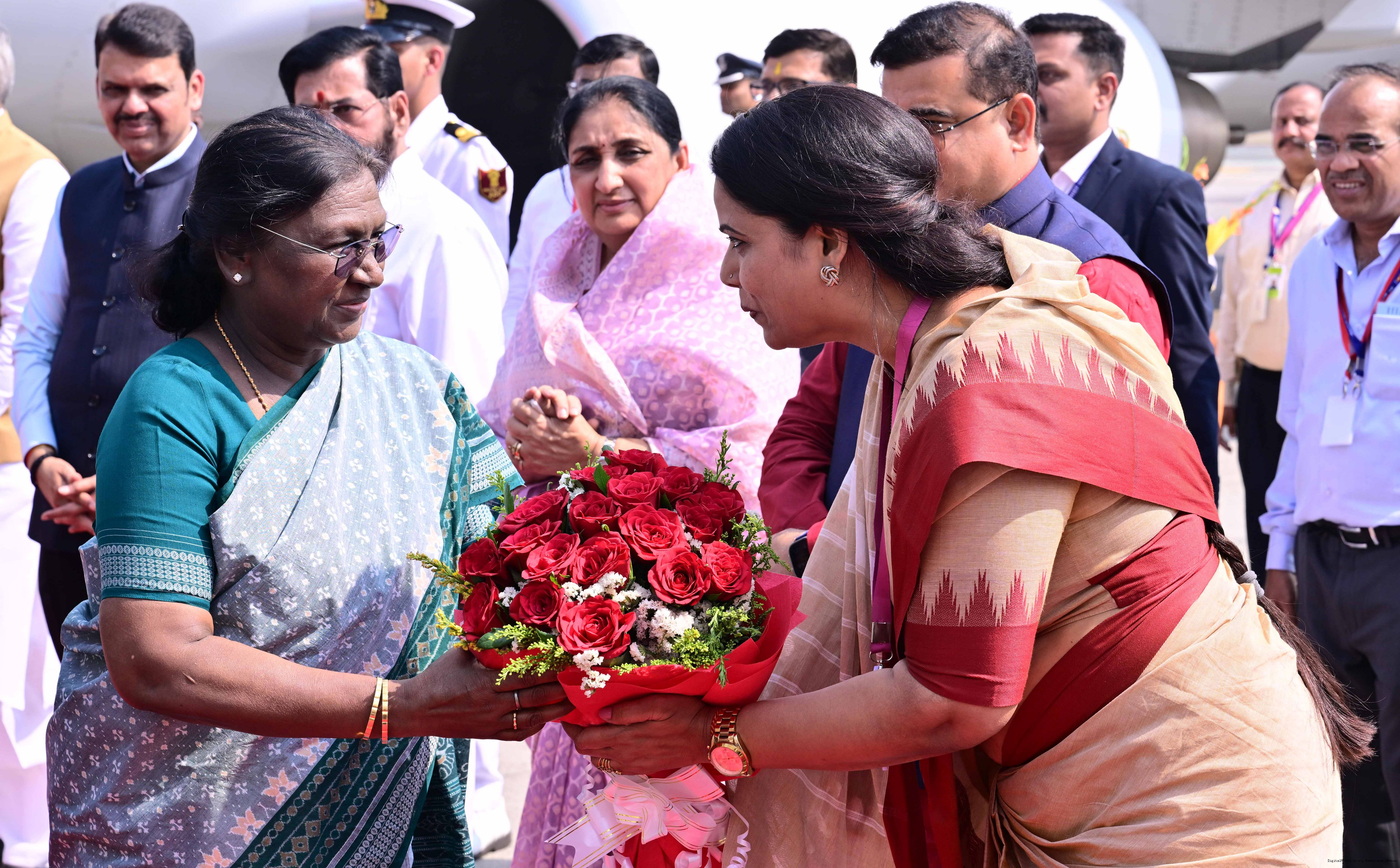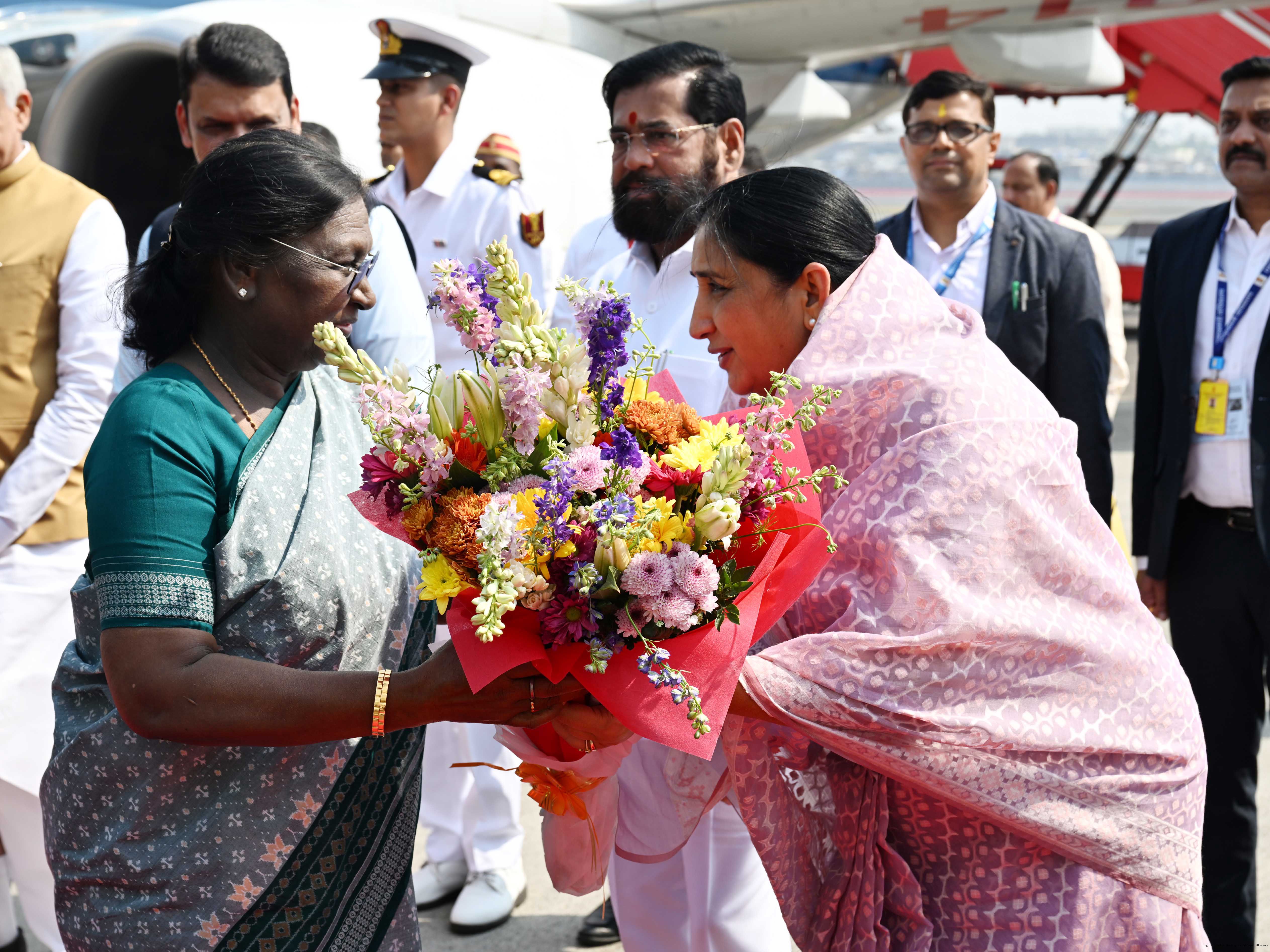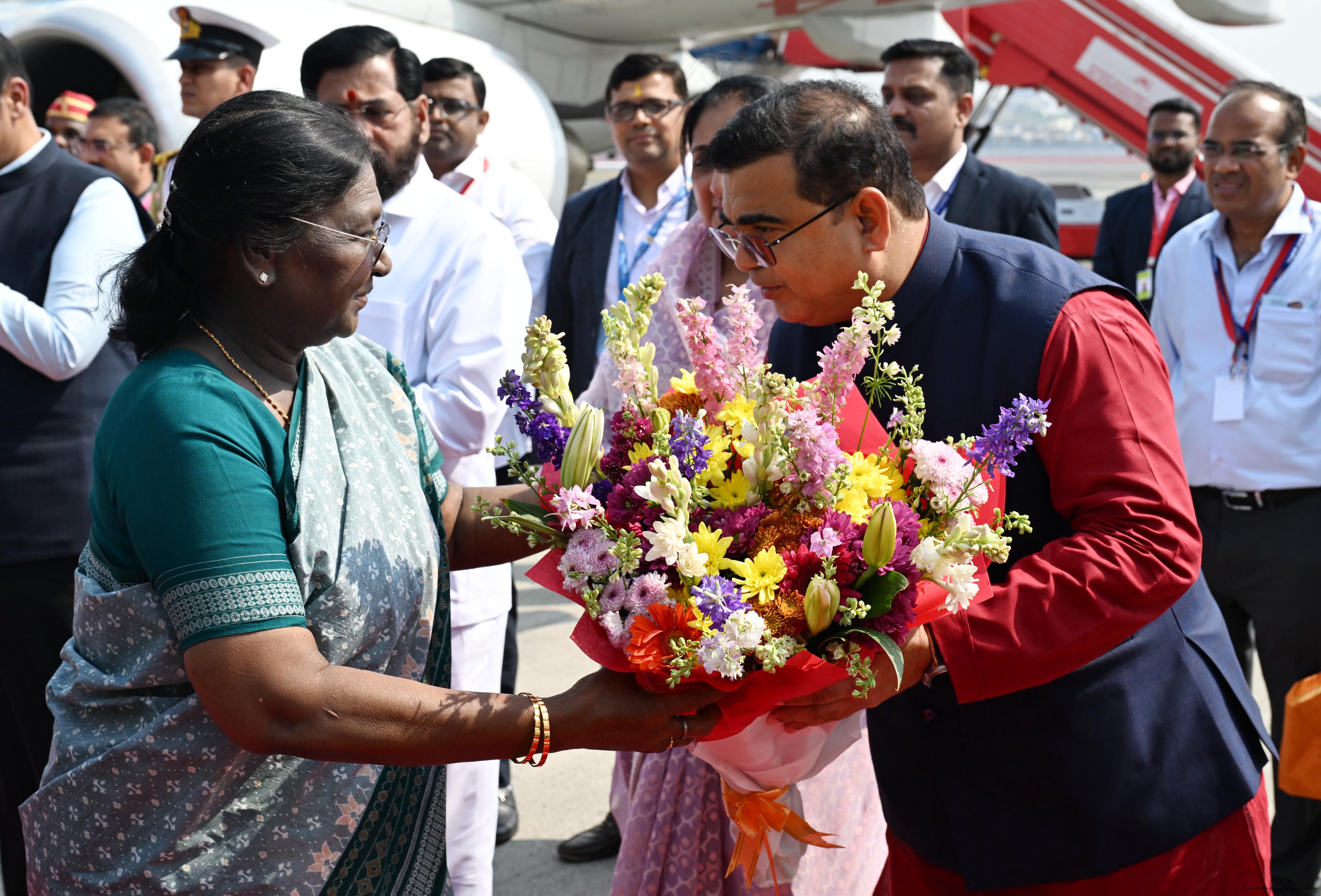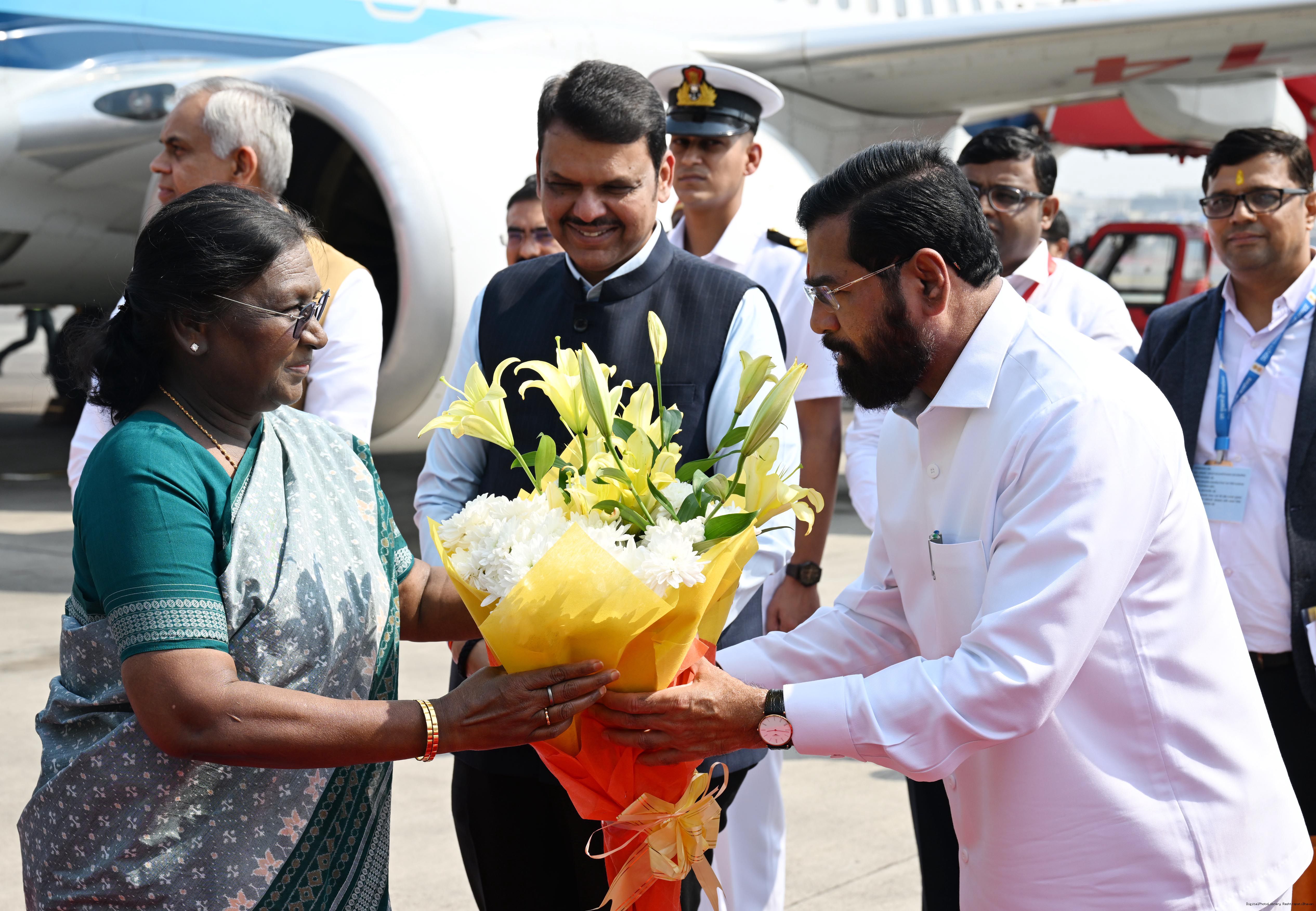| Caption: | The Governor of Maharashtra, Shri Acharya Devvrat, Chief Minister Shri Devendra Fadnavis and Deputy Chief Ministers Shri Eknath Shinde and Smt Sunetra Ajit Pawar received the President of India, Smt Droupadi Murmu on her arrival at Mumbai on February 24, 2026. |