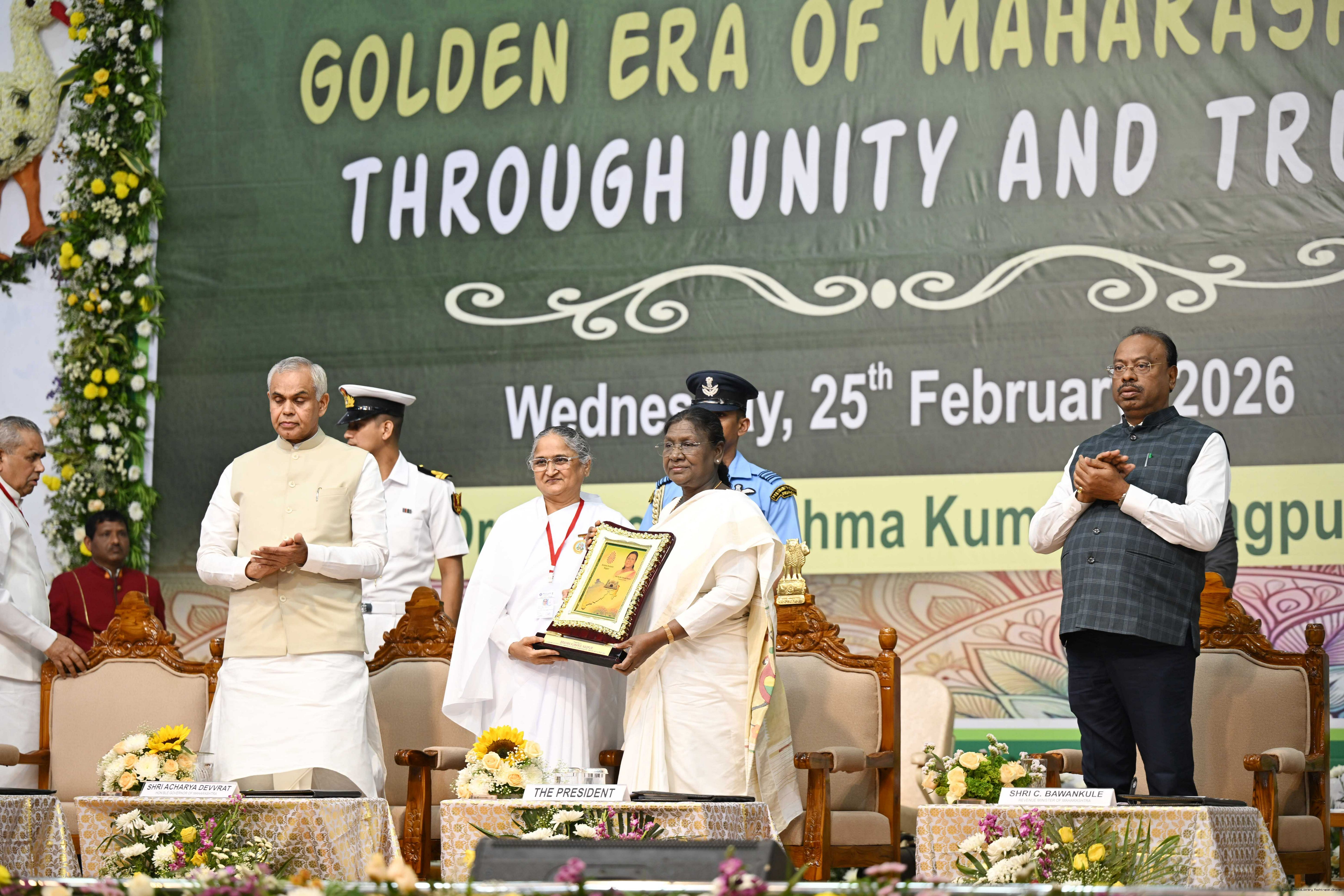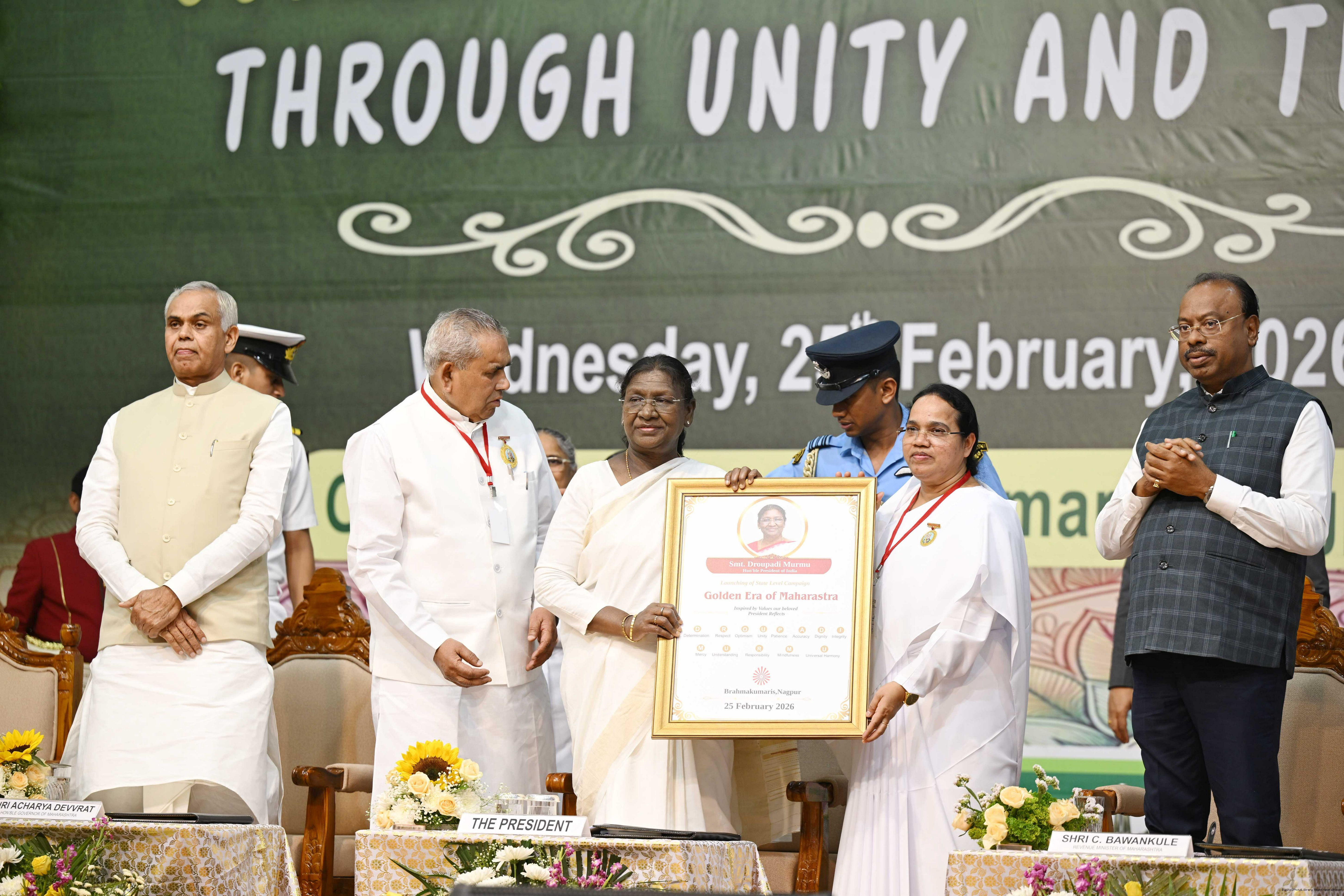 | Caption: | The President of India, Smt Droupadi Murmu graced the state-level launch of ‘Golden Era of Maharashtra through Unity and Trust’, organised by Brahma Kumaris at Vishwa Shanti Sarovar, Nagpur, Maharashtra on February 25, 2026. |