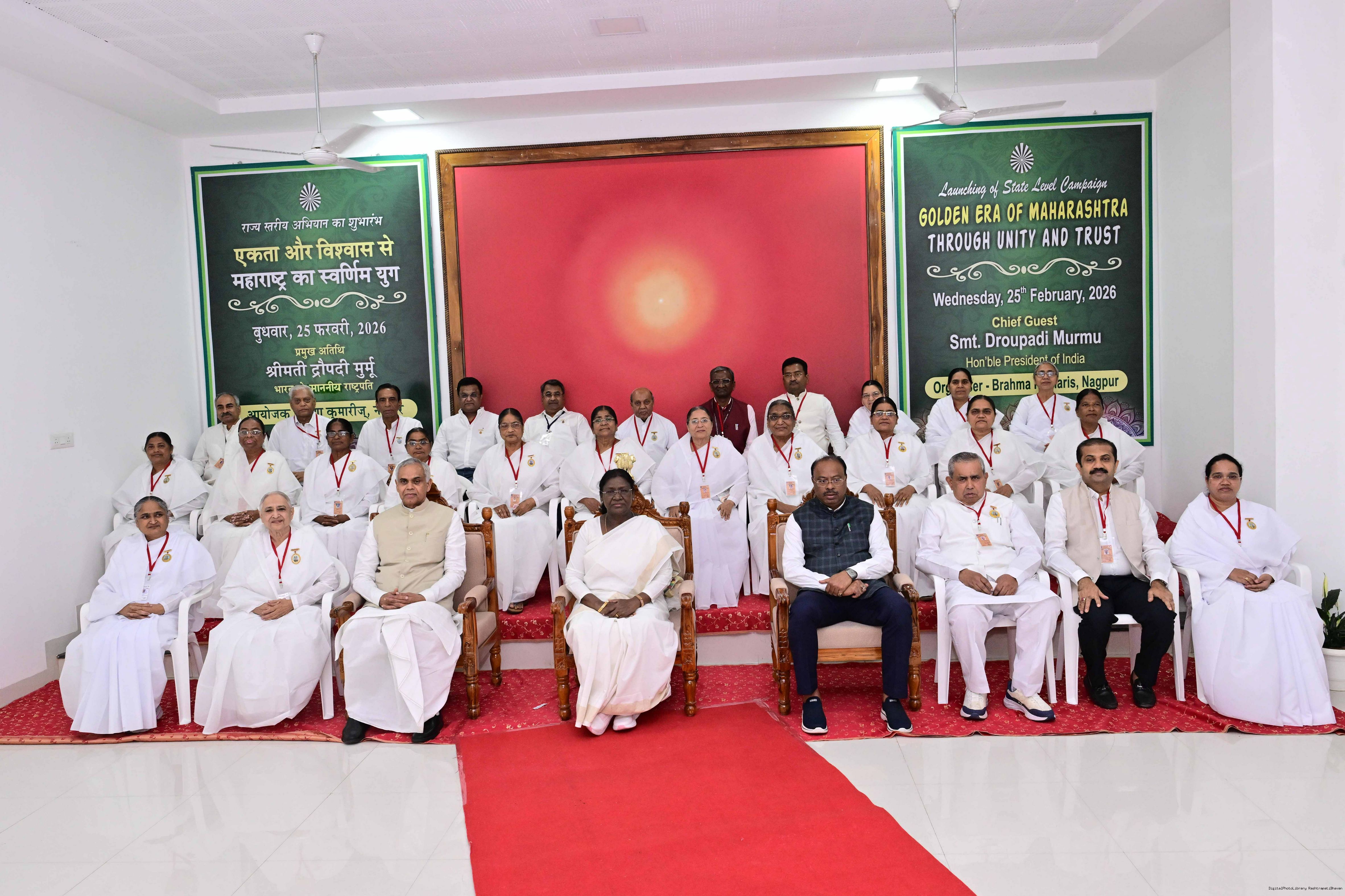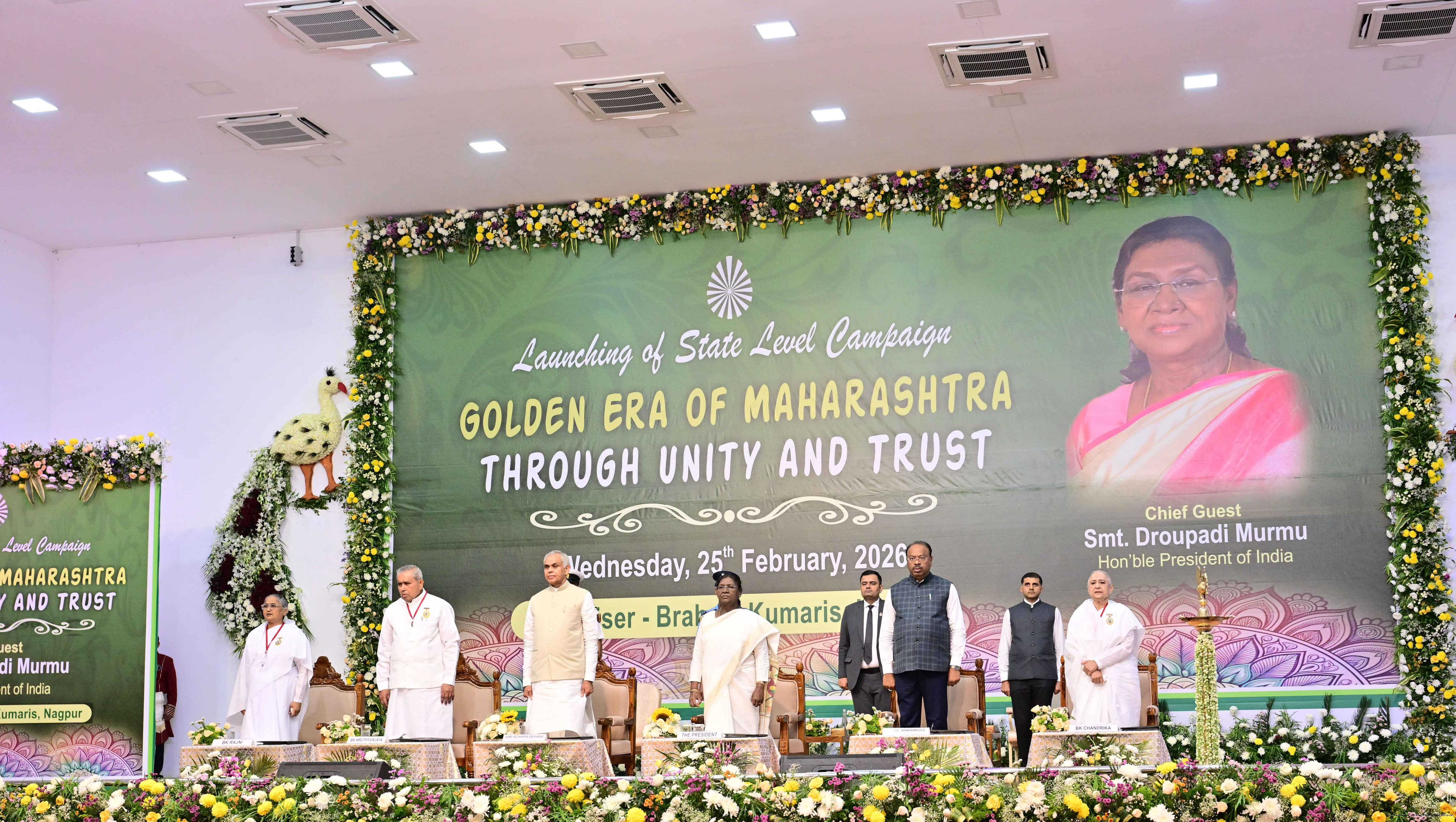 | Caption: | The President of India, Smt Droupadi Murmu graced the state-level launch of ‘Golden Era of Maharashtra through Unity and Trust’, organised by Brahma Kumaris at Vishwa Shanti Sarovar, Nagpur, Maharashtra on February 25, 2026. |