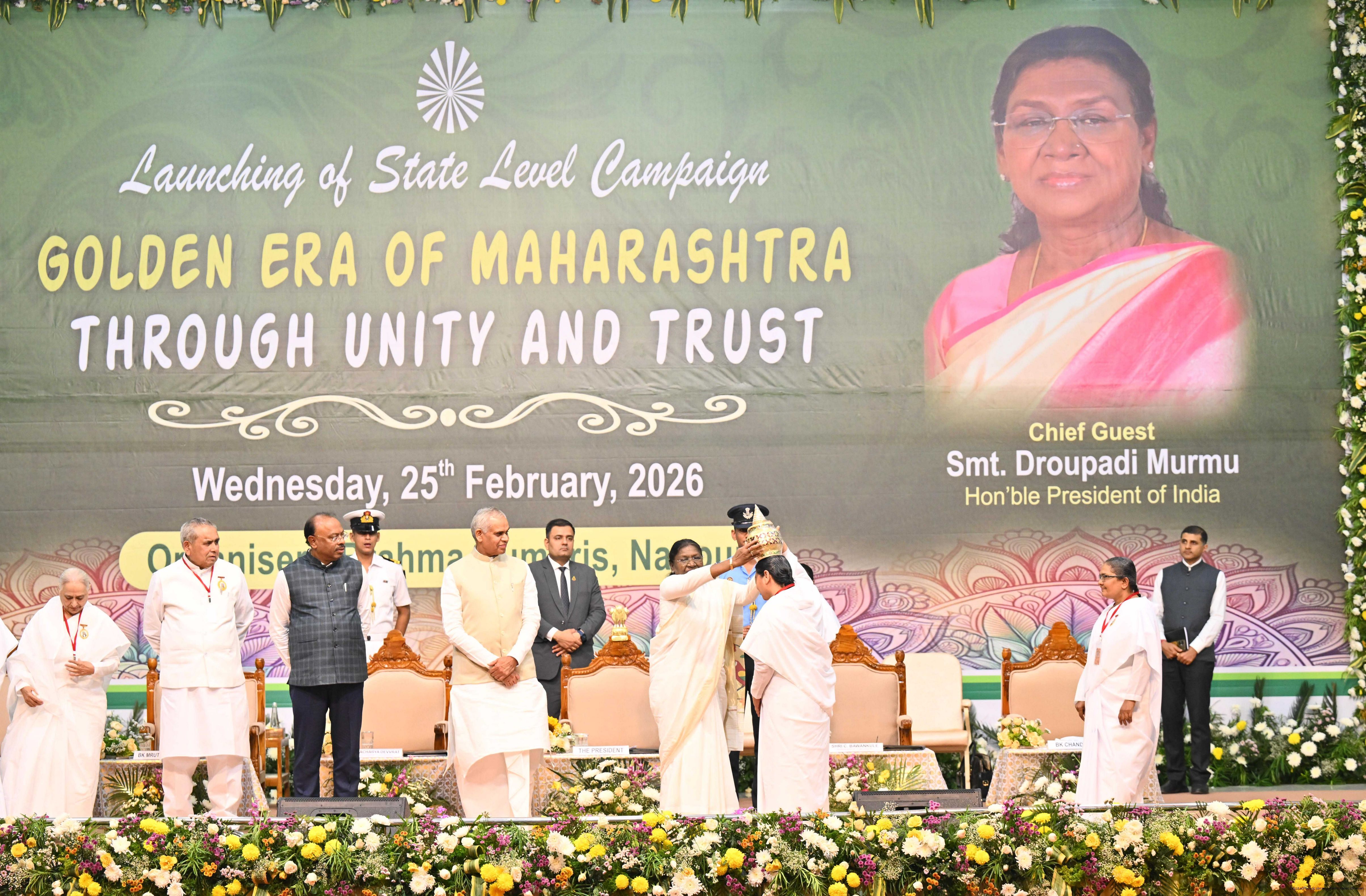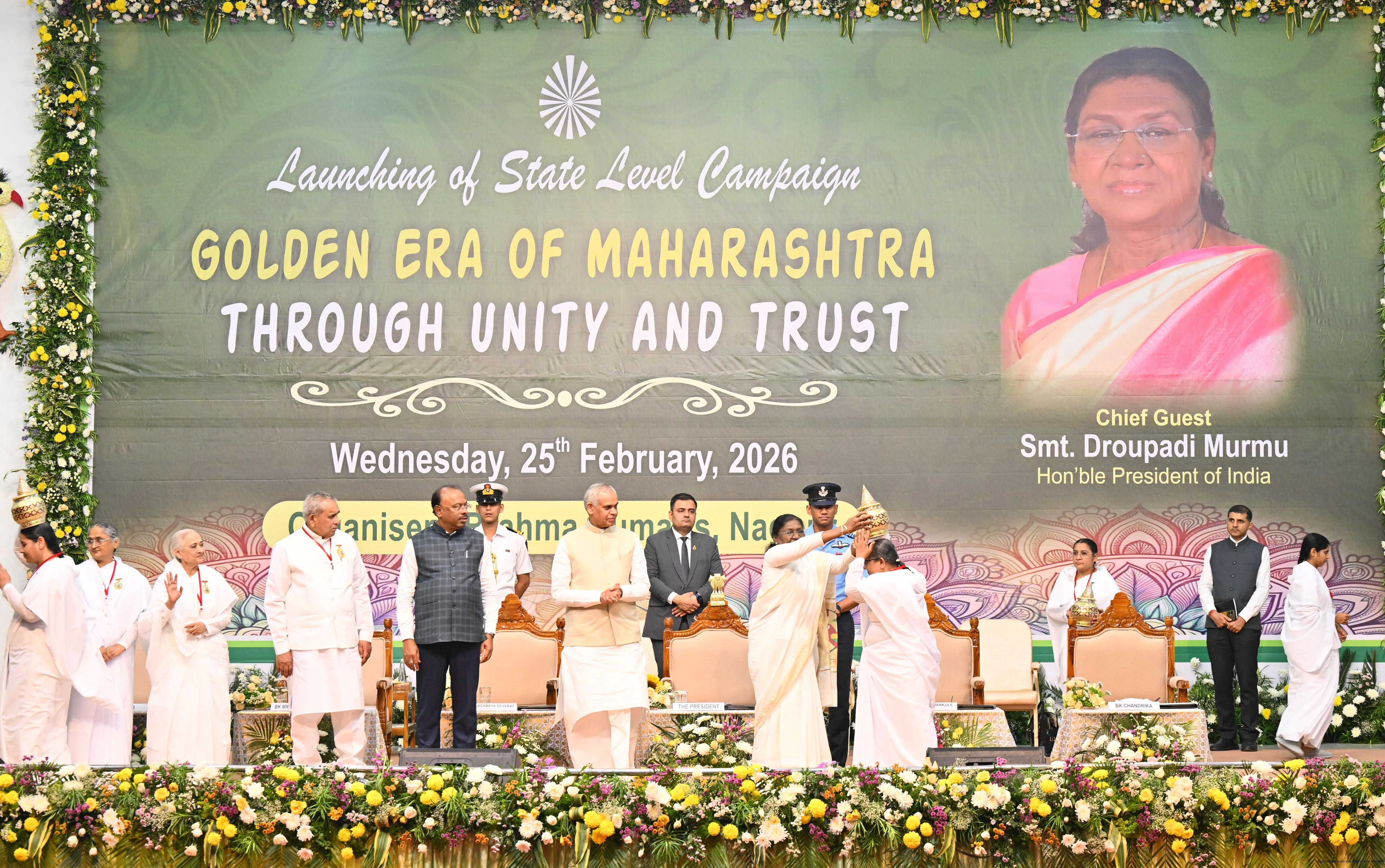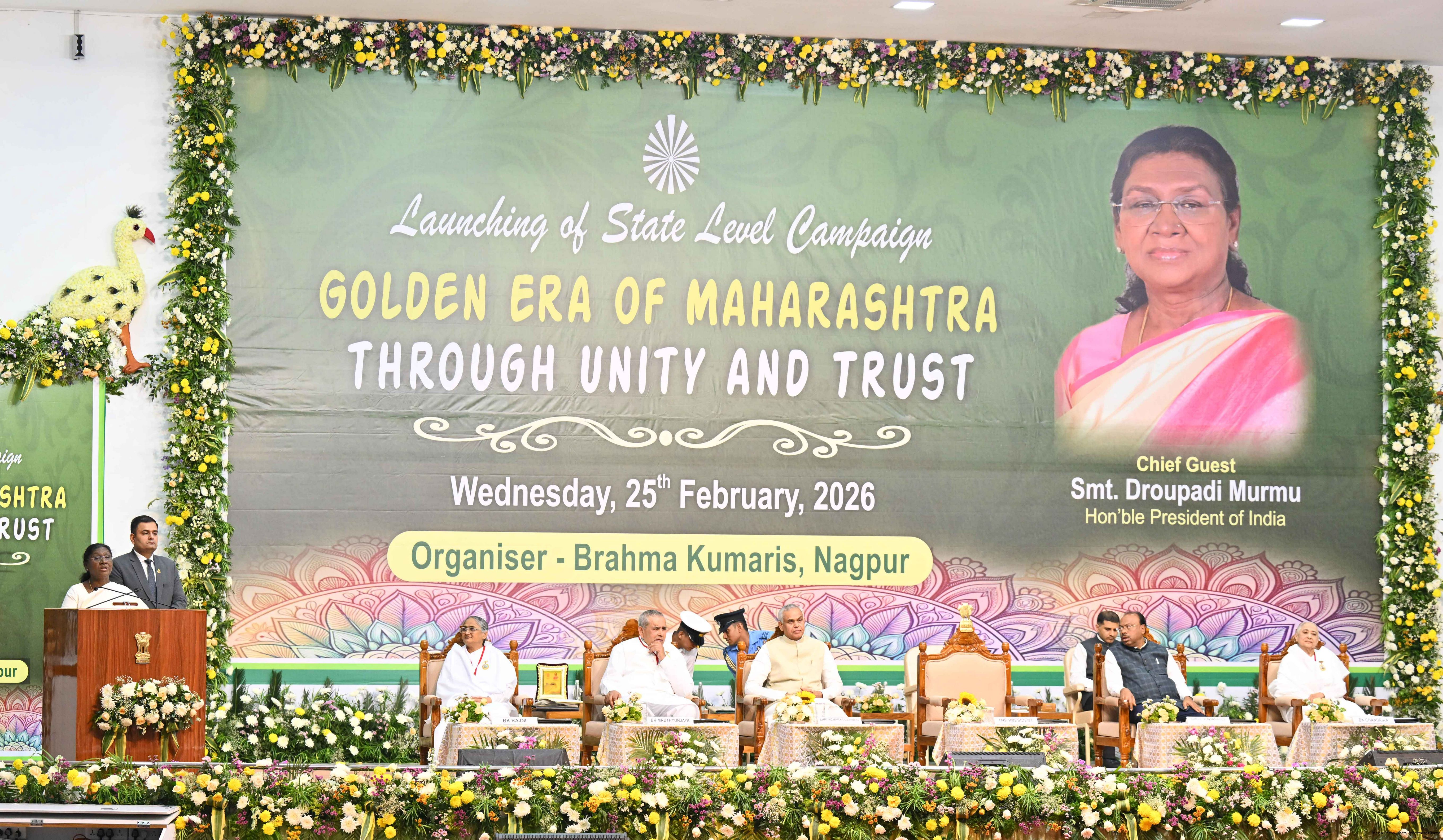 | Caption: | The President of India, Smt Droupadi Murmu graced the state-level launch of ‘Golden Era of Maharashtra through Unity and Trust’, organised by Brahma Kumaris at Vishwa Shanti Sarovar, Nagpur, Maharashtra on February 25, 2026. |