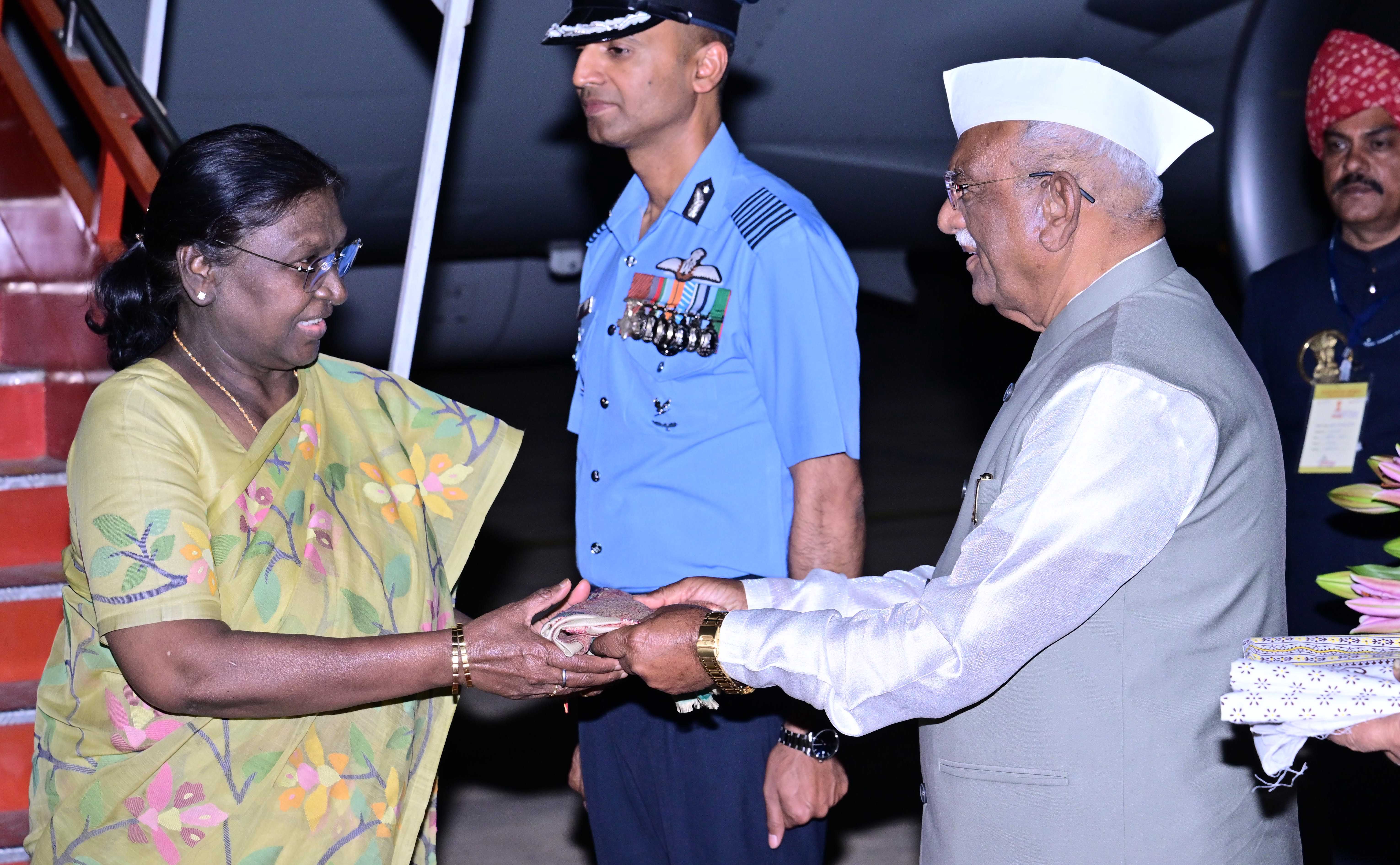 | Caption: | The Governor of Rajasthan, Shri Haribhau Kisanrao Bagde and Chief Minister Shri Bhajanlal Sharma received the President of India, Smt Droupadi Murmu on her arrival at Jaisalmer, Rajasthan on February 26, 2026. |