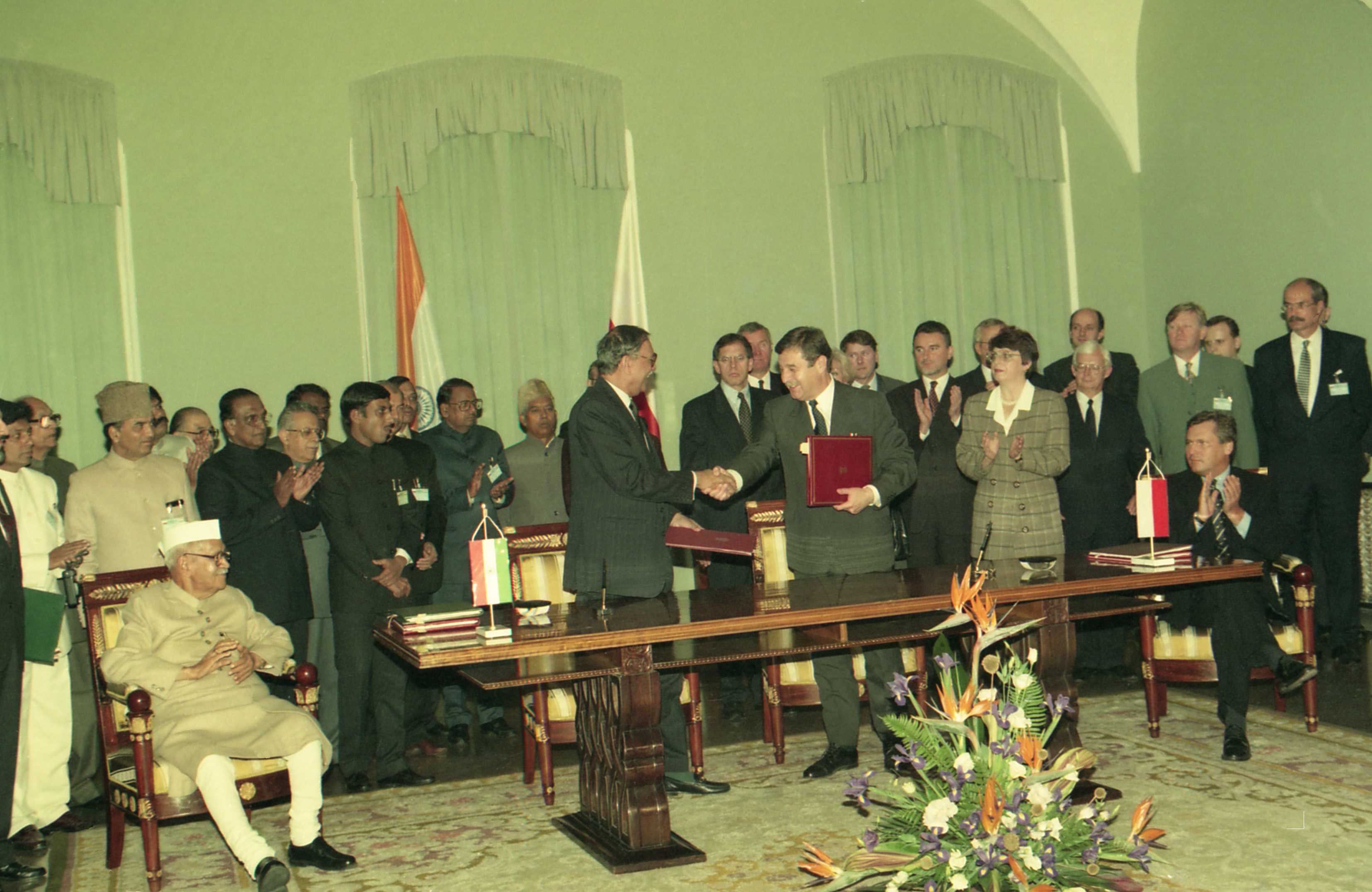 | Caption: | The President of India, Dr. Shankar Dayal Sharma and the Polish President, Mr. Aleksander Kwa?niewski witnessing the signing of Agreements and delivering Joint Statement to Press, at Presidential Palace, Warsaw, in Poland on October 07, 1996. |