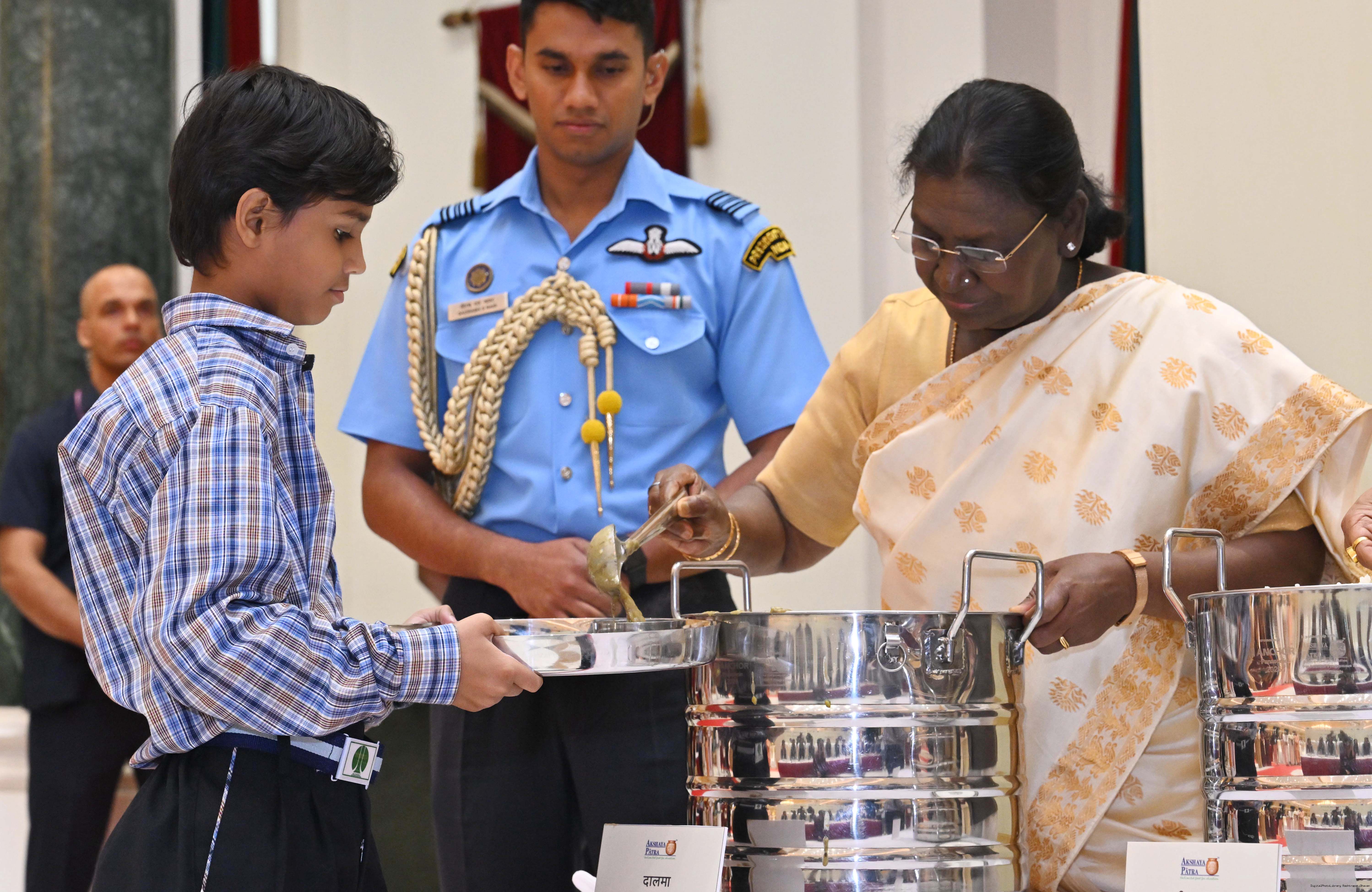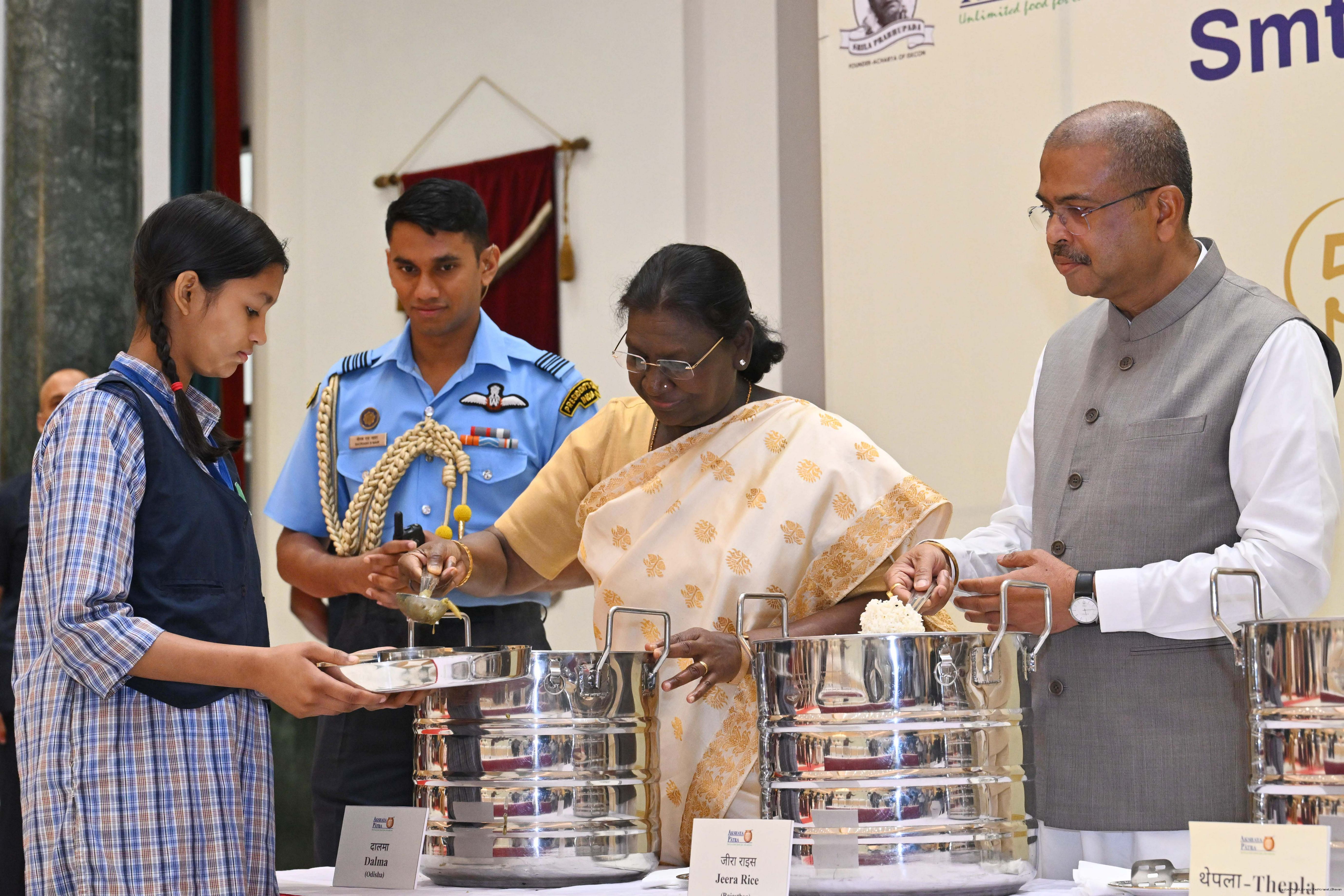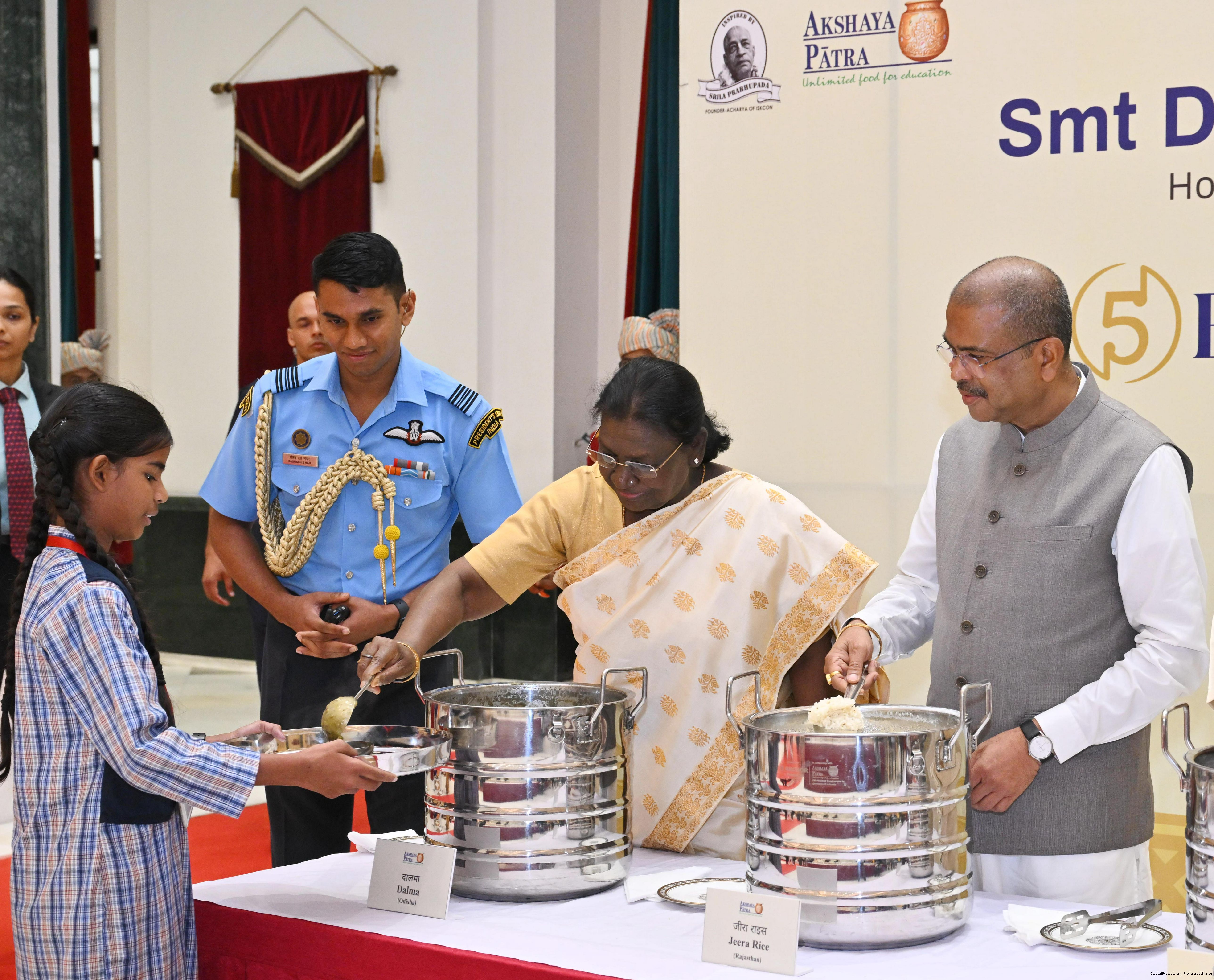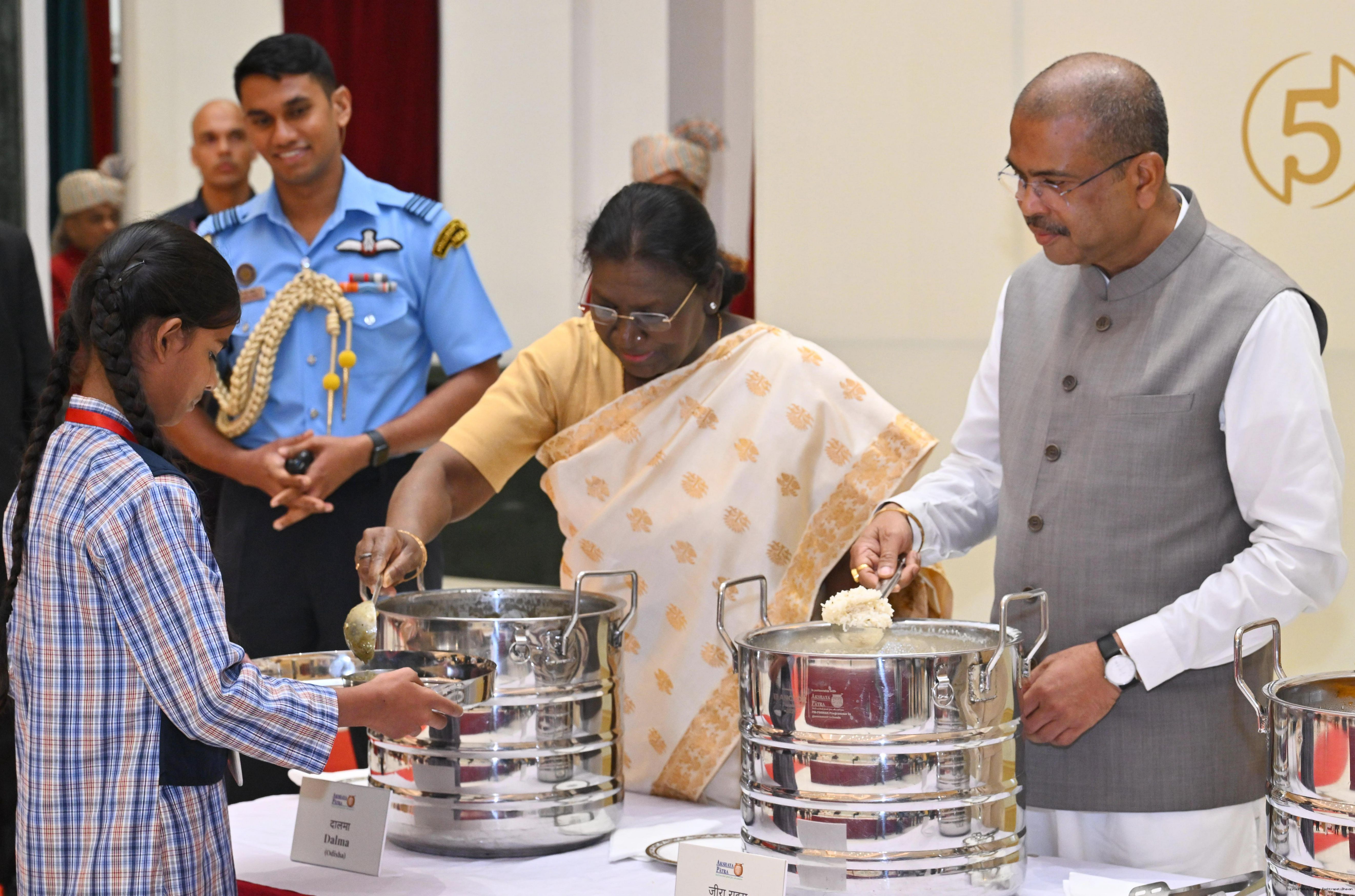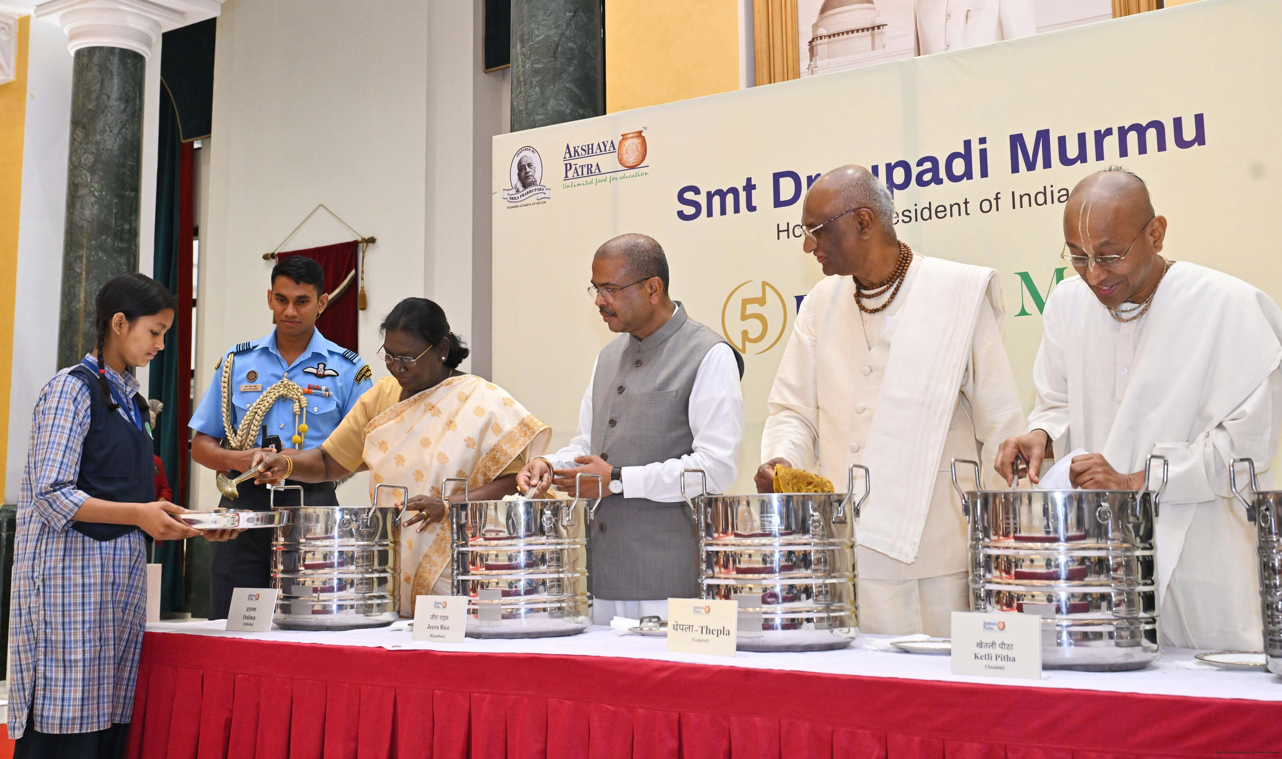 | Caption: | The President of India Smt Droupadi Murmu graced an event to commemorate the five billion meals of Akshaya Patra Foundation at Rashtrapati Bhavan Cultural Centre on March 17, 2026. |