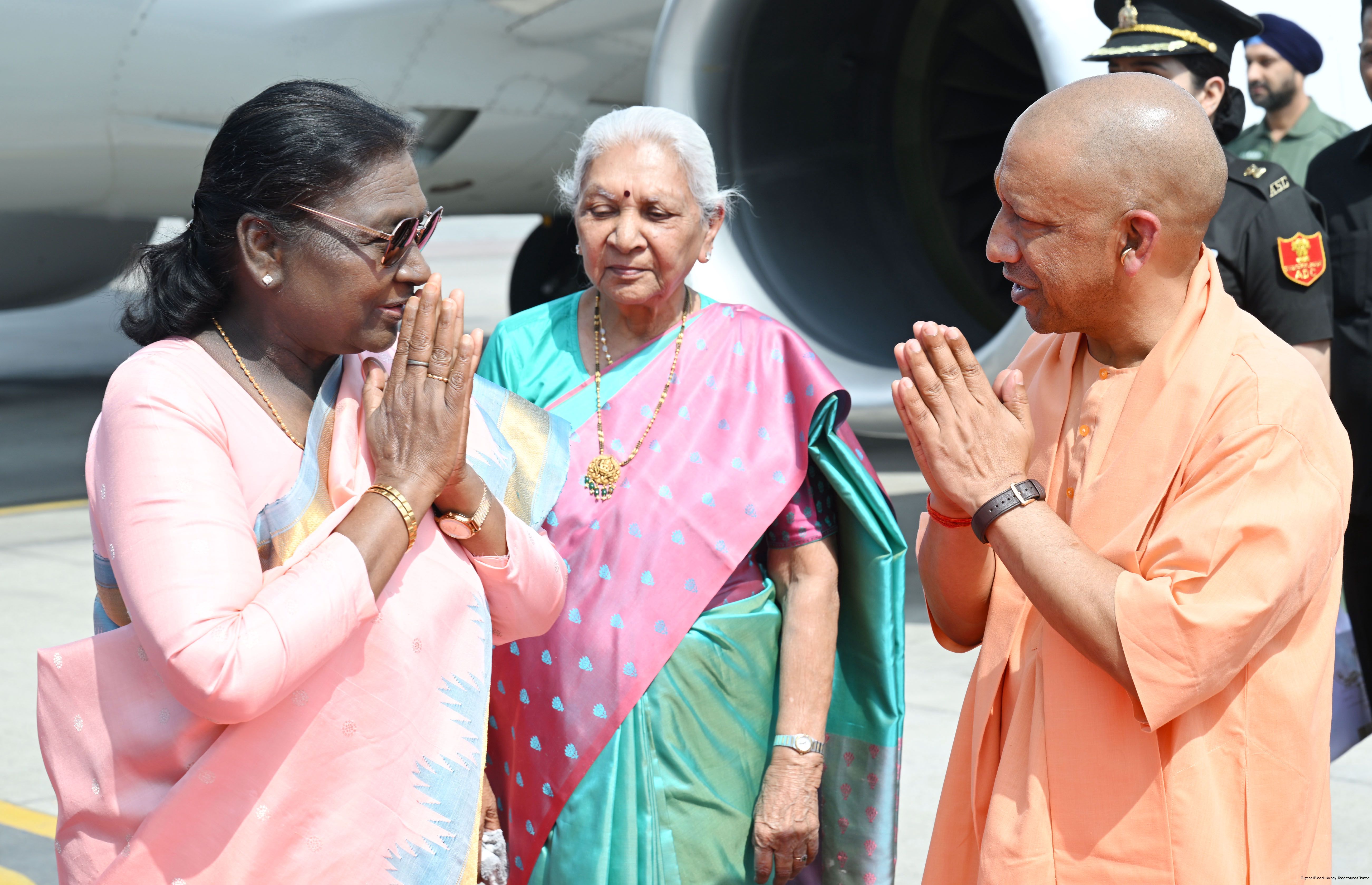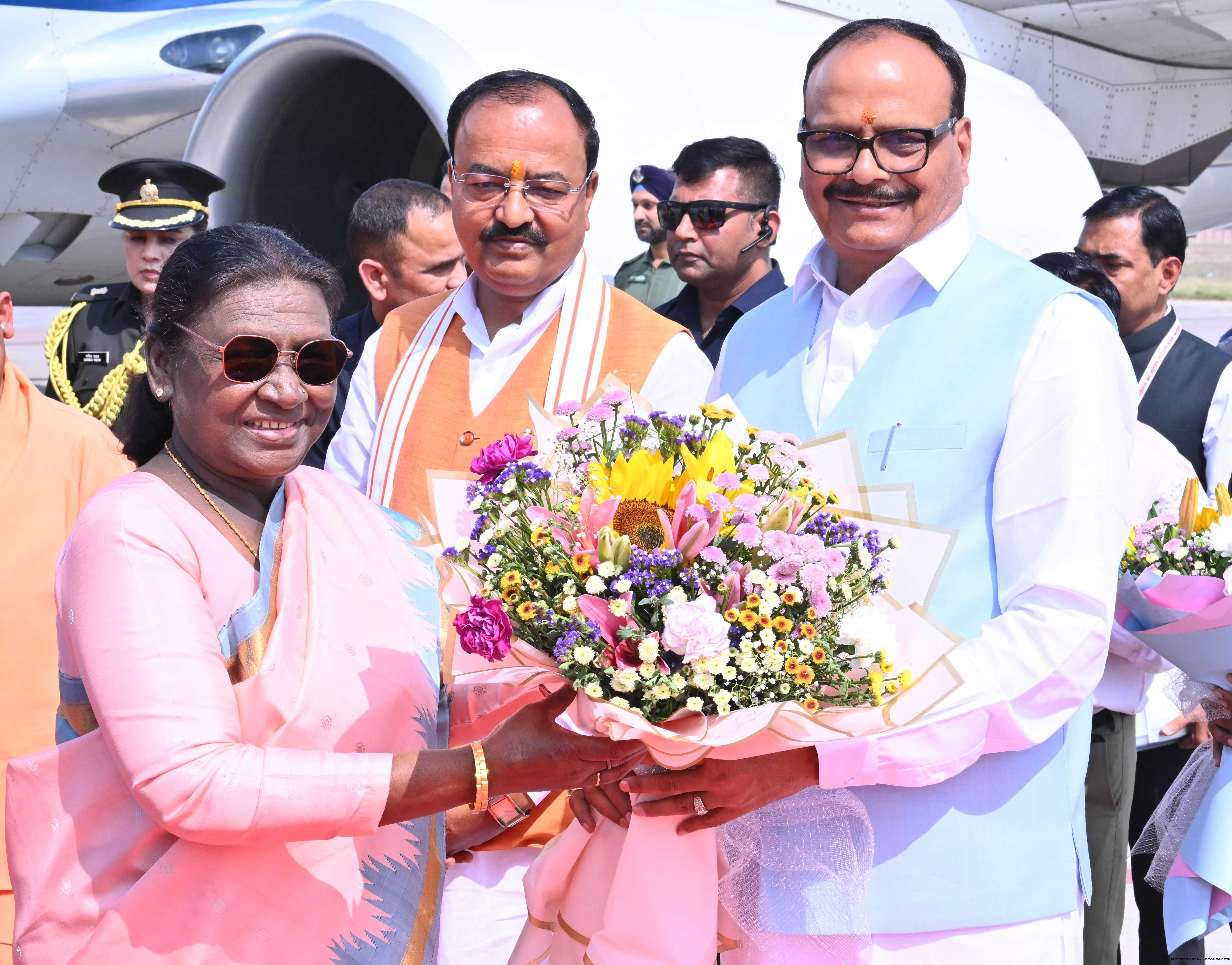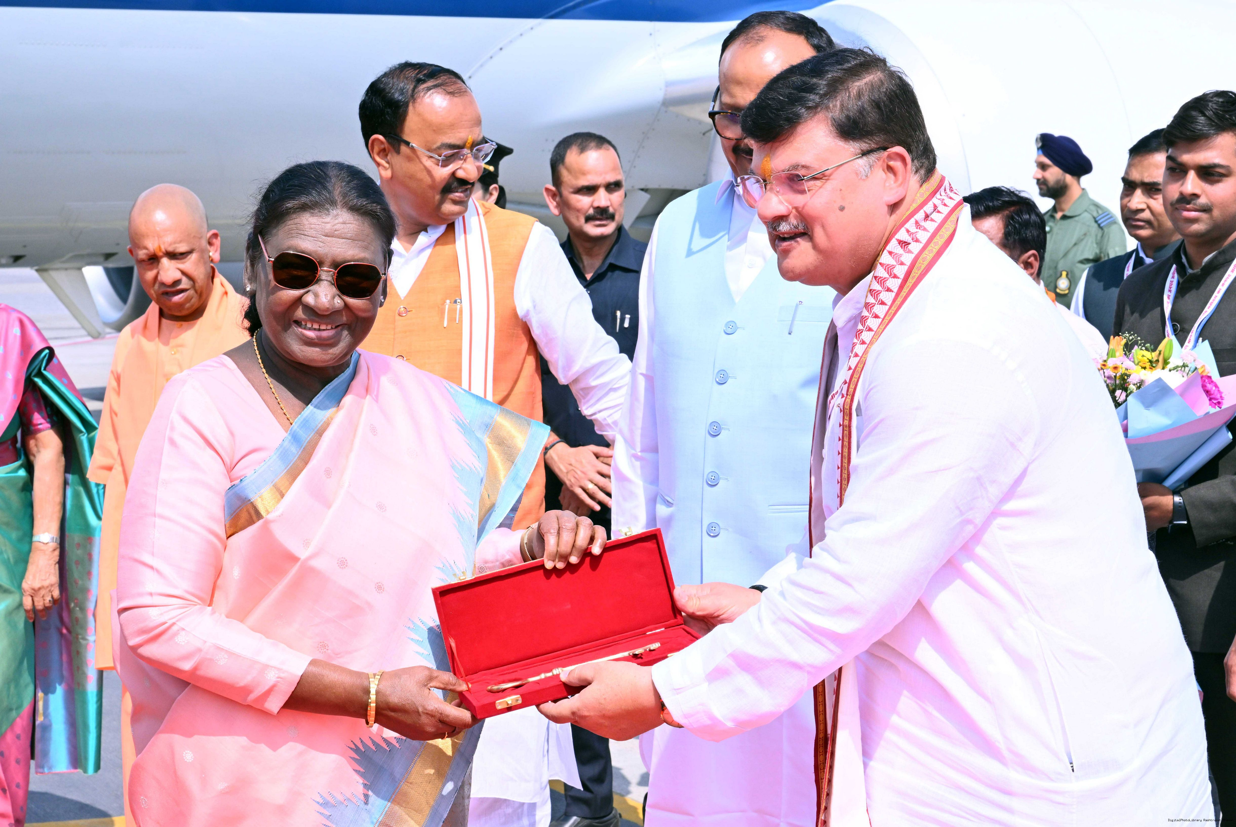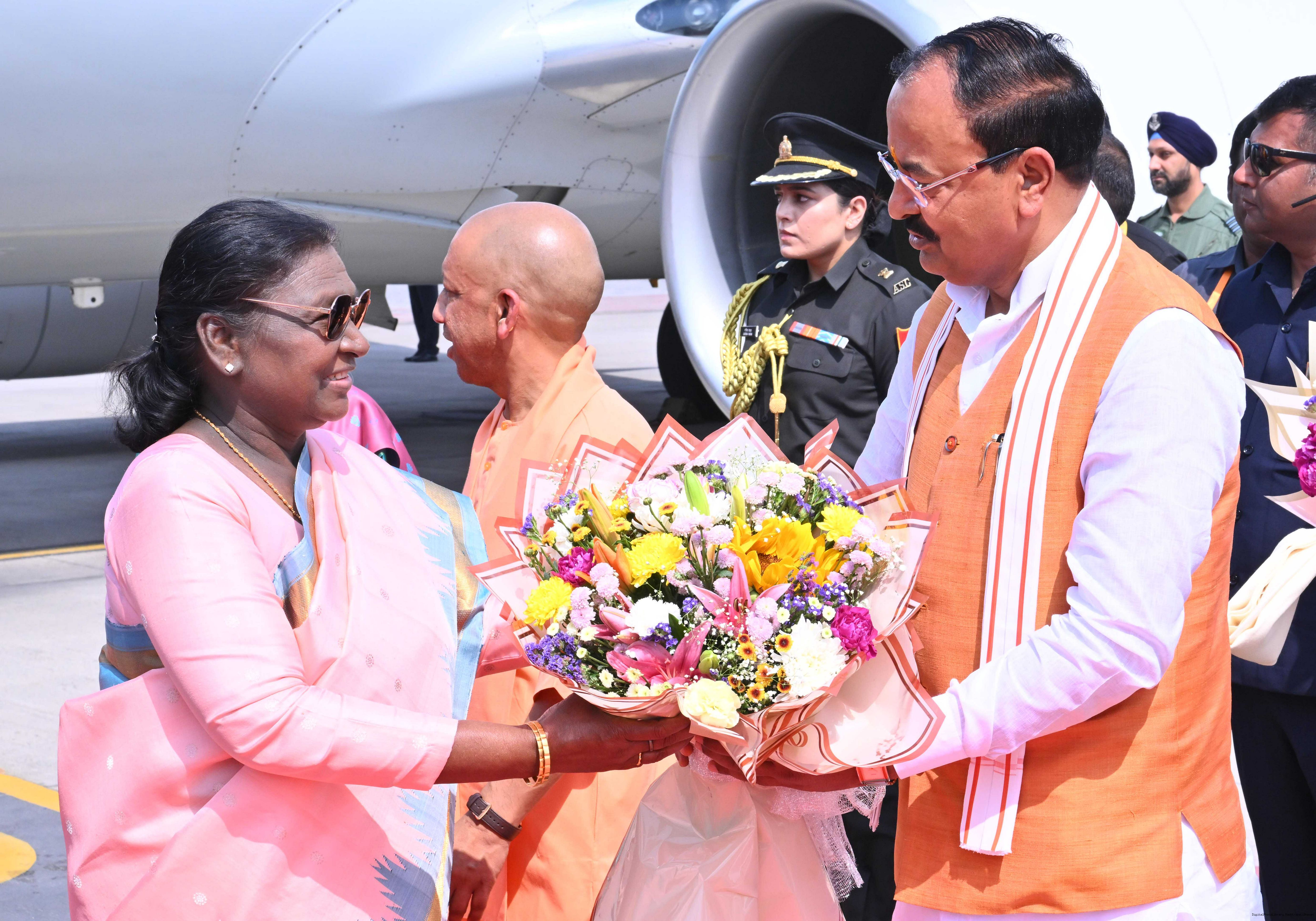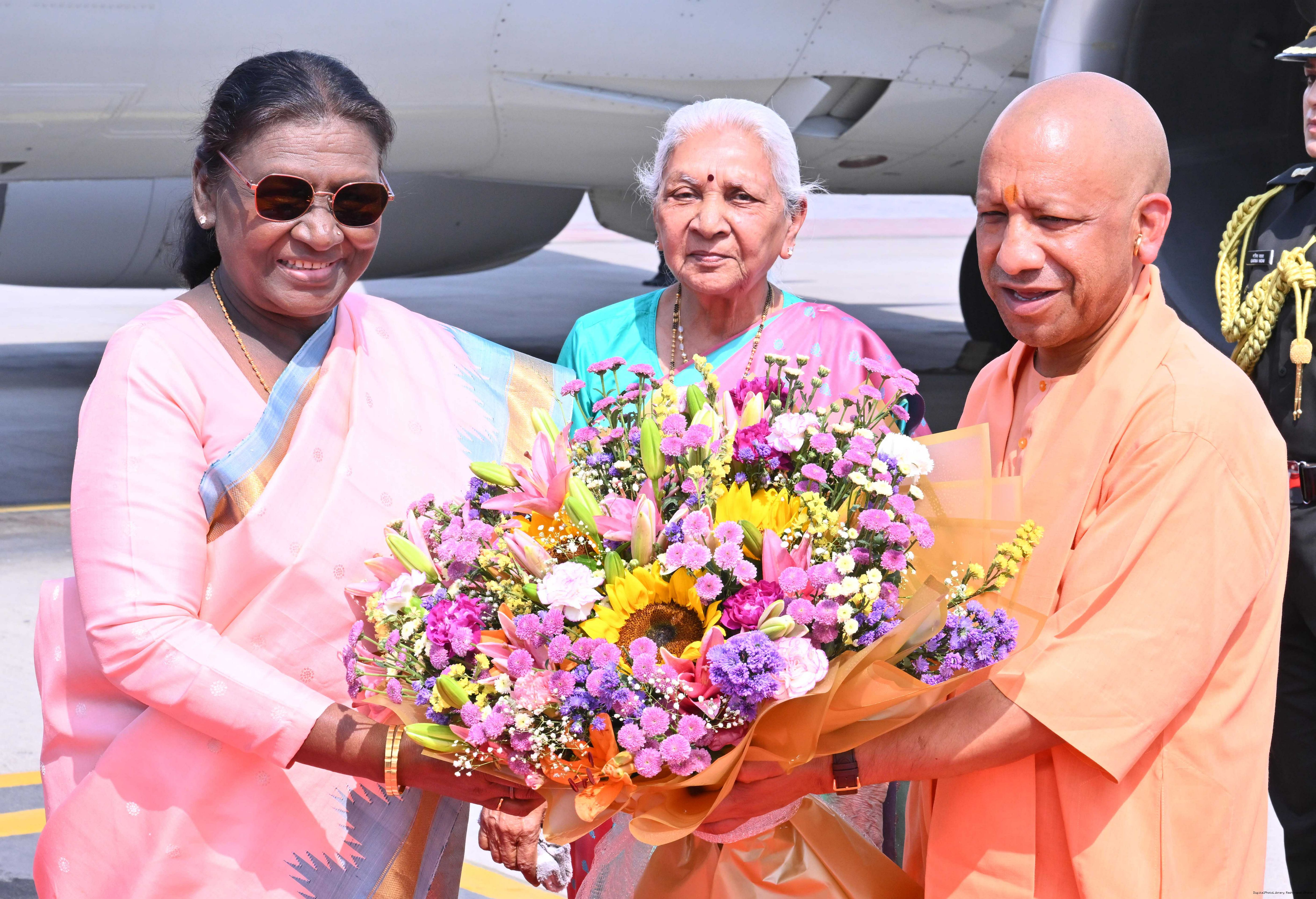 | Caption: | The Governor of Uttar Pradesh, Smt Anandiben Patel, Chief Minister Yogi Adityanath and Deputy Chief Ministers Shri Keshav Prasad Maurya and Shri Brajesh Pathak received the President of India, Smt Droupadi Murmu on her arrival at Ayodhya on March 19, 2026. |