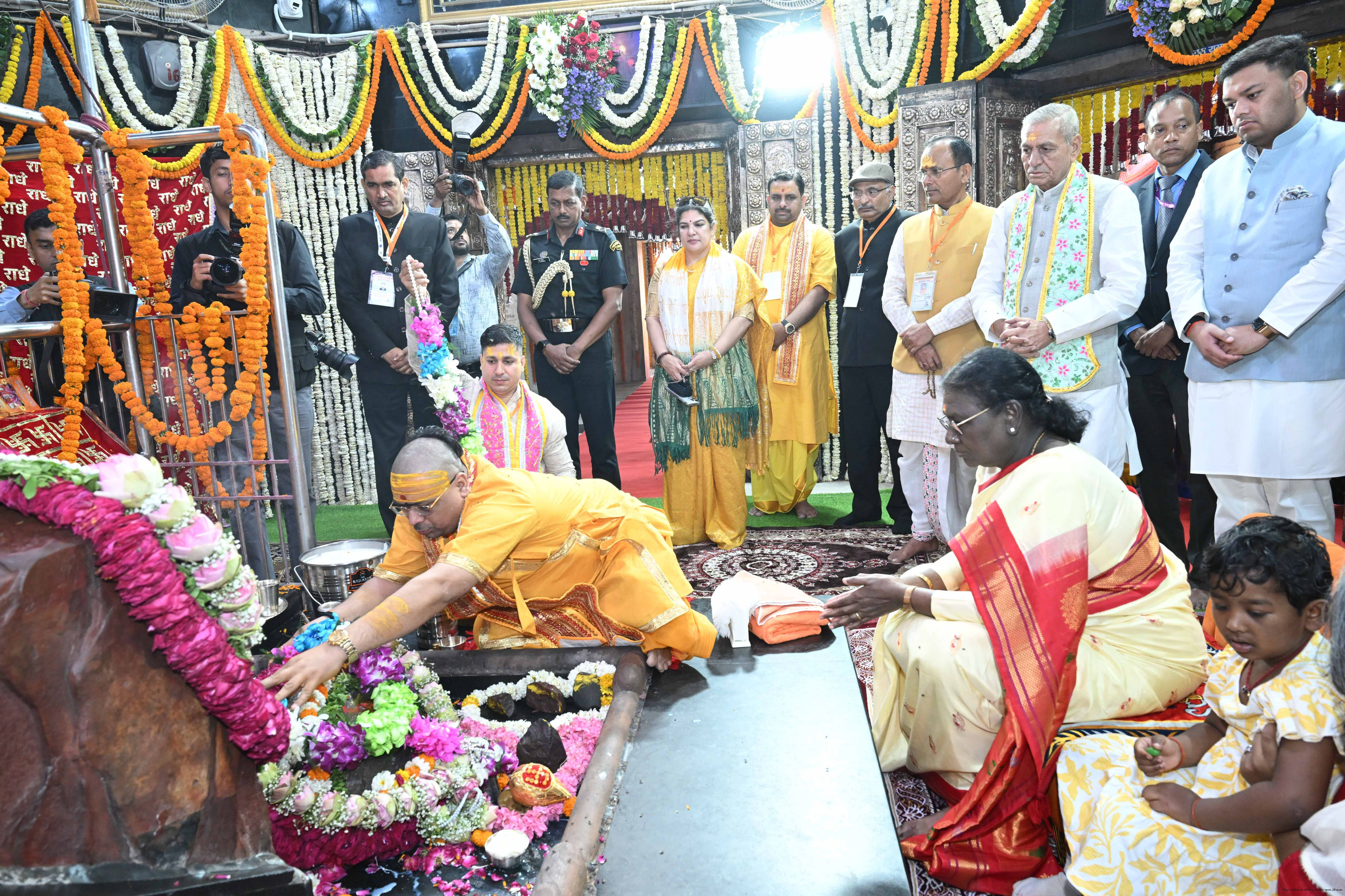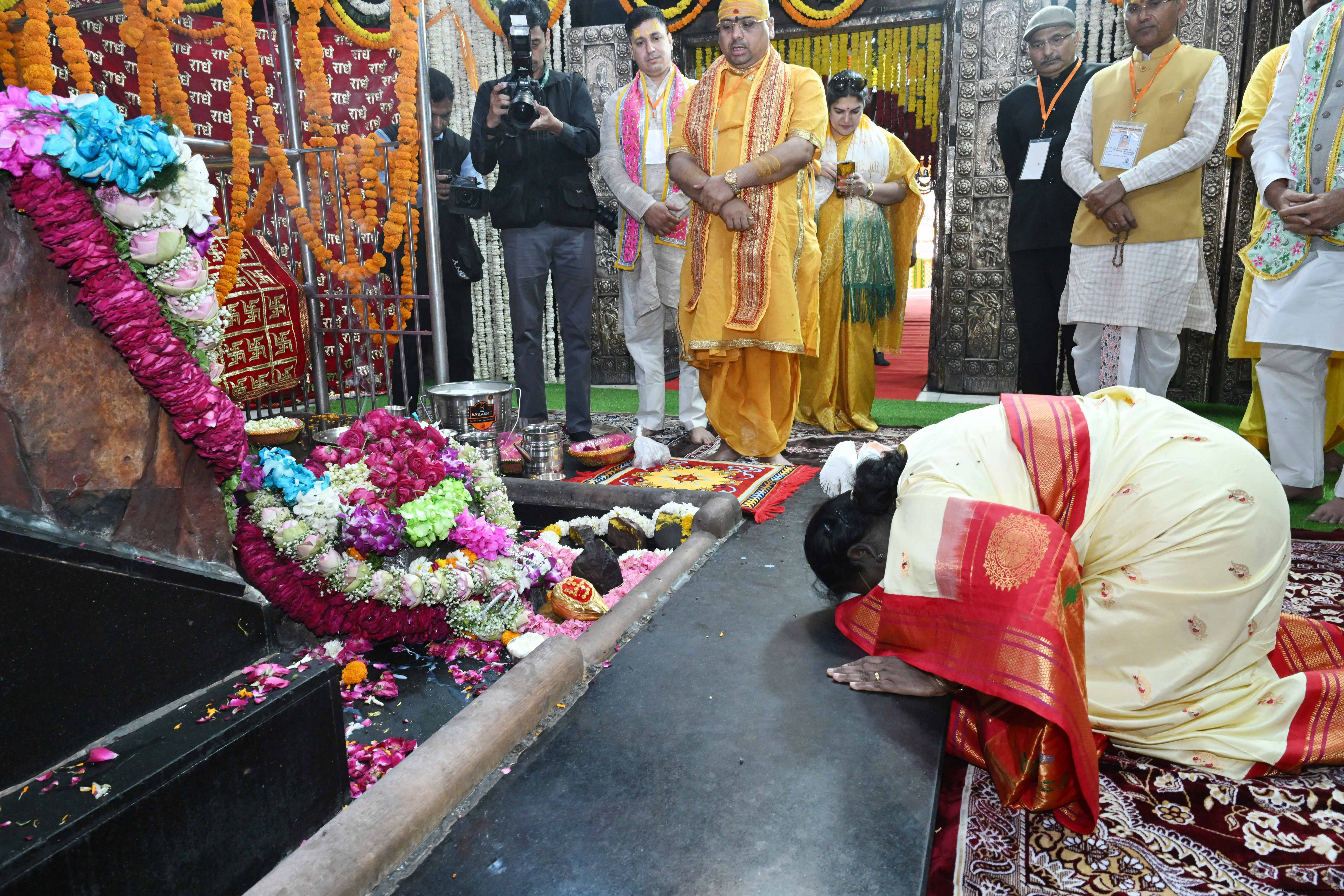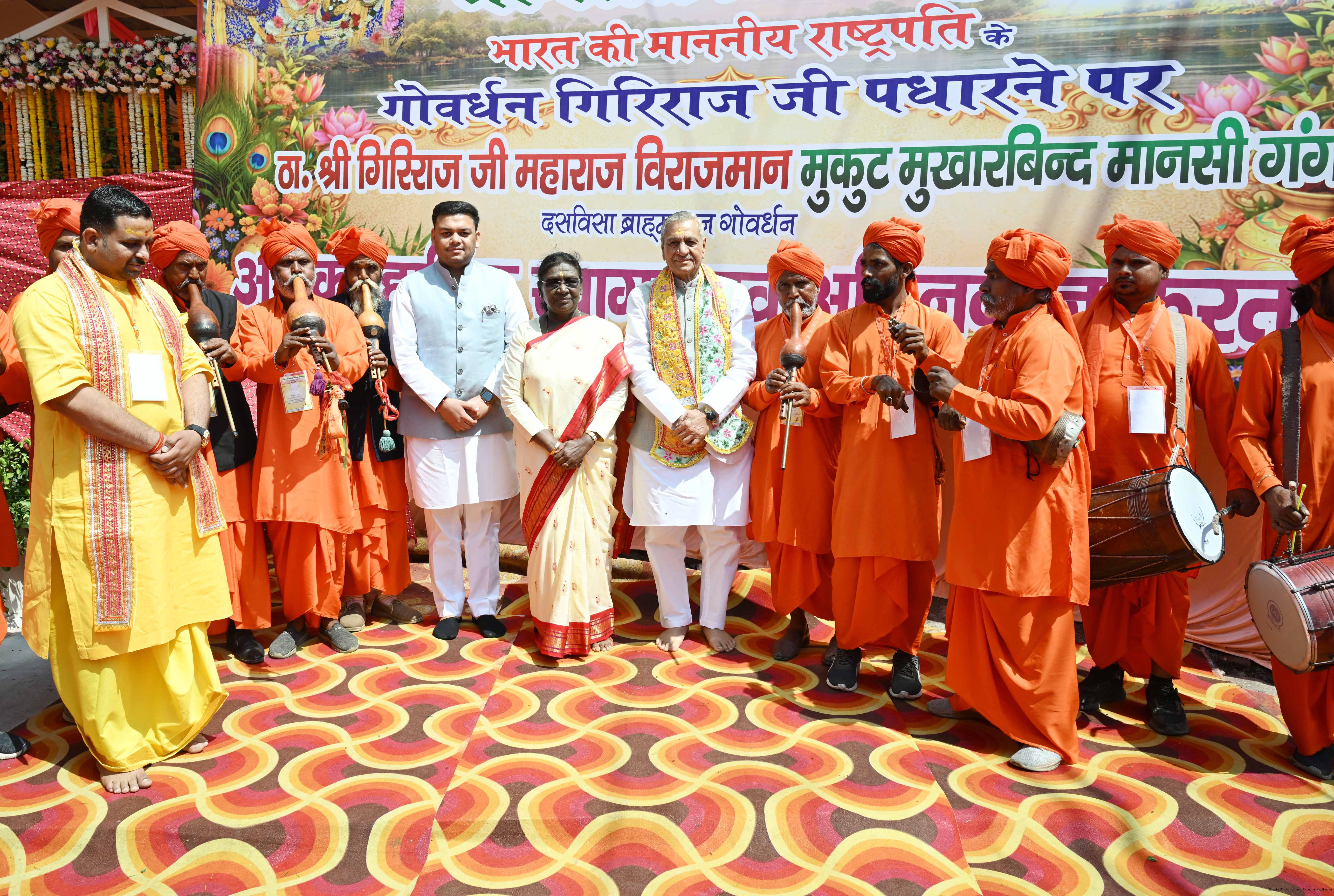 | Caption: | The President of India, Smt Droupadi Murmu had darshan and performed aarti at the Danghati Temple in Mathura and undertook the sacred Govardhan Parikrama on March 21, 2026. |