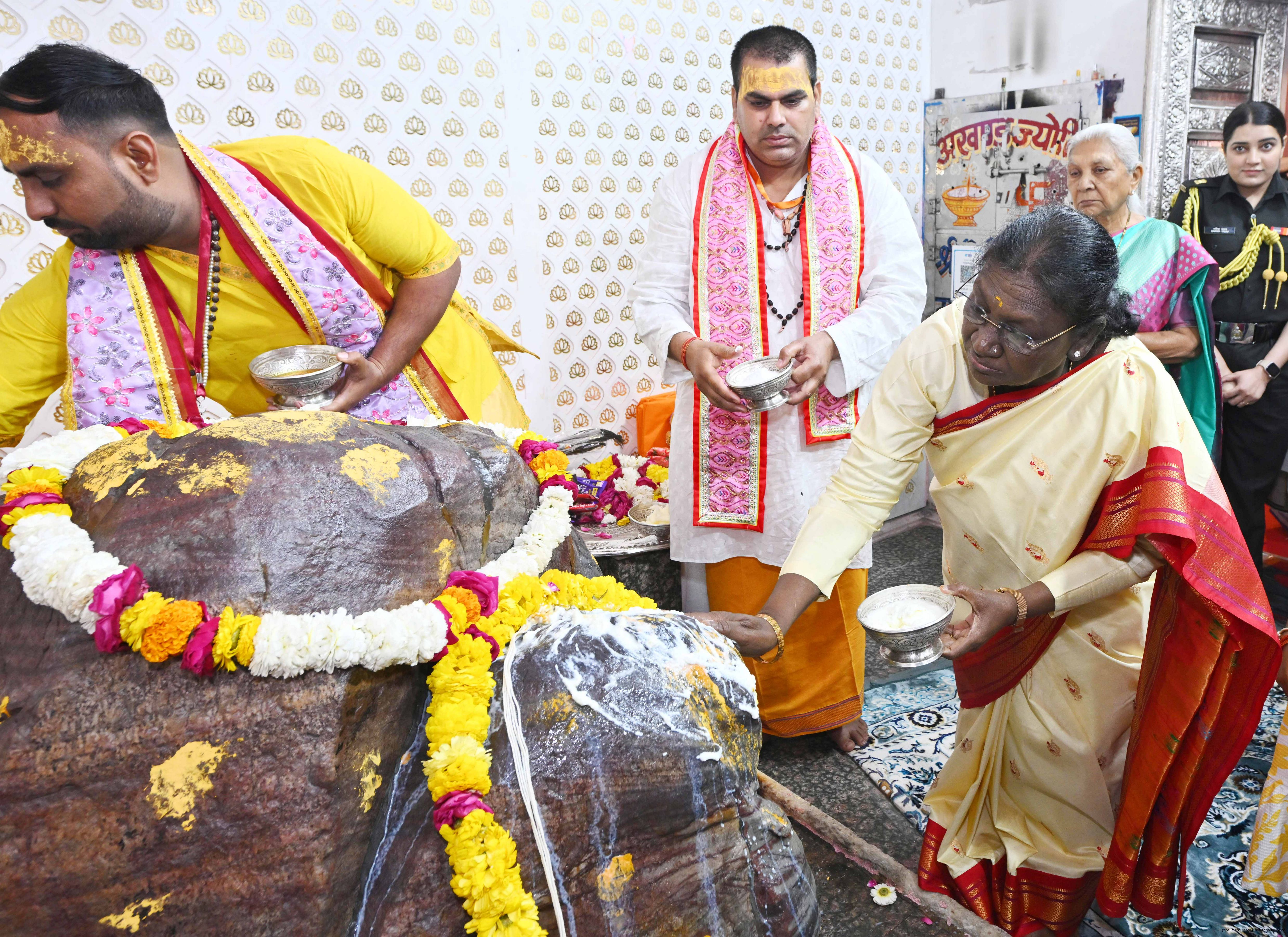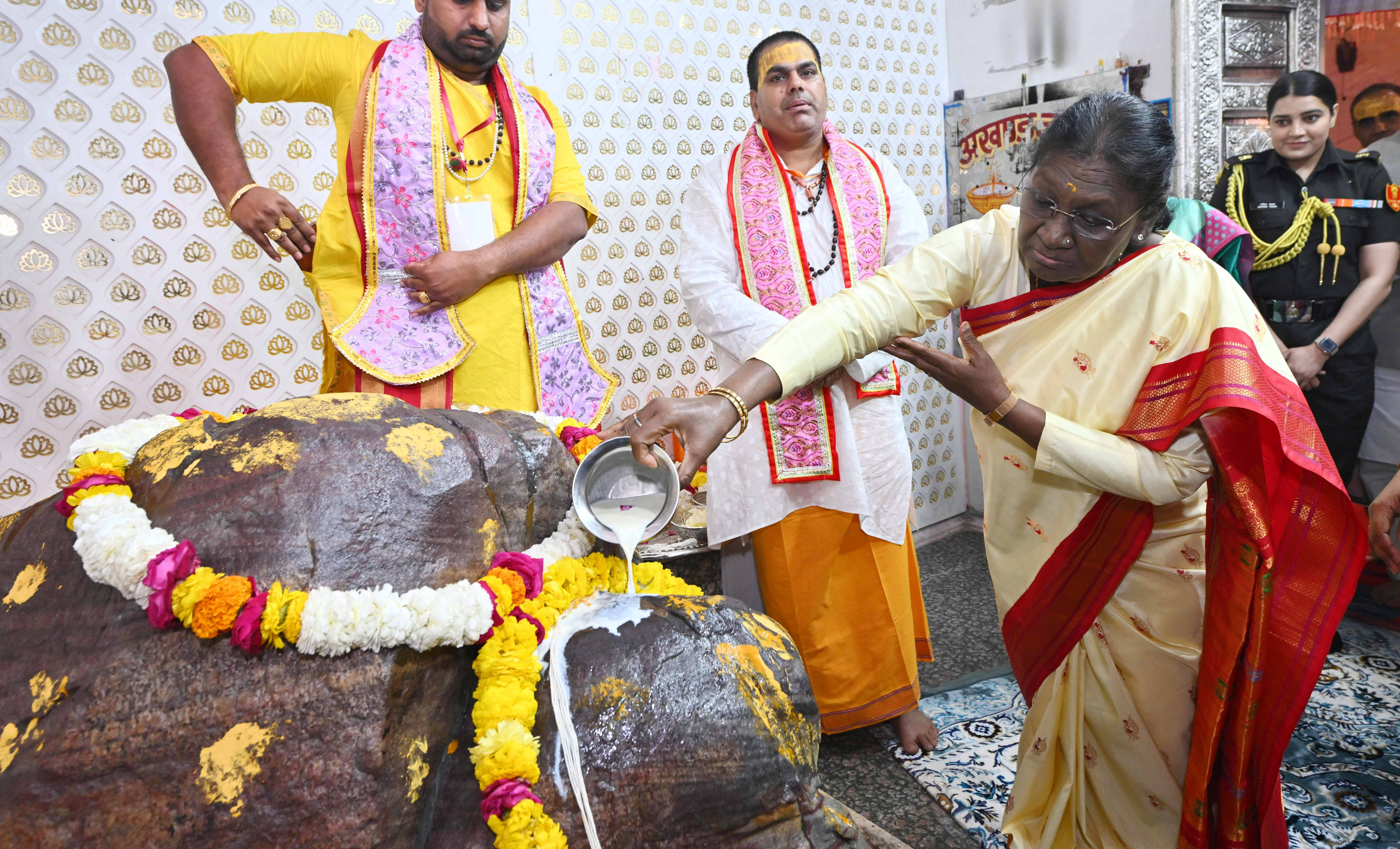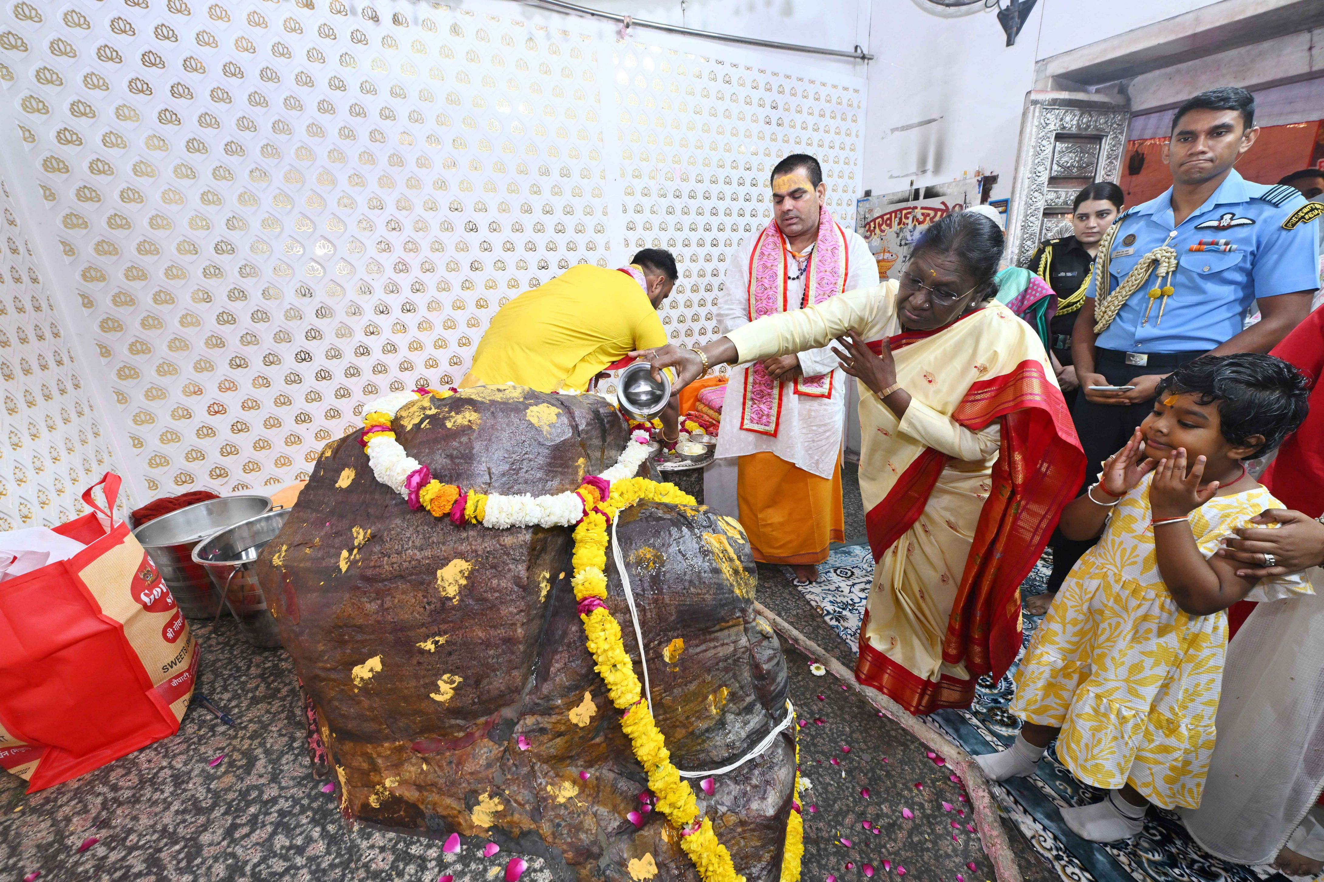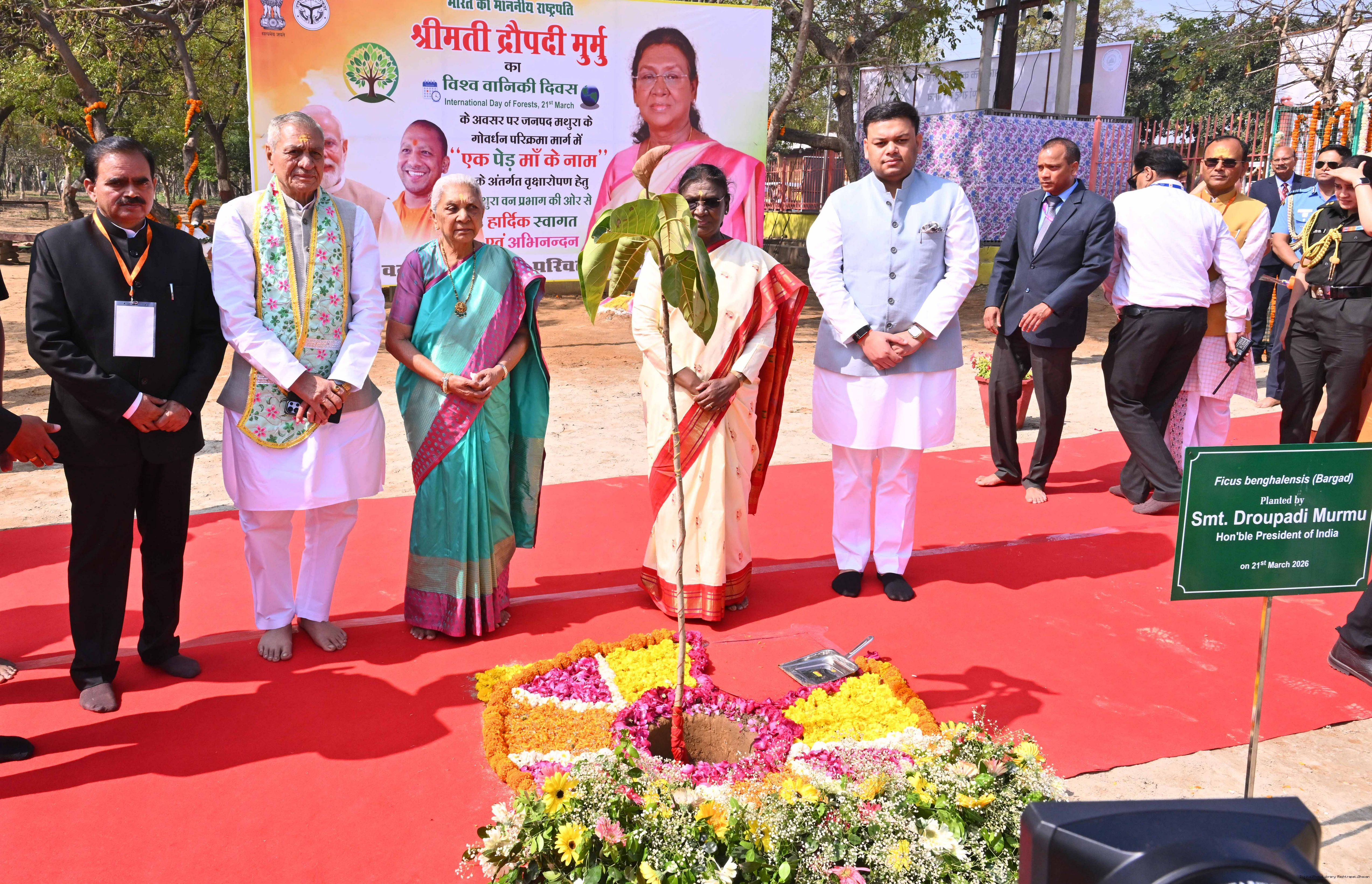 | Caption: | The President of India, Smt Droupadi Murmu had darshan and performed aarti at the Danghati Temple in Mathura and undertook the sacred Govardhan Parikrama on March 21, 2026. |