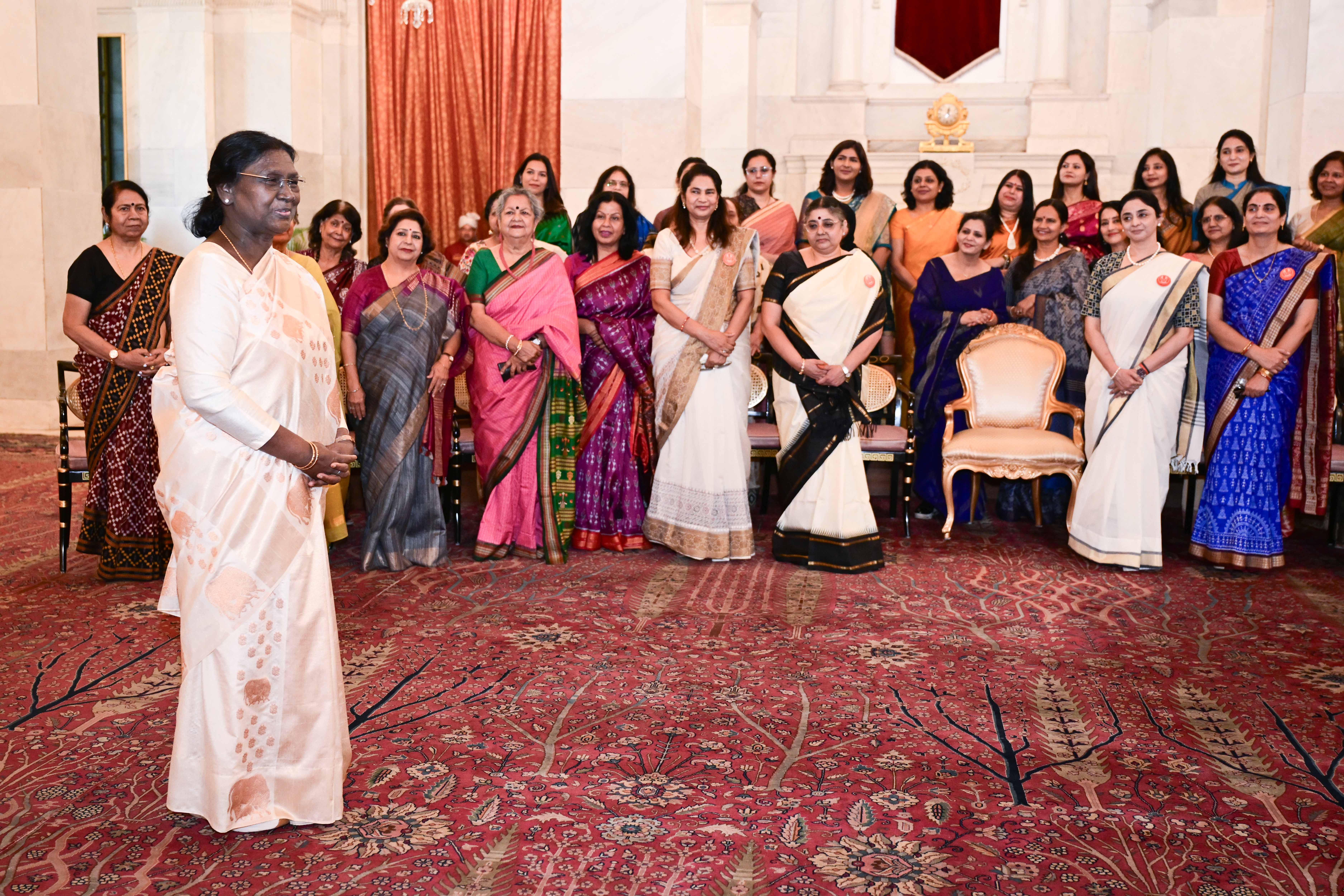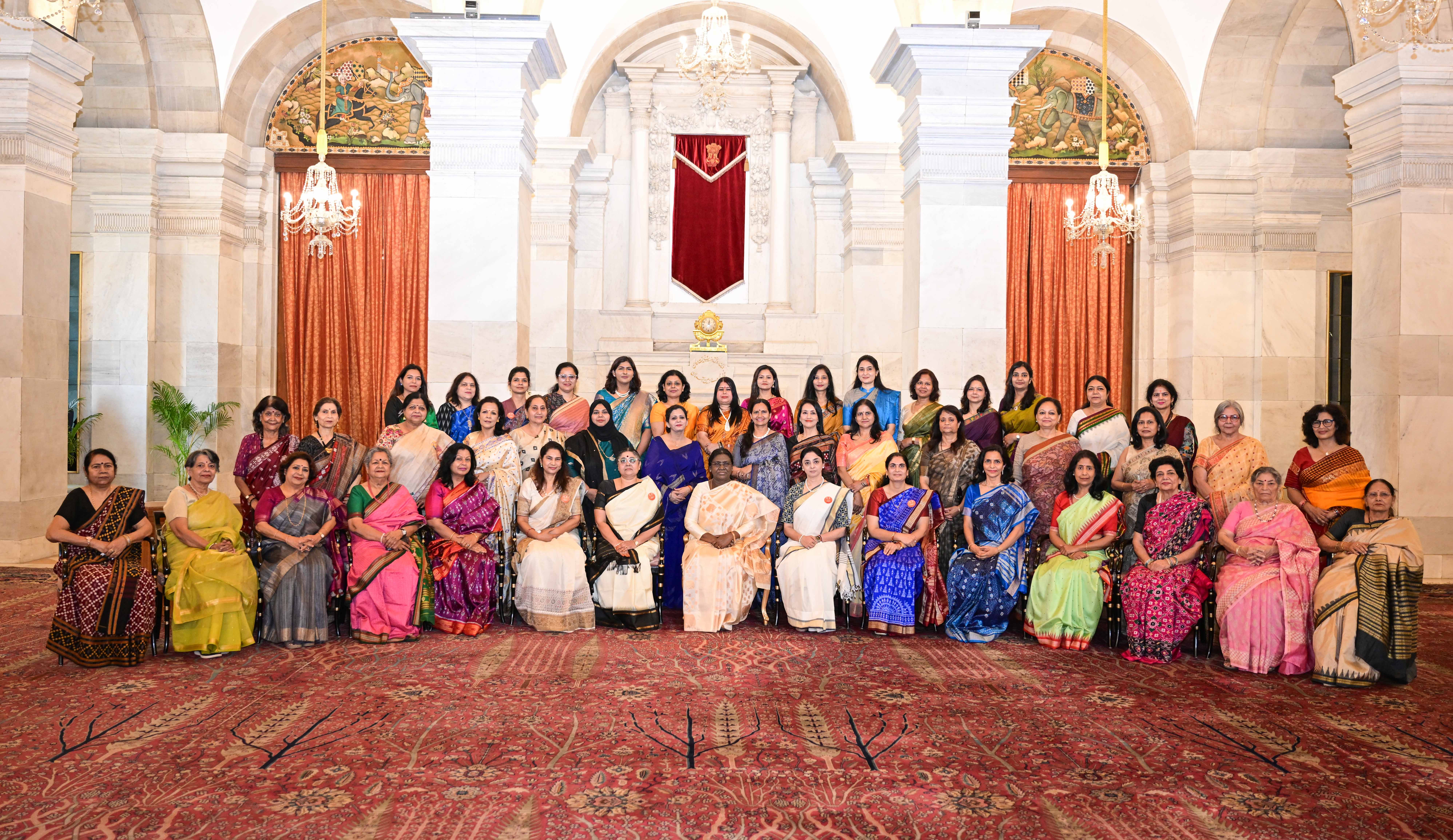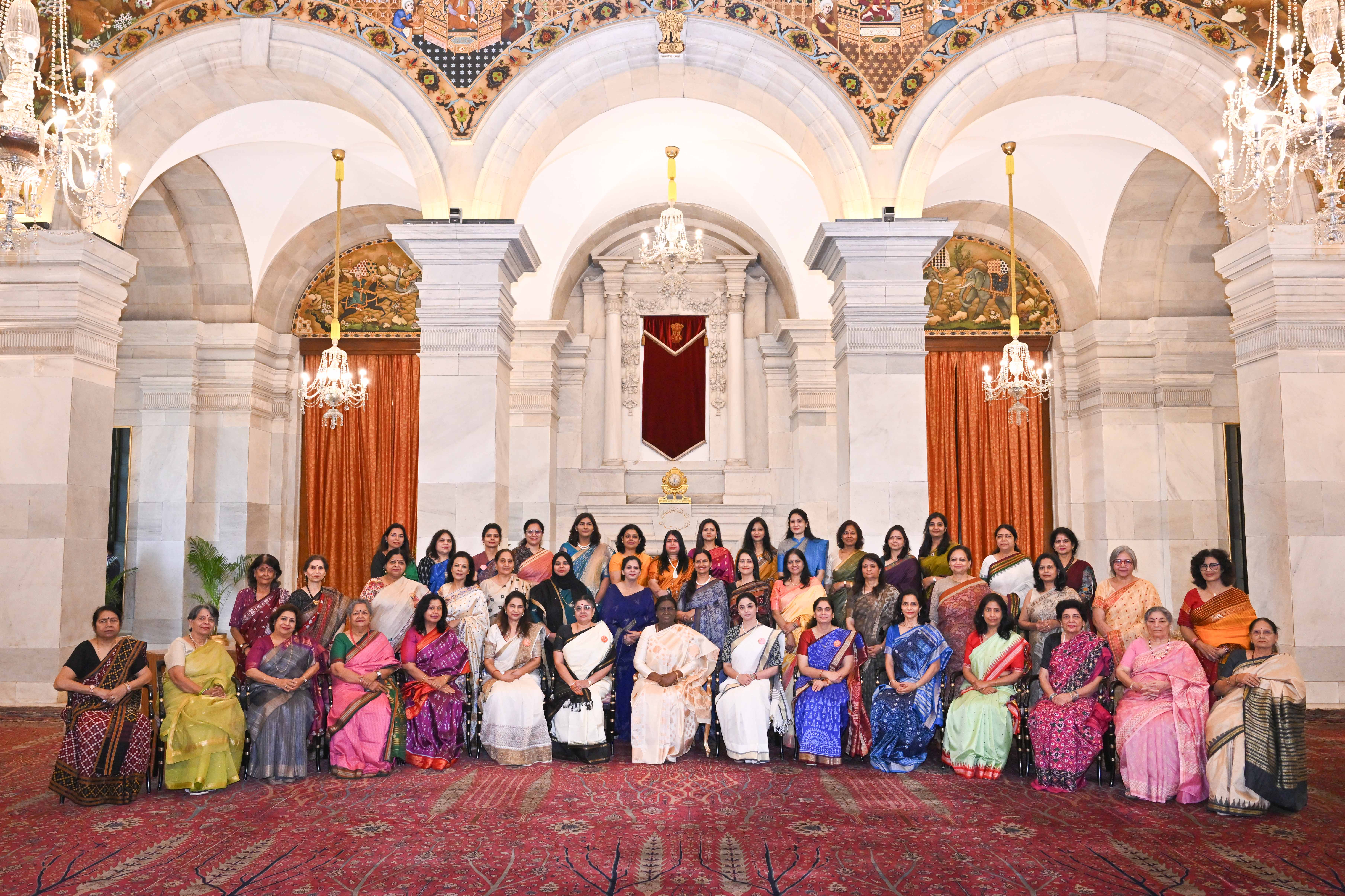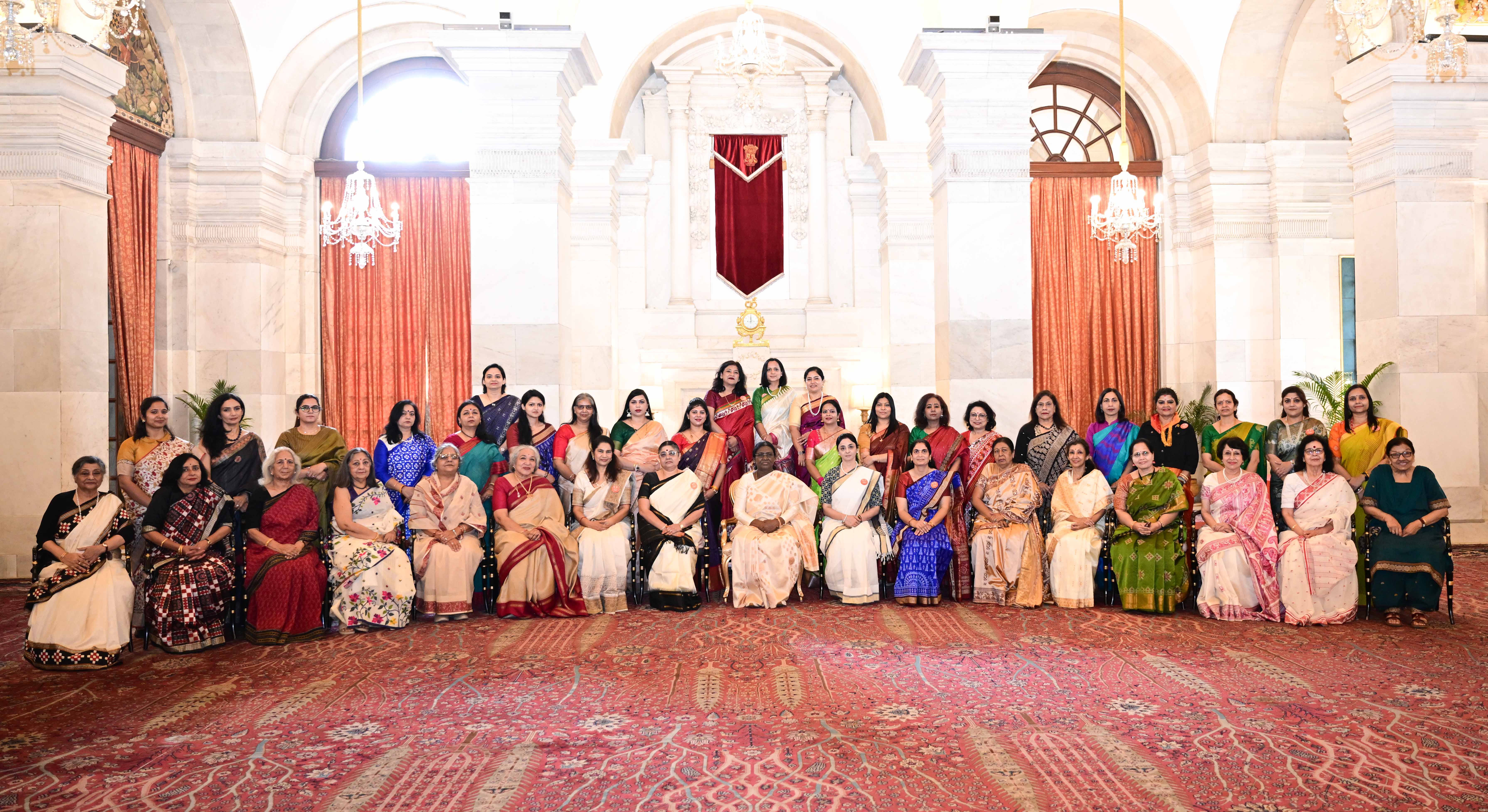 | Caption: | The President of India, Smt Droupadi Murmu met and interacted a group photograph with Ms. Hema Somanathan, President IAS Officers Wives Association along with 177 other members of the Association at Rashtrapati Bhavan on March 24, 2026. |