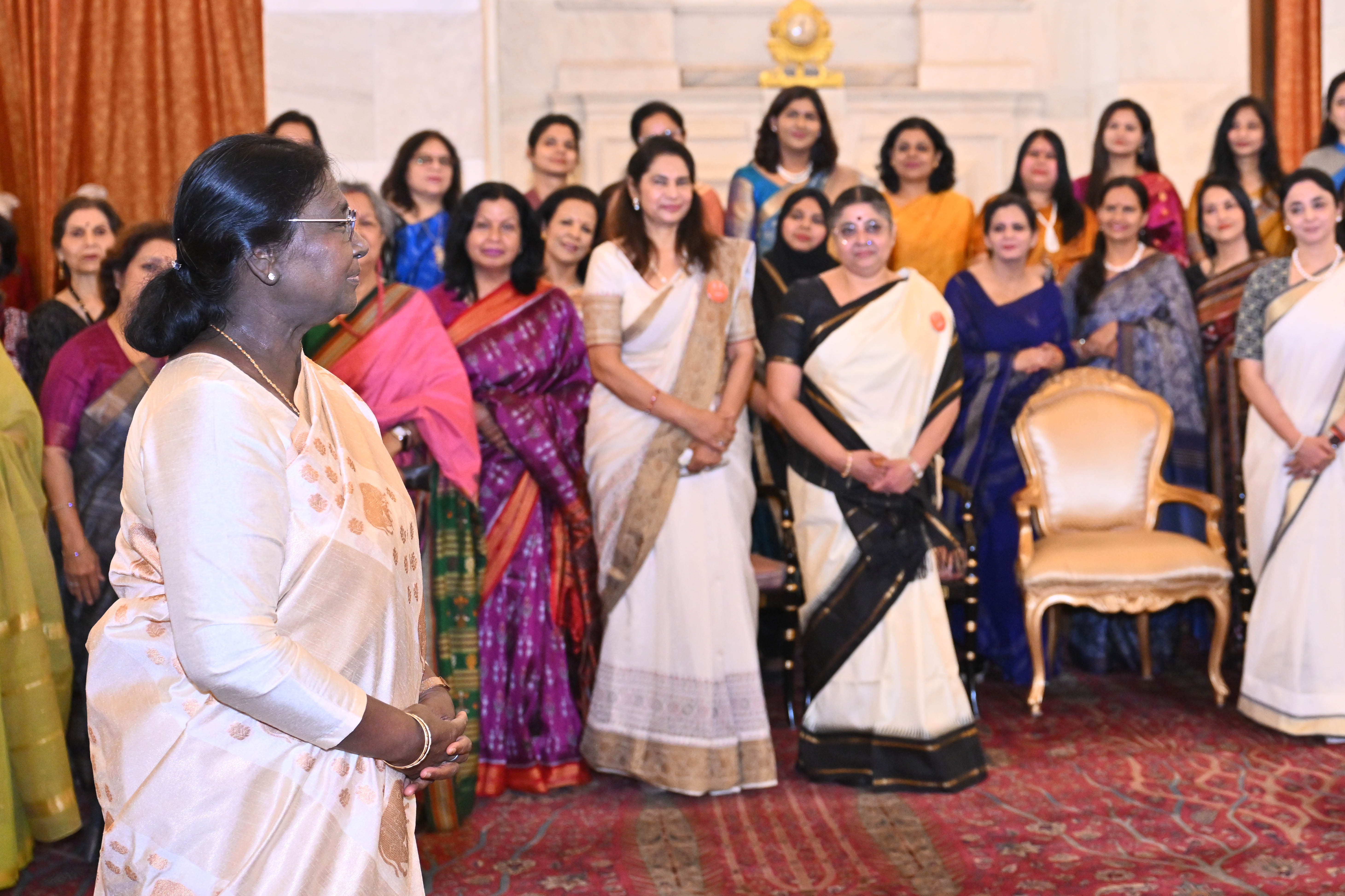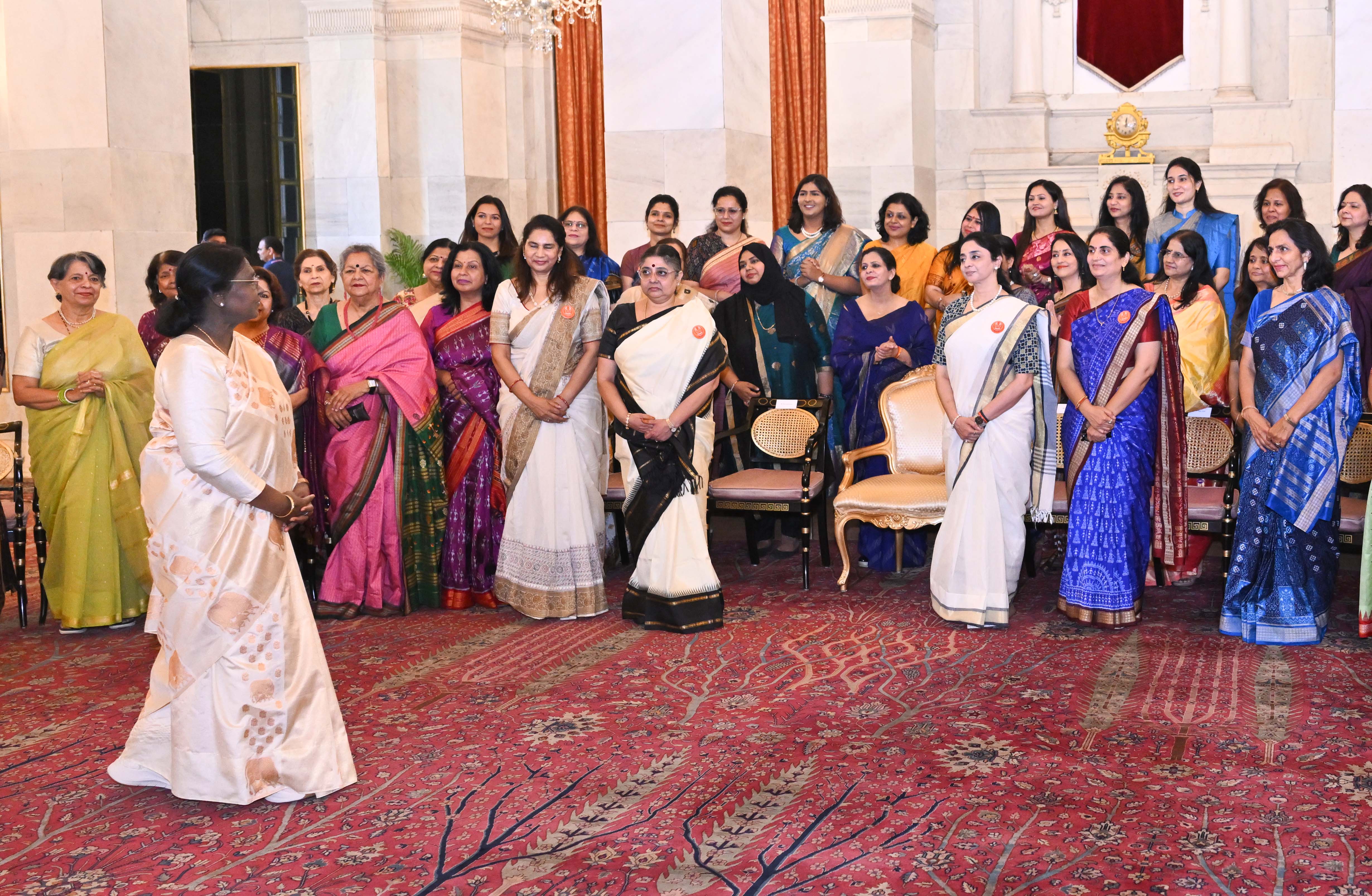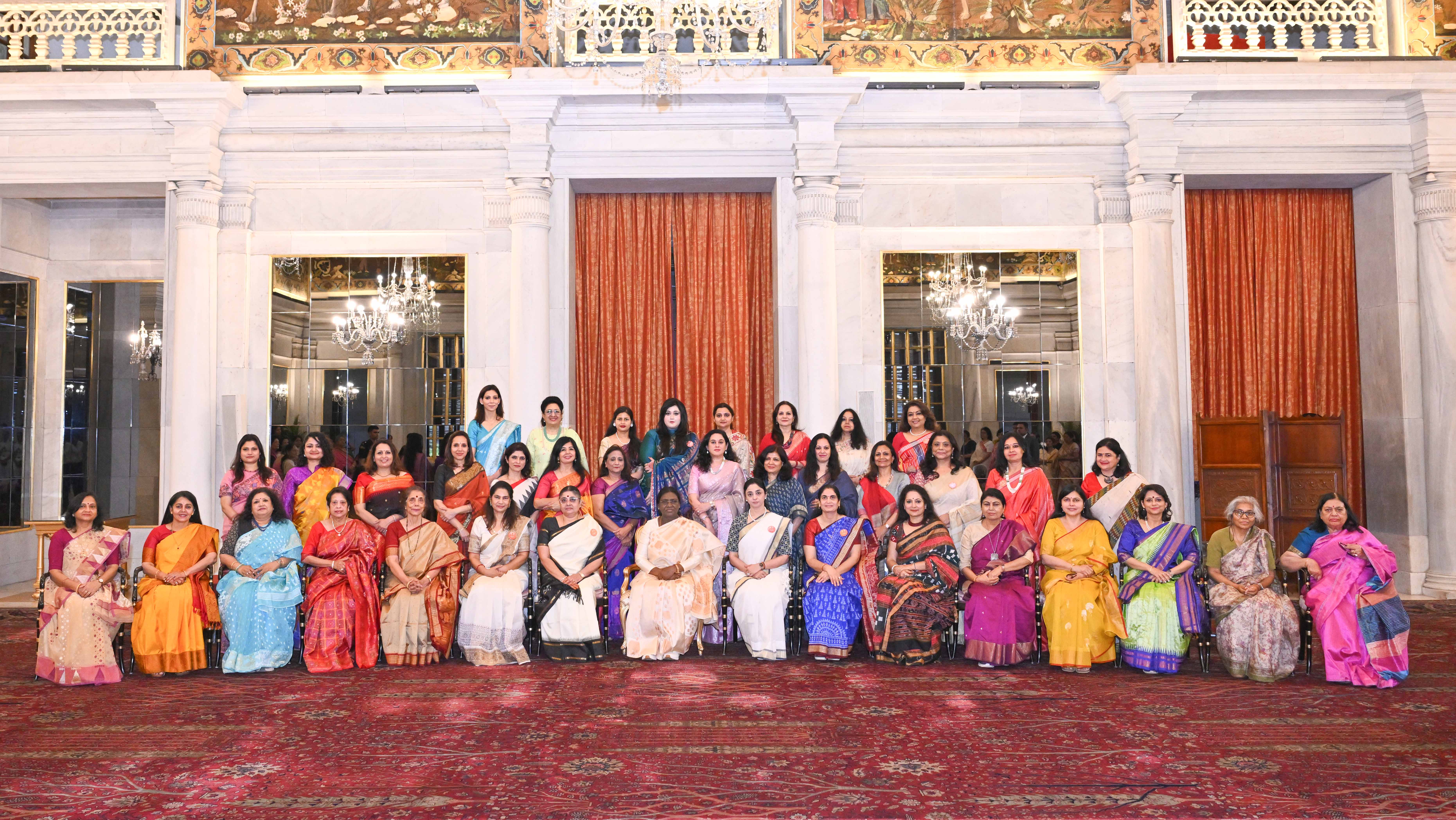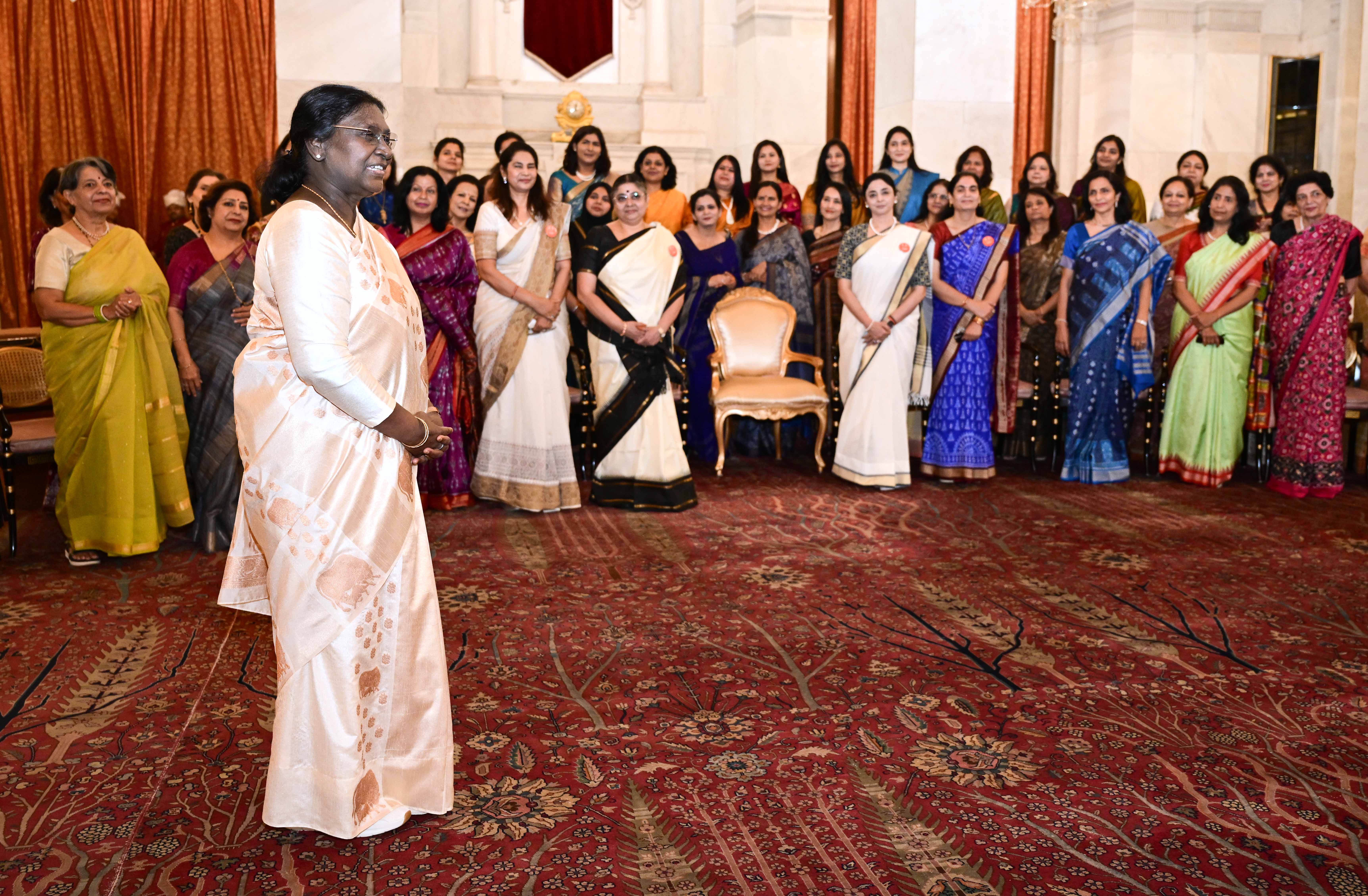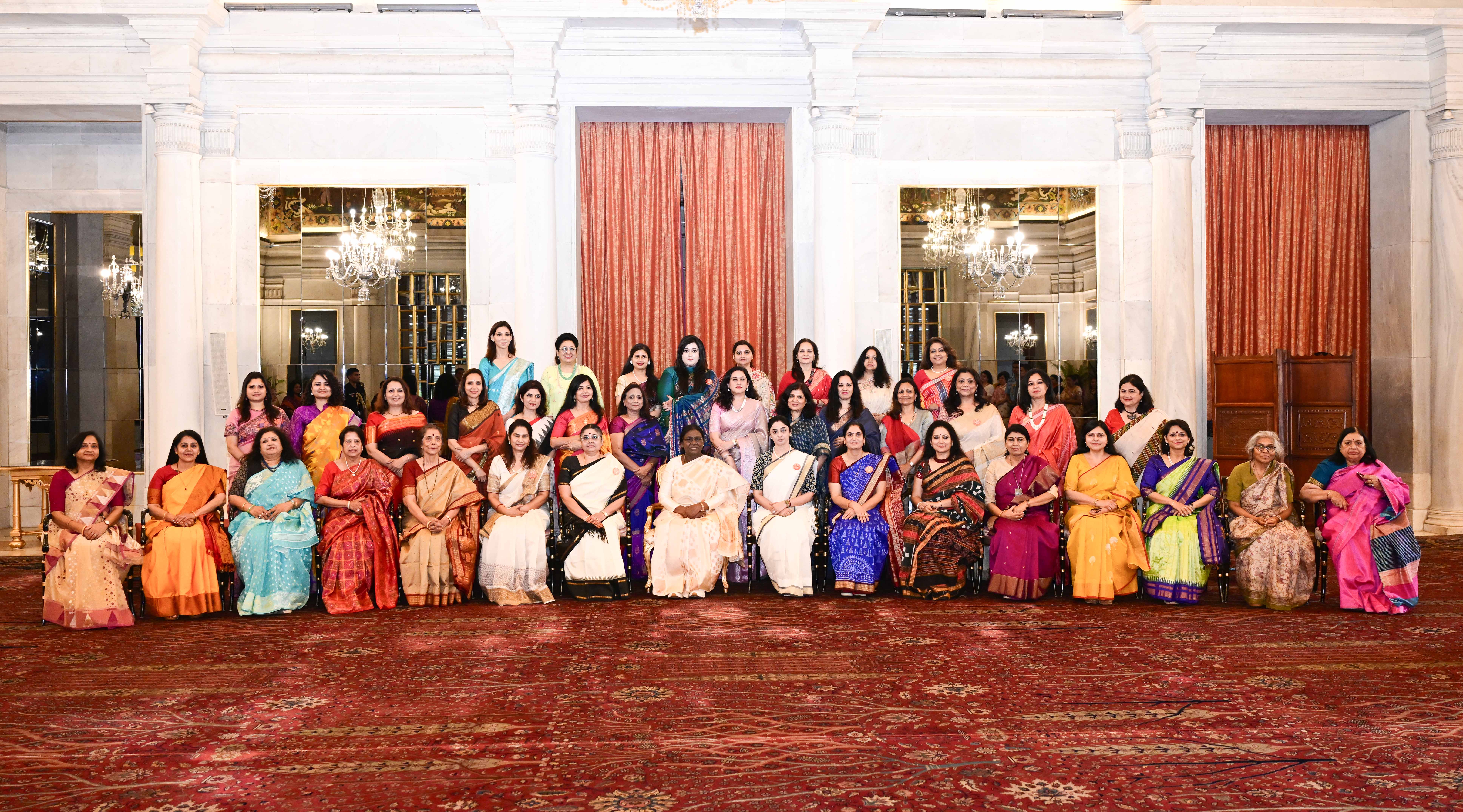 | Caption: | The President of India, Smt Droupadi Murmu met and interacted a group photograph with Ms. Hema Somanathan, President IAS Officers Wives Association along with 177 other members of the Association at Rashtrapati Bhavan on March 24, 2026. |