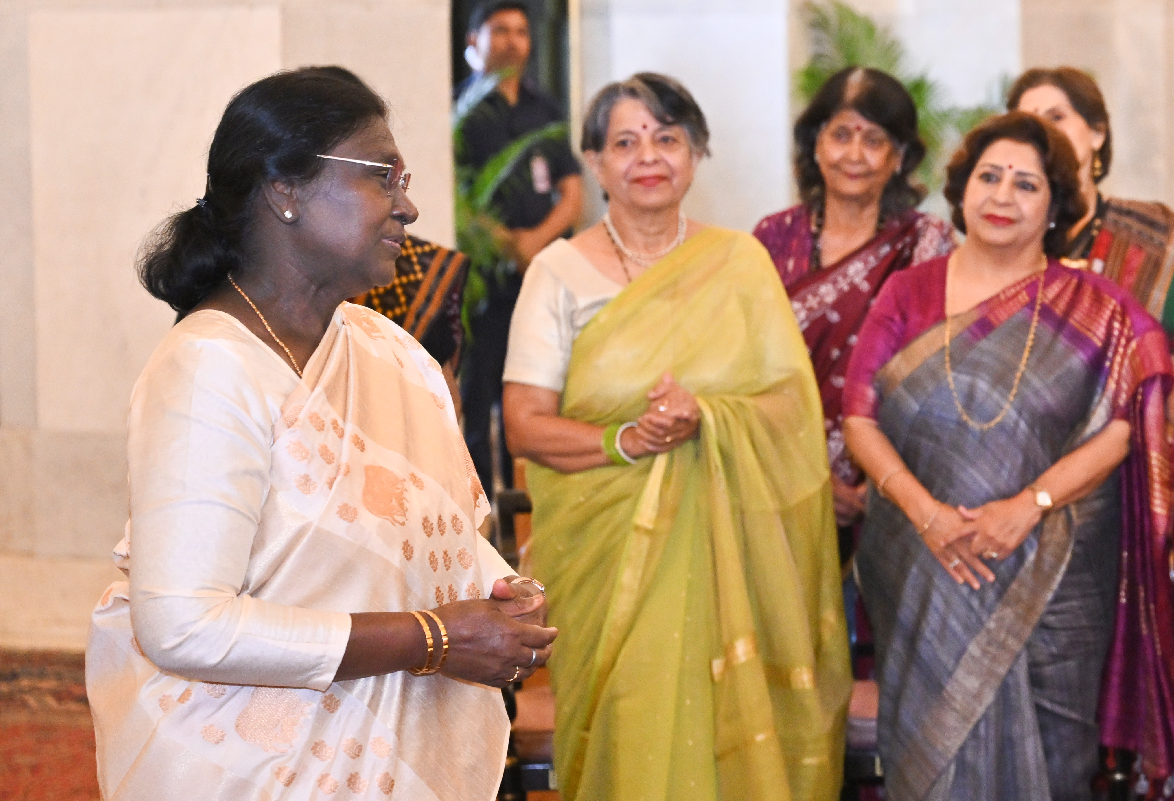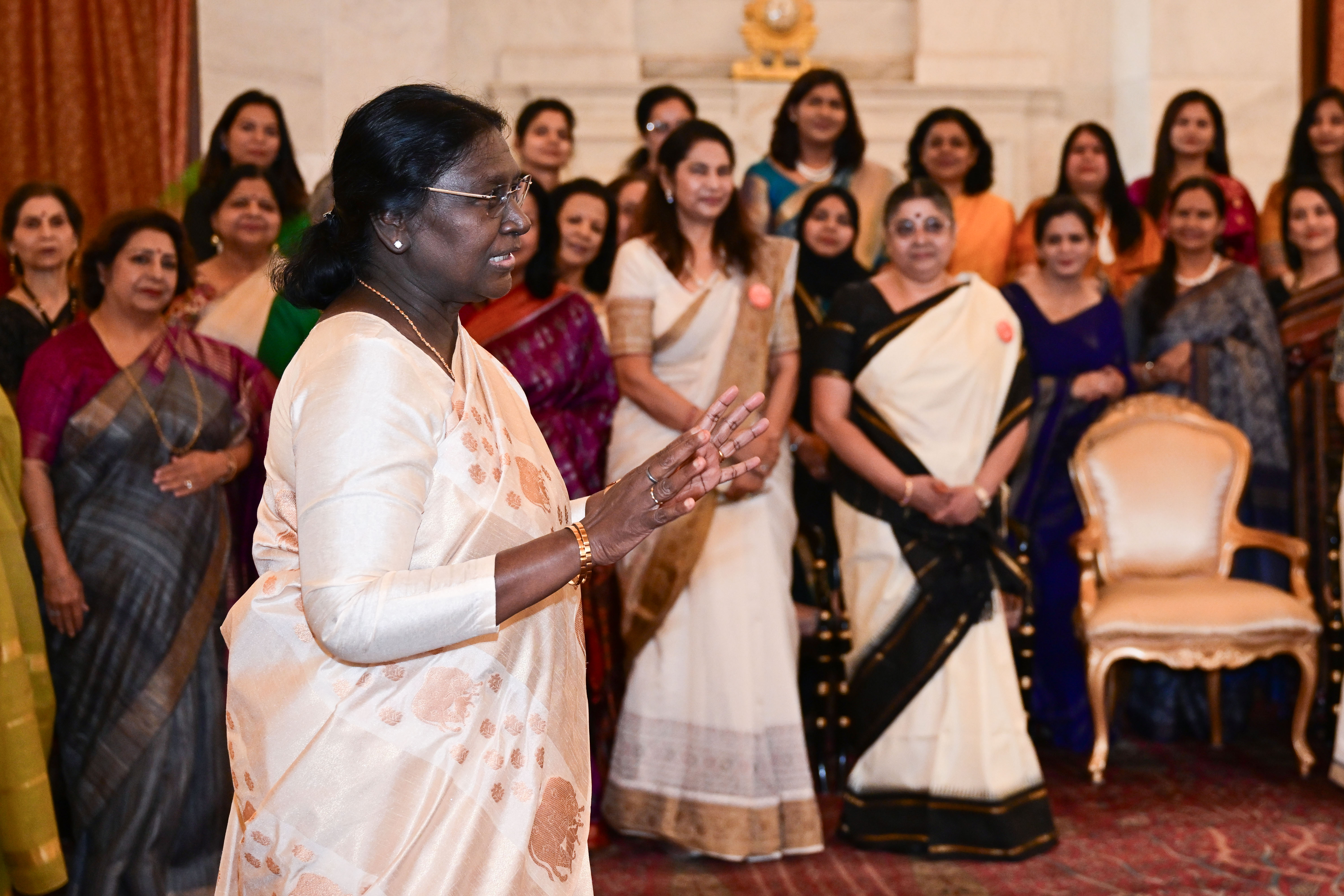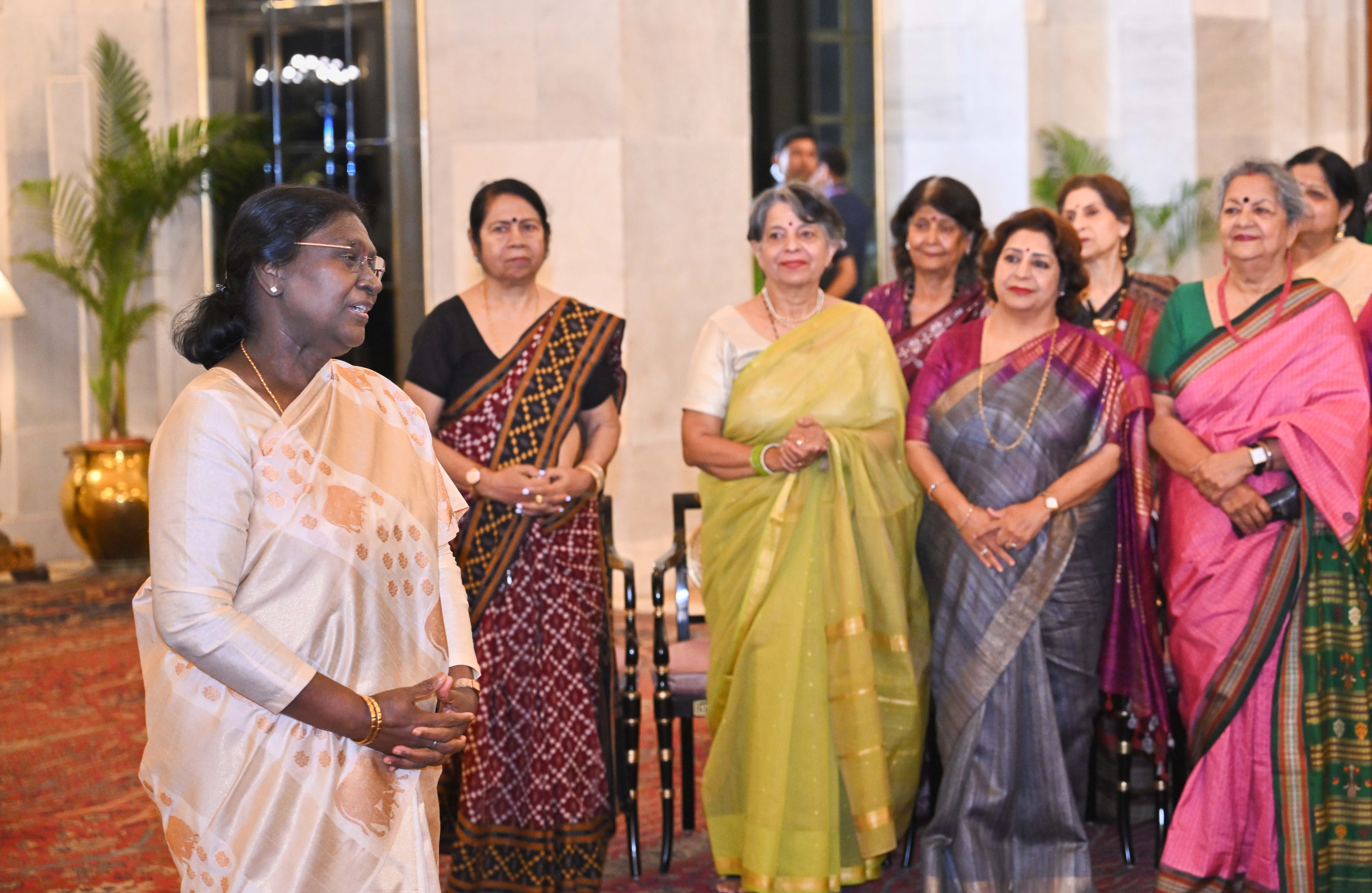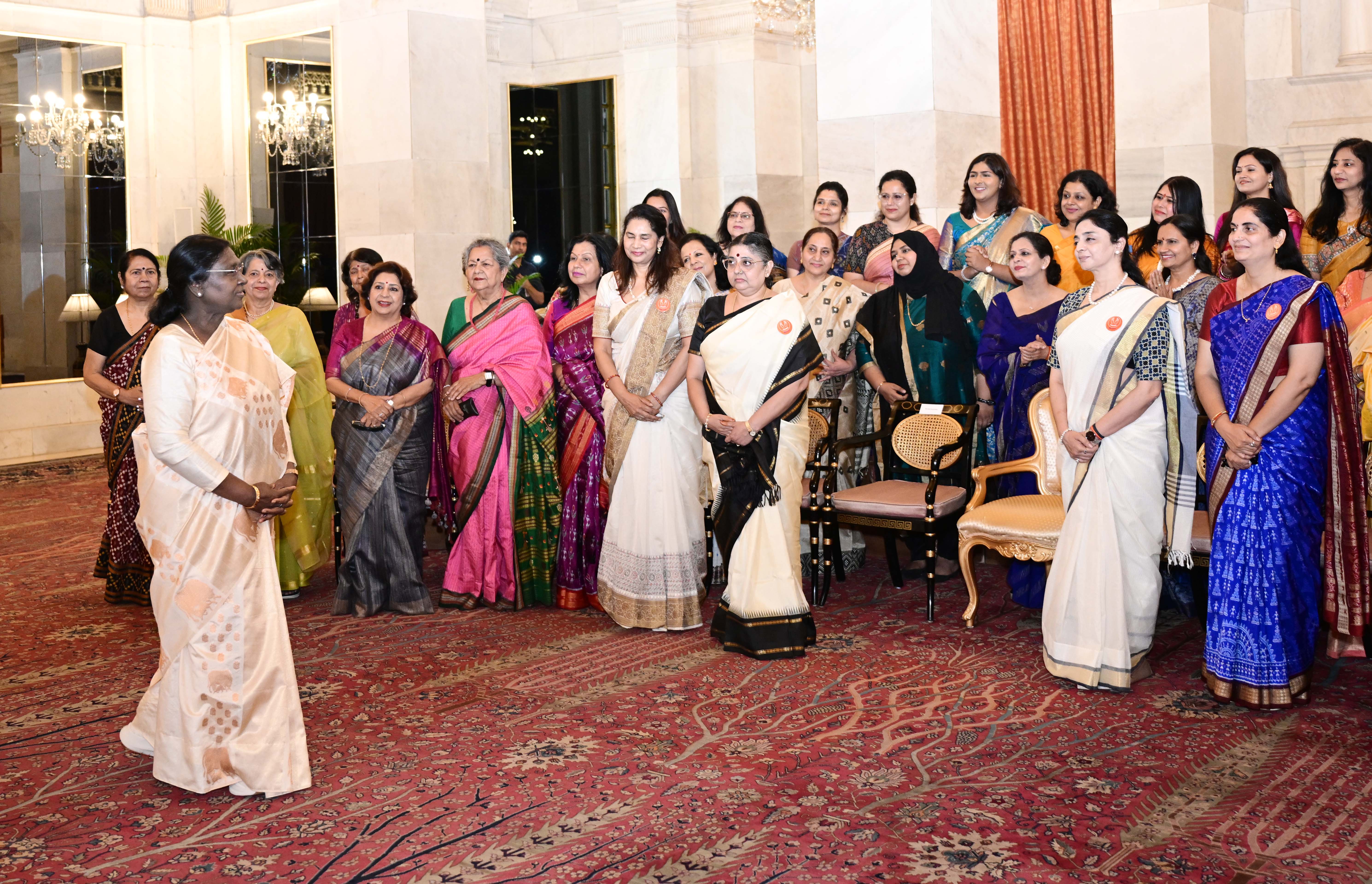 | Caption: | The President of India, Smt Droupadi Murmu met and interacted a group photograph with Ms. Hema Somanathan, President IAS Officers Wives Association along with 177 other members of the Association at Rashtrapati Bhavan on March 24, 2026. |