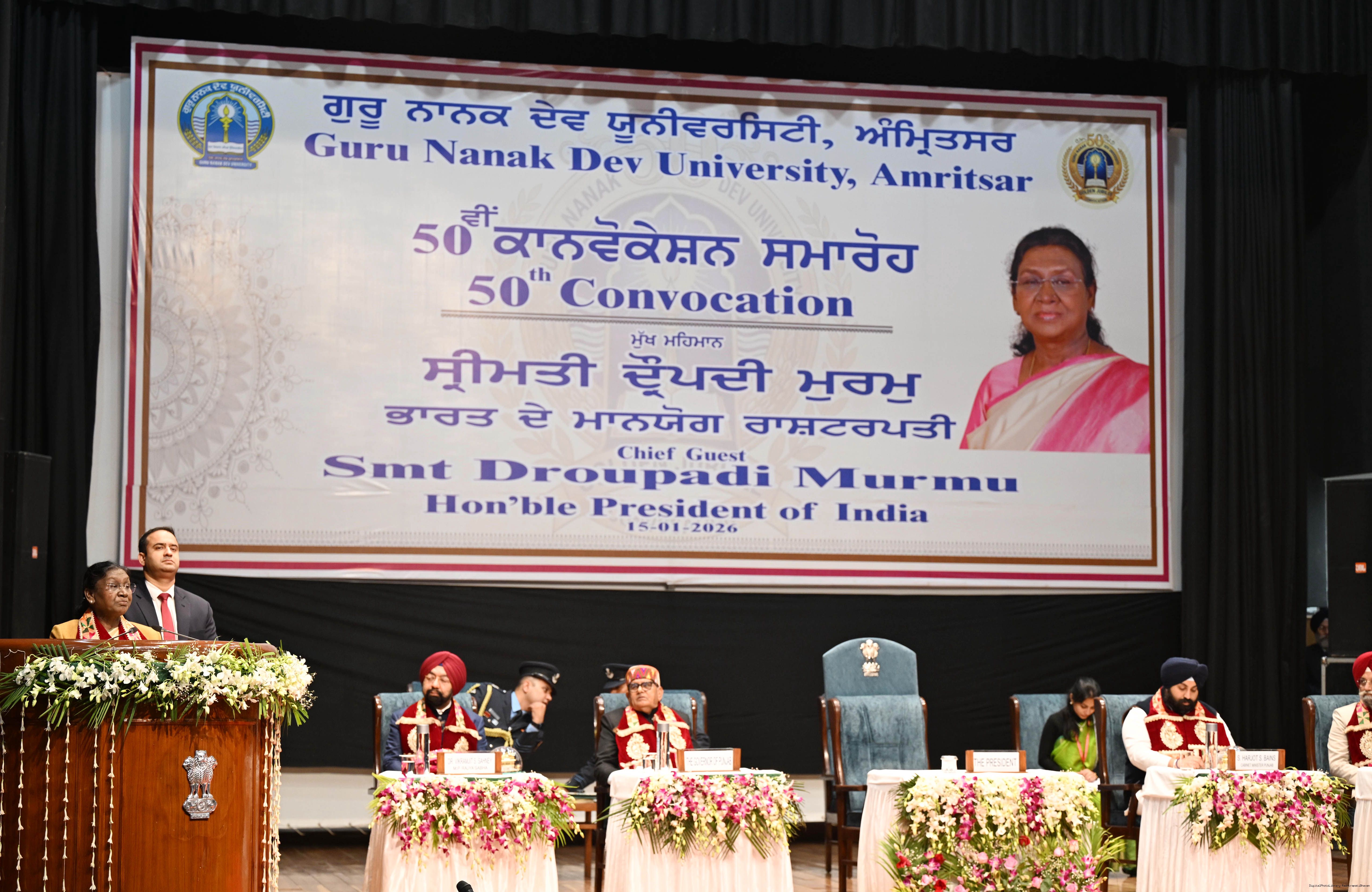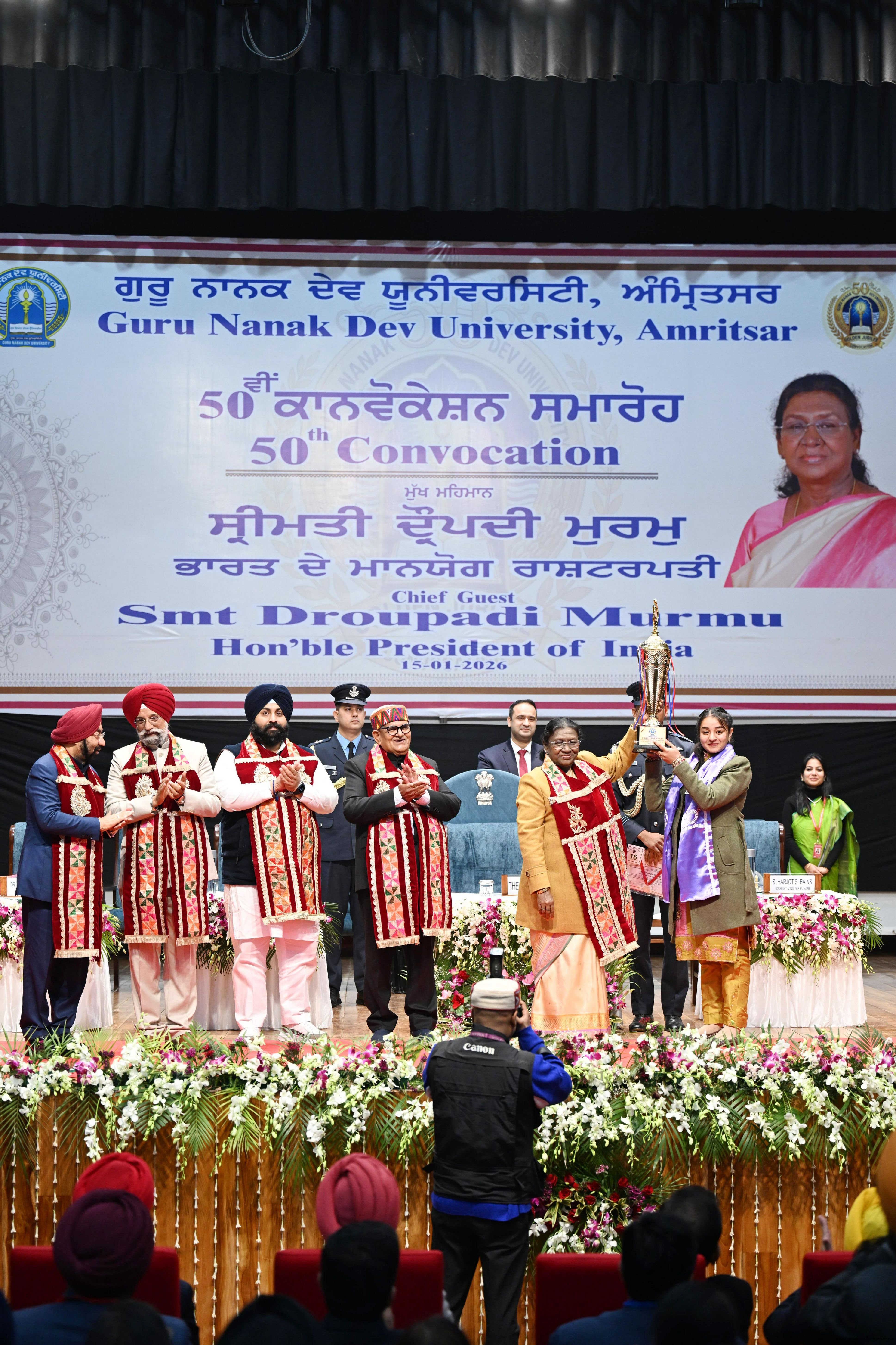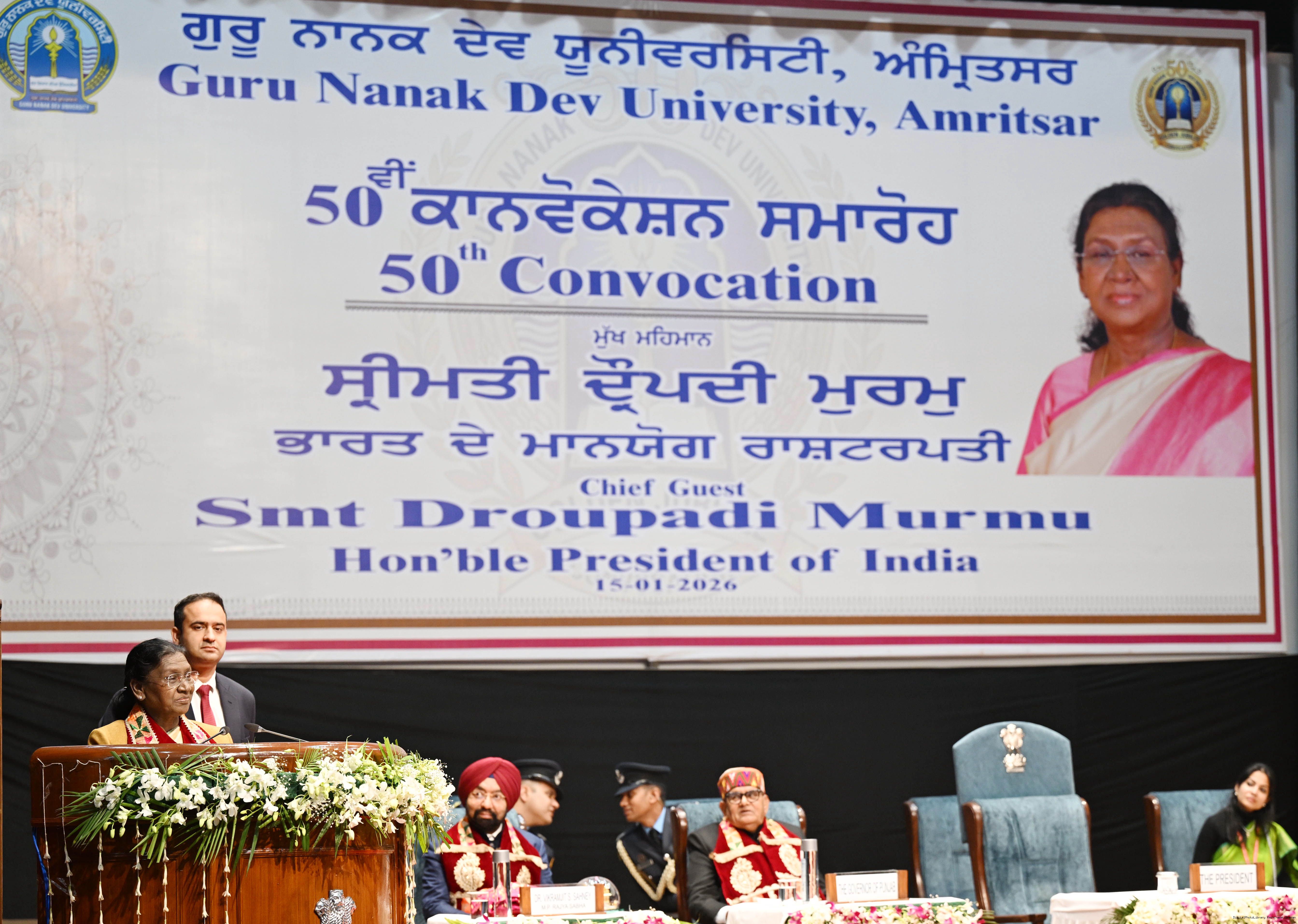 | Caption: | The President of India, Smt Droupadi Murmu, graced and addressed the convocation ceremony of the Guru Nanak Dev University at Amritsar, Punjab on January 15, 2026. |