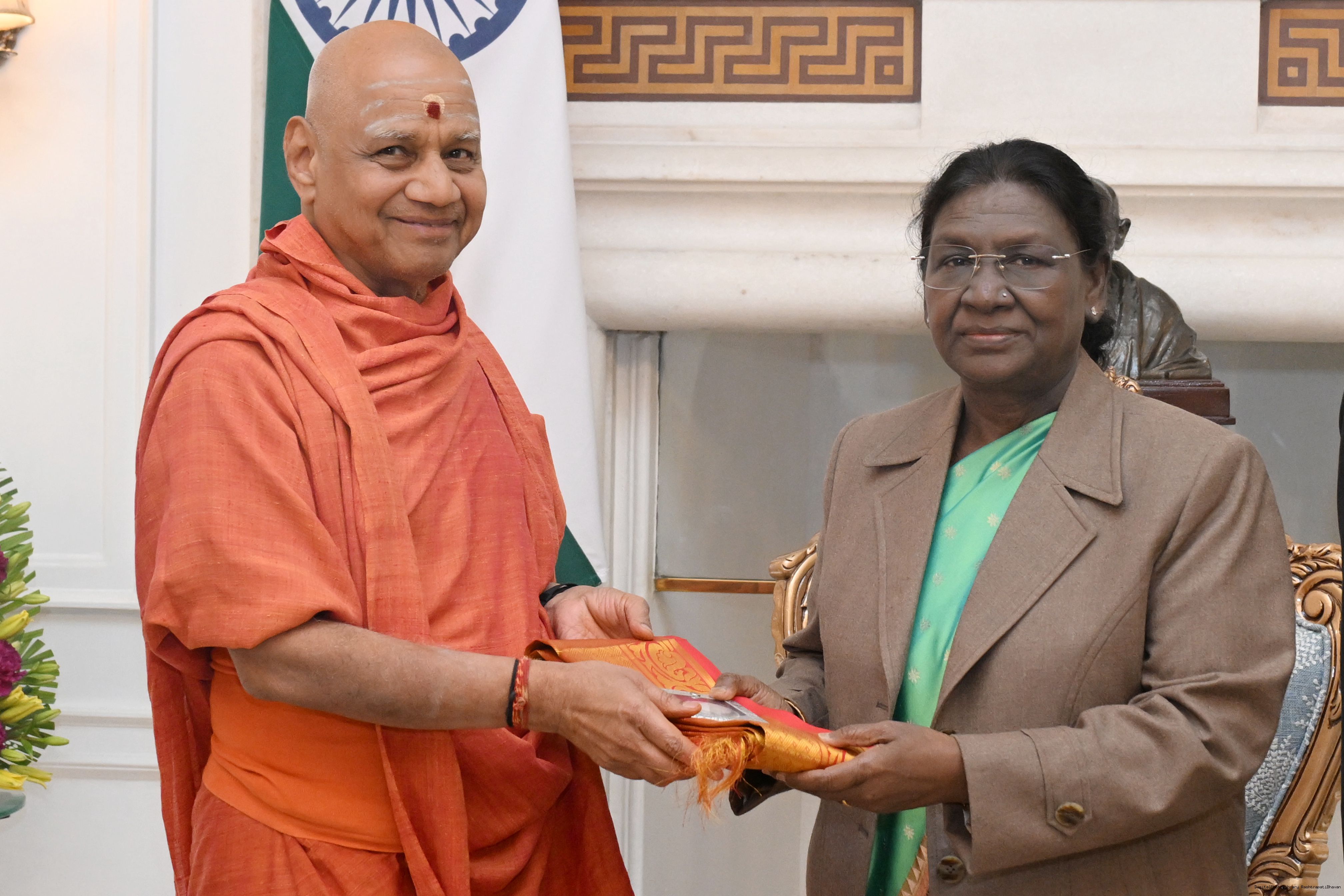 | Caption: | Pujya Swami Govinddev Giri Ji Maharaj, Treasurer, Shri ram Janmbhoomi Teerth along with others meeting with the President of India, Smt Droupadi Murmu at Rashtrapati Bhavan on January 19, 2026. |