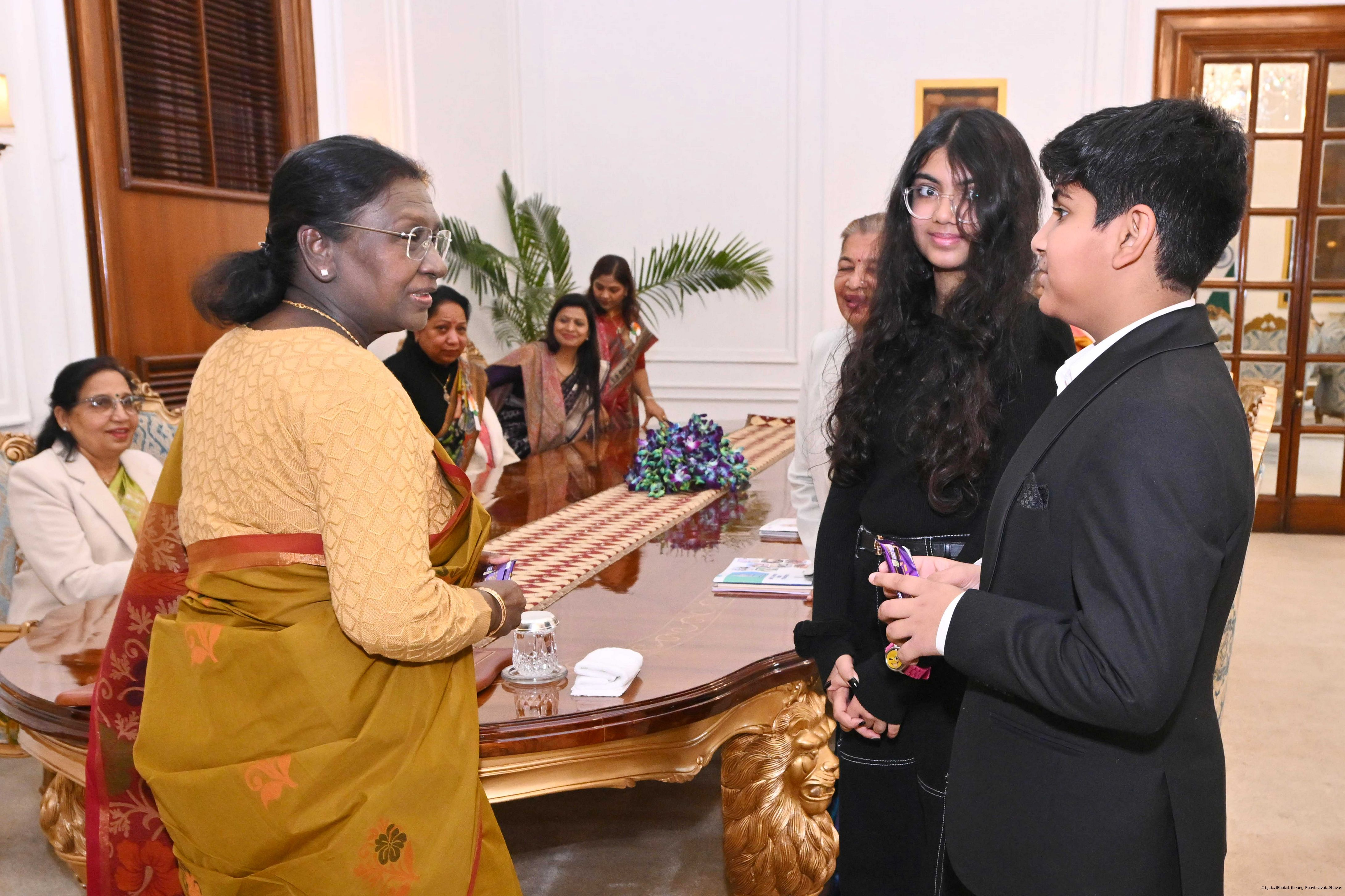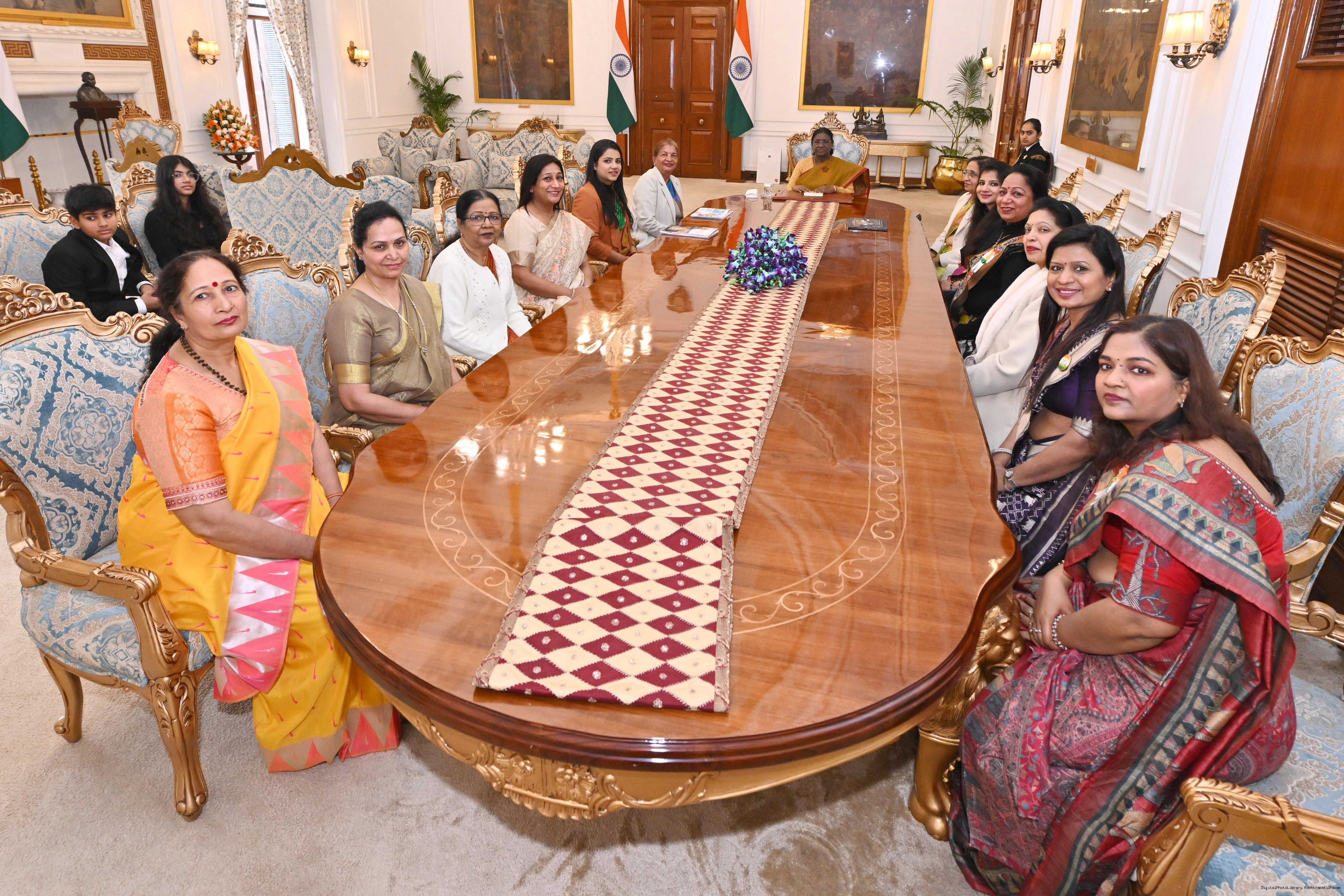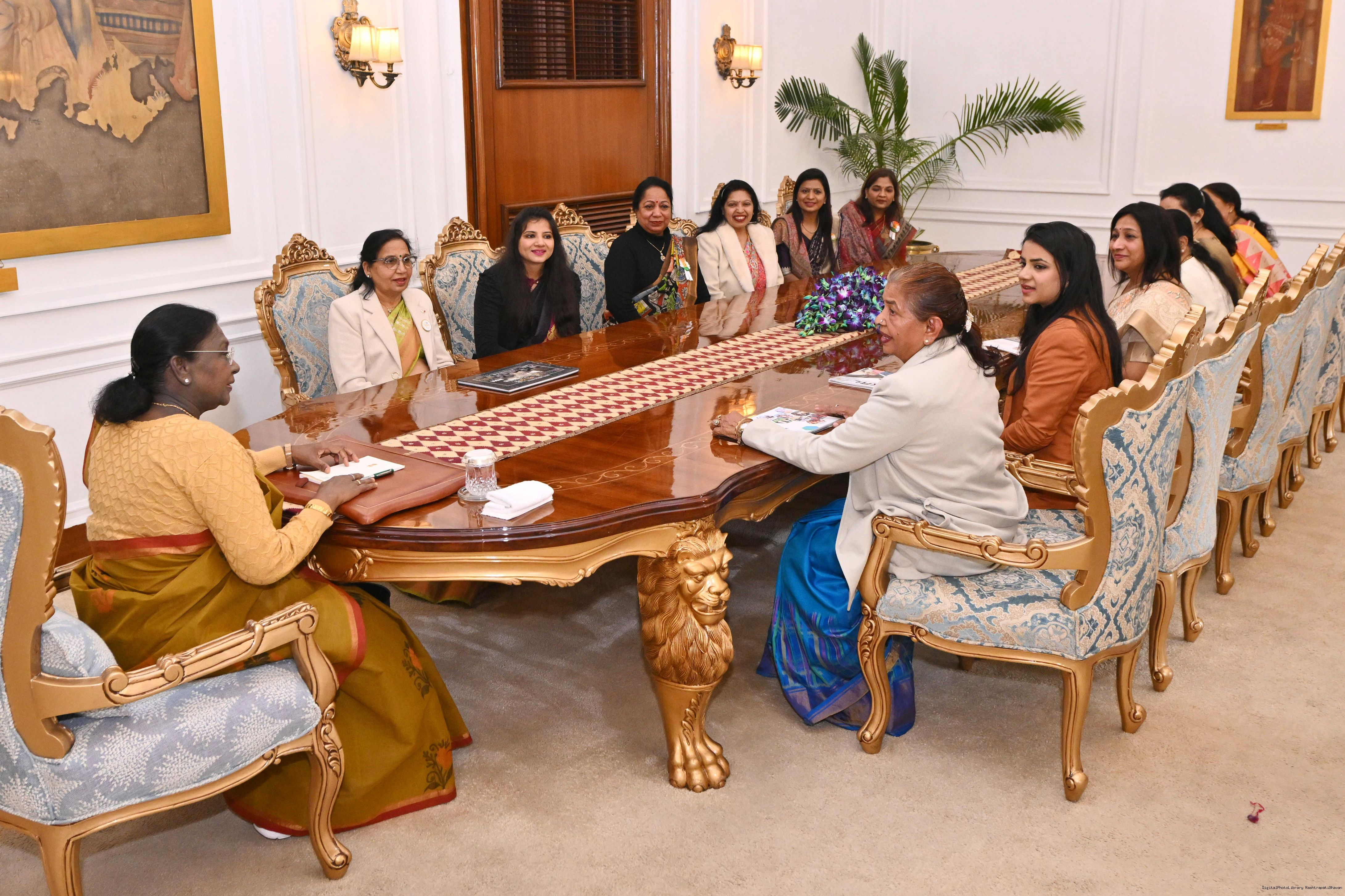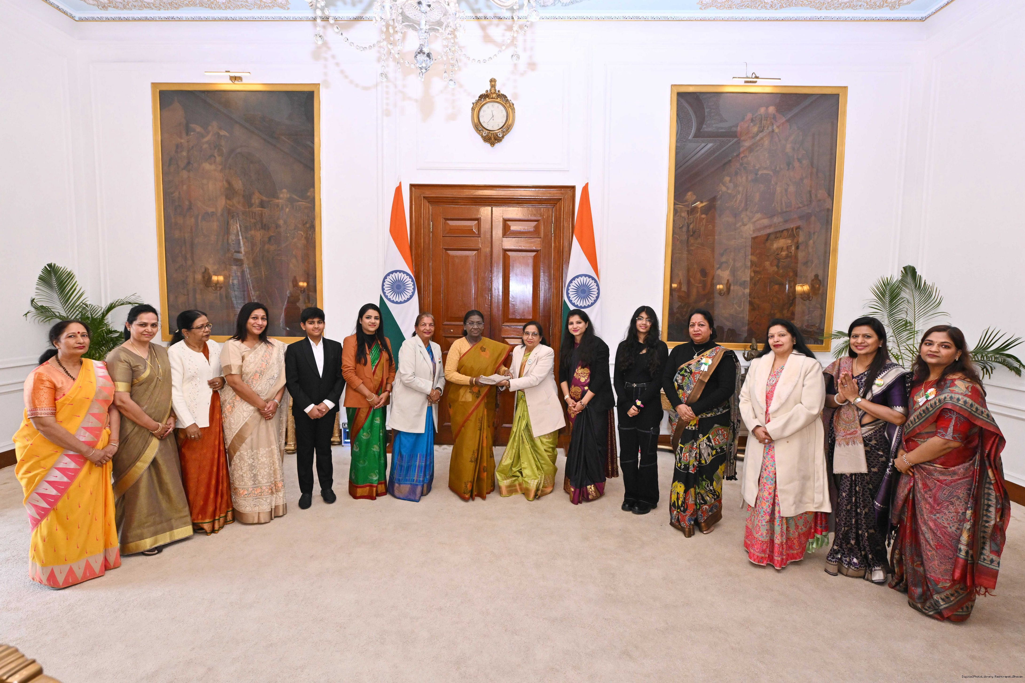 | Caption: | Smt. Darshan Goel, National Advisor, National Women Cell, Bharat Lok Shiksha Parishad along with Smt. Vidhi Geol and others meeting with the President of India, Smt Droupadi Murmu at Rashtrapati Bhavan on January 22, 2026. |